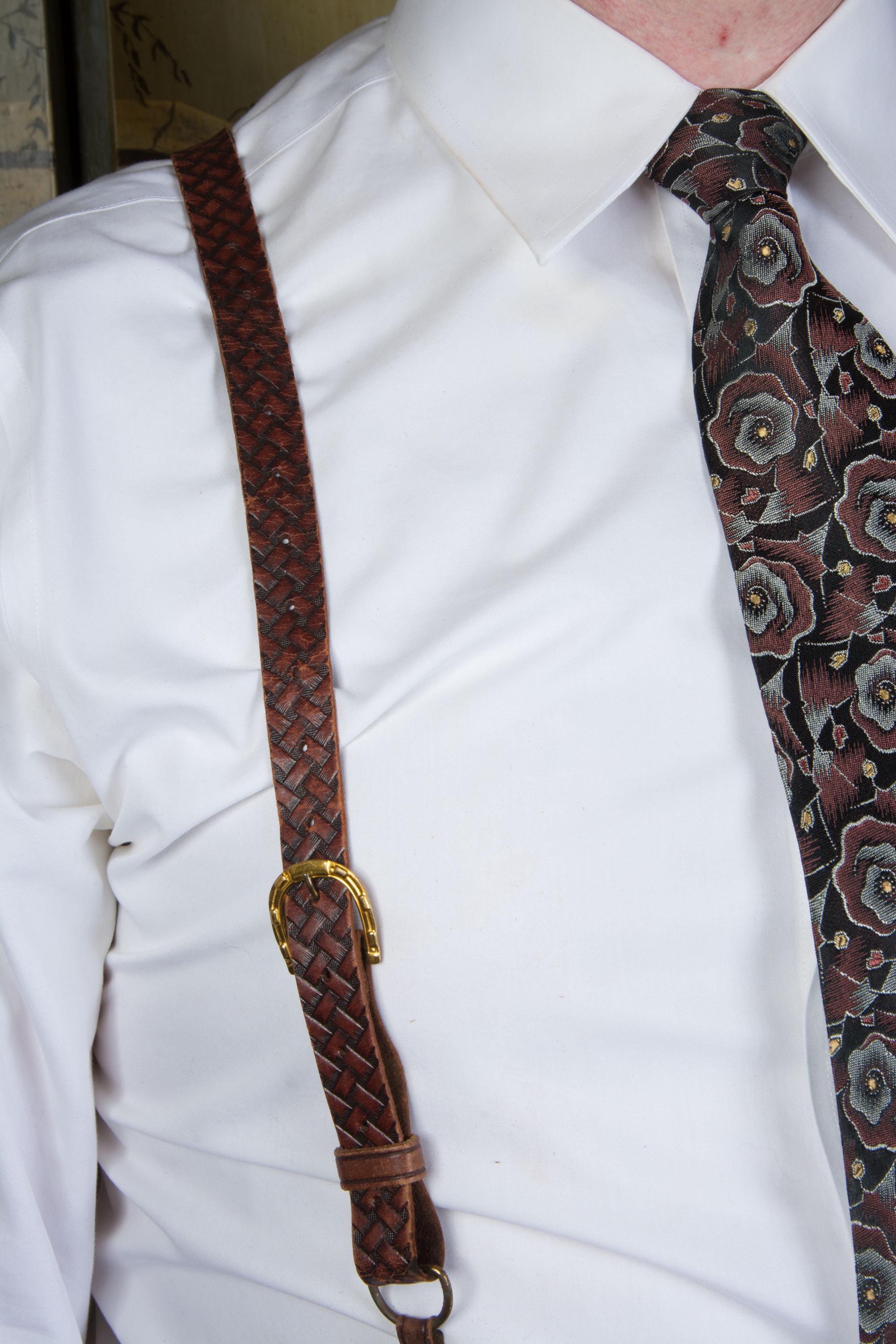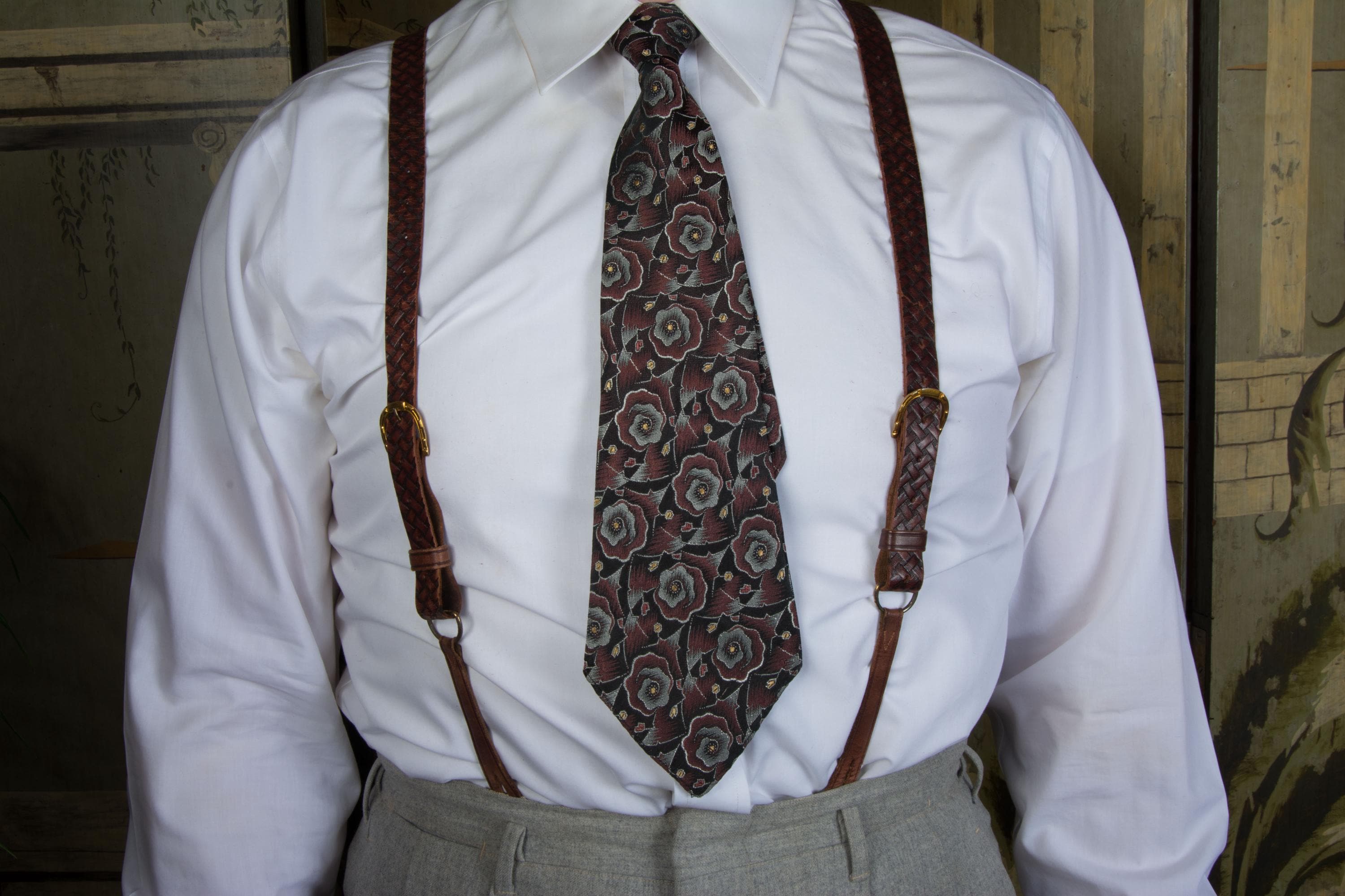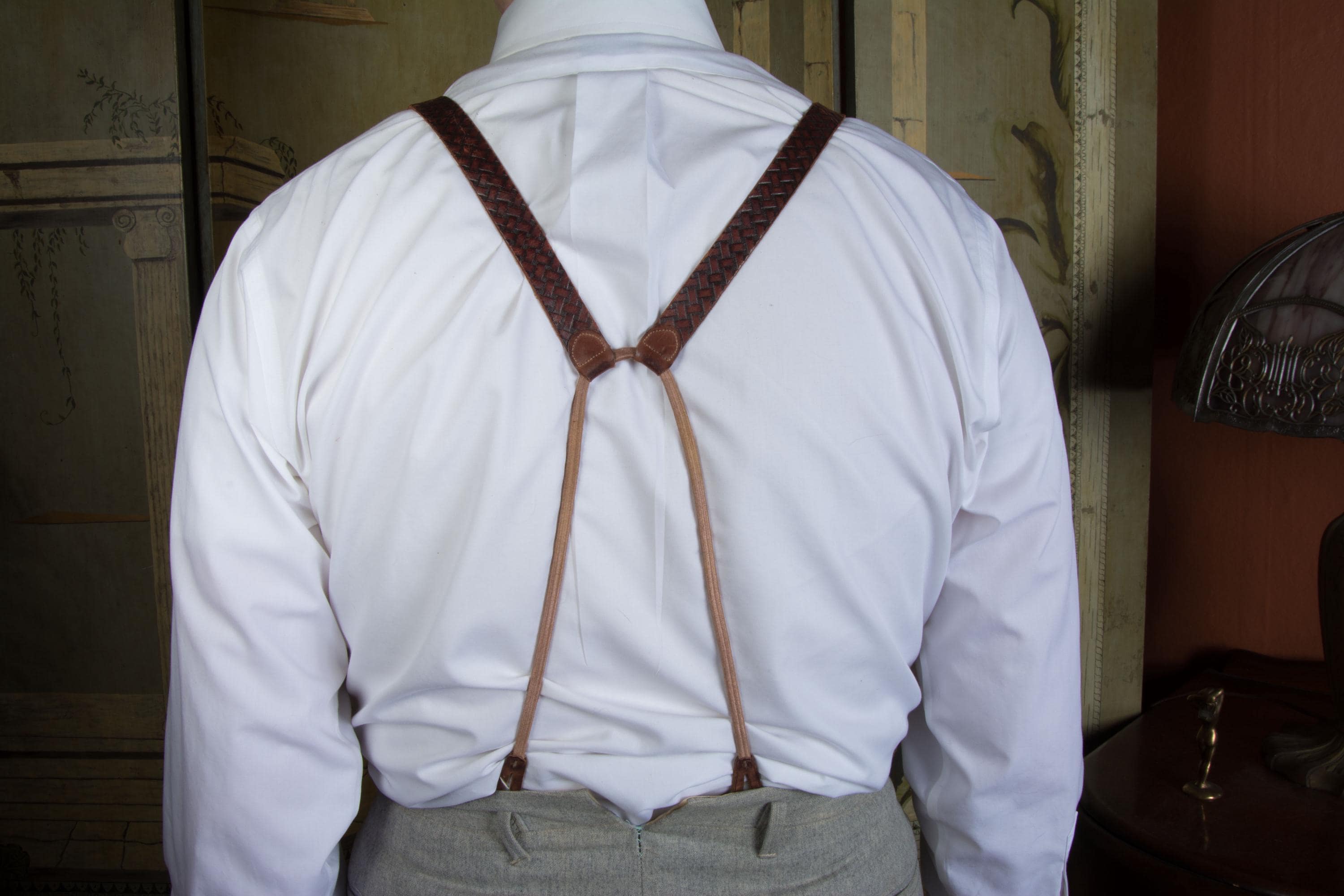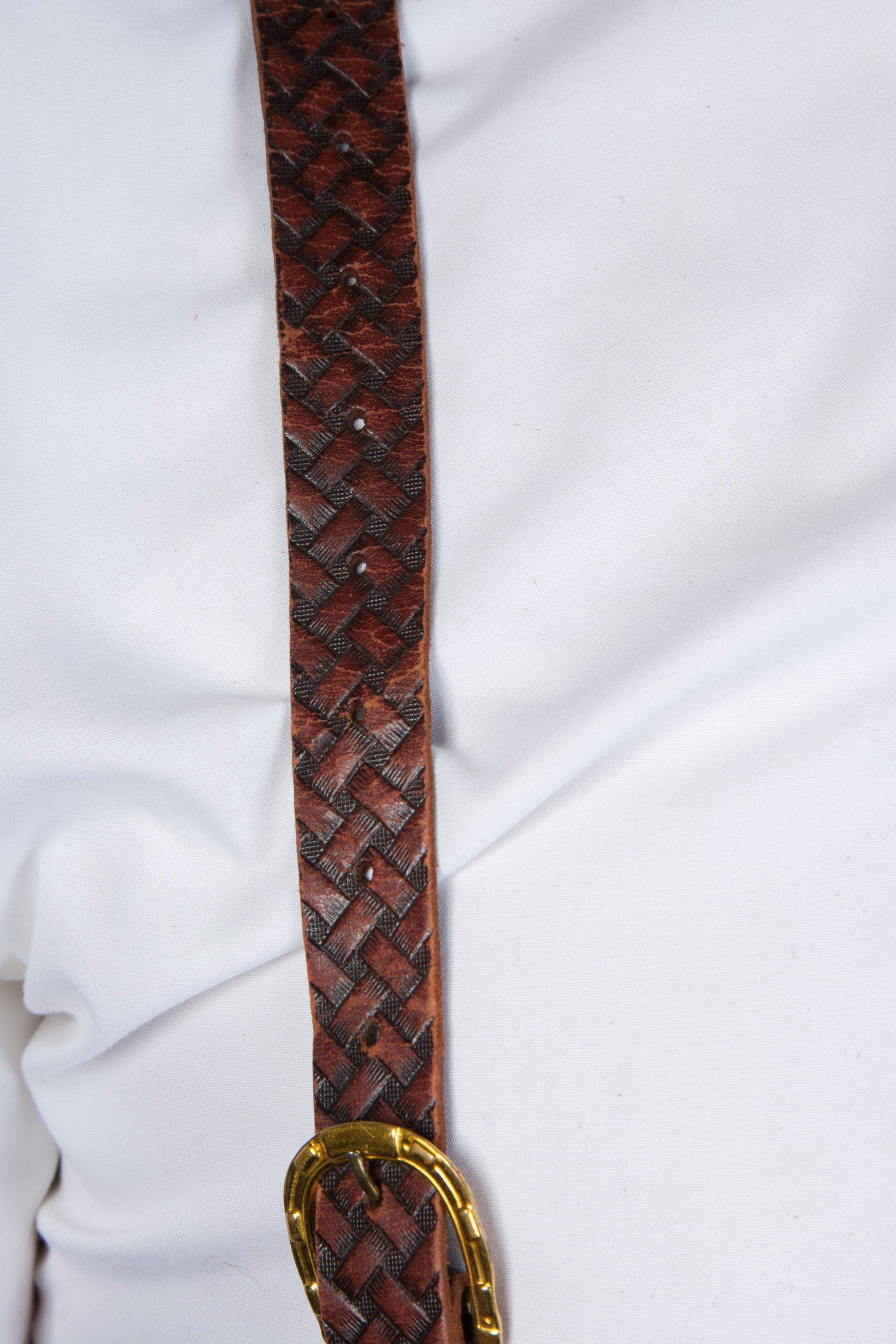 A gorgeous pair of leather suspenders. Based on ads, these seem certain to be 1930s. They have a very 19th century style with single buttons are front and adjust with buckles. These have a pressed basketweave pattern, with the dye creating highlights and lowlights. They adjust with absolutely killer bright gold tone horseshoe buckles - there's 17 holes so they will fit any torso length. At the back, the used a long cased elastic cord loop for the back buttons.