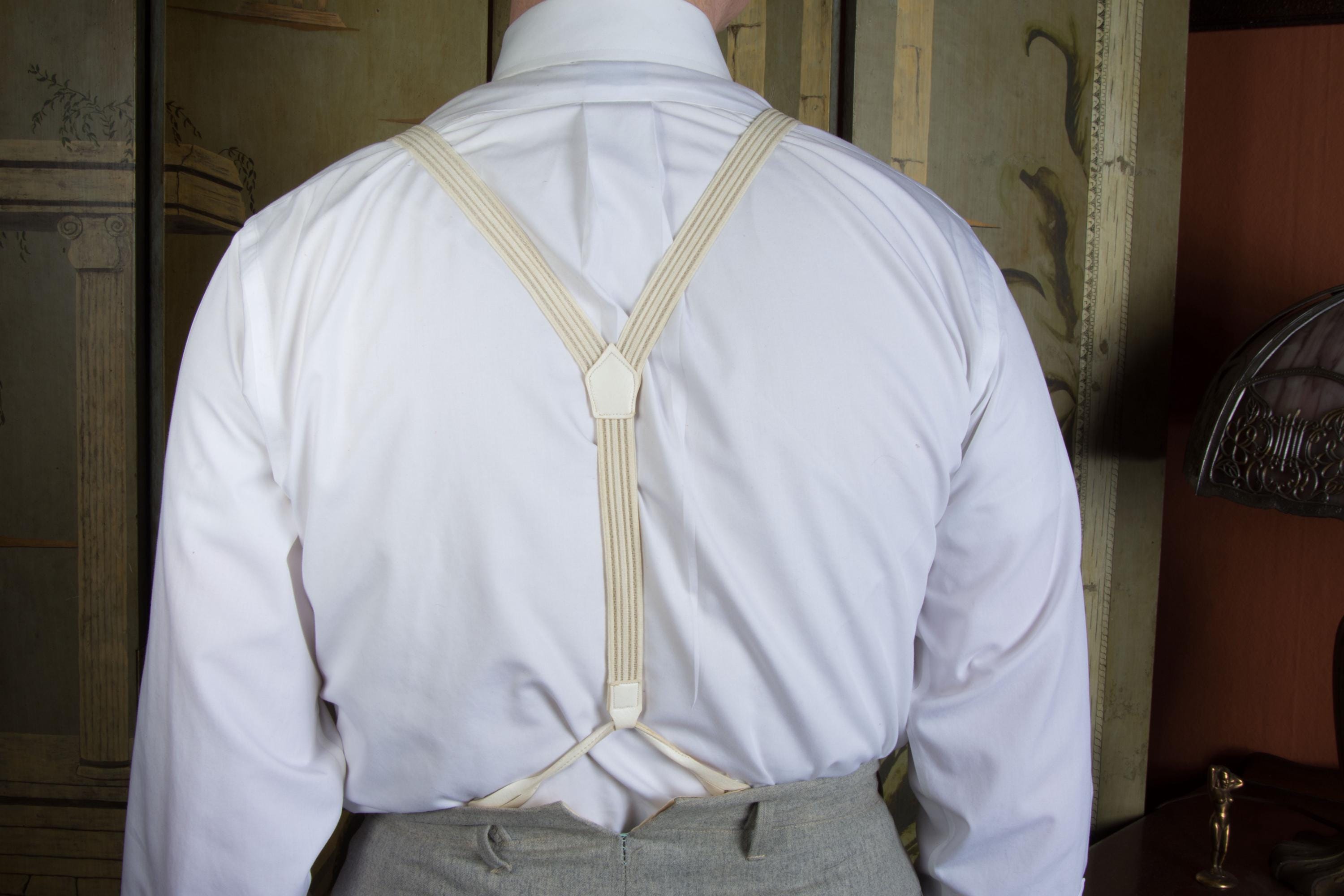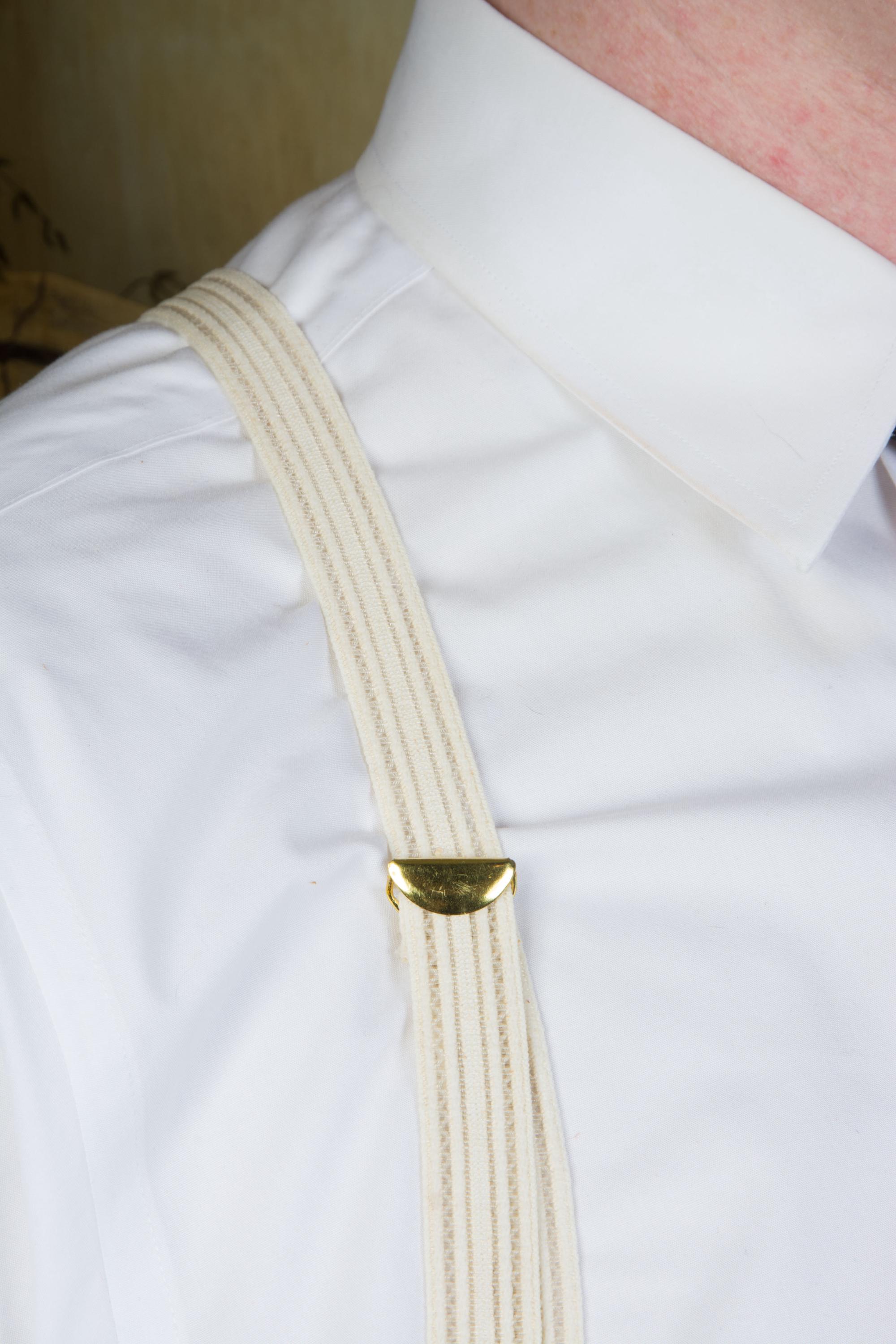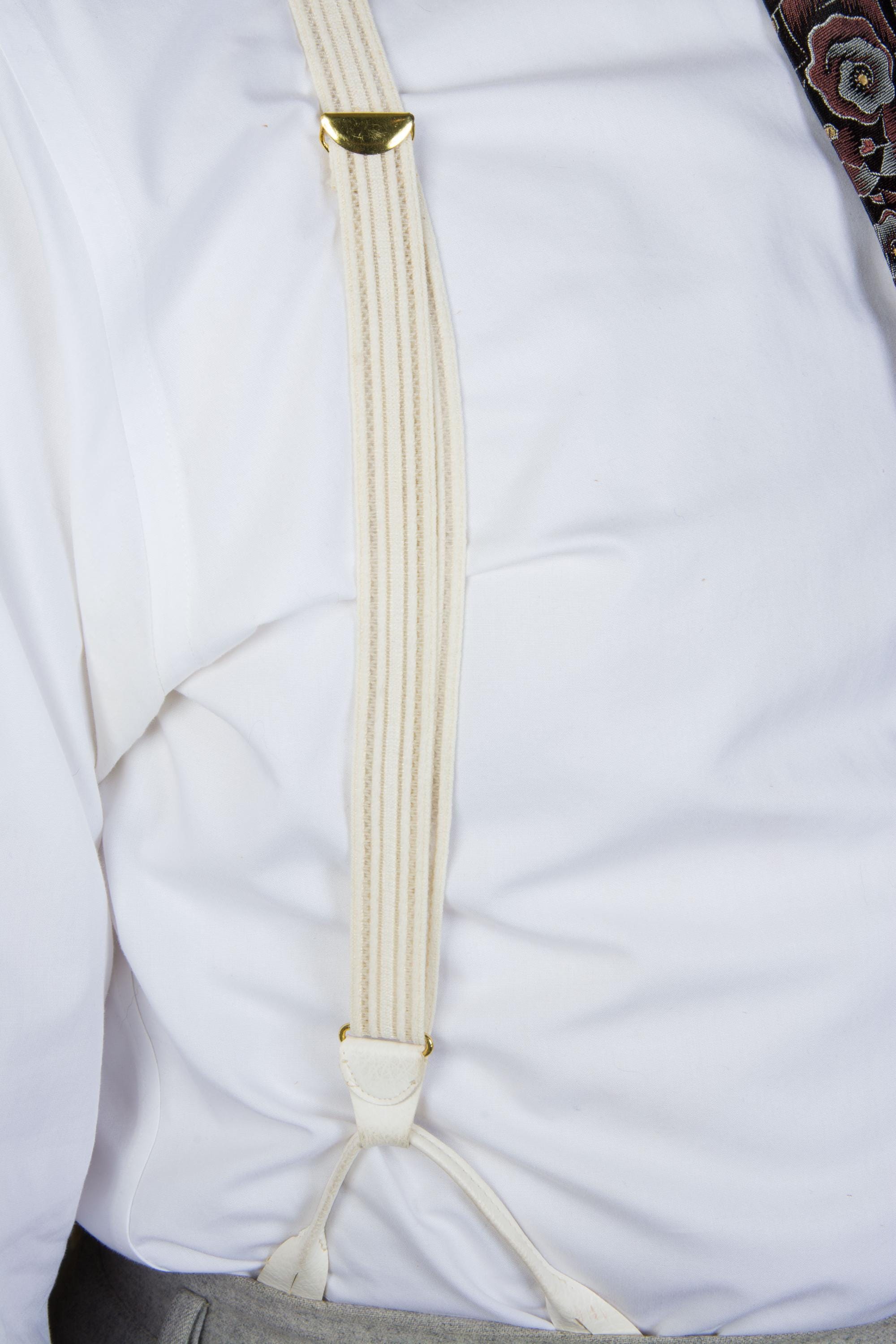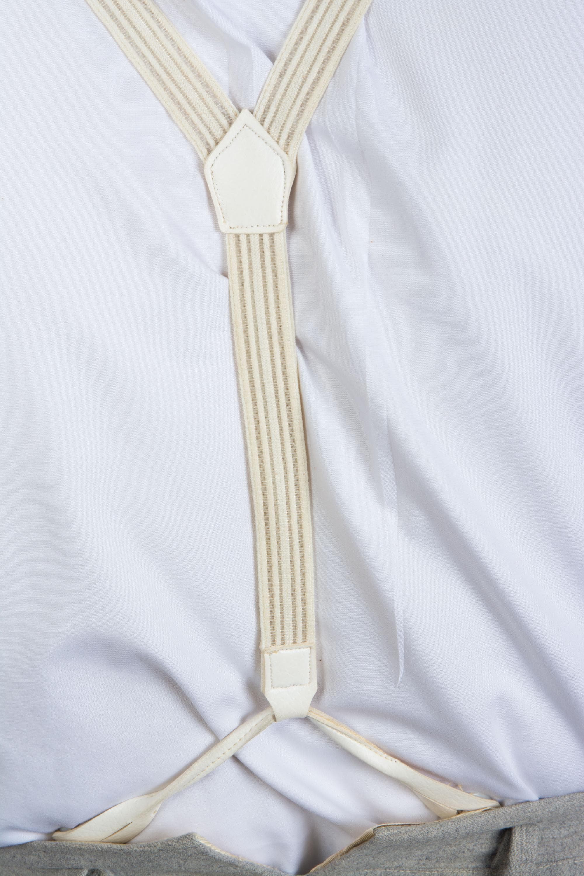 I don't feel confident with dating these formal white suspenders. Are they 80s in a 30s style? 90s? They are made of a white woven cloth elastic and sheer plastic webbing in subtle ivory stripes. The button loops are faux leather, and the hardware is gold. The back does not adjust. Excellent for weddings!