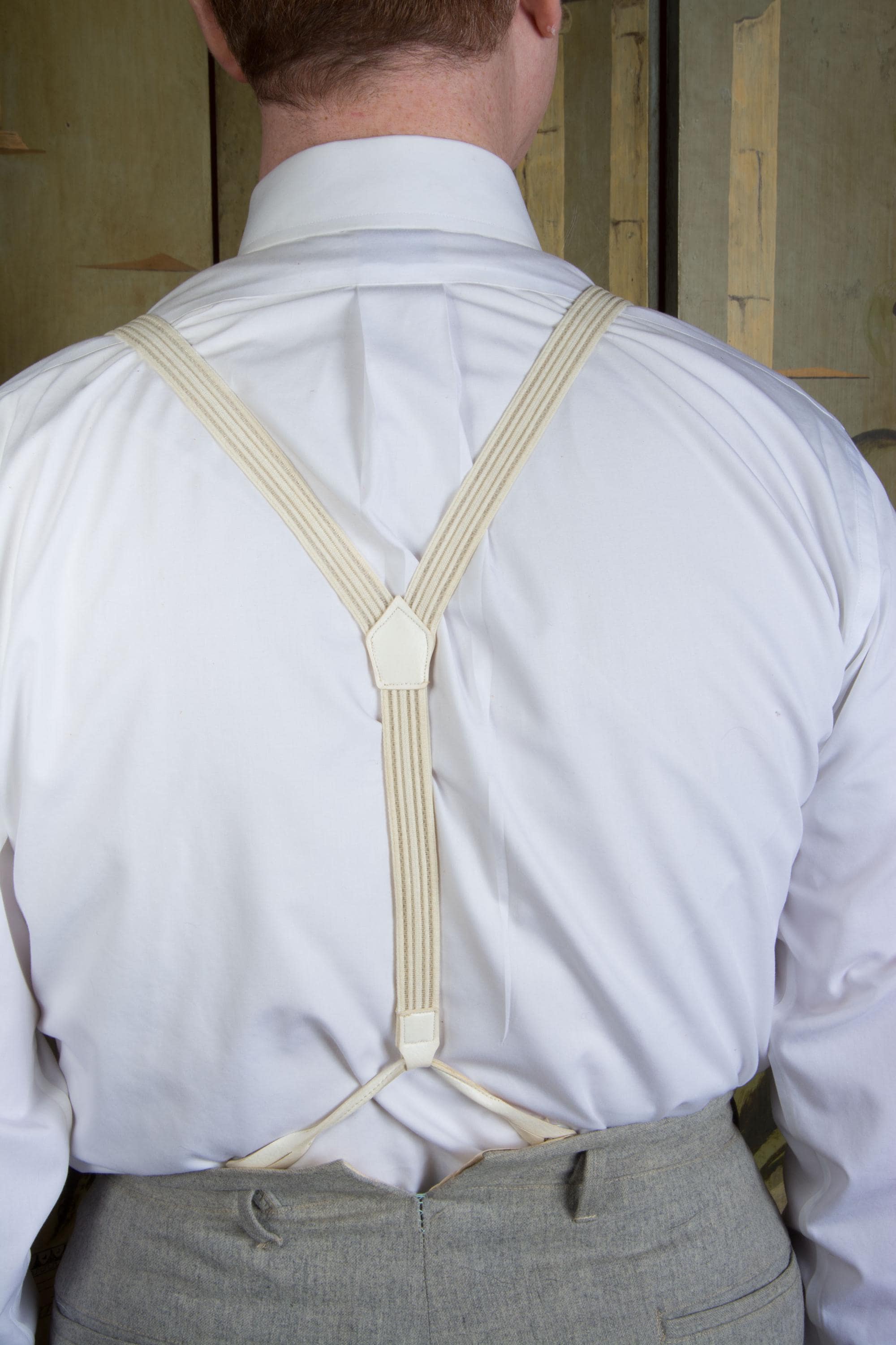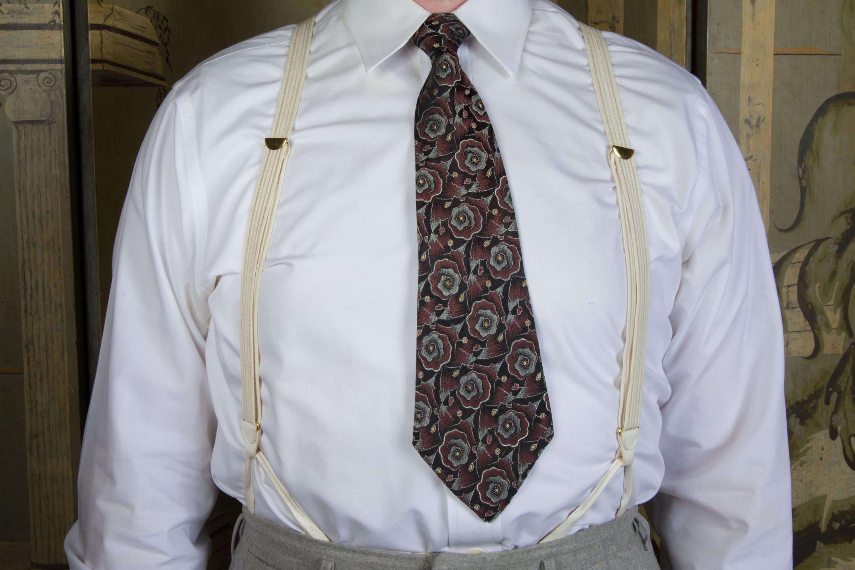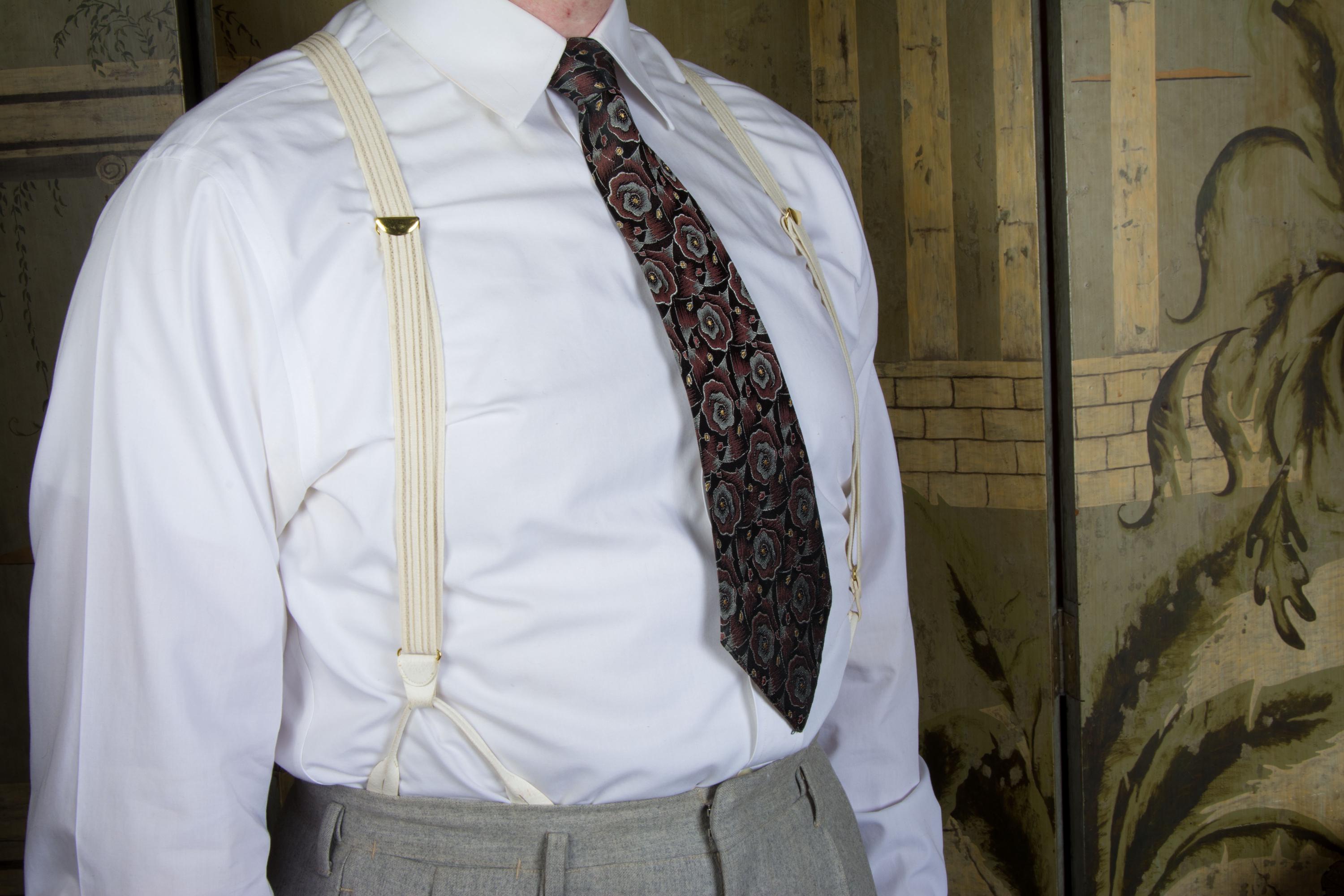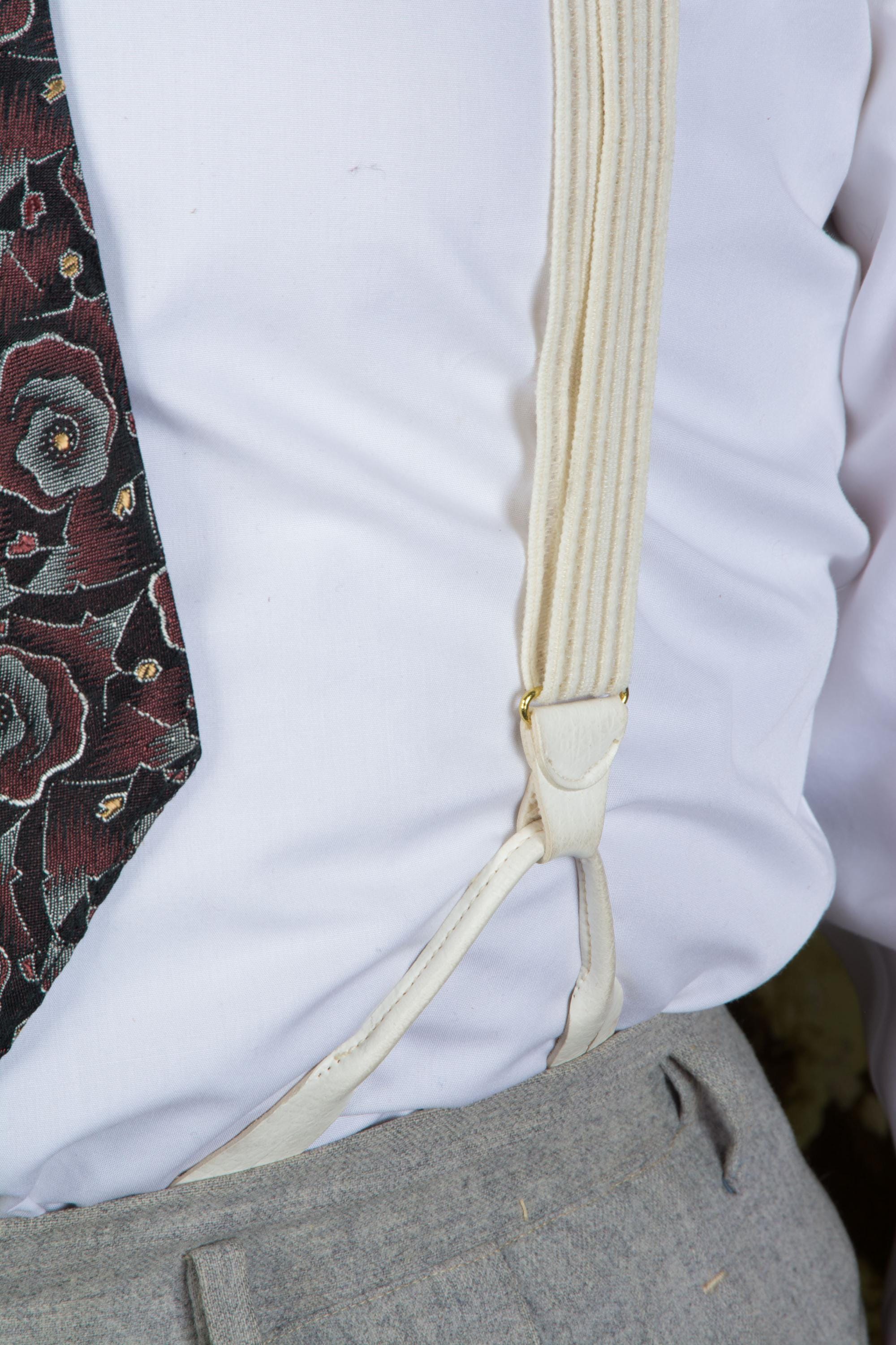 I don't feel confident with dating these formal white suspenders. Are they 80s in a 30s style? 90s? They are made of a white woven cloth elastic and sheer plastic webbing in subtle ivory stripes. The button loops are faux leather, and the hardware is gold. The back does not adjust. Excellent for weddings!