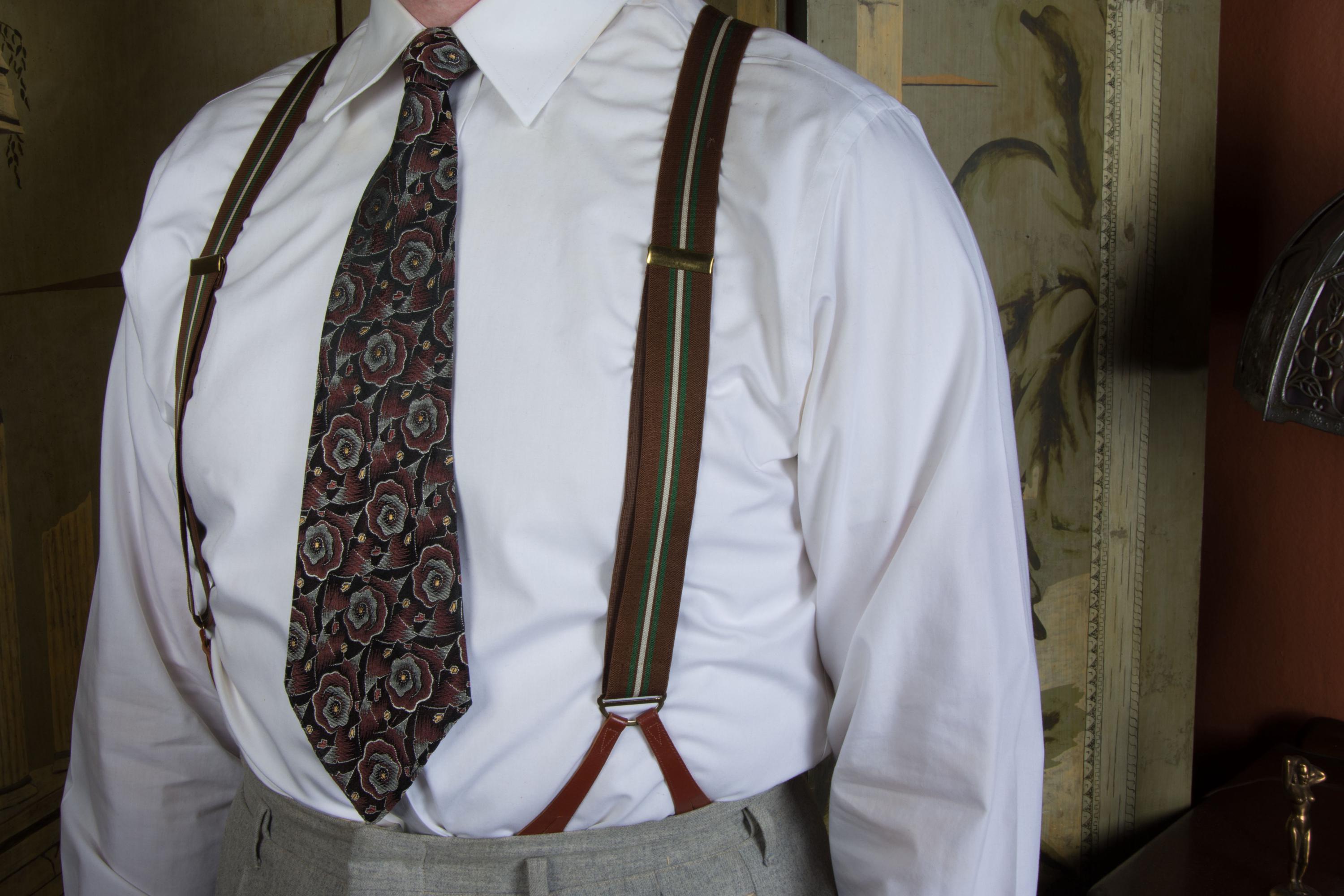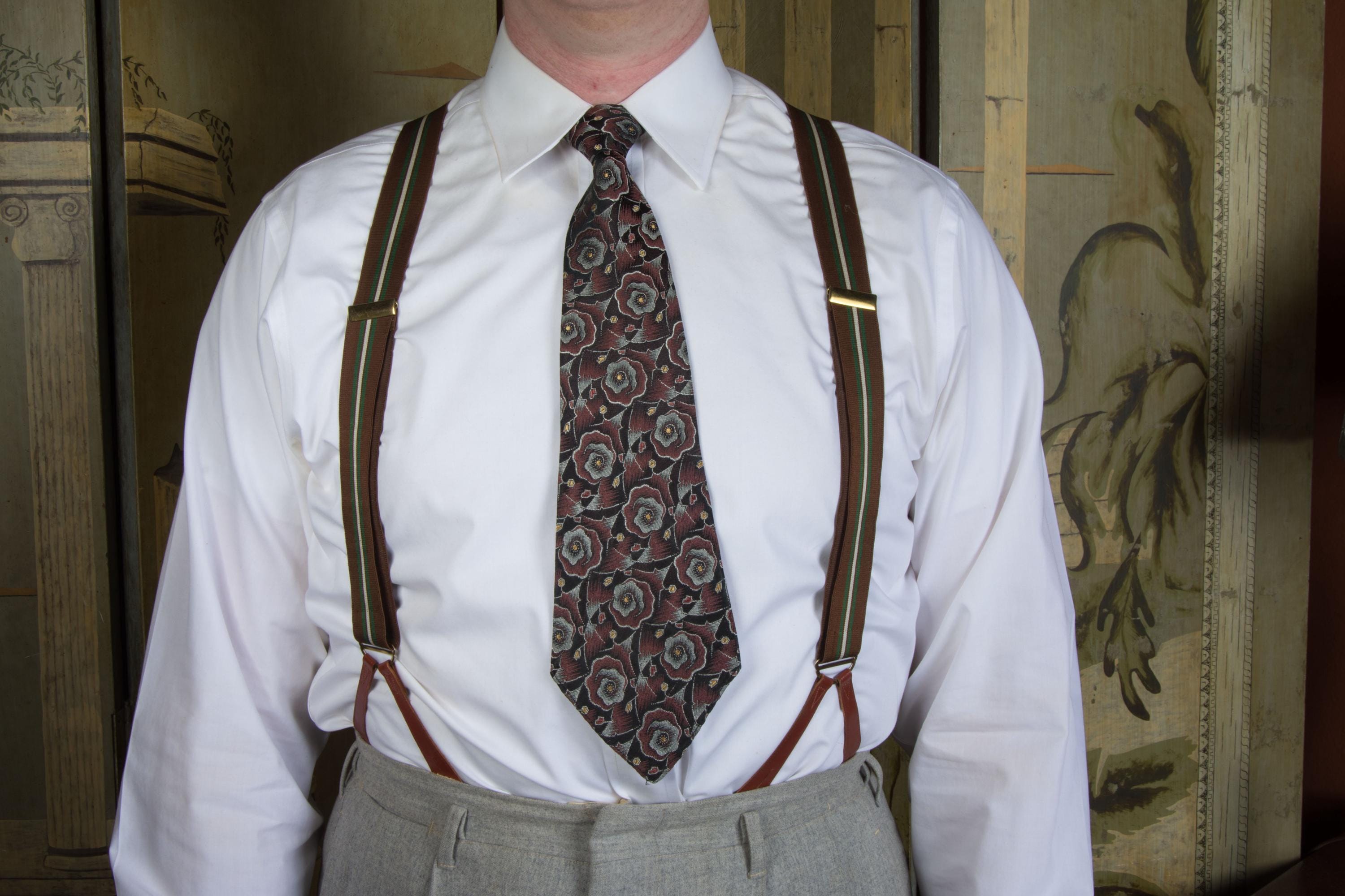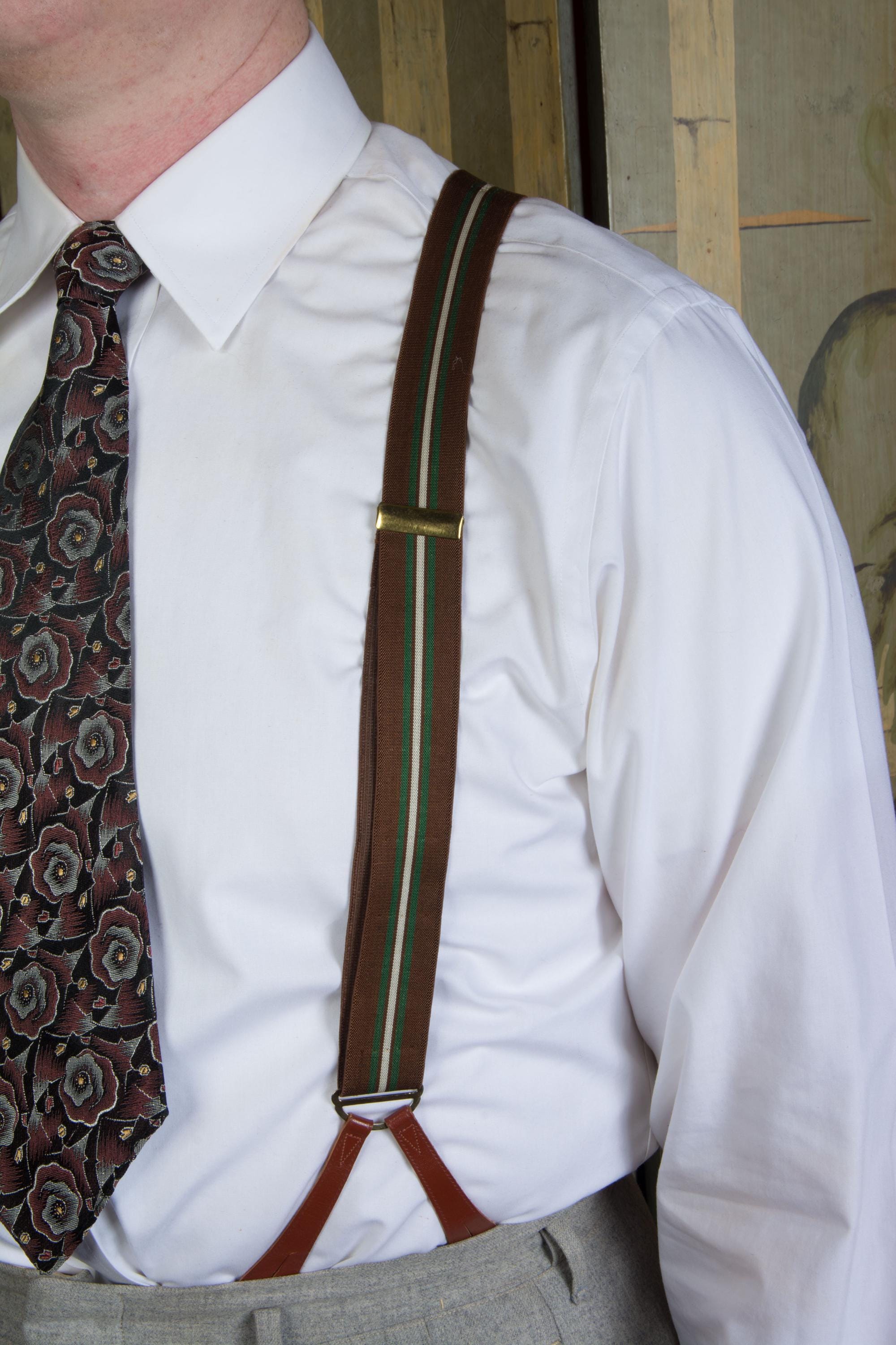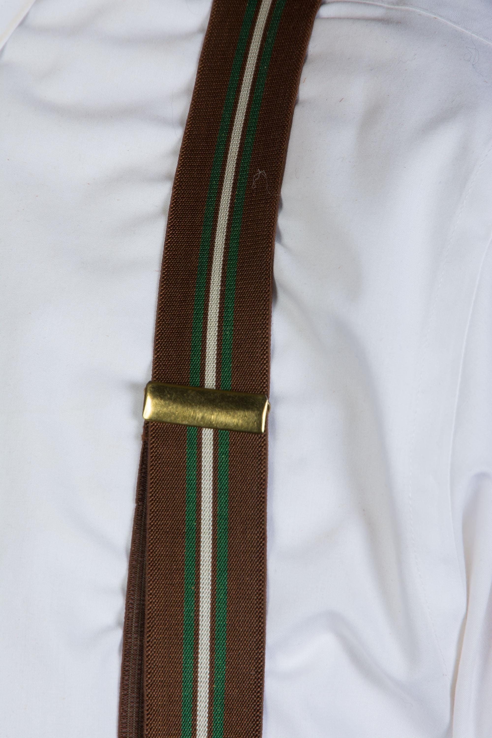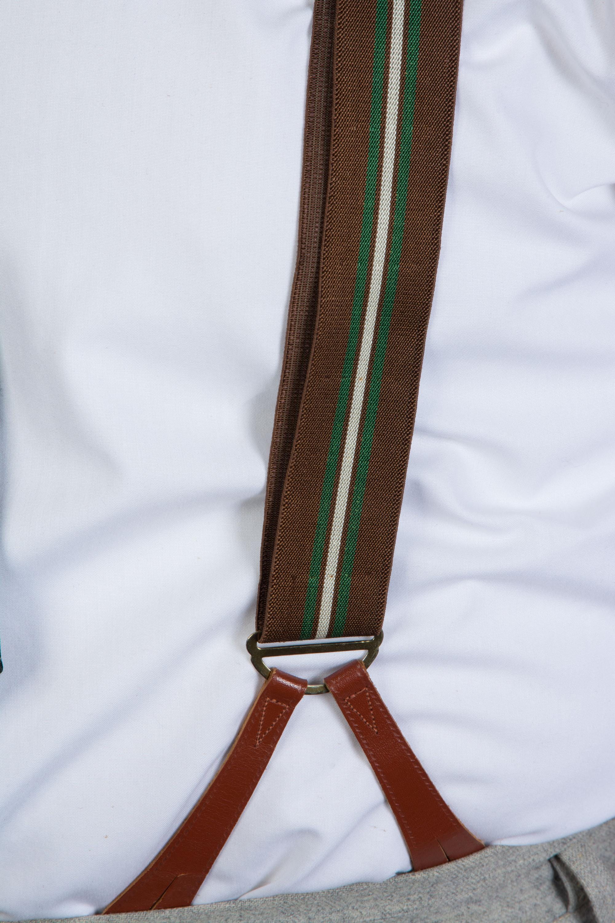 These gorgeous 1940s or 50s striped suspenders are striking in brown, green and white stripe. They feature a decoratively embossed gold tone slider to adjust the back - its very deco looking, but I do think these are later. At front, they have embossed gold tone locking slides. The button holes are cognac colored leather
