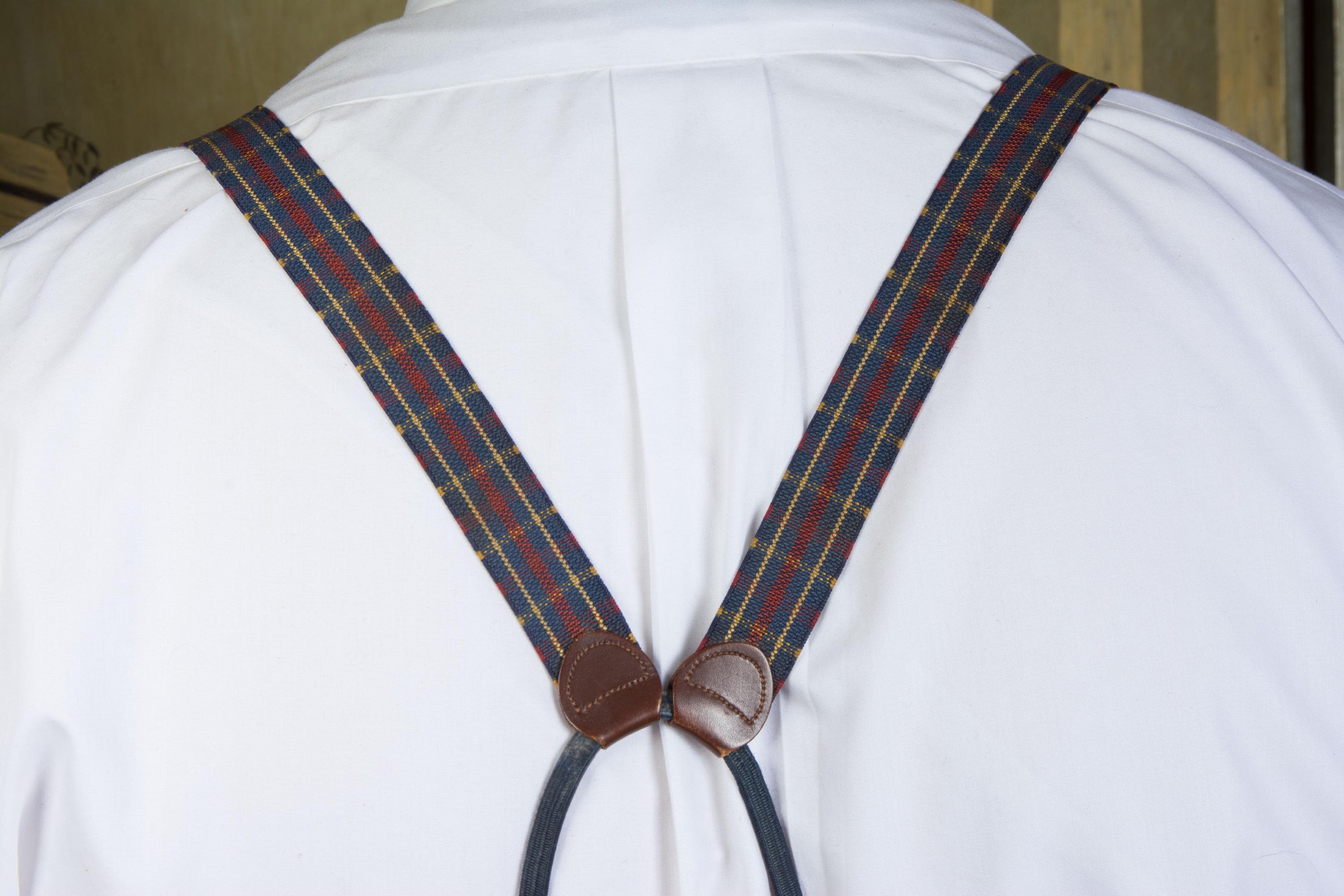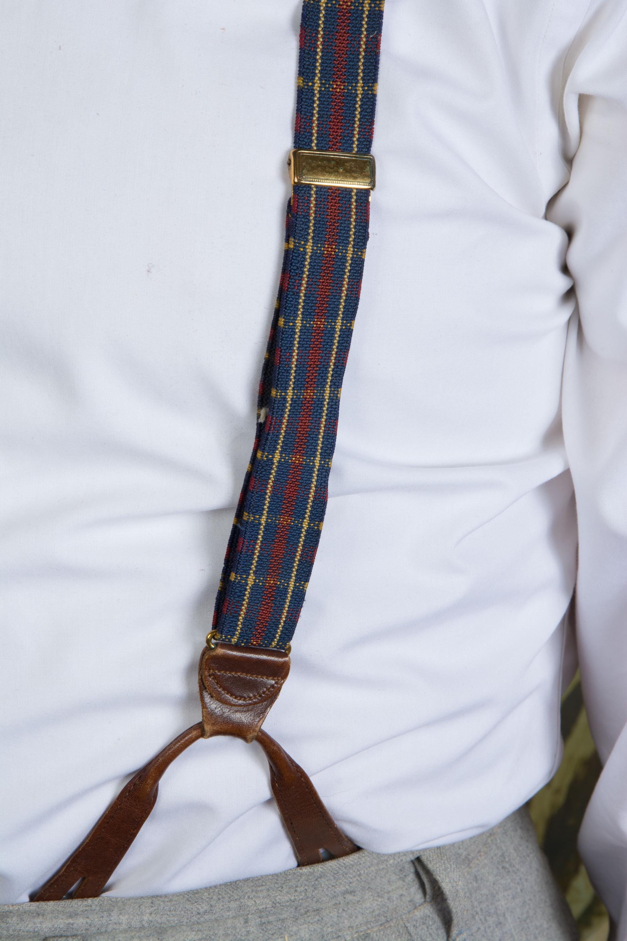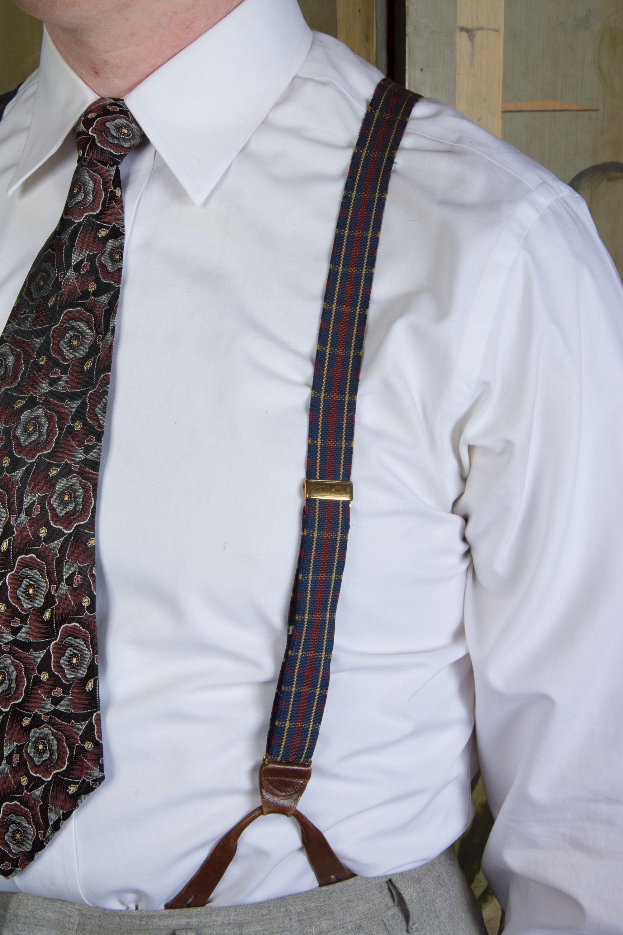 These late 1930s or 40s striped suspenders by Hickok are just gorgeous in a plaid of blue, red, and yellow. These have an x shaped back with long corded elastic for the lower half. At front, they have embossed goldtone slide buckles. The leather buttonholes are a darker, rich brown hue.
