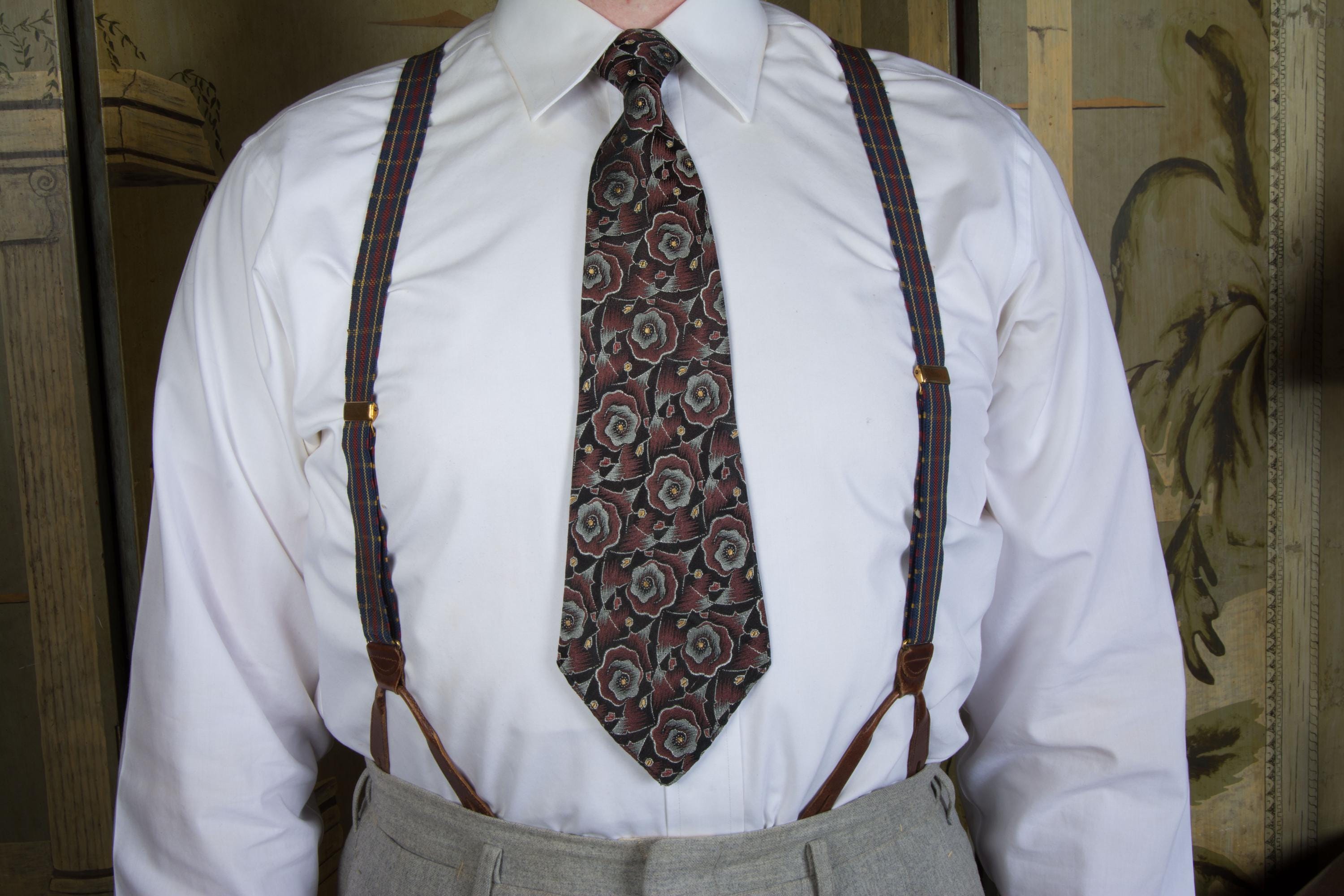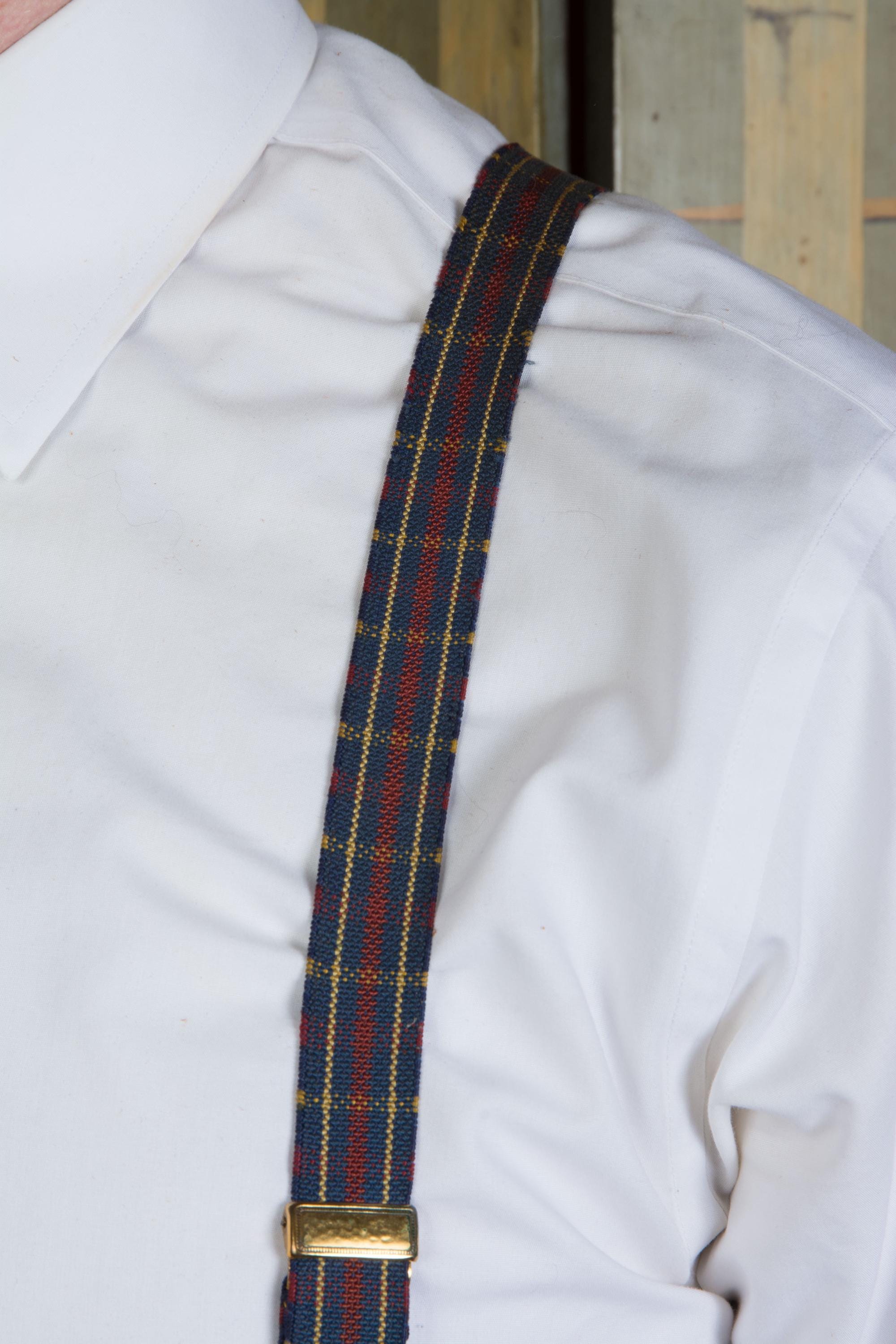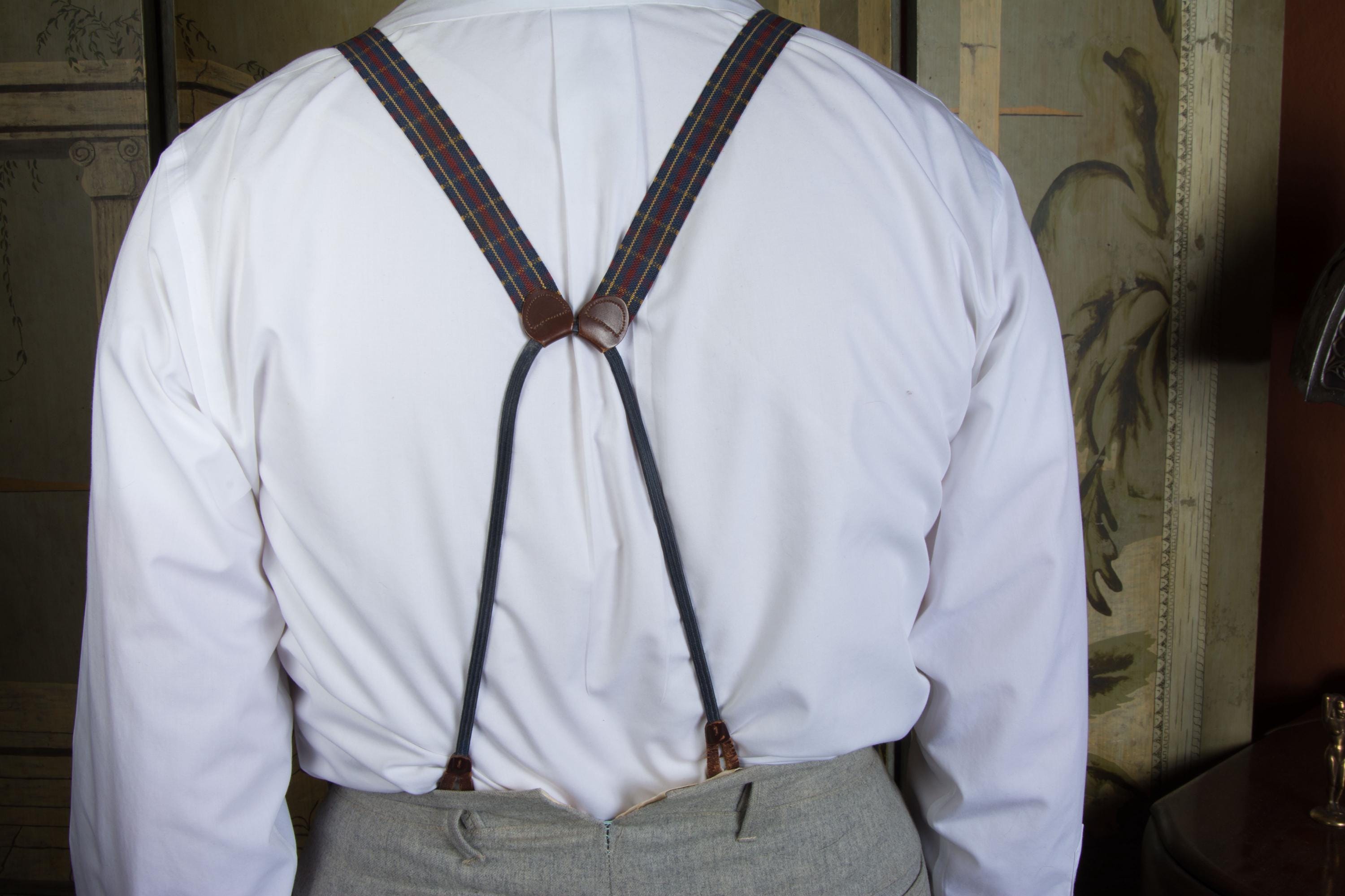 These late 1930s or 40s striped suspenders by Hickok are just gorgeous in a plaid of blue, red, and yellow. These have an x shaped back with long corded elastic for the lower half. At front, they have embossed goldtone slide buckles. The leather buttonholes are a darker, rich brown hue.