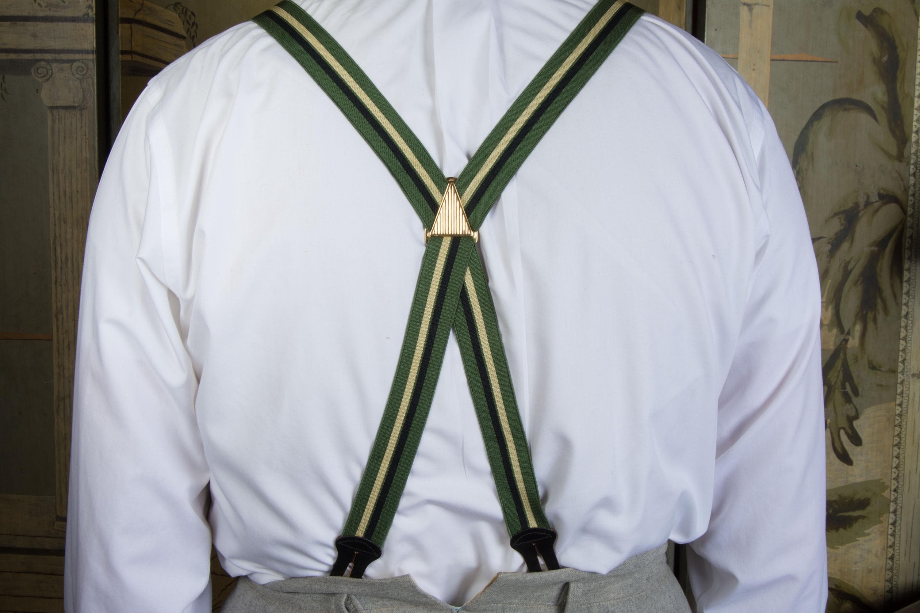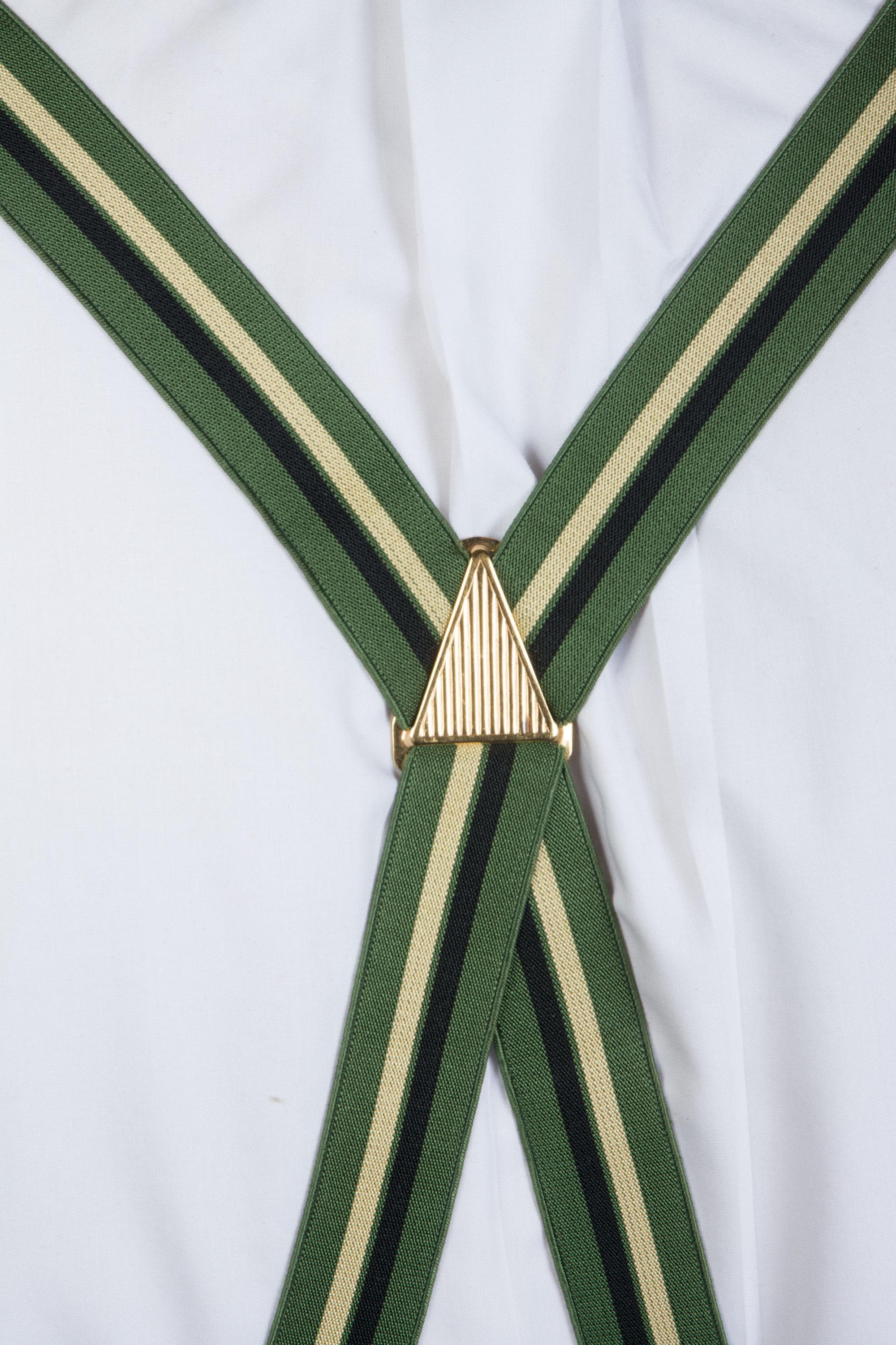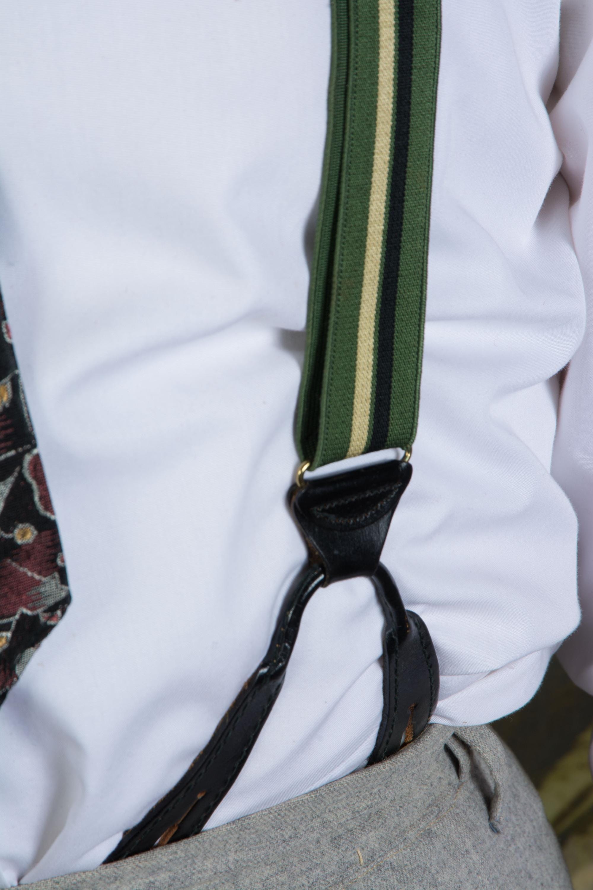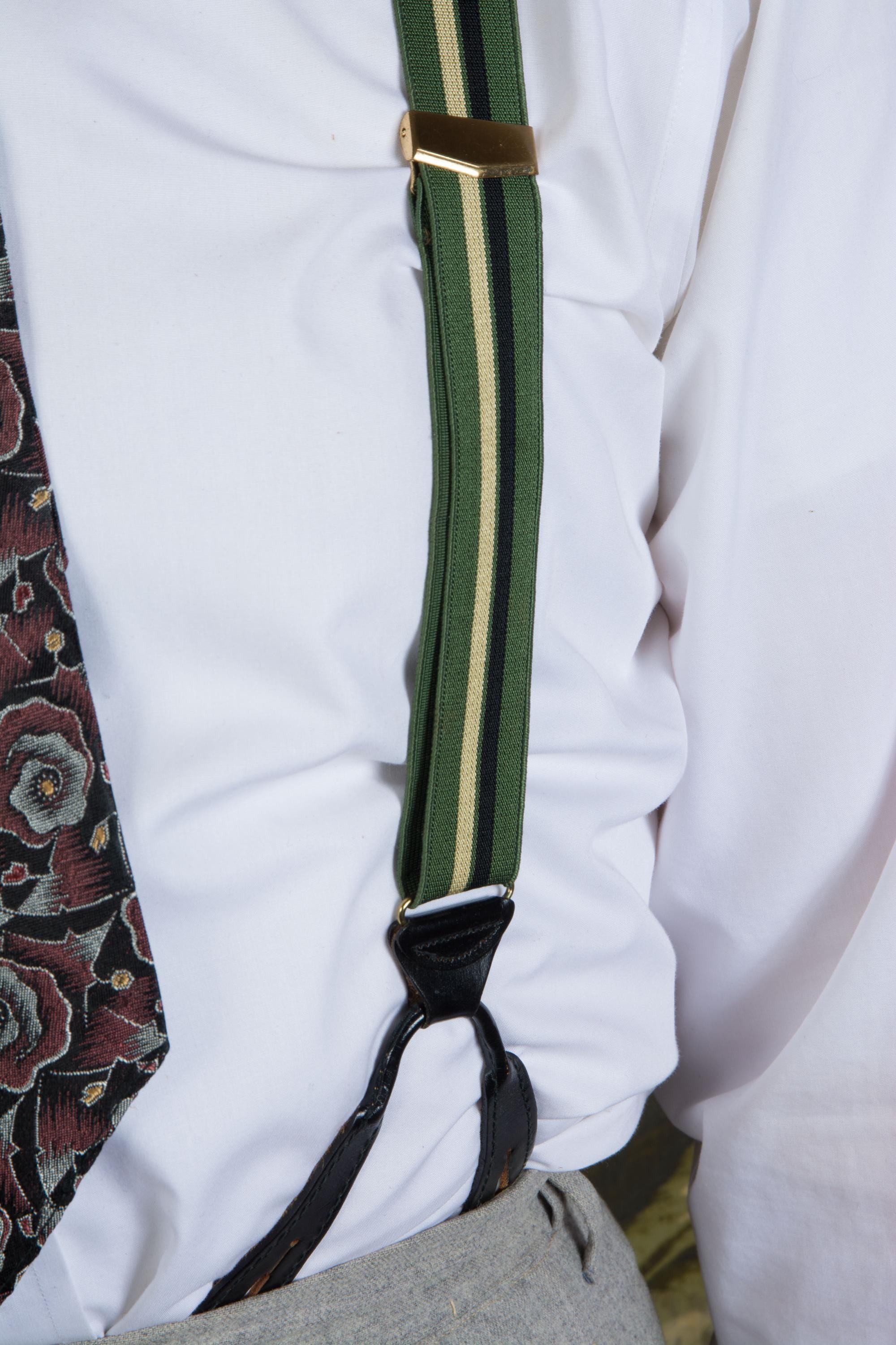 These late 1950s striped suspenders by Hickok are bold in a wide stripe of dusky green, black and ecru. The feature a decoratively embossed gold tone slider to adjust the back. At front, they have goldton slide buckles. The leather button holes are black leather.