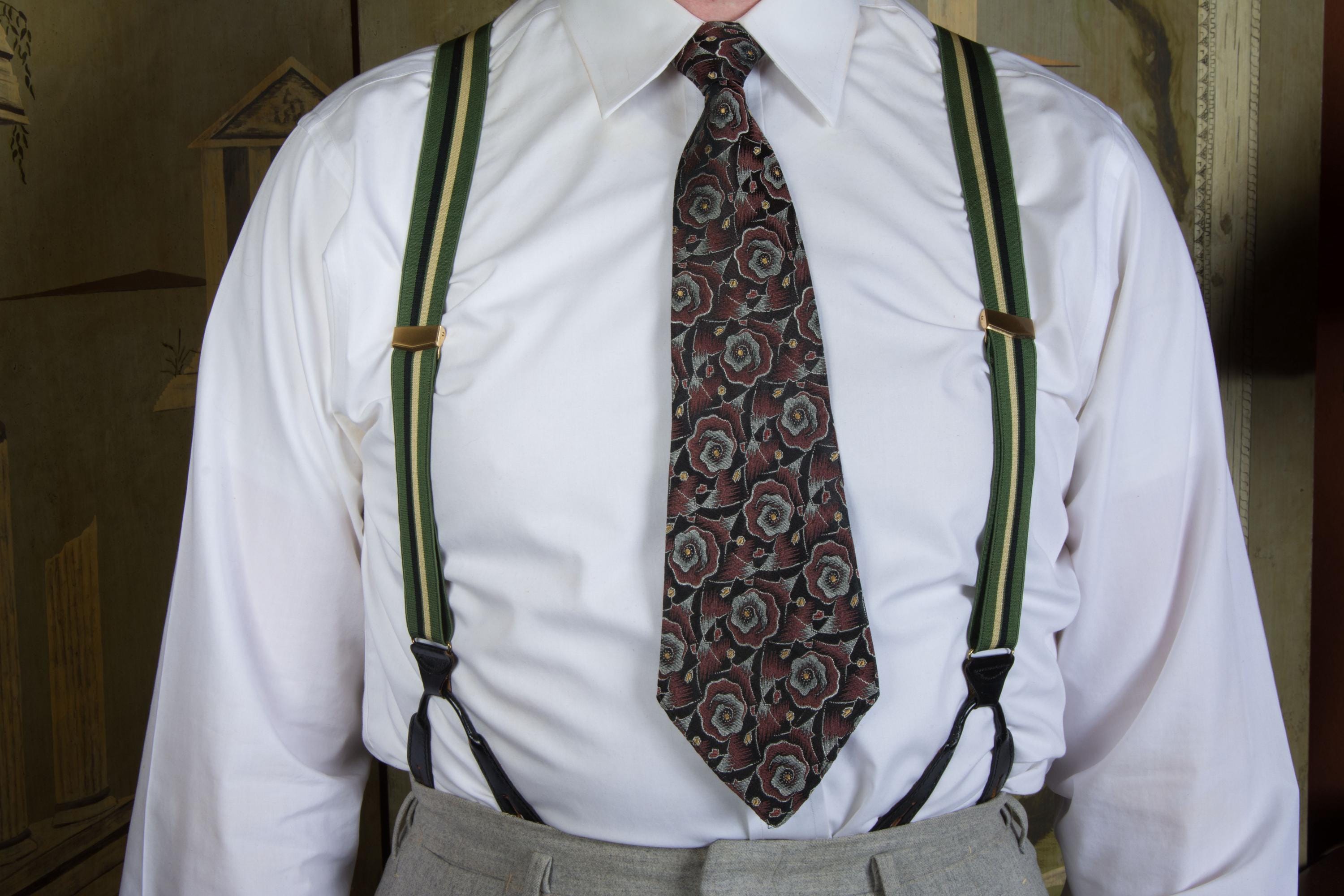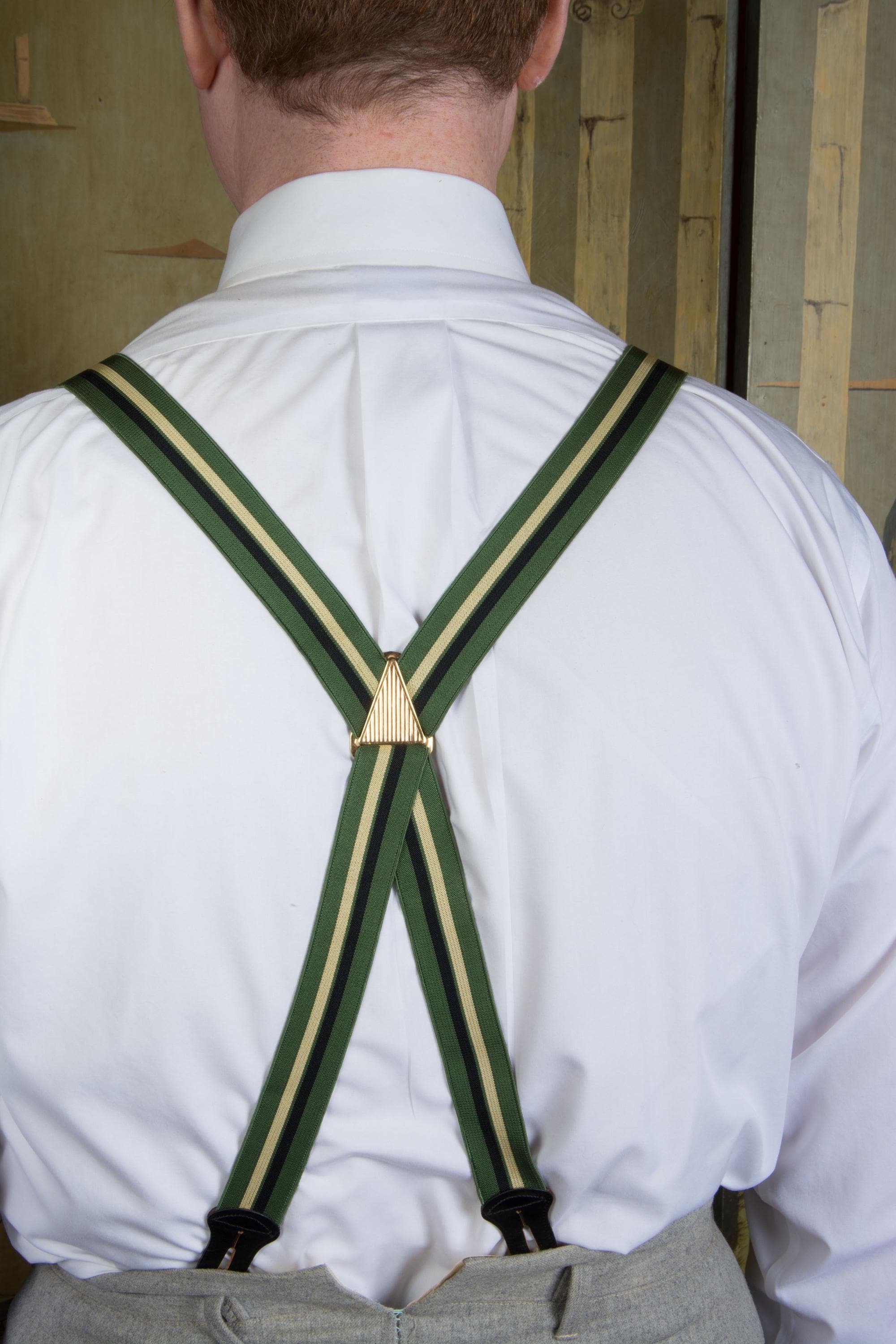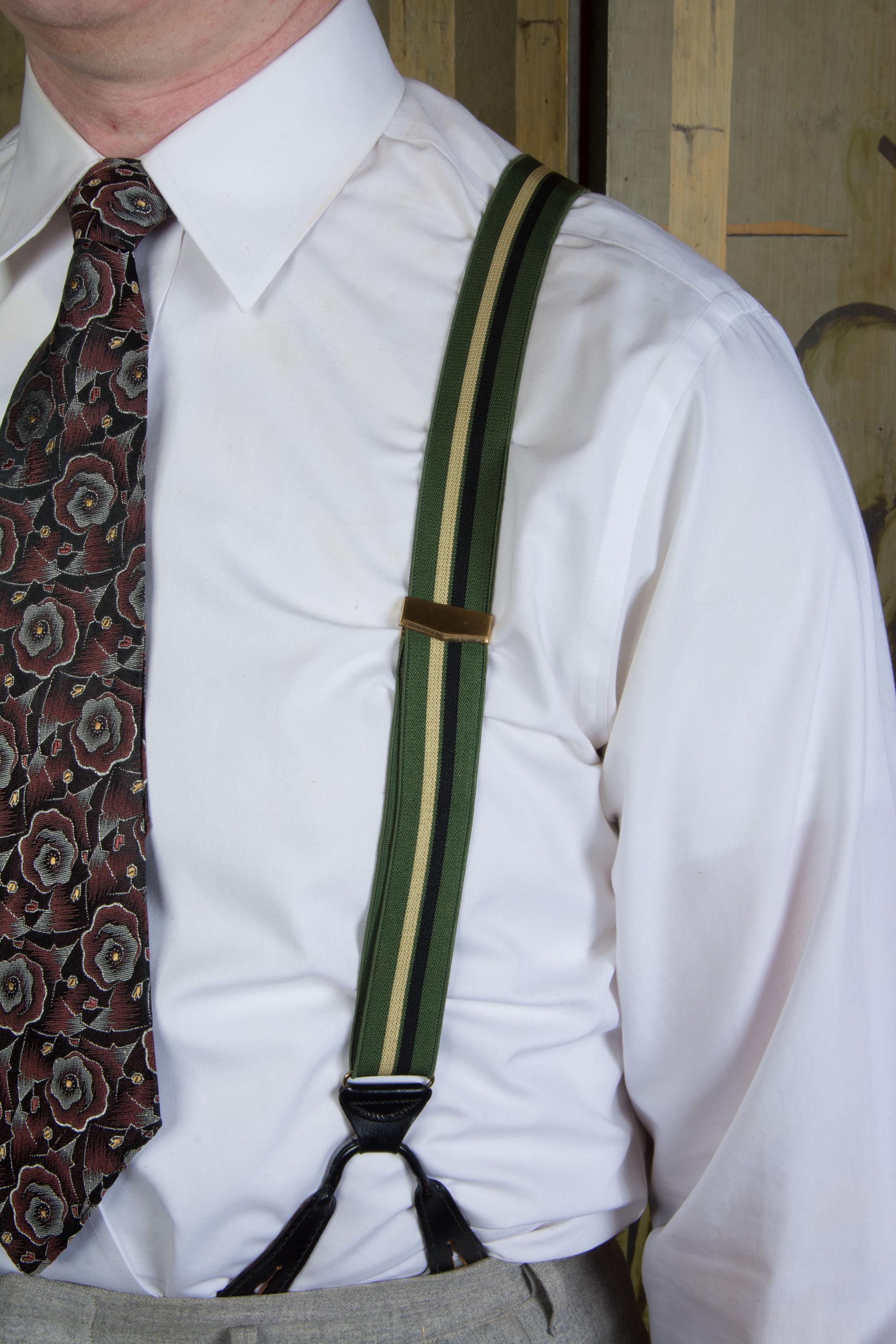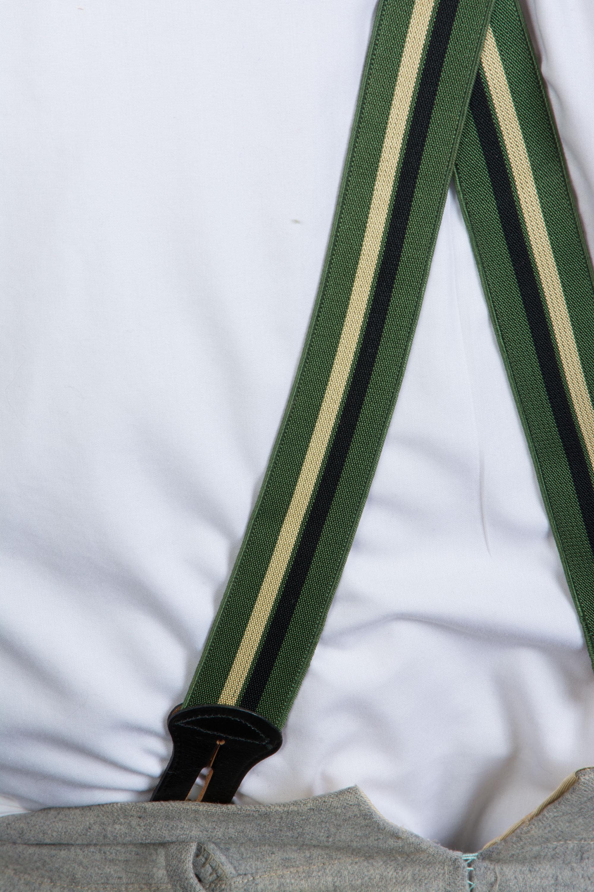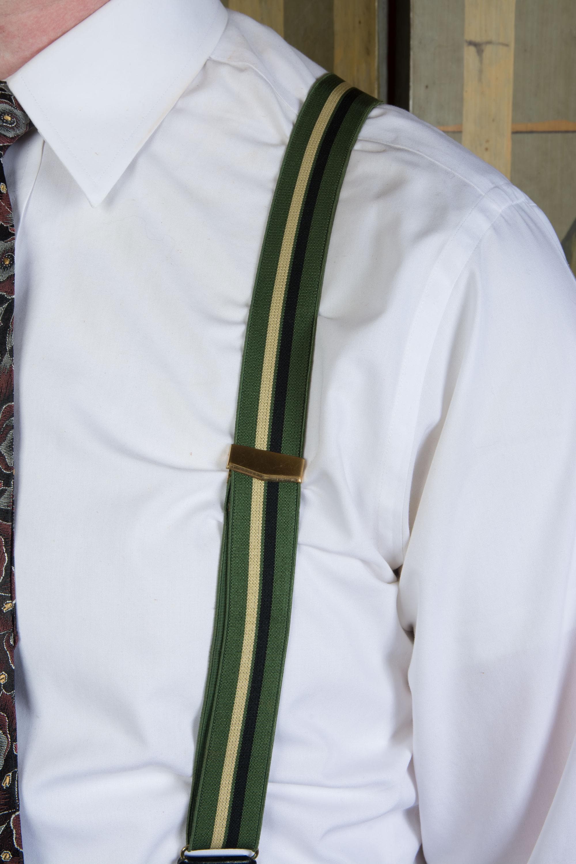 These late 1950s striped suspenders by Hickok are bold in a wide stripe of dusky green, black and ecru. The feature a decoratively embossed gold tone slider to adjust the back. At front, they have goldton slide buckles. The leather button holes are black leather.