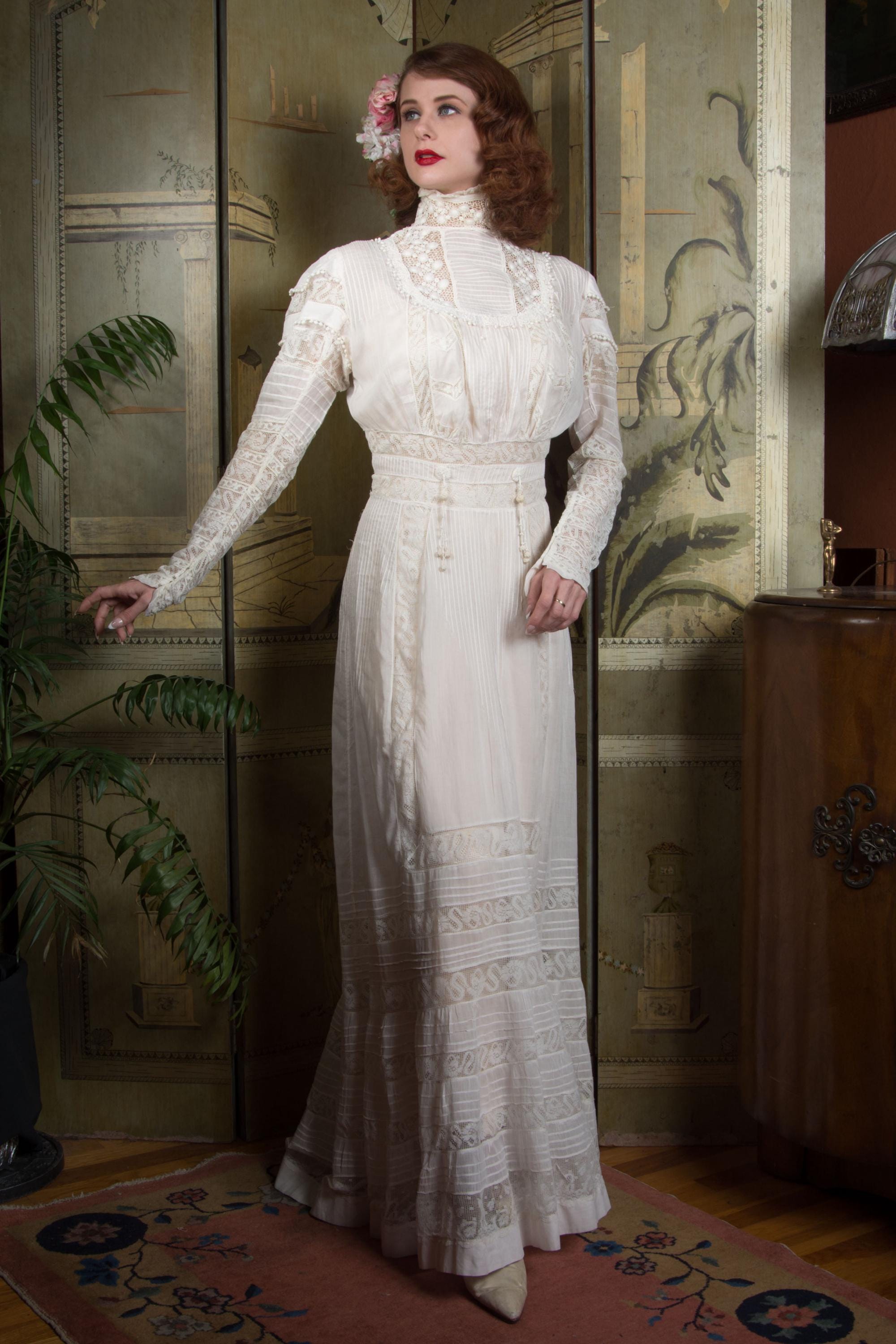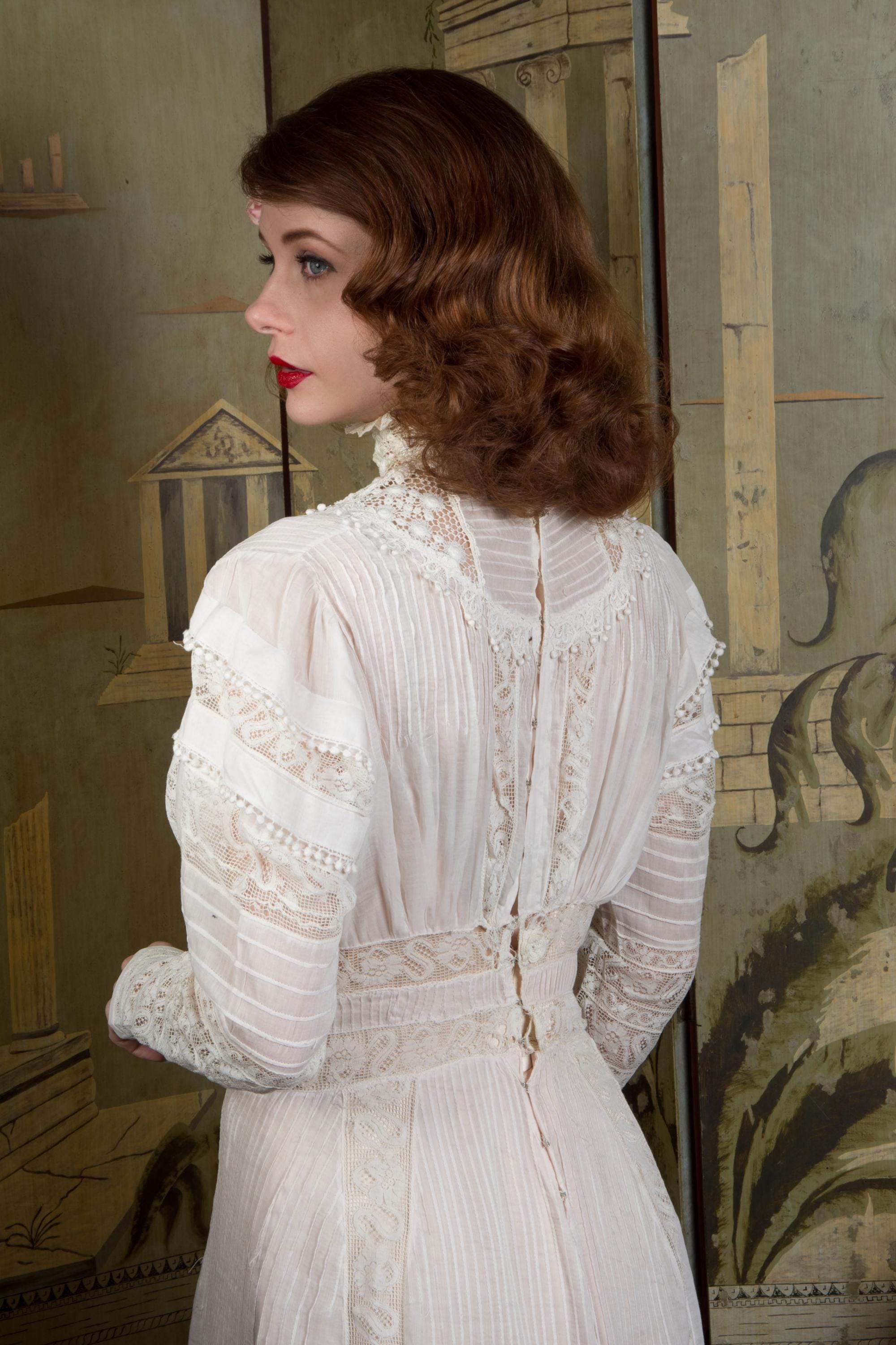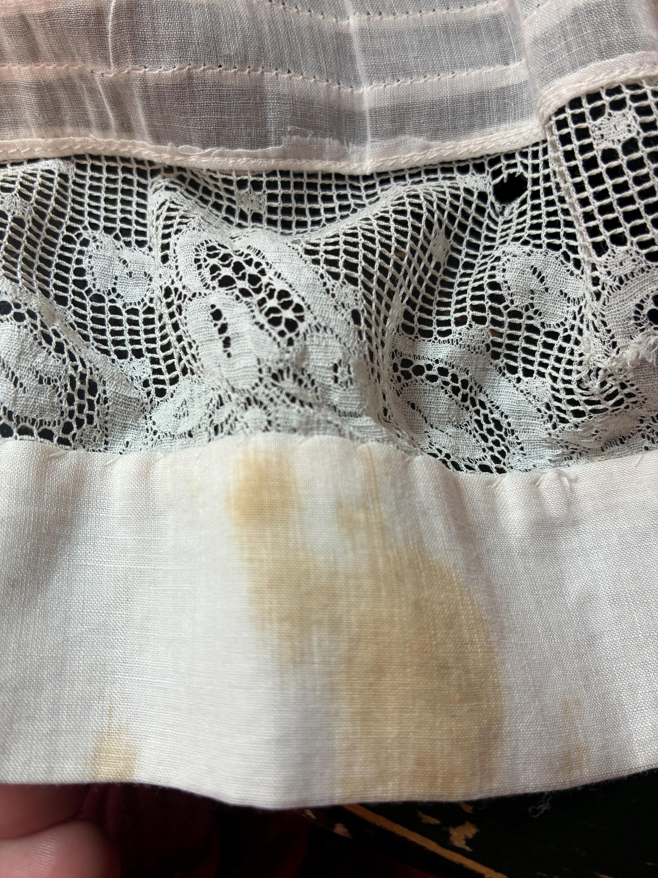 This dress has been freshly and carefully hand laundered, and is ready to wear. There is a faint stain on the pintucks below the waist, and a little more on the lefthand knotted tassel. There is a notable stain at the back center hem, almost entirely on the interior (interior photographed.) There is a single break in the irish crochet neckline. I find no other issues to note!