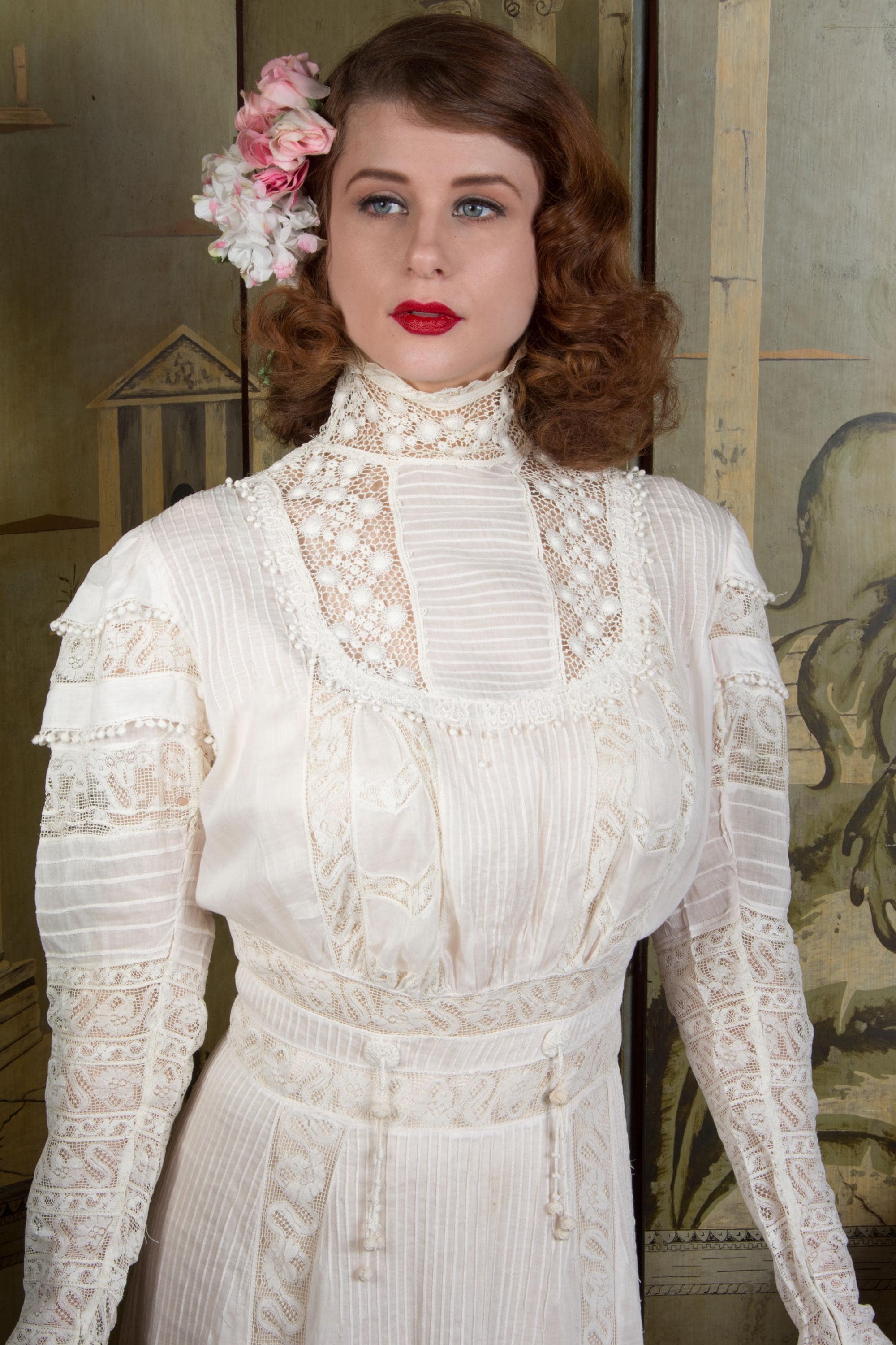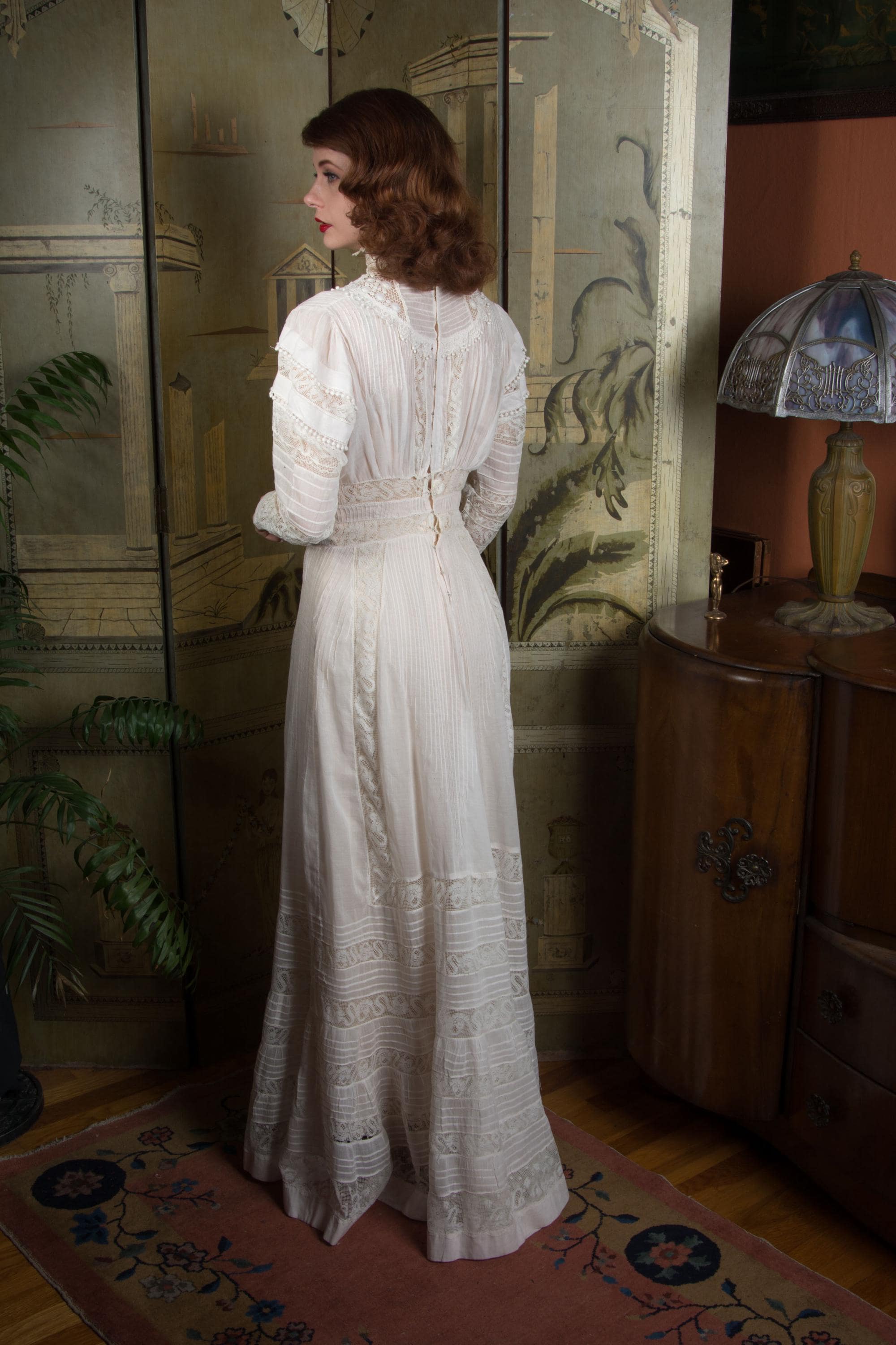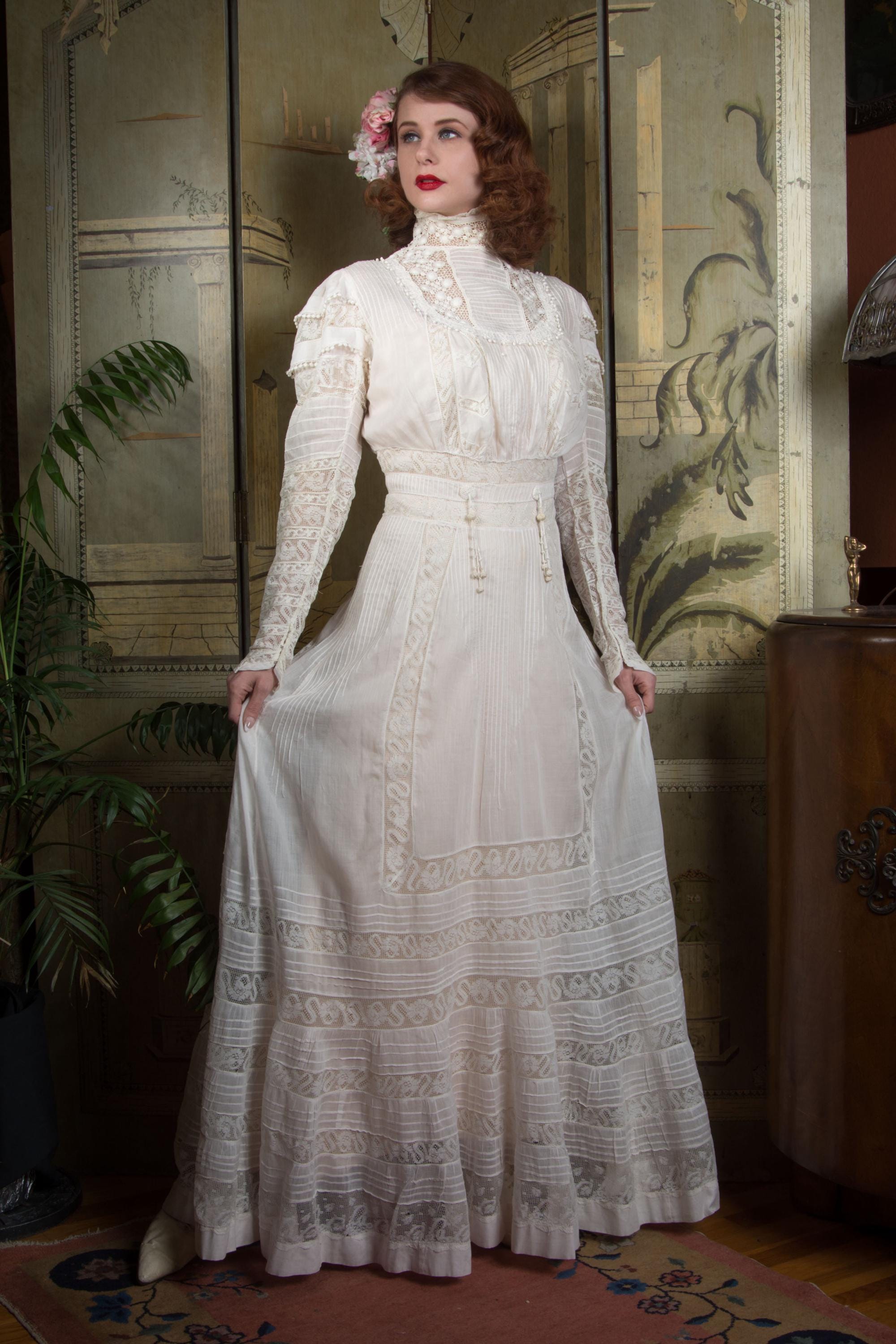 This dress has been freshly and carefully hand laundered, and is ready to wear. There is a faint stain on the pintucks below the waist, and a little more on the lefthand knotted tassel. There is a notable stain at the back center hem, almost entirely on the interior (interior photographed.) There is a single break in the irish crochet neckline. I find no other issues to note!