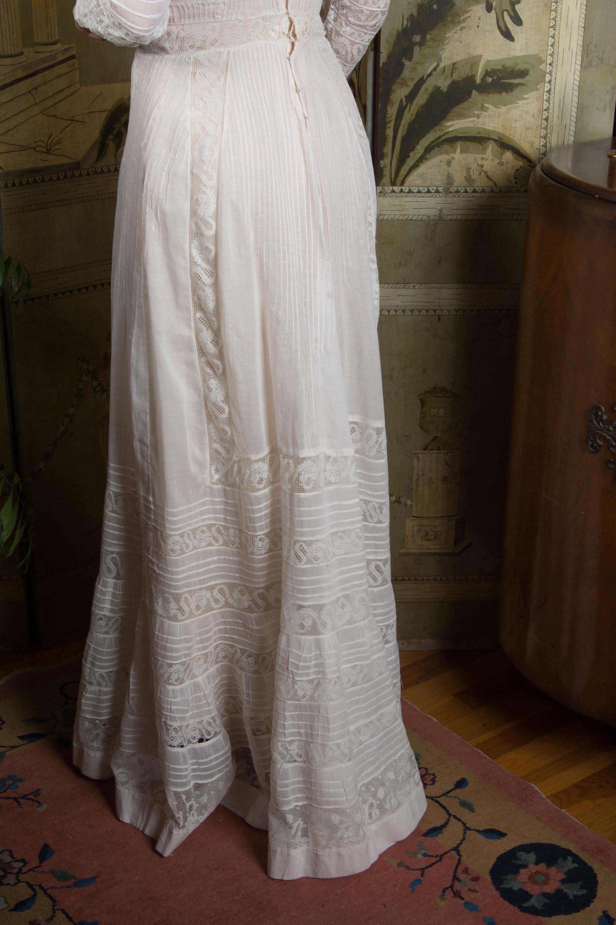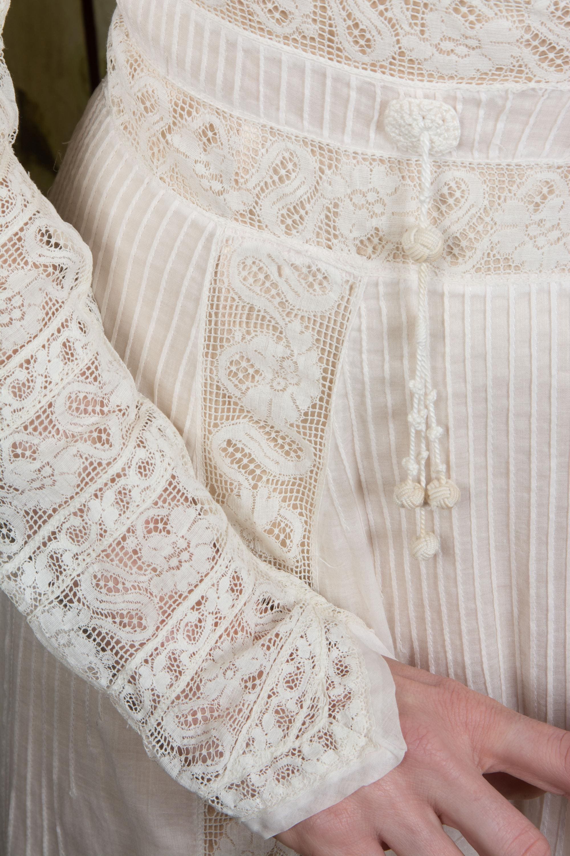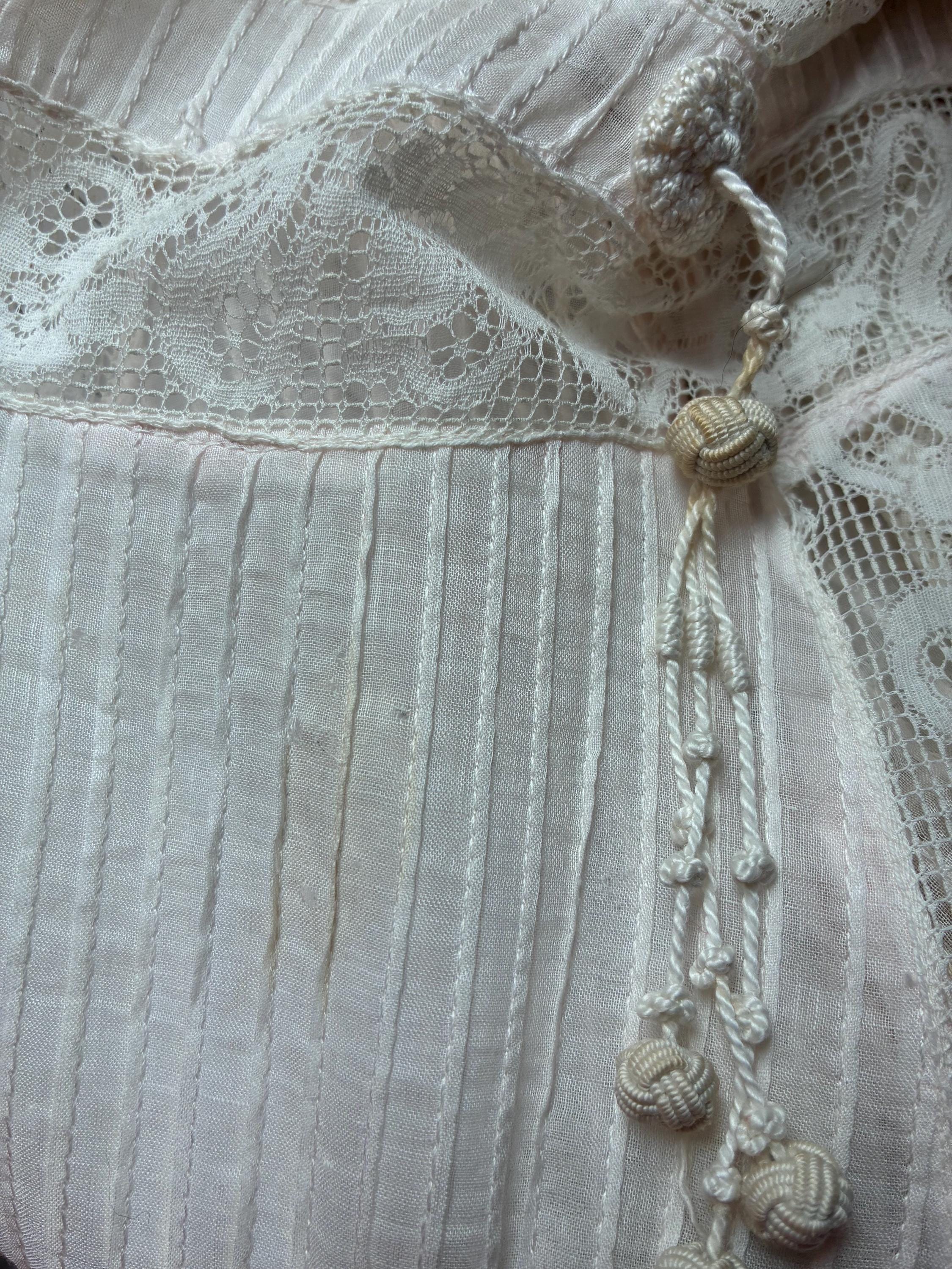 An ethereal Edwardian dress of light soft lingerie cotton, Irish crochet lace, filet lace and other passementerie. It is the palest possible pink I think I've ever seen - and I might not have noticed if I had not washed it with two other white dresses. It is not dye transfer, as it is only the lingerie cotton and perfectly even. A pink practically white. An exquisite 1900 piece, this has a high collared neckline, which is all Irish crochet lace with rosette embroidery. The same runs through the upper bodice, trimmed with a dingle ball edged lace and filled at the center with pintucked cotton. There are more dingleballs at the shoulders, where the sleeves are fuller - they are fitted to the cuff. The waist is bands of lace and pintucks, with wonderful dangling knot fringe accents. The skirt flares gently, cut slightly longer at back, and alternates lace with pintucks. This beauty closes up the back with hook and eyes.