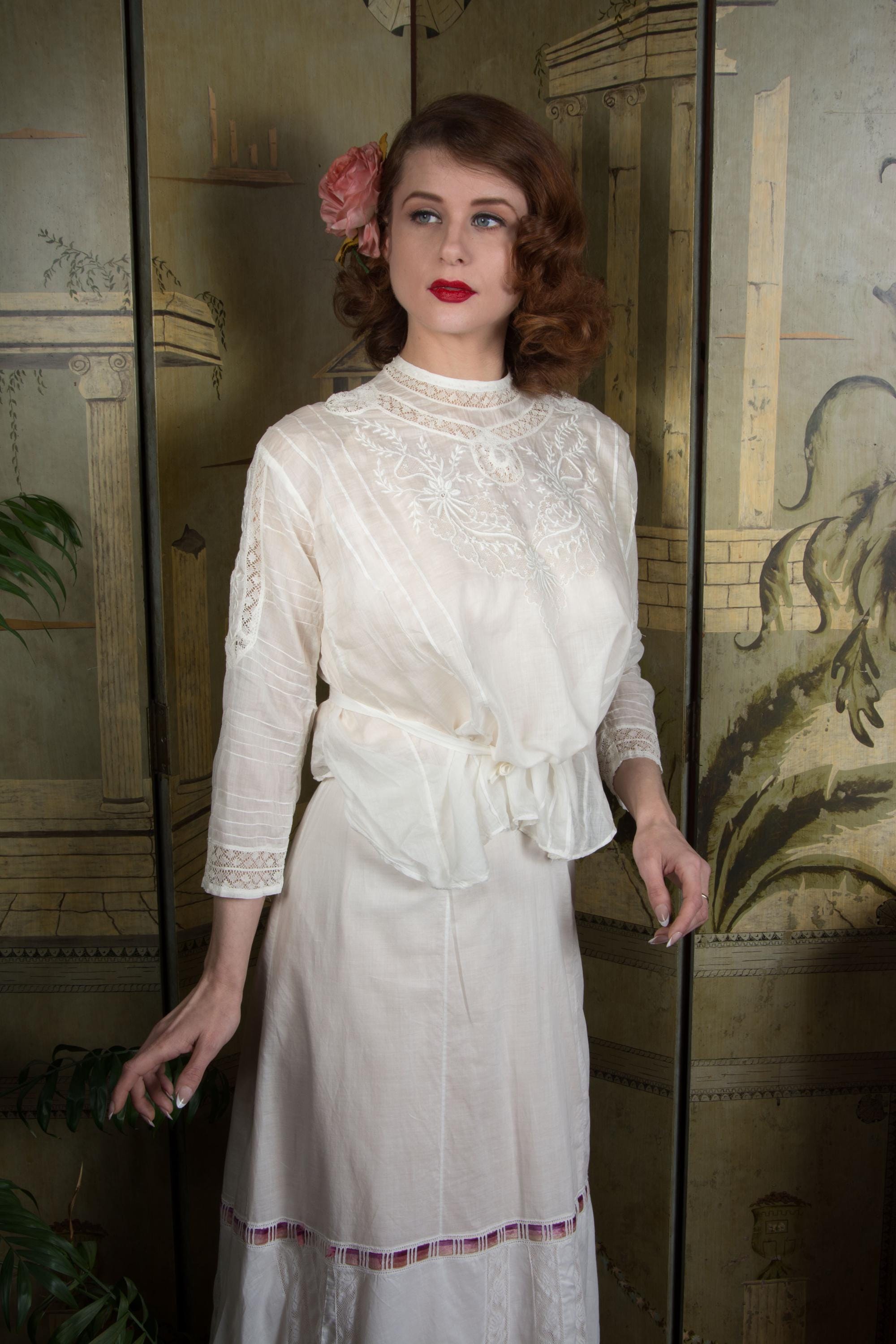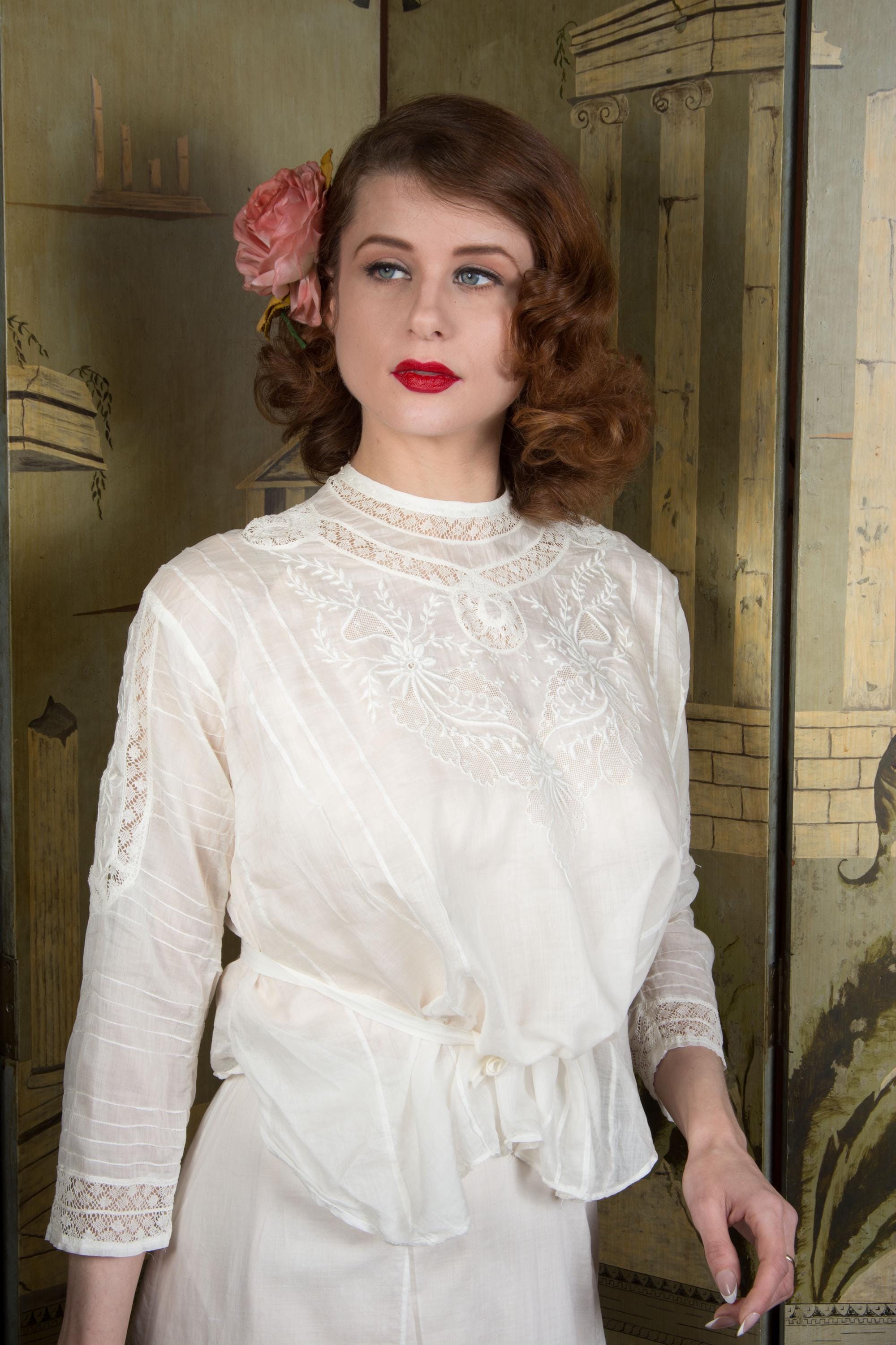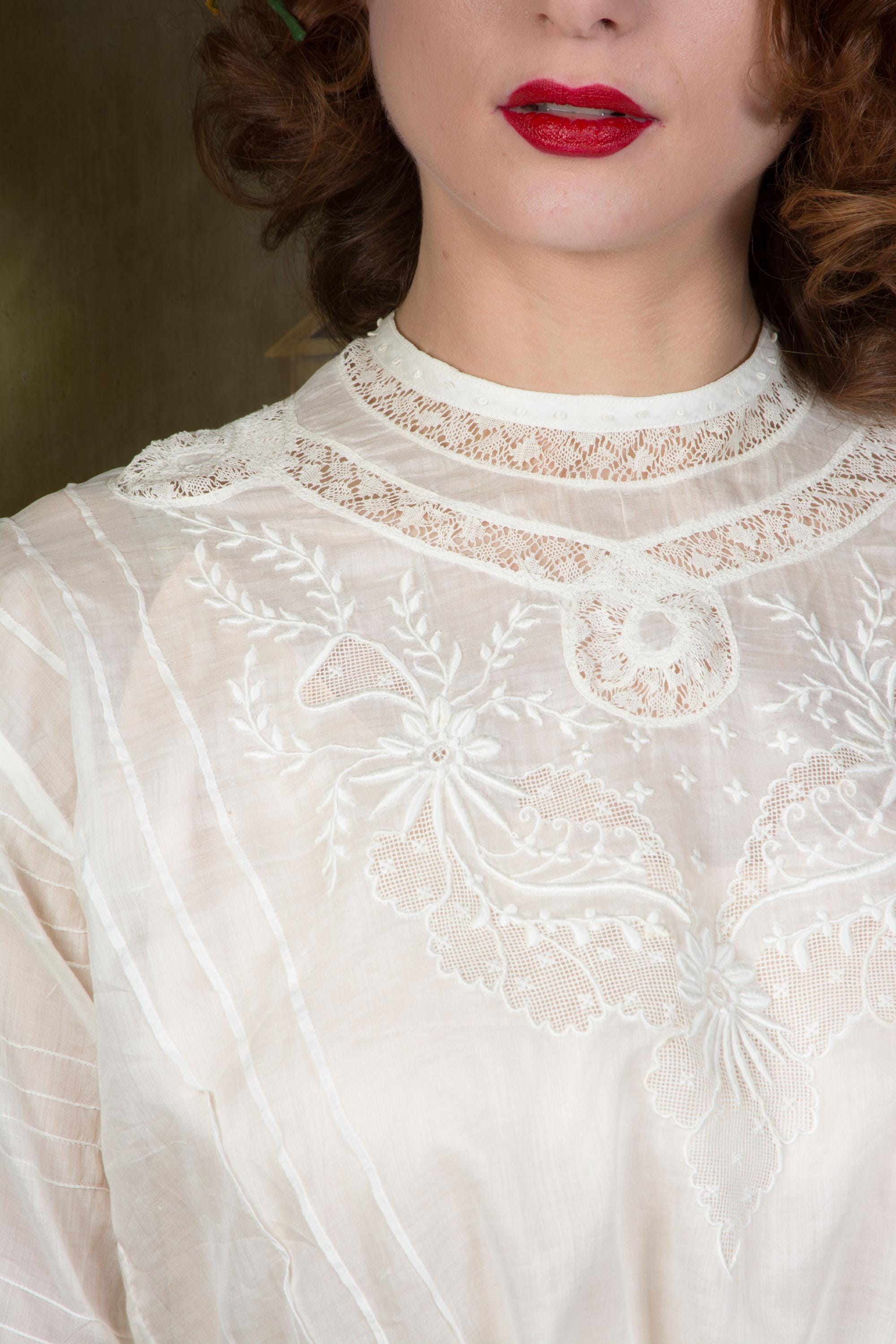 This later 1900s or early 1910s antique Edwardian blouse is a timelessly fashionable piece, quintessentially for it's era, and such a beautifully made separate that it can be worn with any modern ensemble, or vintage of later eras. Made of a lovely, lightweight lingerie cotton, it has an untailored waist meant to be ties and bloused when paired with a skirt and waist or belt. It is delicately embellished with bands of curling Valenciennes lace, embroidery with drawn worn and many very narrow pintucks. This closes up the back with hidden mother of pearl buttons.