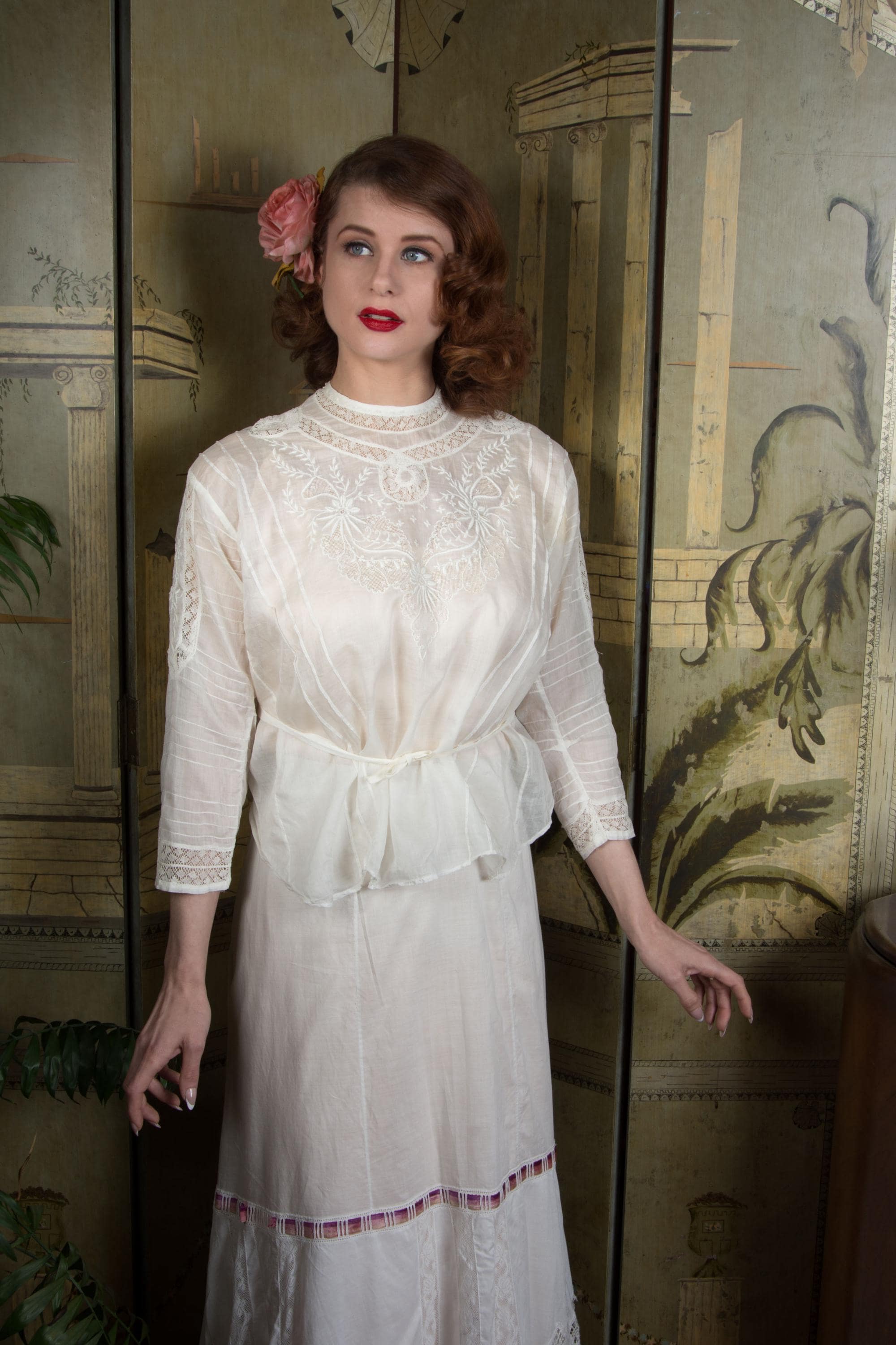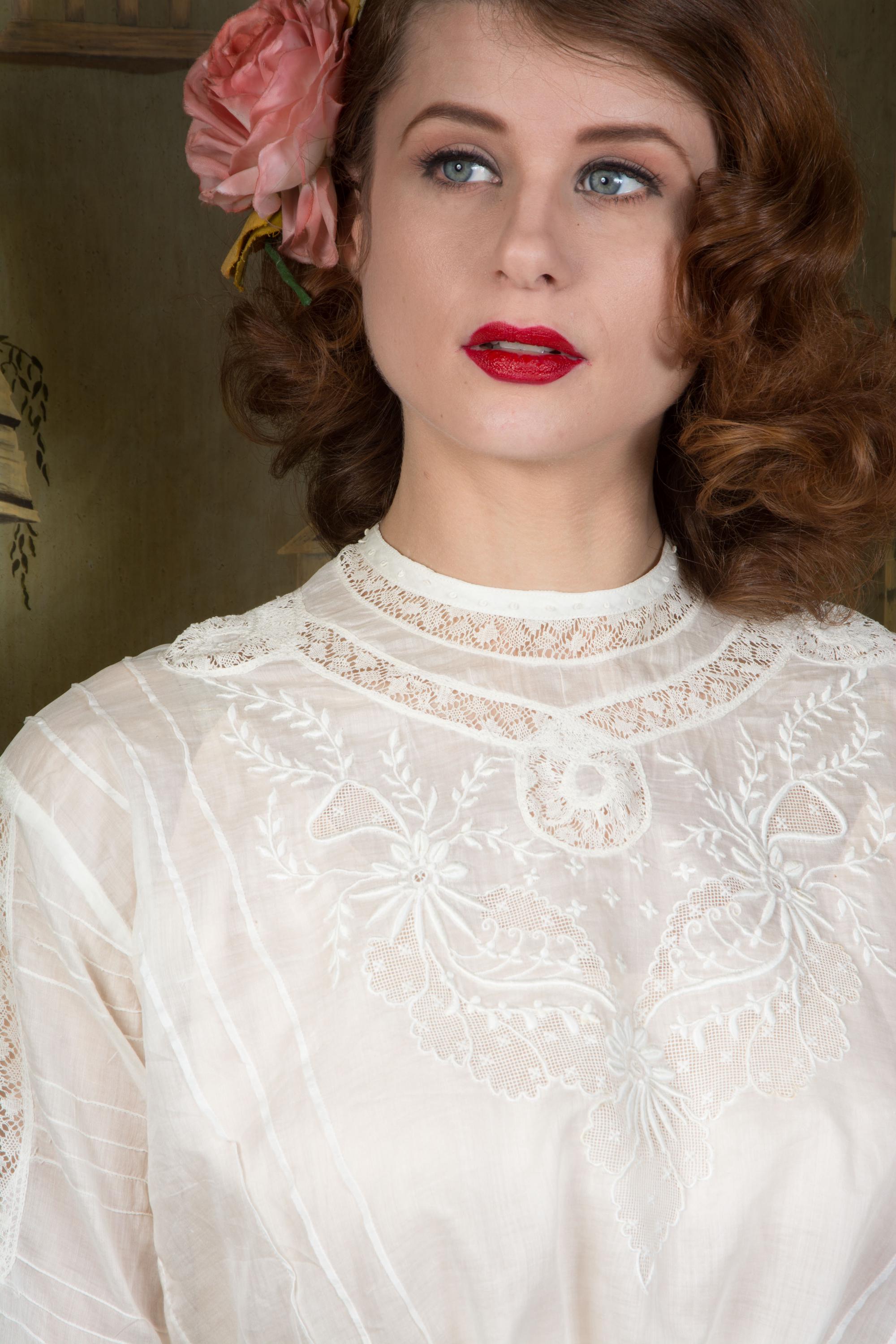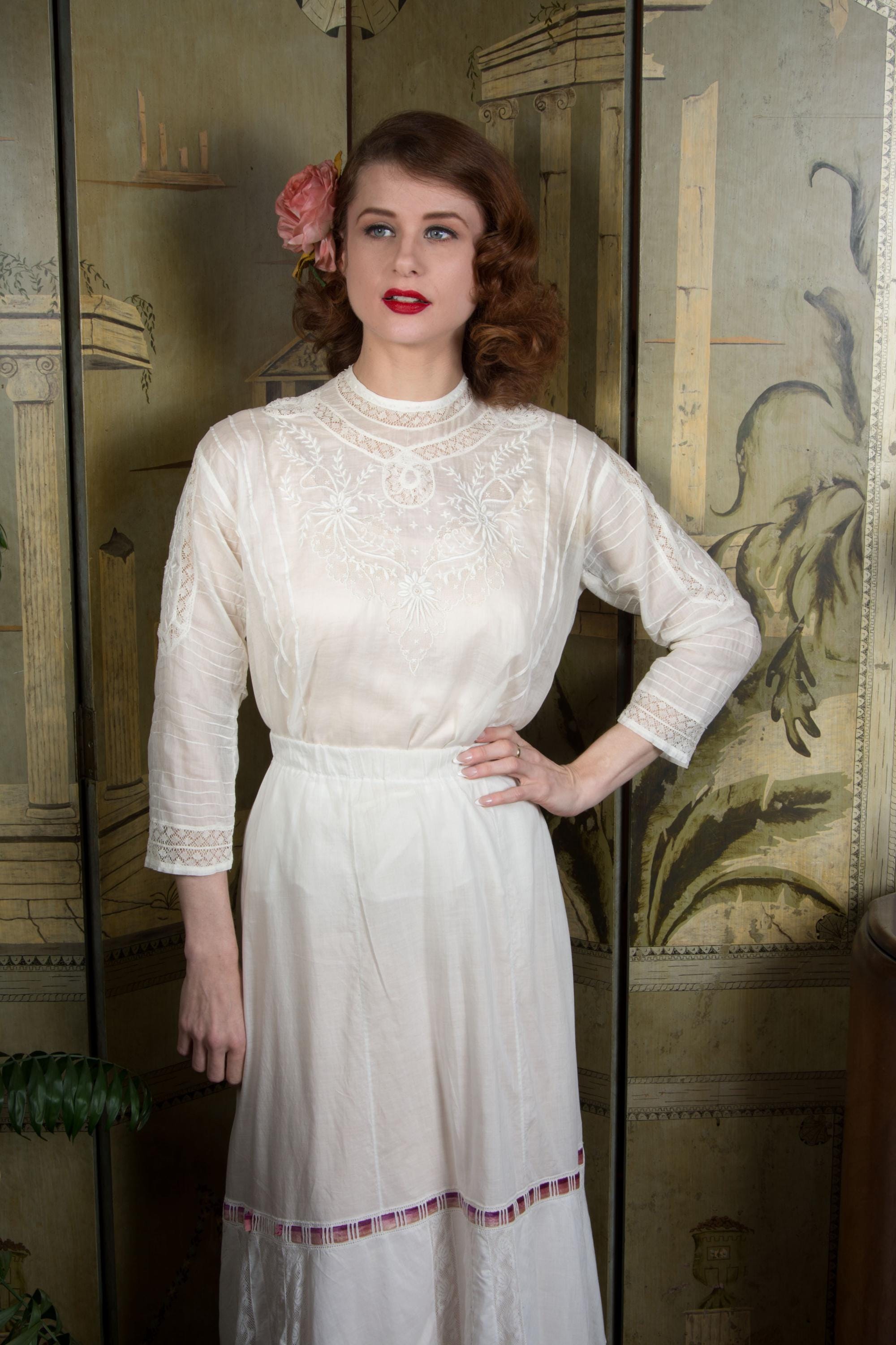 This later 1900s or early 1910s antique Edwardian blouse is a timelessly fashionable piece, quintessentially for it's era, and such a beautifully made separate that it can be worn with any modern ensemble, or vintage of later eras. Made of a lovely, lightweight lingerie cotton, it has an untailored waist meant to be ties and bloused when paired with a skirt and waist or belt. It is delicately embellished with bands of curling Valenciennes lace, embroidery with drawn worn and many very narrow pintucks. This closes up the back with hidden mother of pearl buttons.