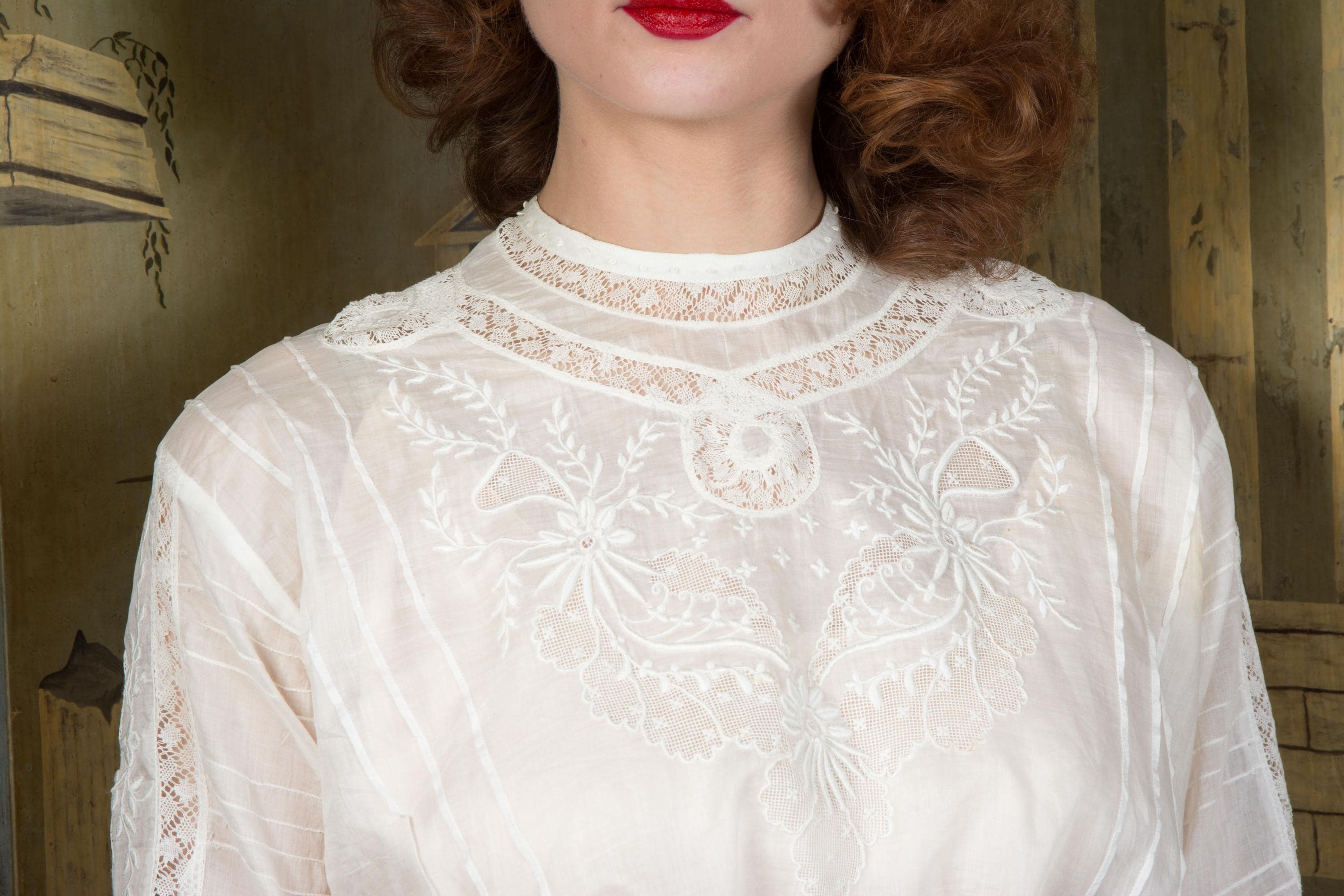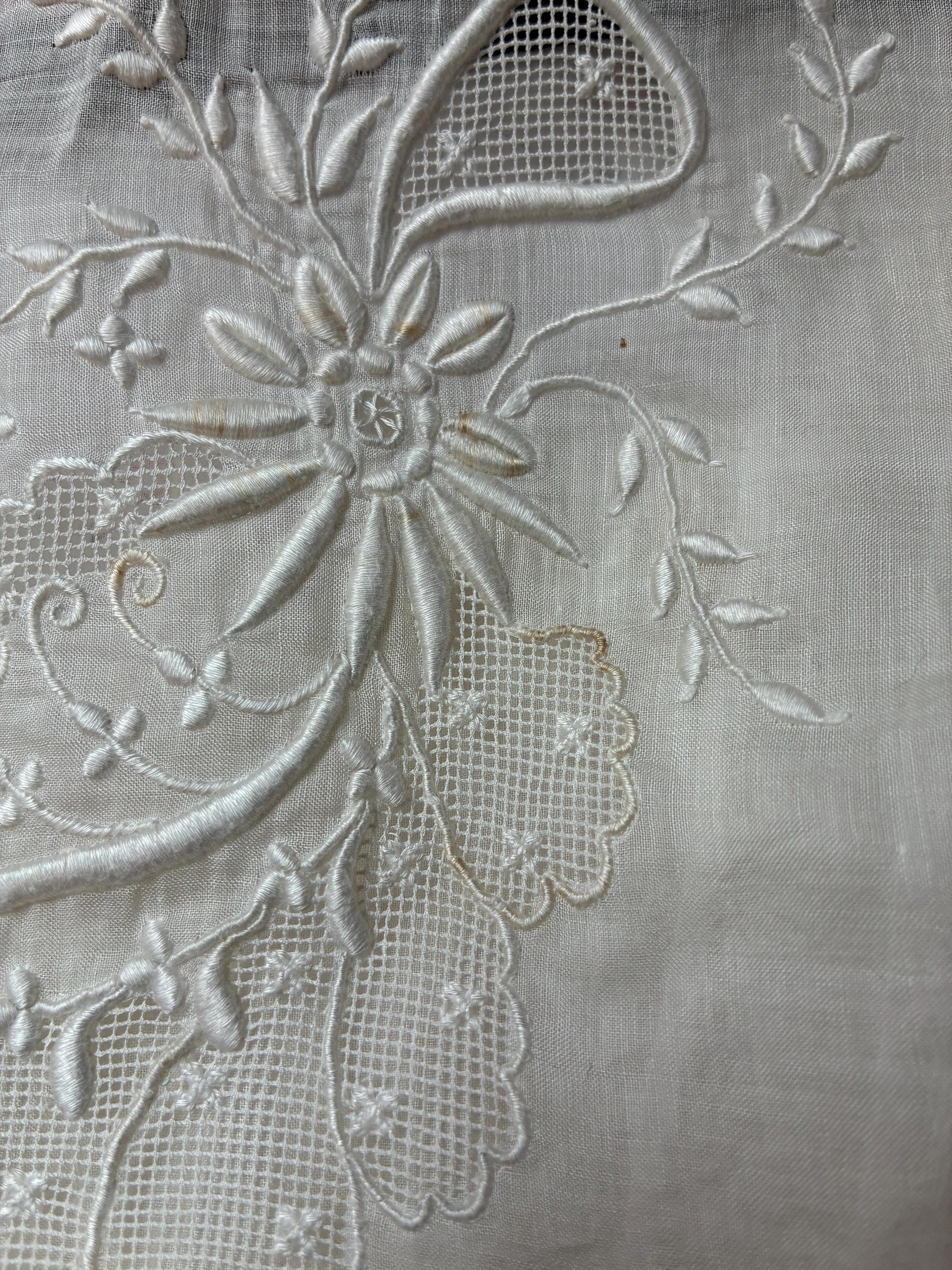 This blouse is clean and ready to wear. There is a cluster of spotting on the left side of the embroidery, but this does not stand out. I find no other issues to note!