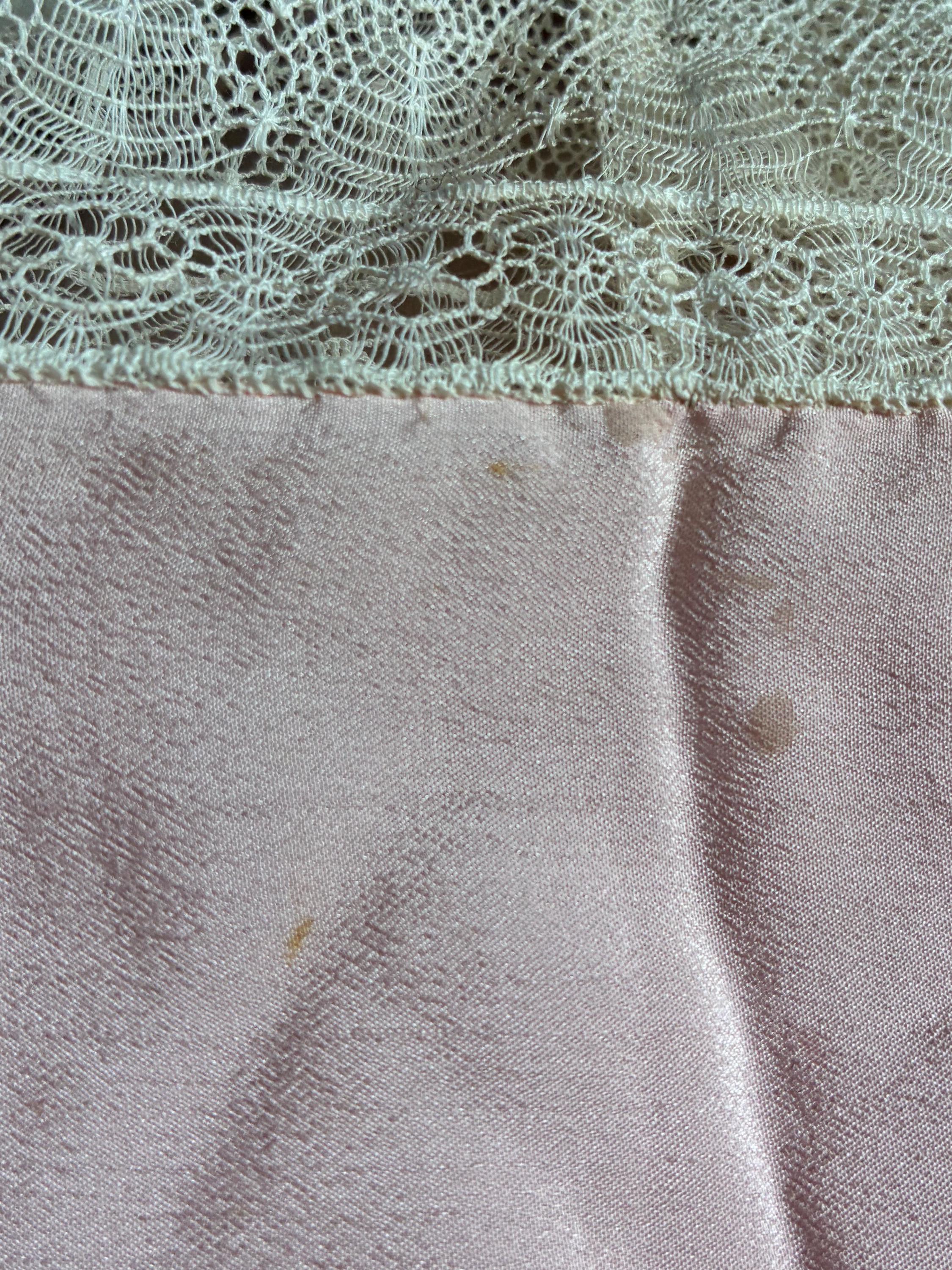 This beauty is clean and ready to wear. There are three tiny spots on the pink silk just below the lace, at approximately the right strap point. The elastic is freshly replaced - I always use the same width as the original material. It is strong and snappy. I find no other issues to note!
