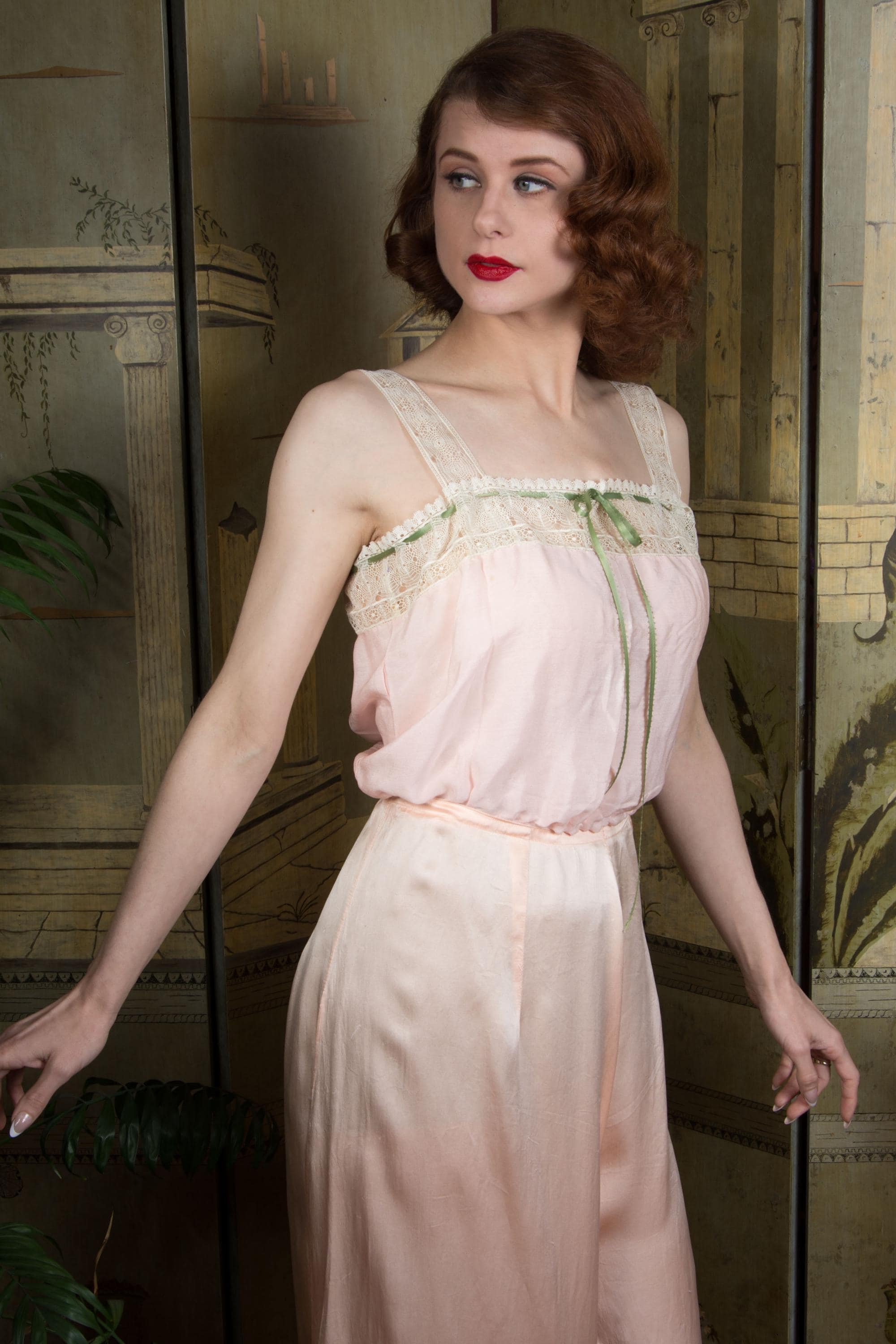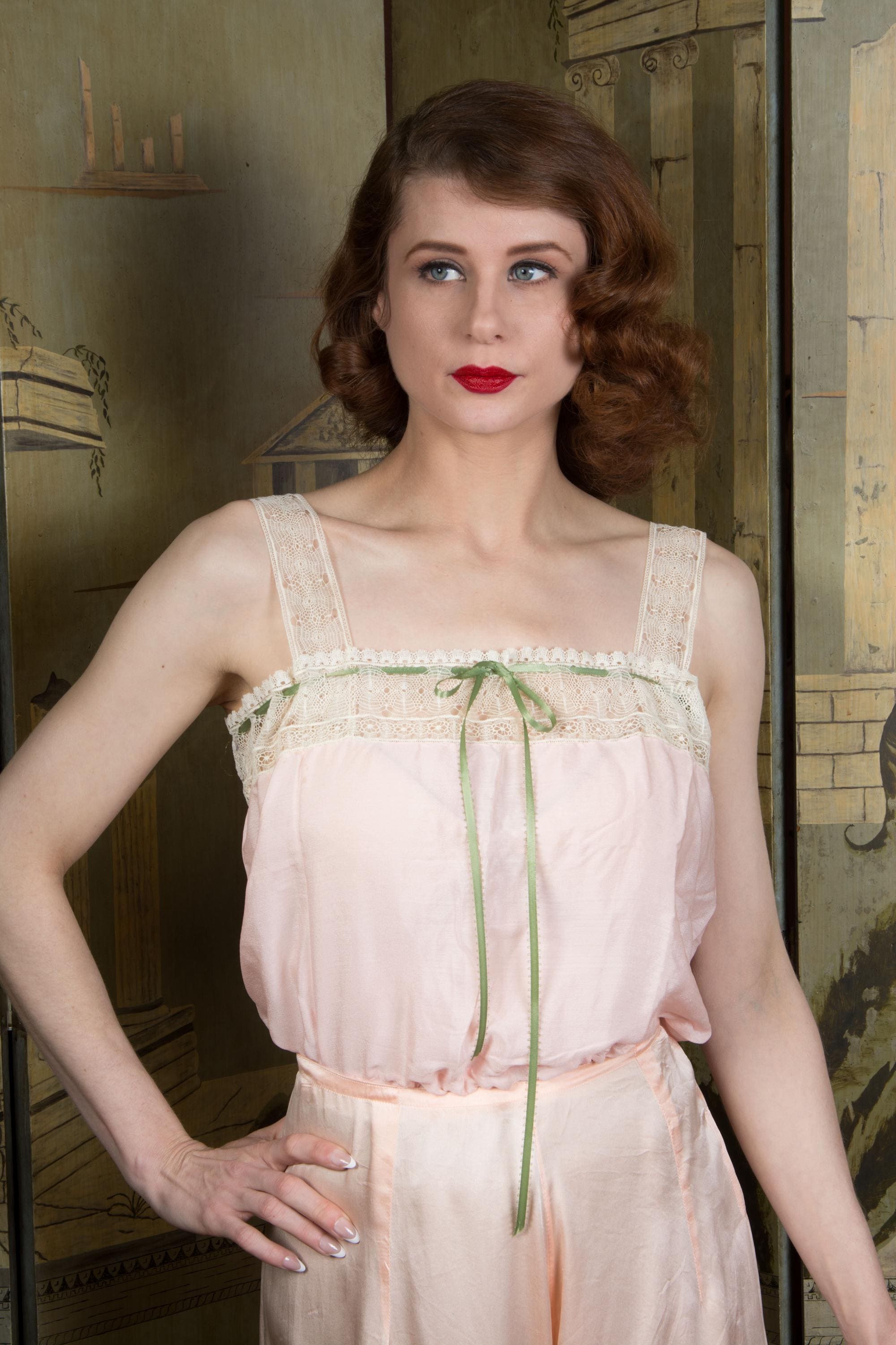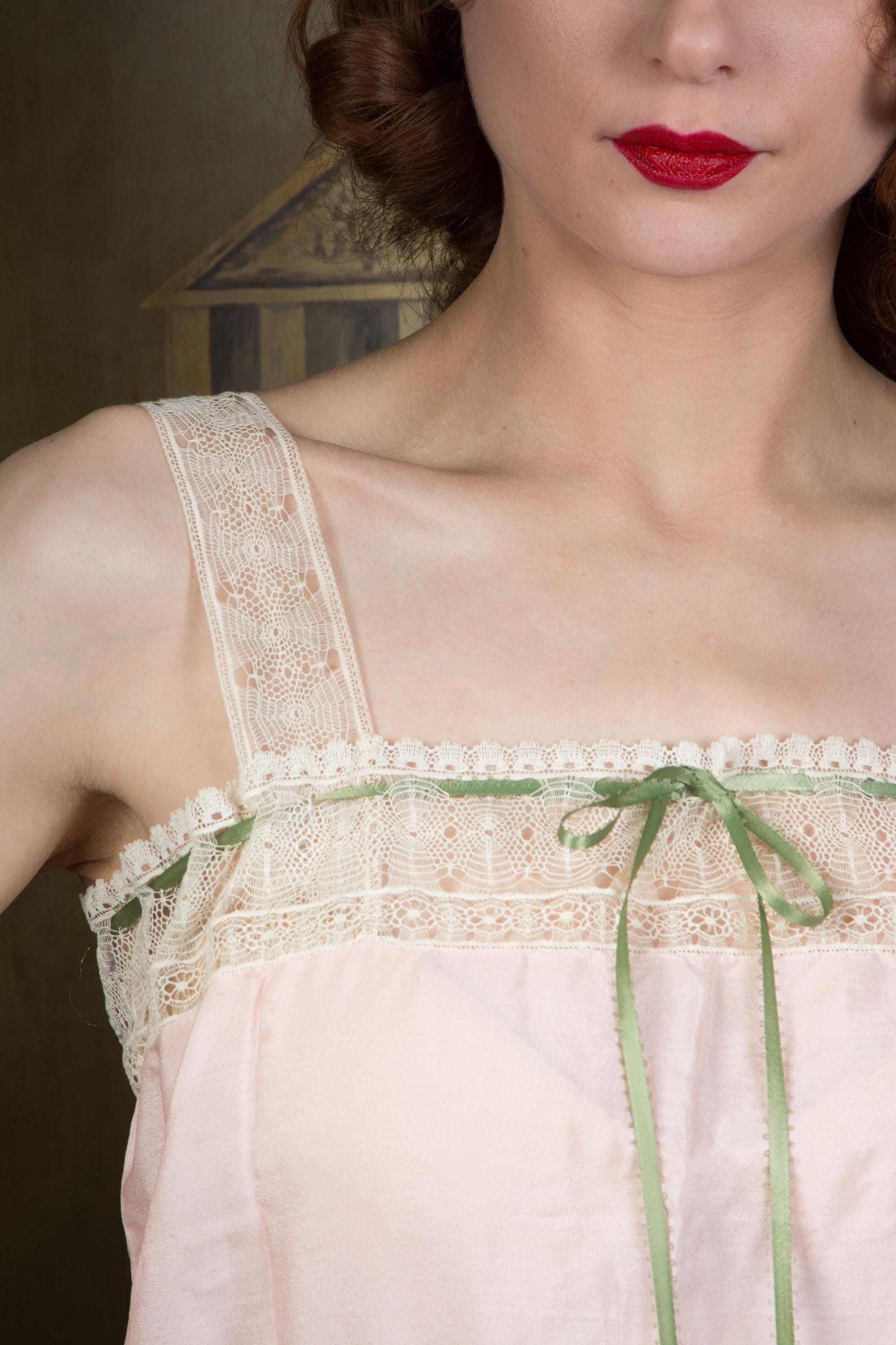 A charming vintage 1900s corset cover in soft, lustrous, lightweight silk. Likely 1910s based on the shape, this has a straight bandeau line, with the straps and top trim made of a delicate spiderweb motid lace. The waist is cased elastic, so it has a slightly bloused shape. This slips over the head and has no closures. We've replaced a disintegrated silk ribbon with a modern ribbon in olive green.