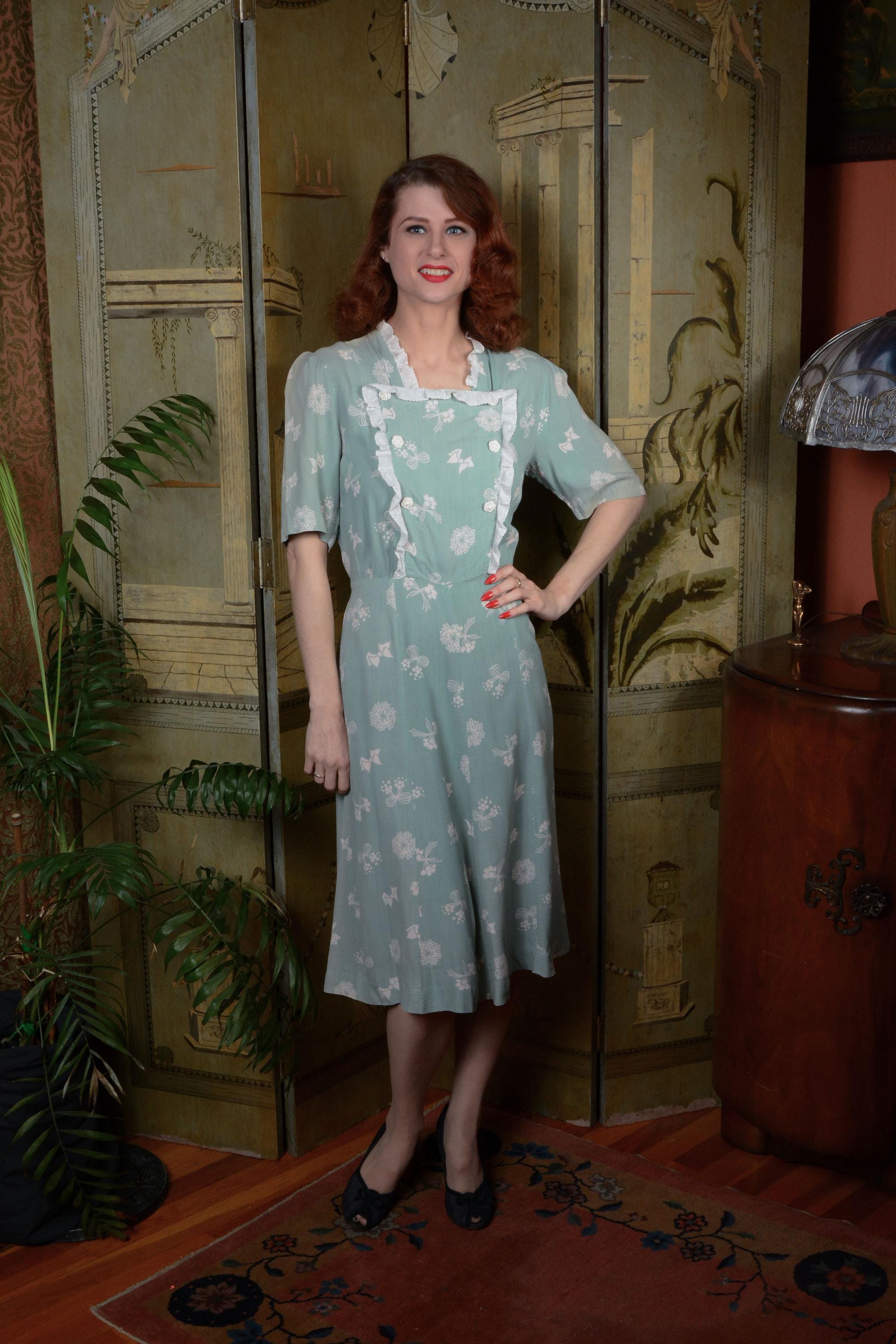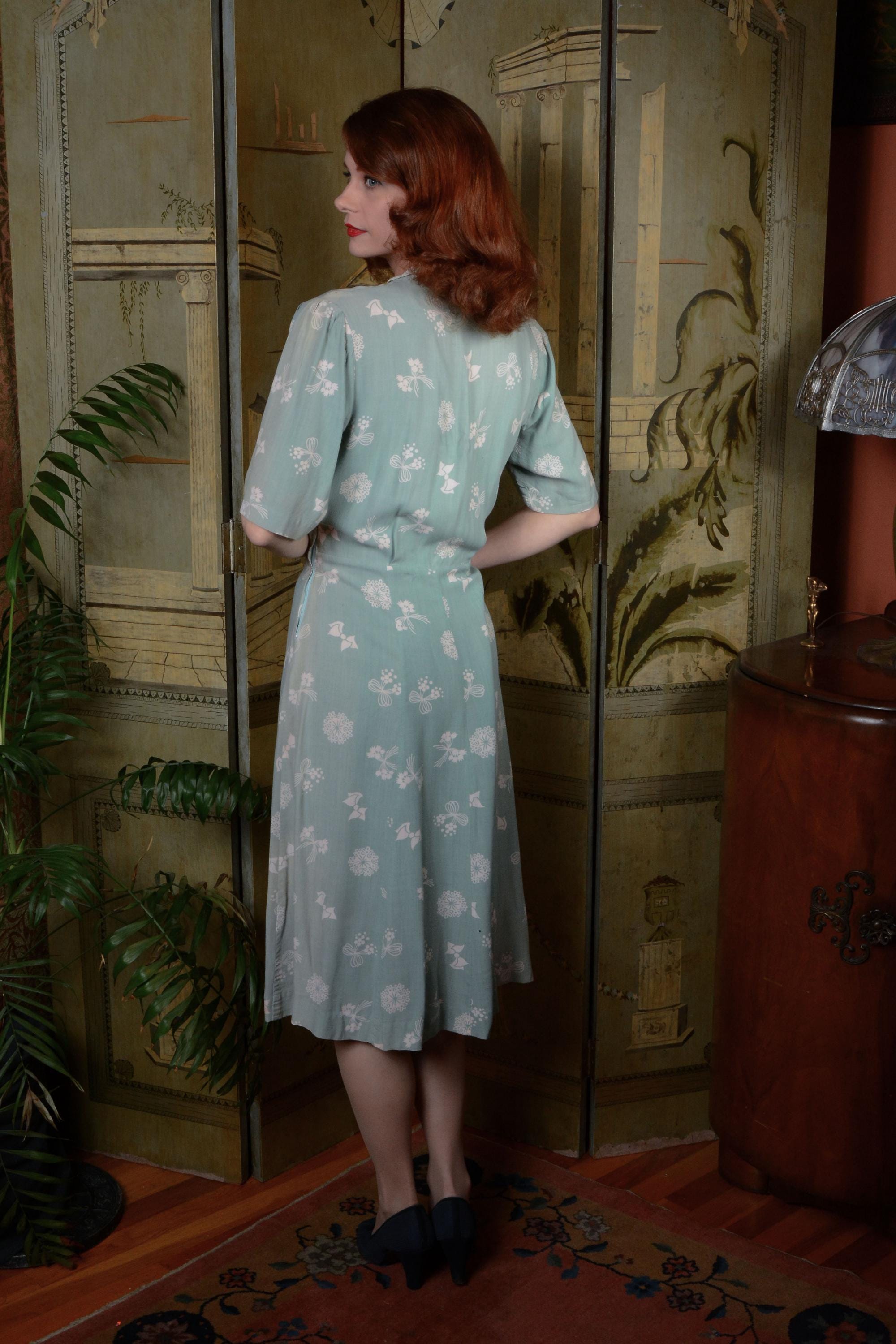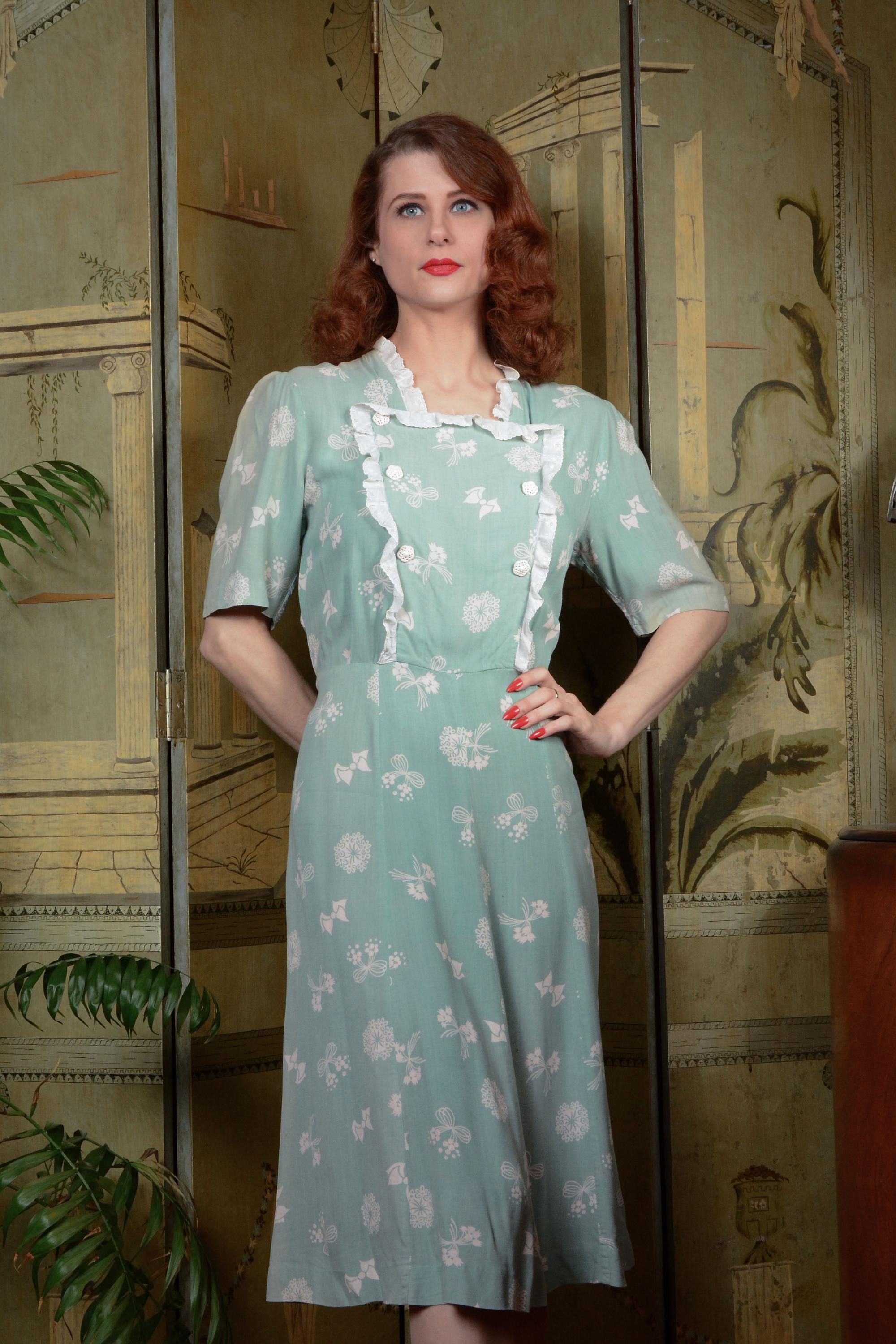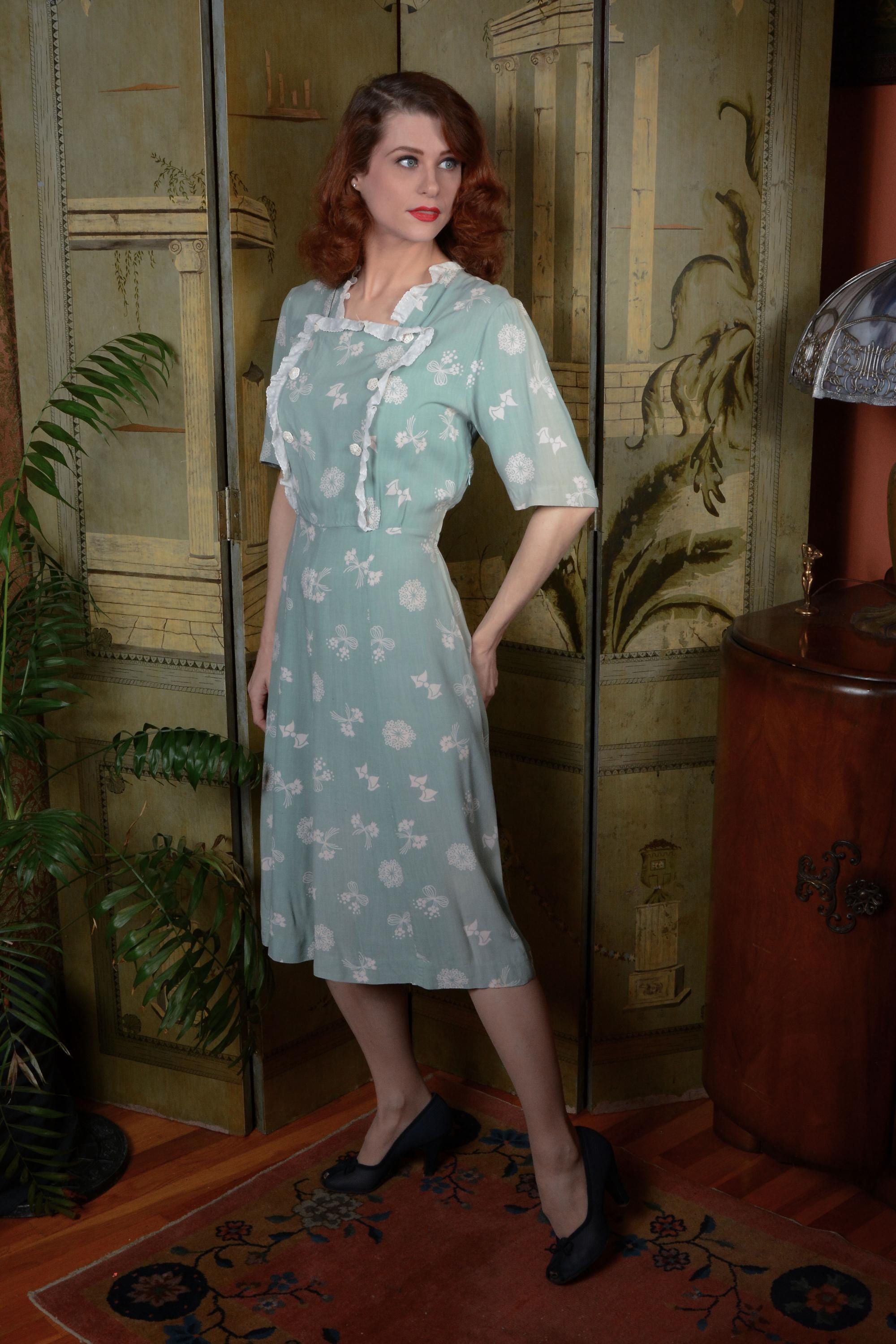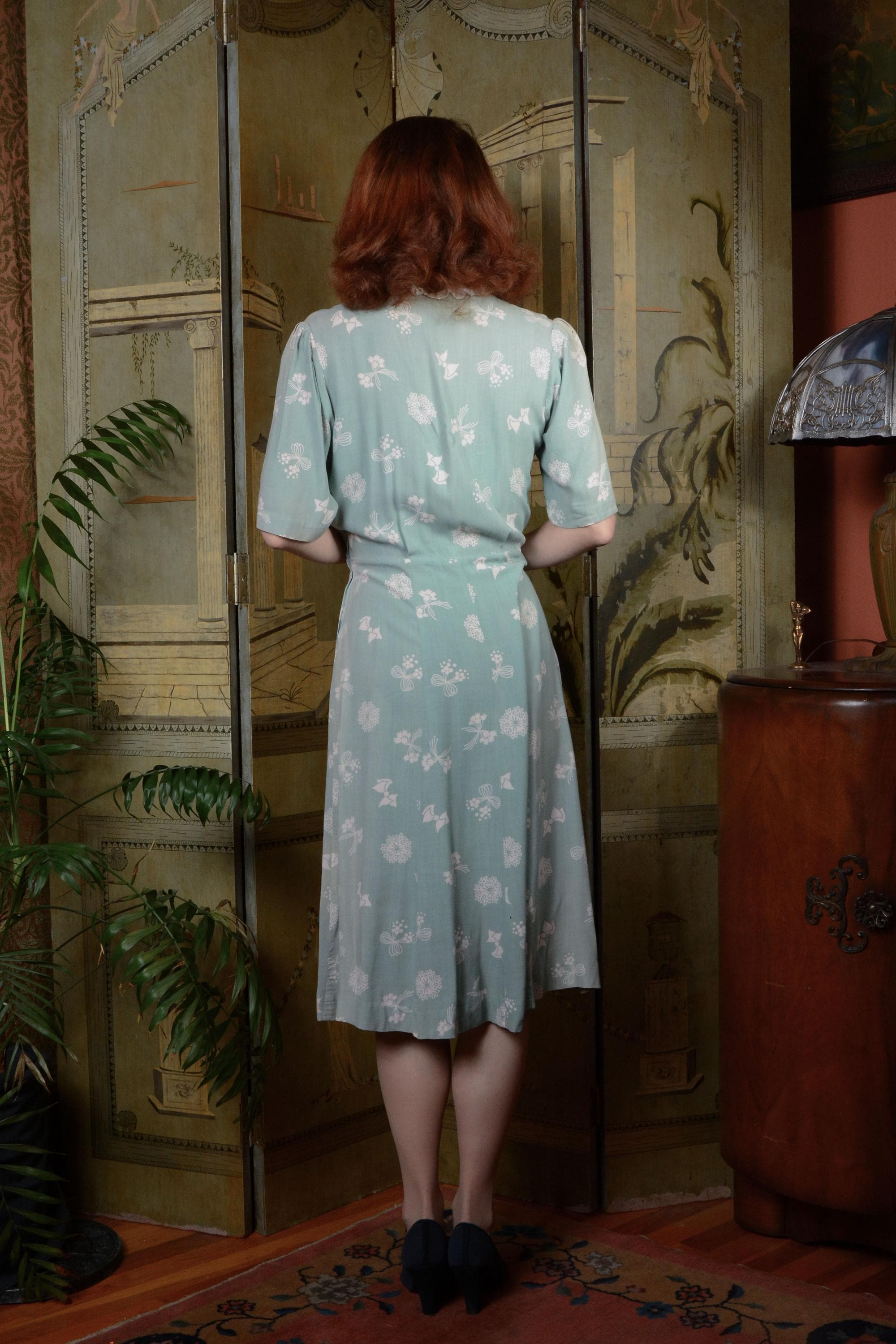 A super sweet cuspy late 1930s/early 40s vintage dress made out of the absolute softest matte rayon - the sort that looks a bit like cotton, but with much better drape. It's a pastel, fadey aqua blue, printed with daisies and bows. The cute front panel detail is stitched on the right side, but opens with snaps on the left, and could be converted to do the same on the right - I sort of wonder if this was made for woman who is nursing. The skirt is a soft eight gore aline, which has perfect drape and movement. This closes on the side with a replacement nylon zipper.