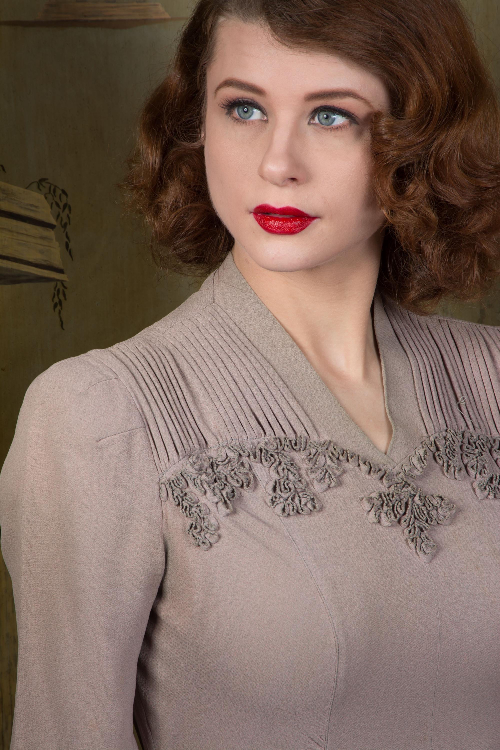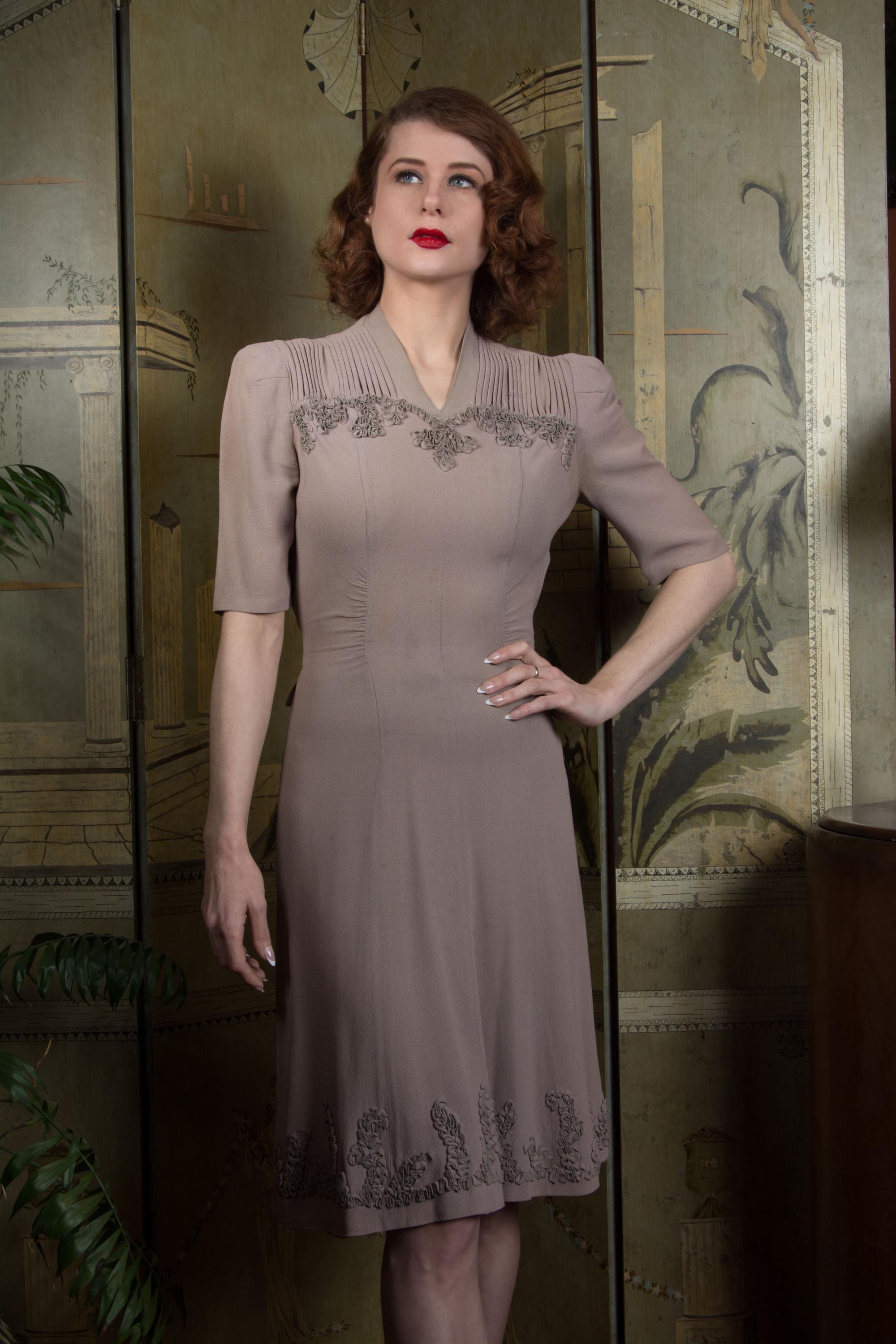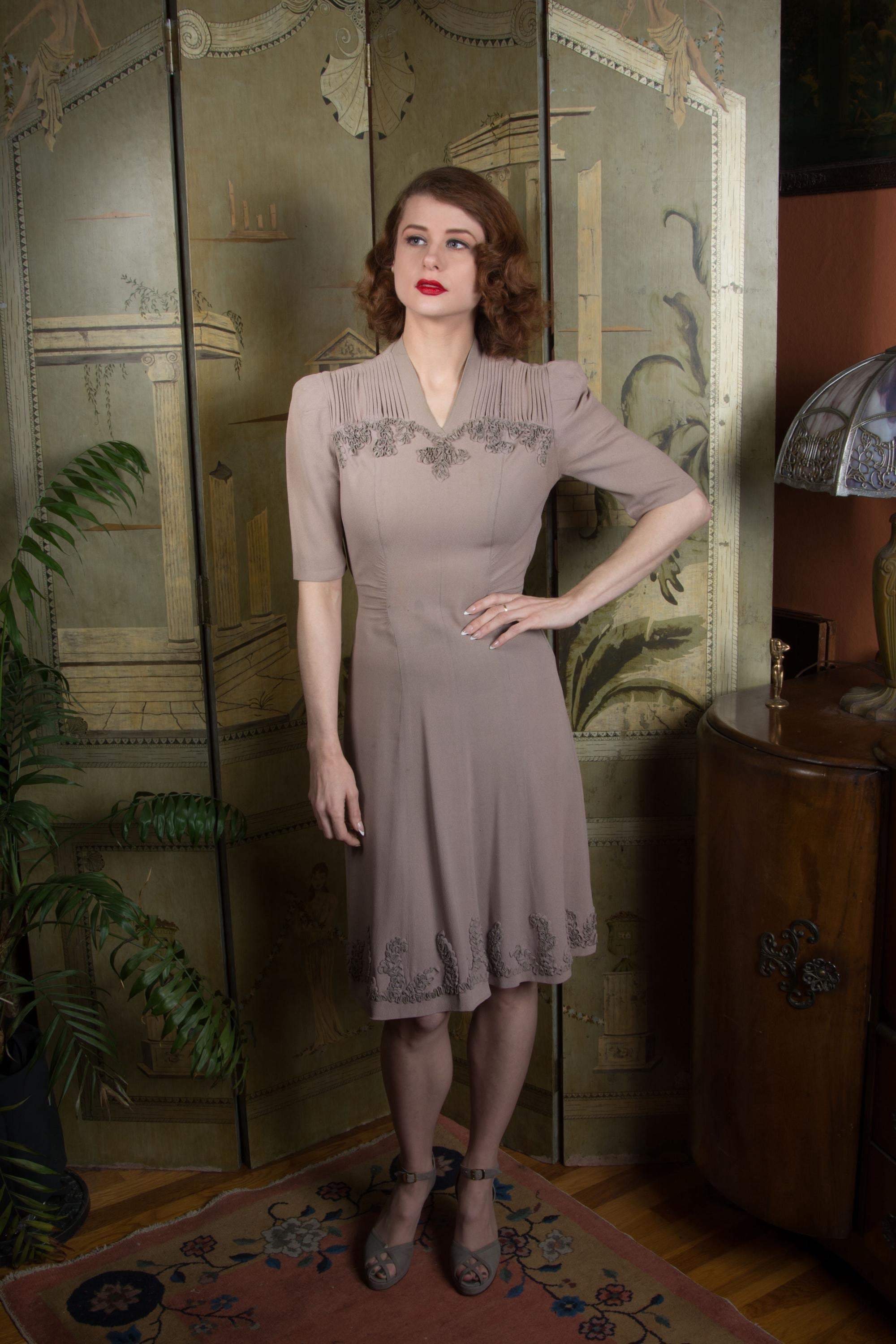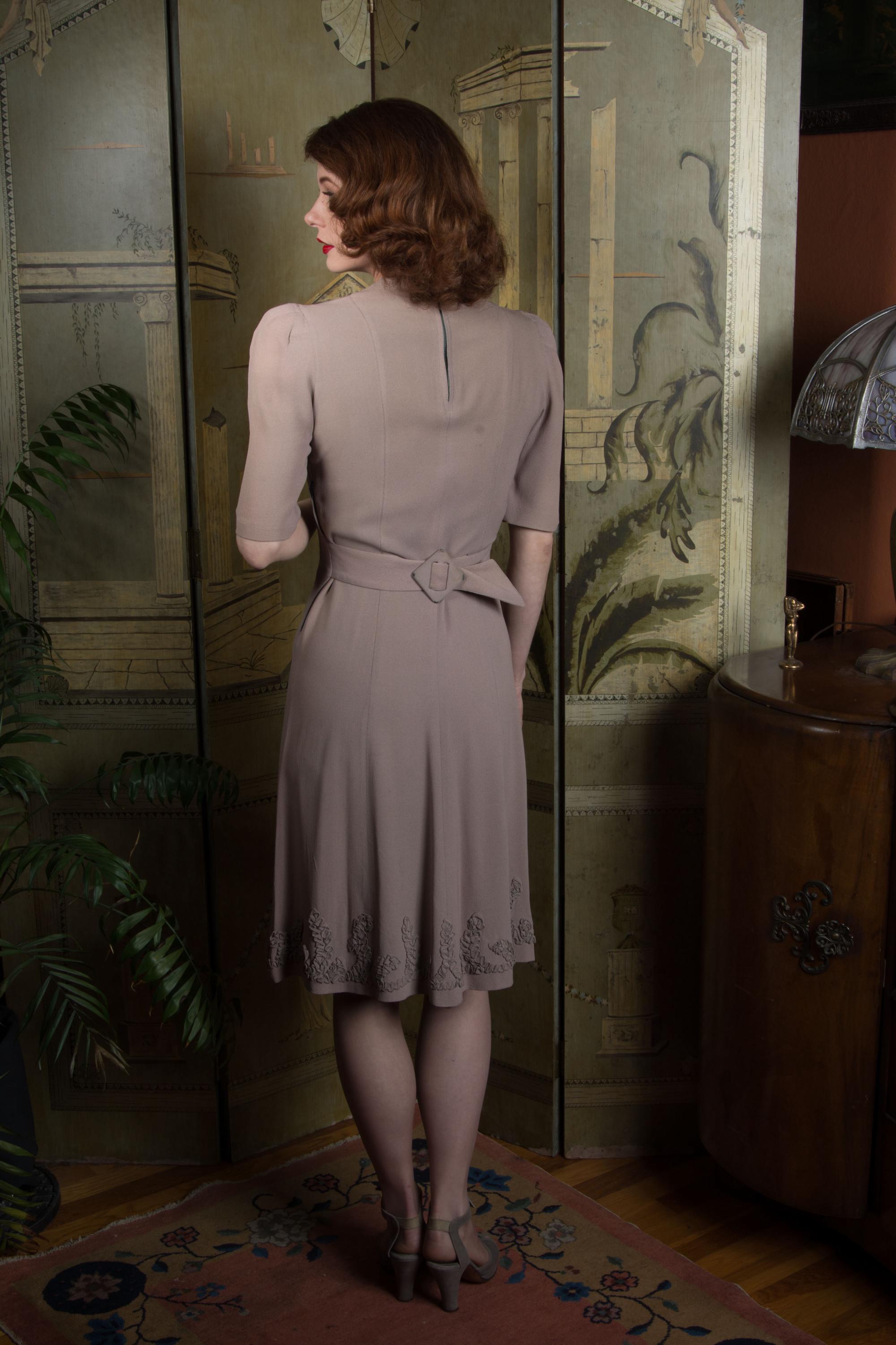 Vintage 1940s dress is a subtle, soft lavender hue* of drapey rayon crepe. This dress has ideal lines - I love a princess seam! The puffed sleeves are are shaped with padded sleeve headers. They yoke features crisp pleats to either side of the high v neckline, then self-fabric ruffles follow a sweetheart shape over the bust. The skirt is gores, and chased around the bottom with more self-fabric ruffling. It closes up the side with a sturdy metal zipper, and Bell zipper at the back of the neck. The bell zipper bottom stop is coded C 0, so we know the zipper was made in March 1940.