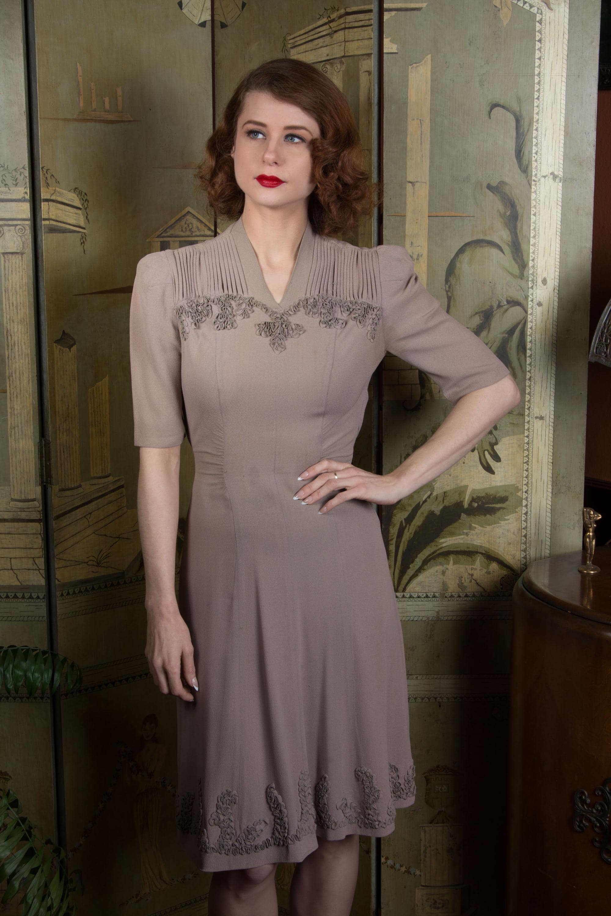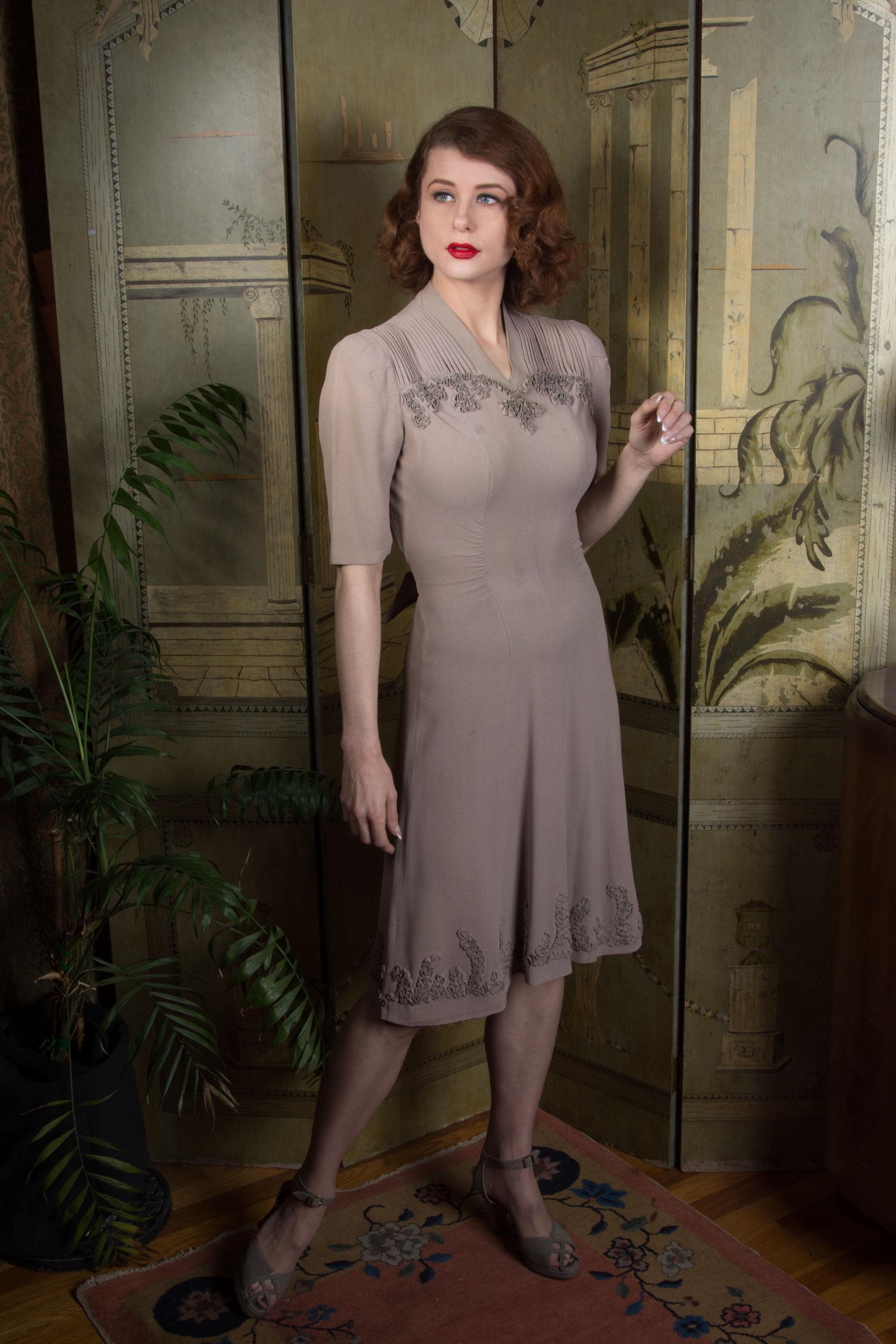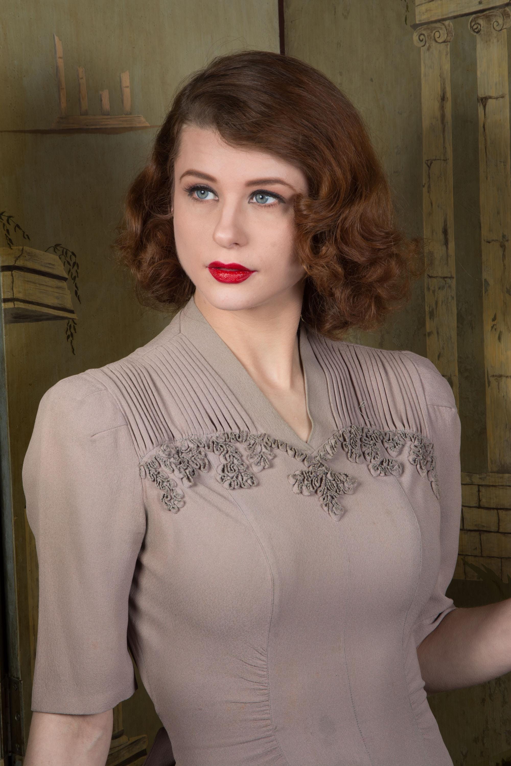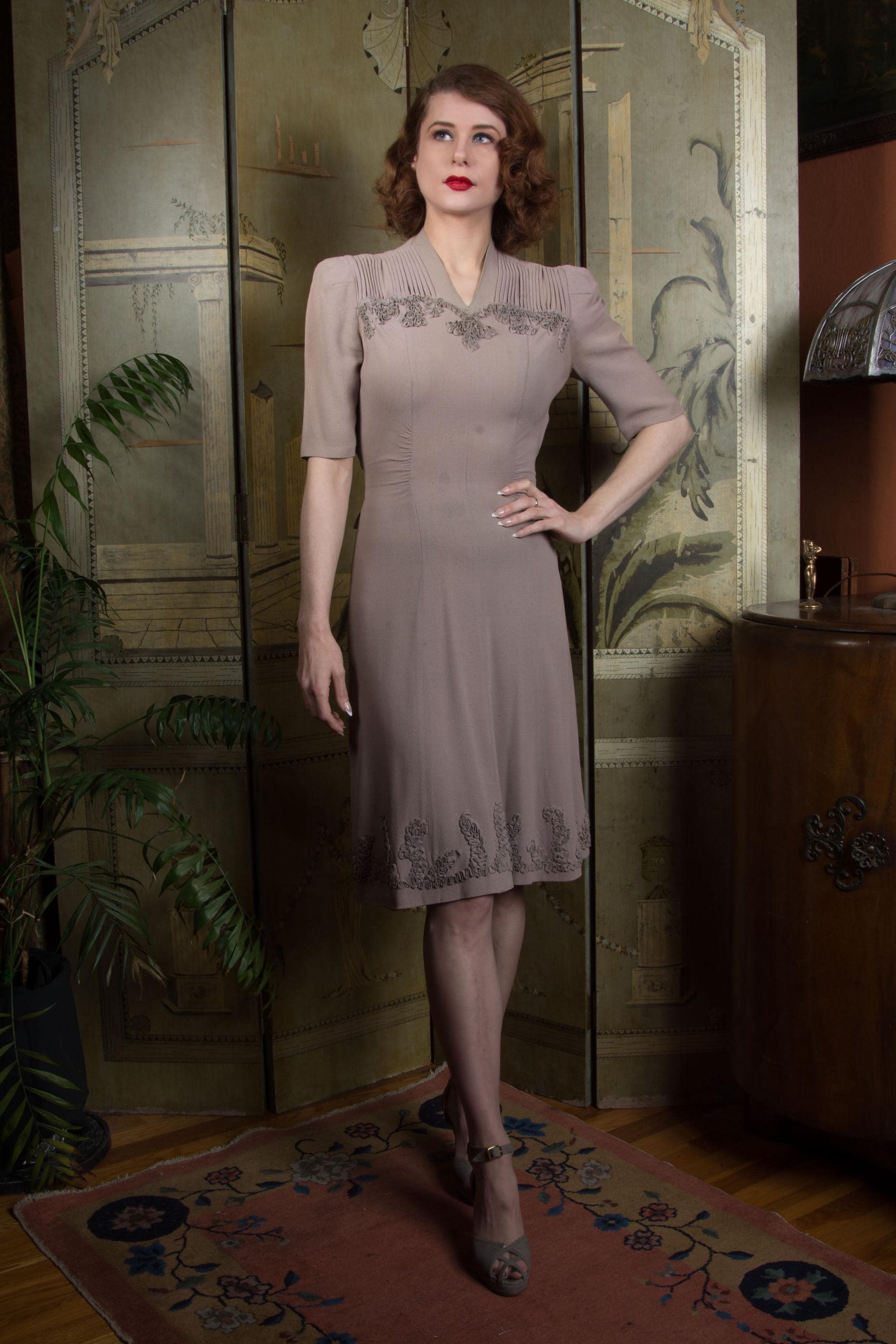 Vintage 1940s dress is a subtle, soft lavender hue* of drapey rayon crepe. This dress has ideal lines - I love a princess seam! The puffed sleeves are are shaped with padded sleeve headers. They yoke features crisp pleats to either side of the high v neckline, then self-fabric ruffles follow a sweetheart shape over the bust. The skirt is gores, and chased around the bottom with more self-fabric ruffling. It closes up the side with a sturdy metal zipper, and Bell zipper at the back of the neck. The bell zipper bottom stop is coded C 0, so we know the zipper was made in March 1940.