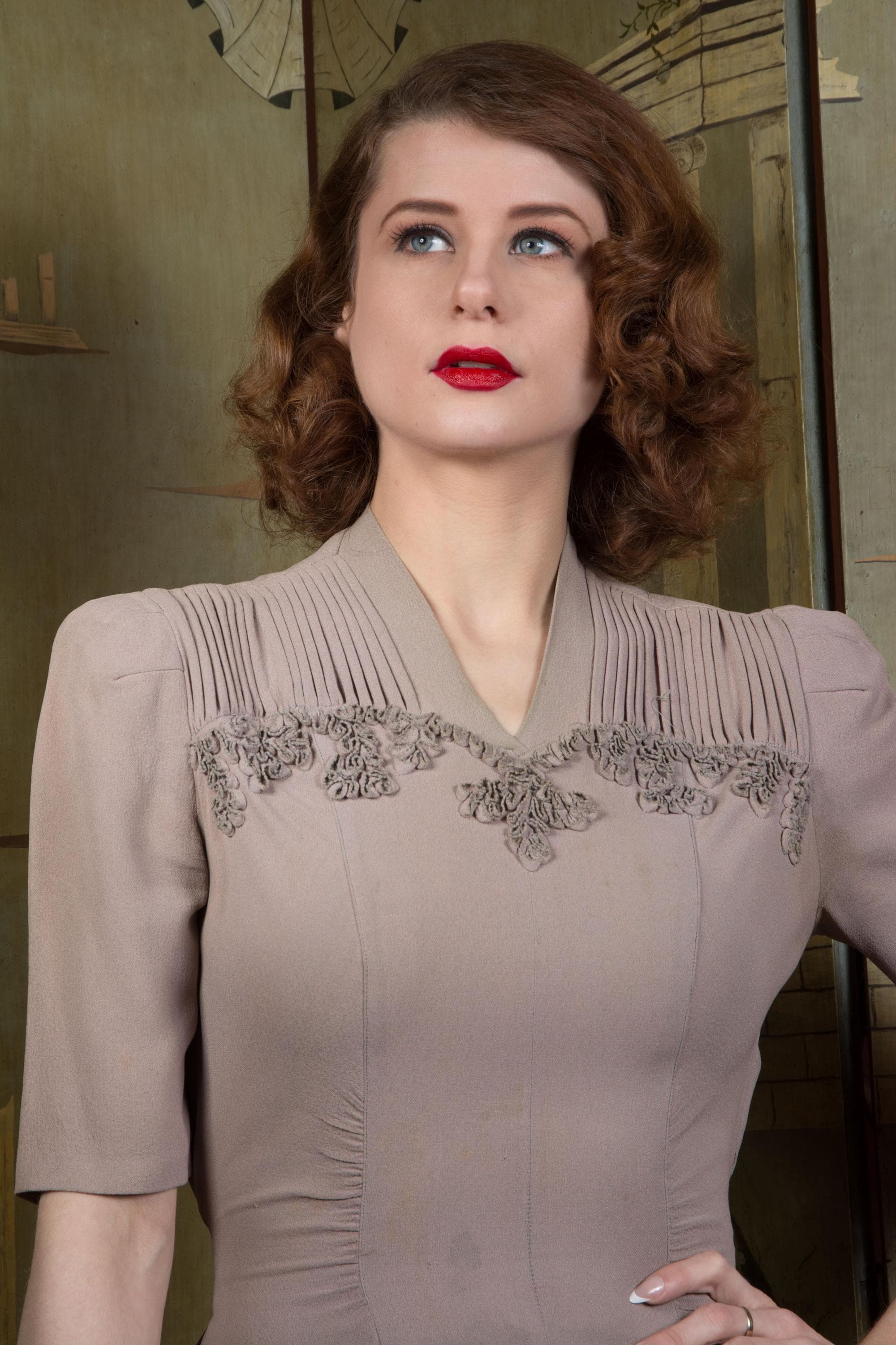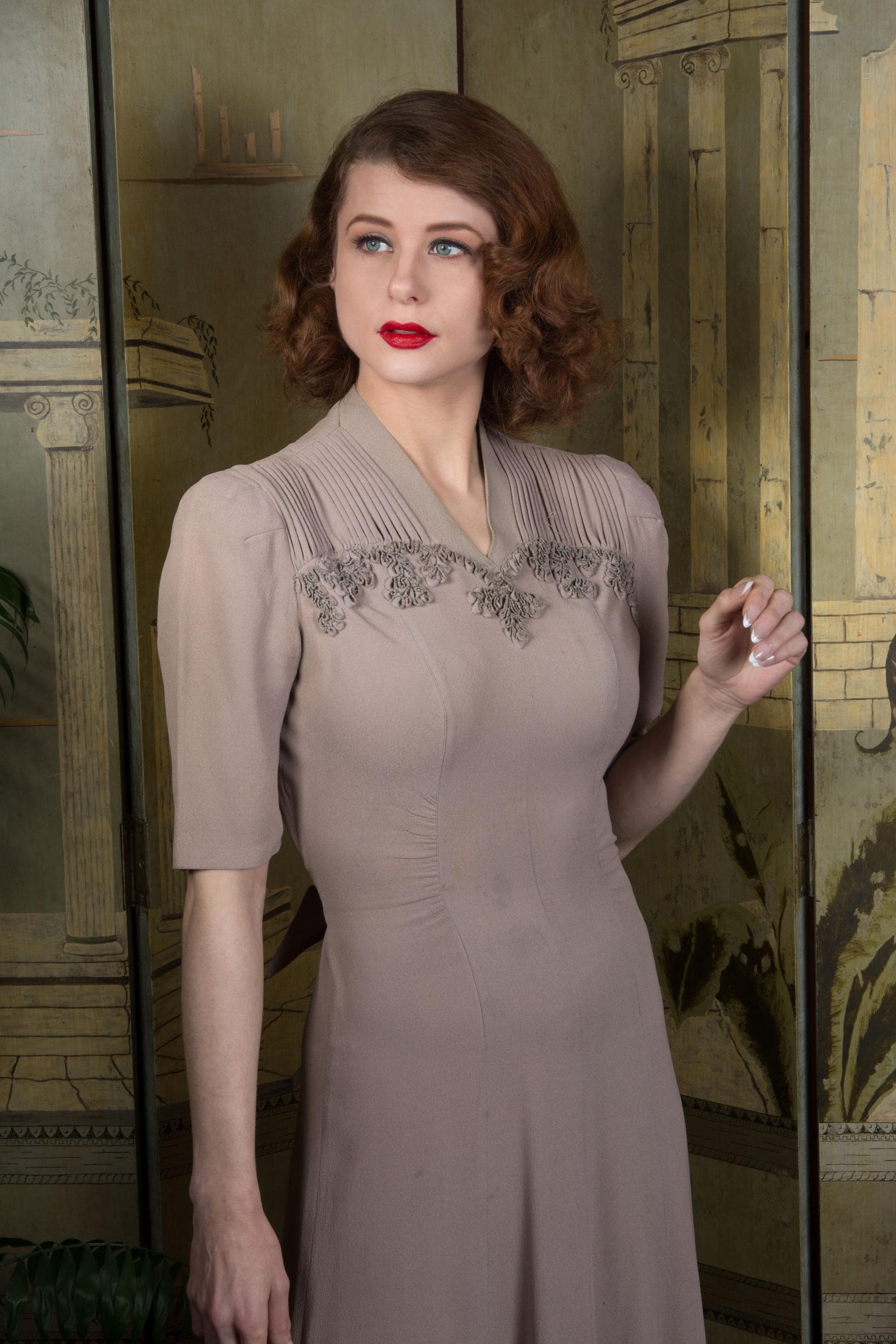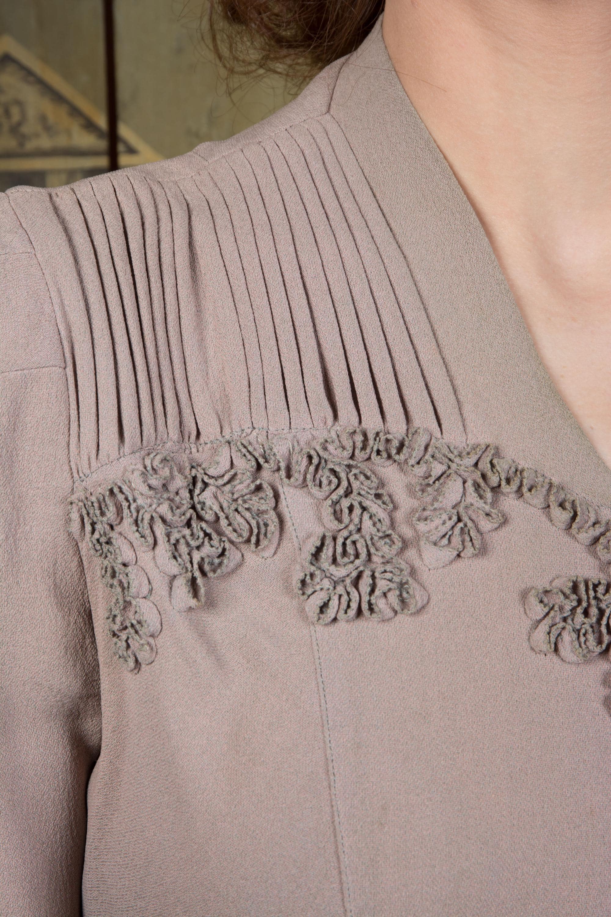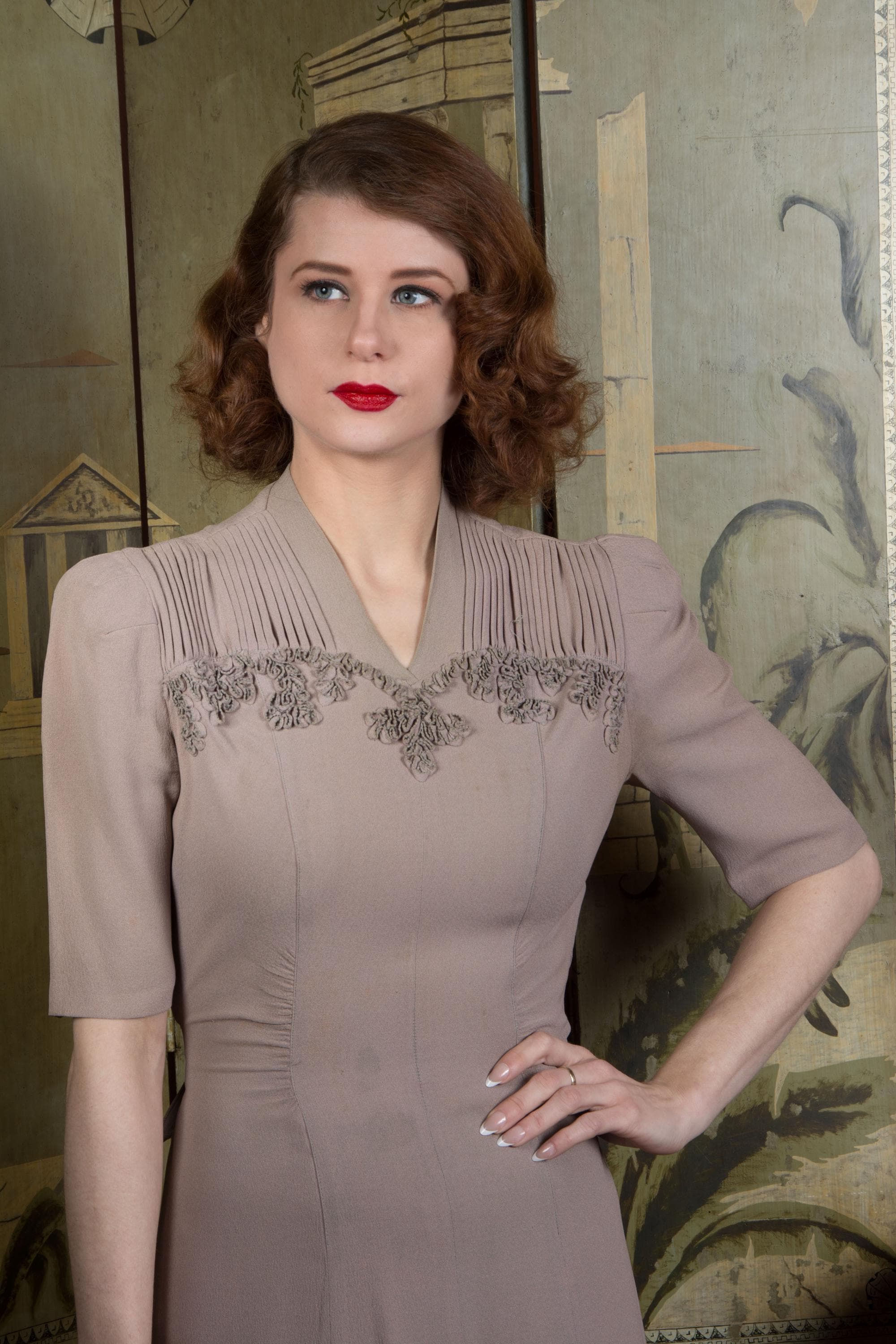 Vintage 1940s dress is a subtle, soft lavender hue* of drapey rayon crepe. This dress has ideal lines - I love a princess seam! The puffed sleeves are are shaped with padded sleeve headers. They yoke features crisp pleats to either side of the high v neckline, then self-fabric ruffles follow a sweetheart shape over the bust. The skirt is gores, and chased around the bottom with more self-fabric ruffling. It closes up the side with a sturdy metal zipper, and Bell zipper at the back of the neck. The bell zipper bottom stop is coded C 0, so we know the zipper was made in March 1940.