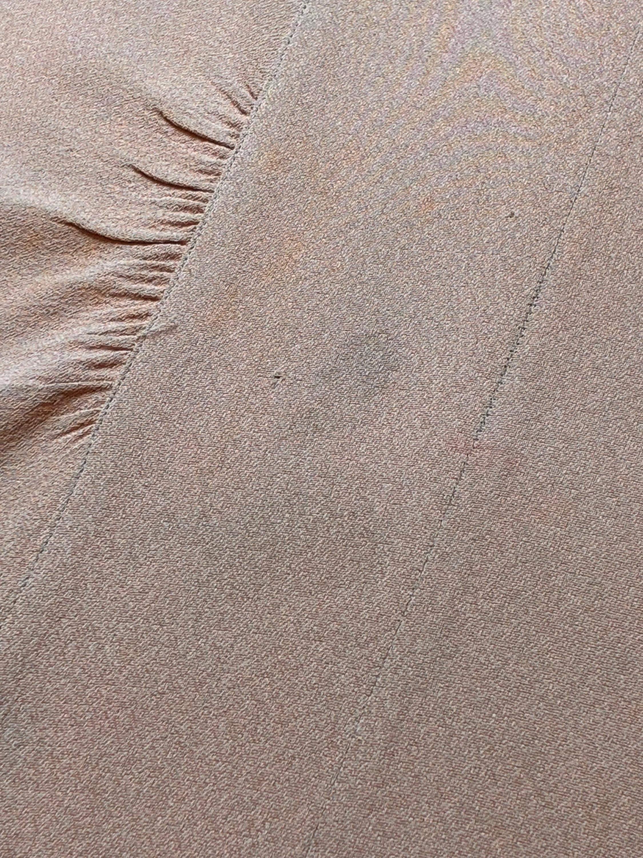 This dress has been dry cleaned and is ready to wear. Thee color has chemically faded, and shifted over the years from a slate blue to the pale lilac color it is currently. There is a spot on the right front waistline, and some other little marks through the skirt and a couple of the back of the bodice as well. They don't leap out, but I don't think they will improve further, and it's been priced accordingly.