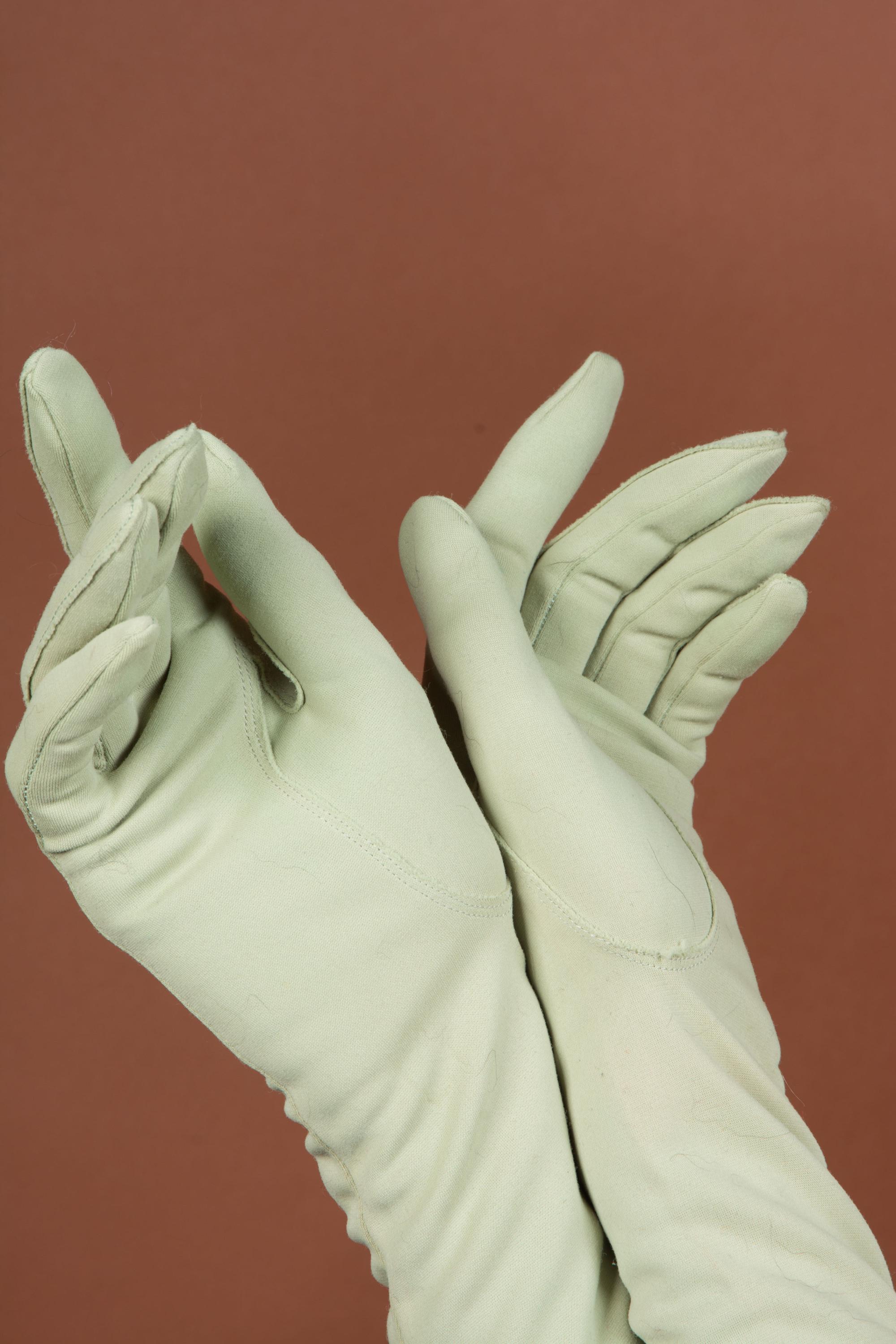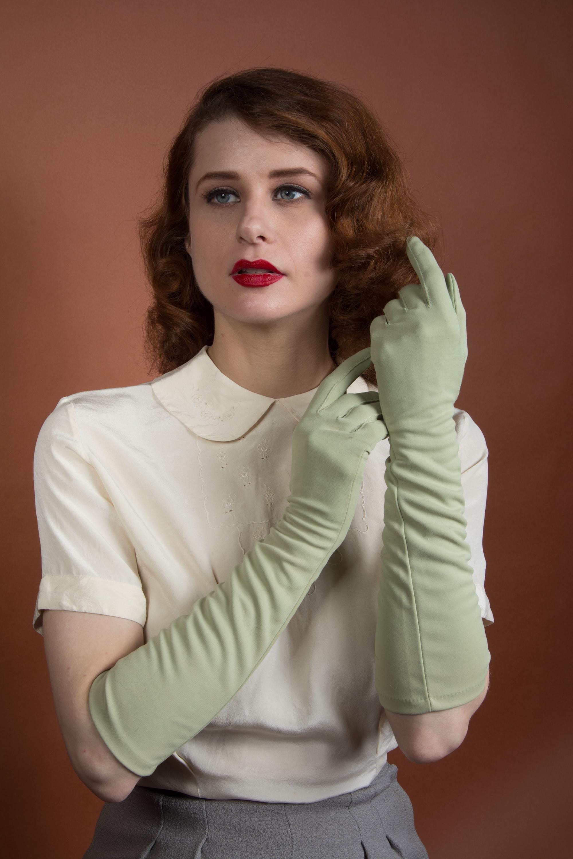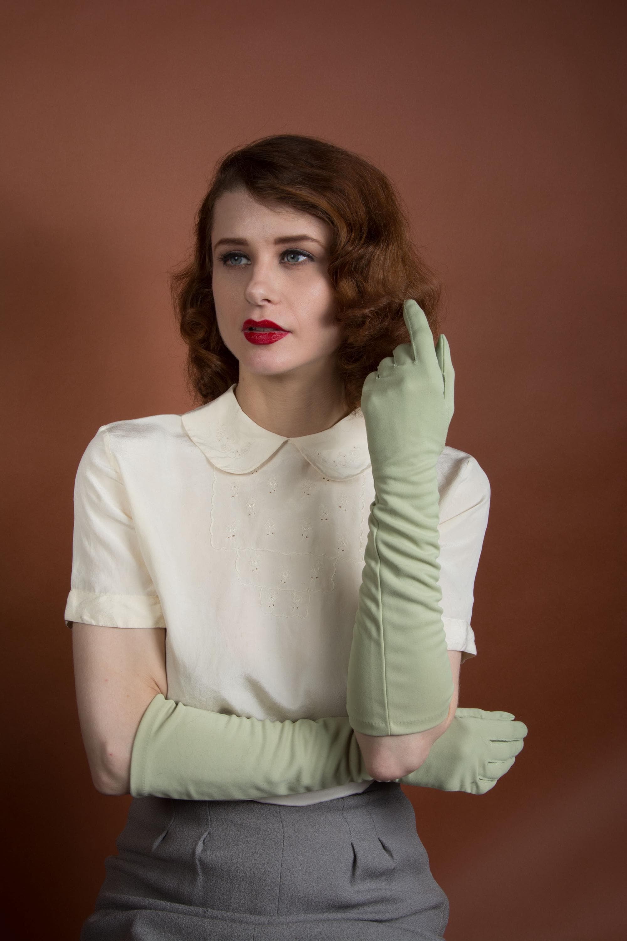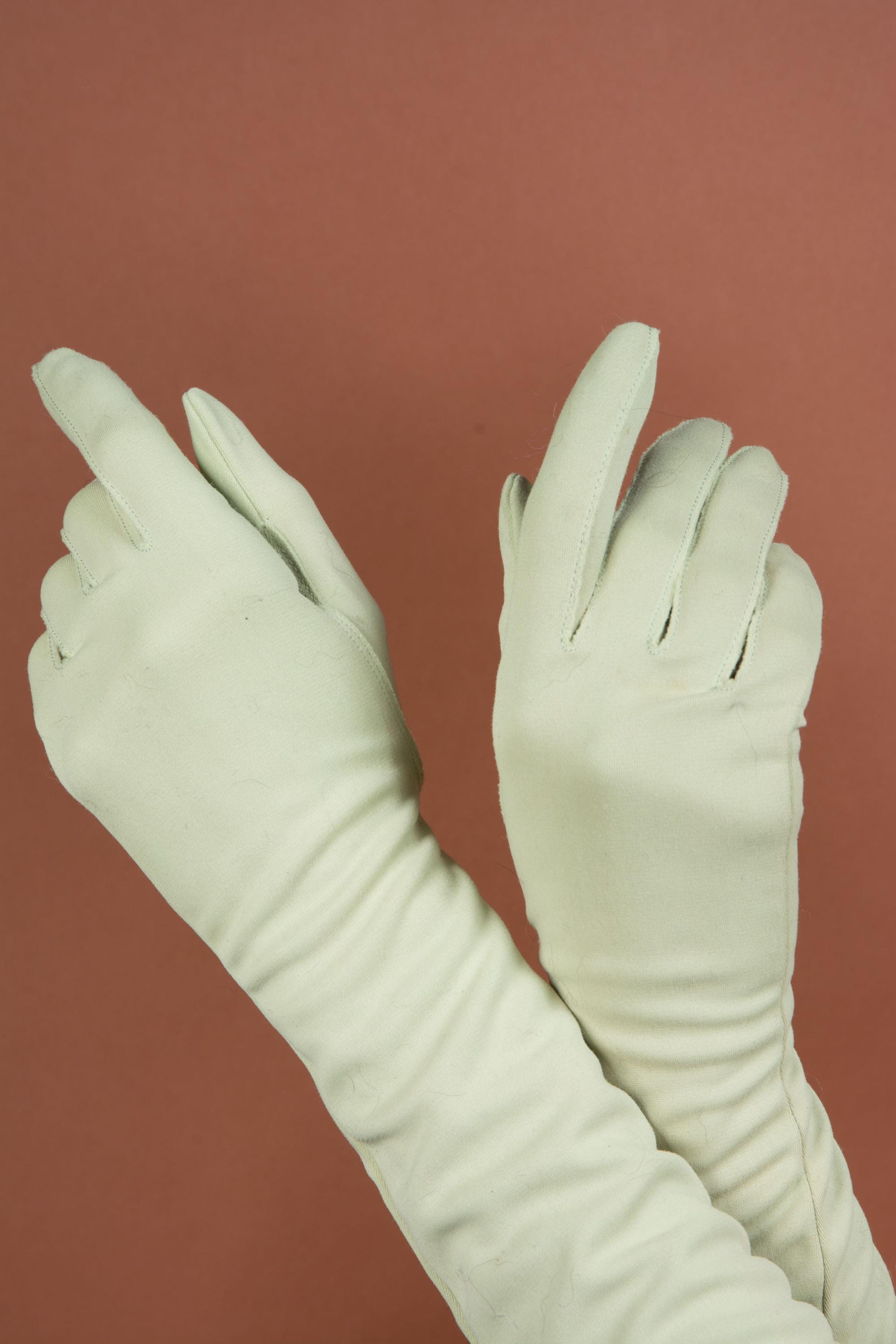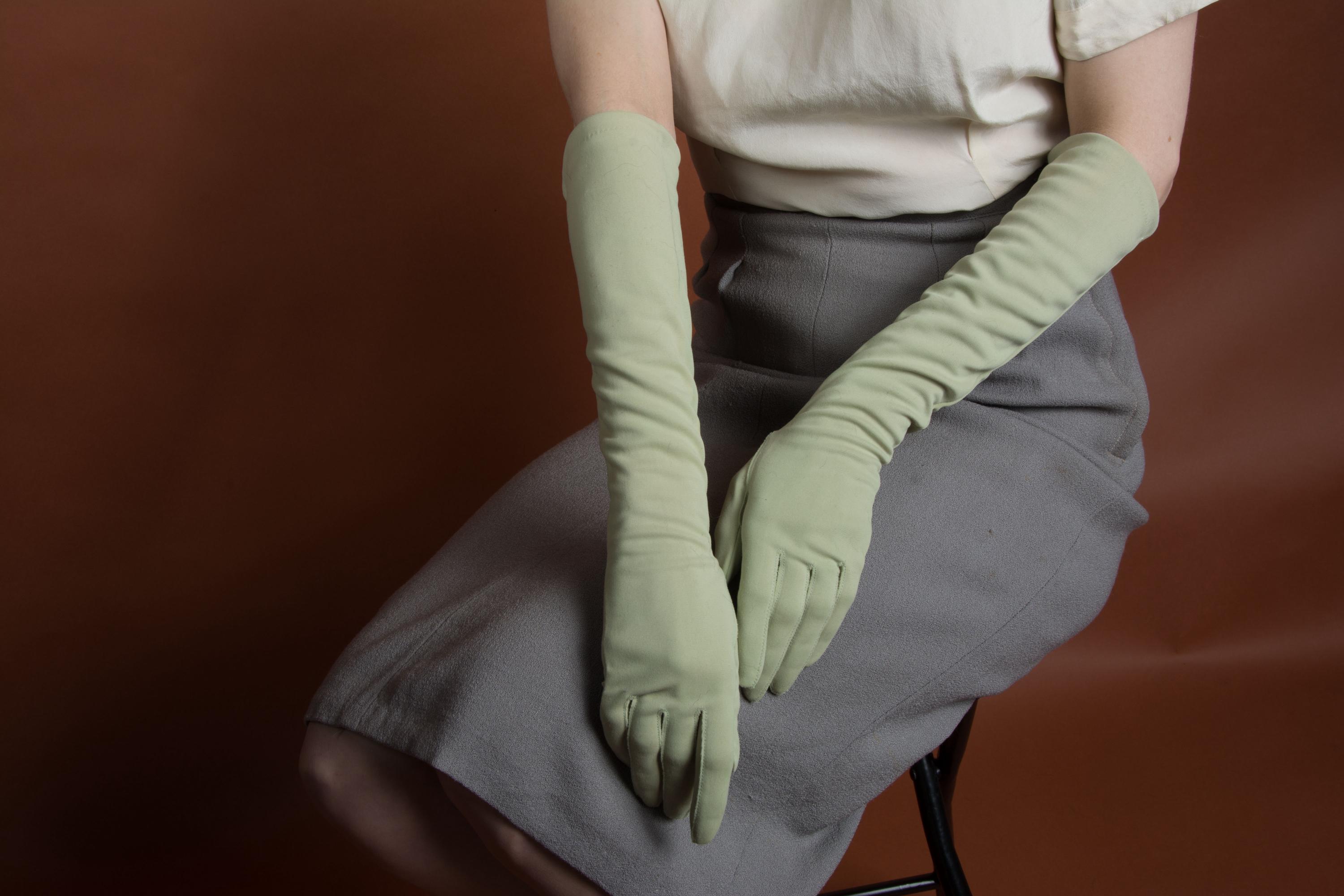 A fantastic pair of 50s gloves in a color that seems best described as a matcha green hue. These are mid length, ending just below the elbow. Fully stitched fingers. Made of soft nylon, they are a color perfect for pairing with both 40s and 50s styles.