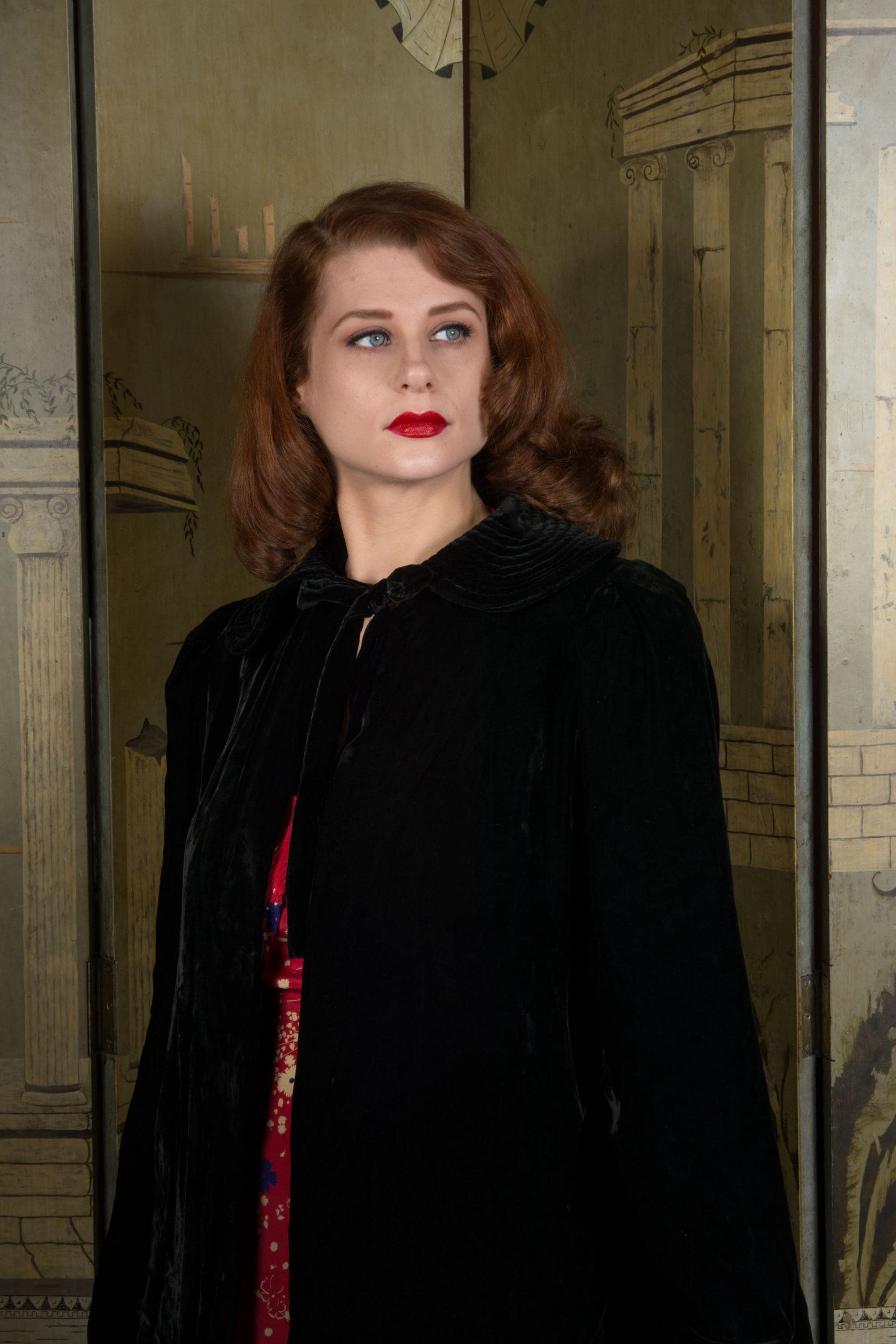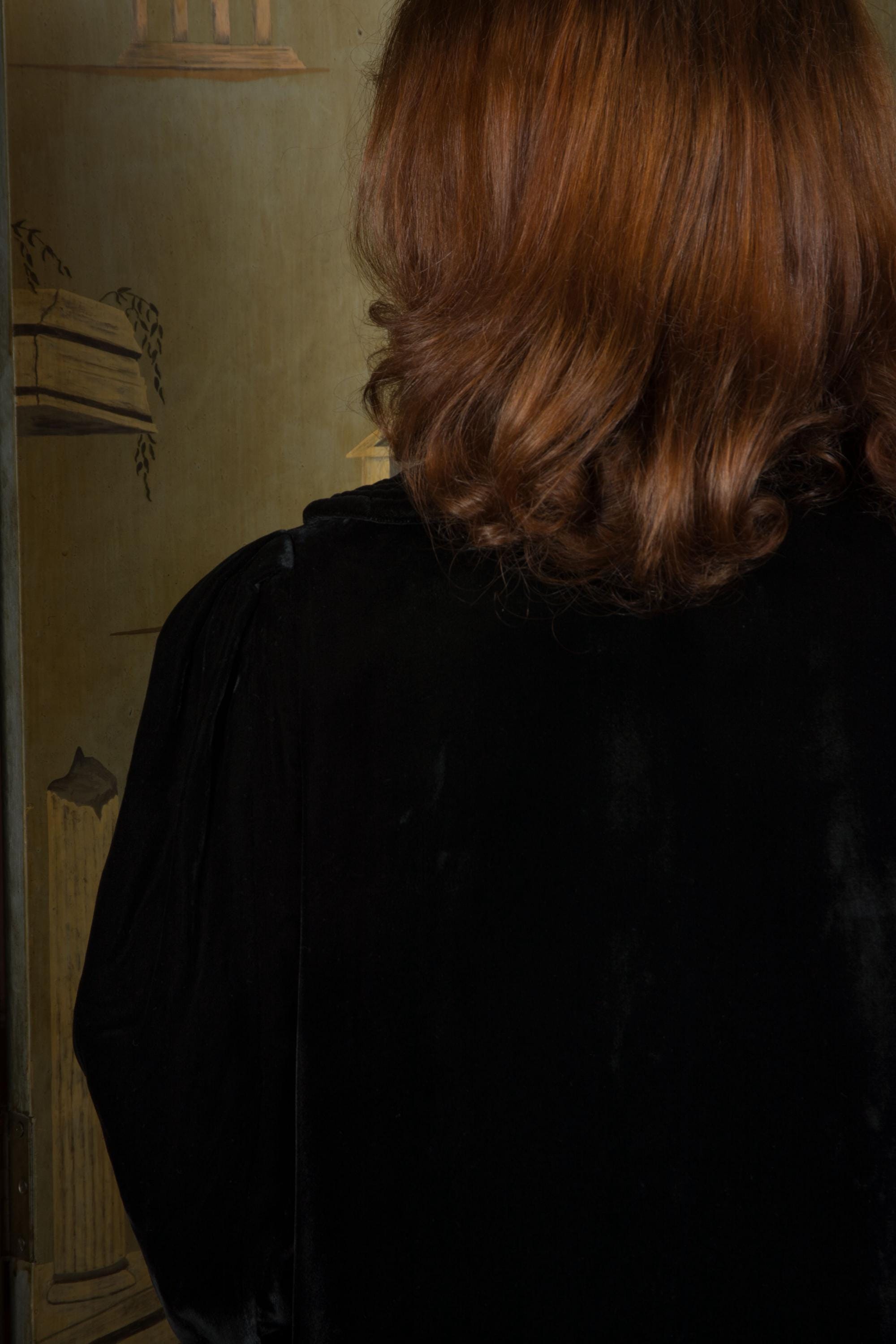 This piece is clean and ready to wear. There are some faint seated marks in the velvet. The ivory lining has some spotting, but this doesn't show when worn. I find nothing else to note.
