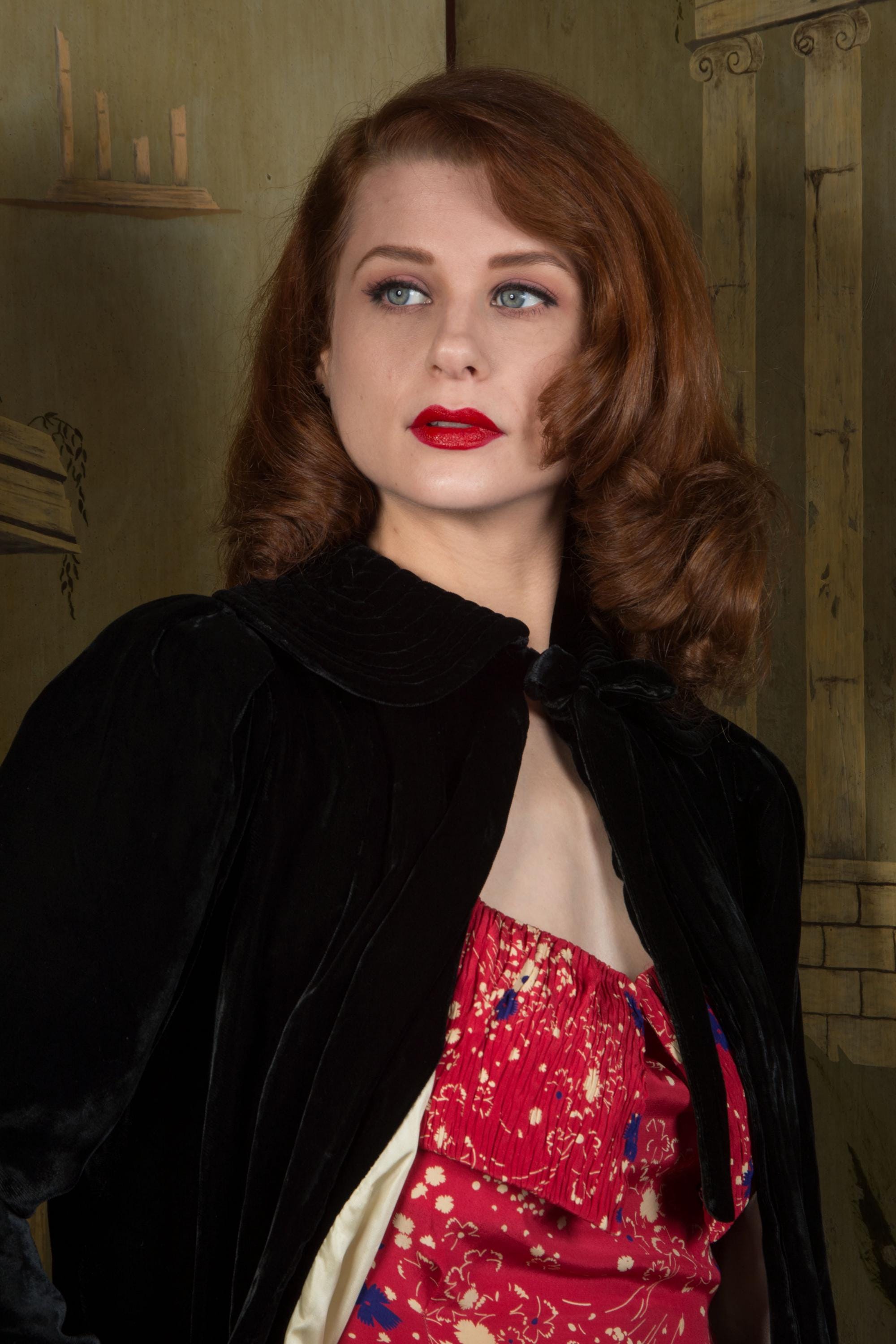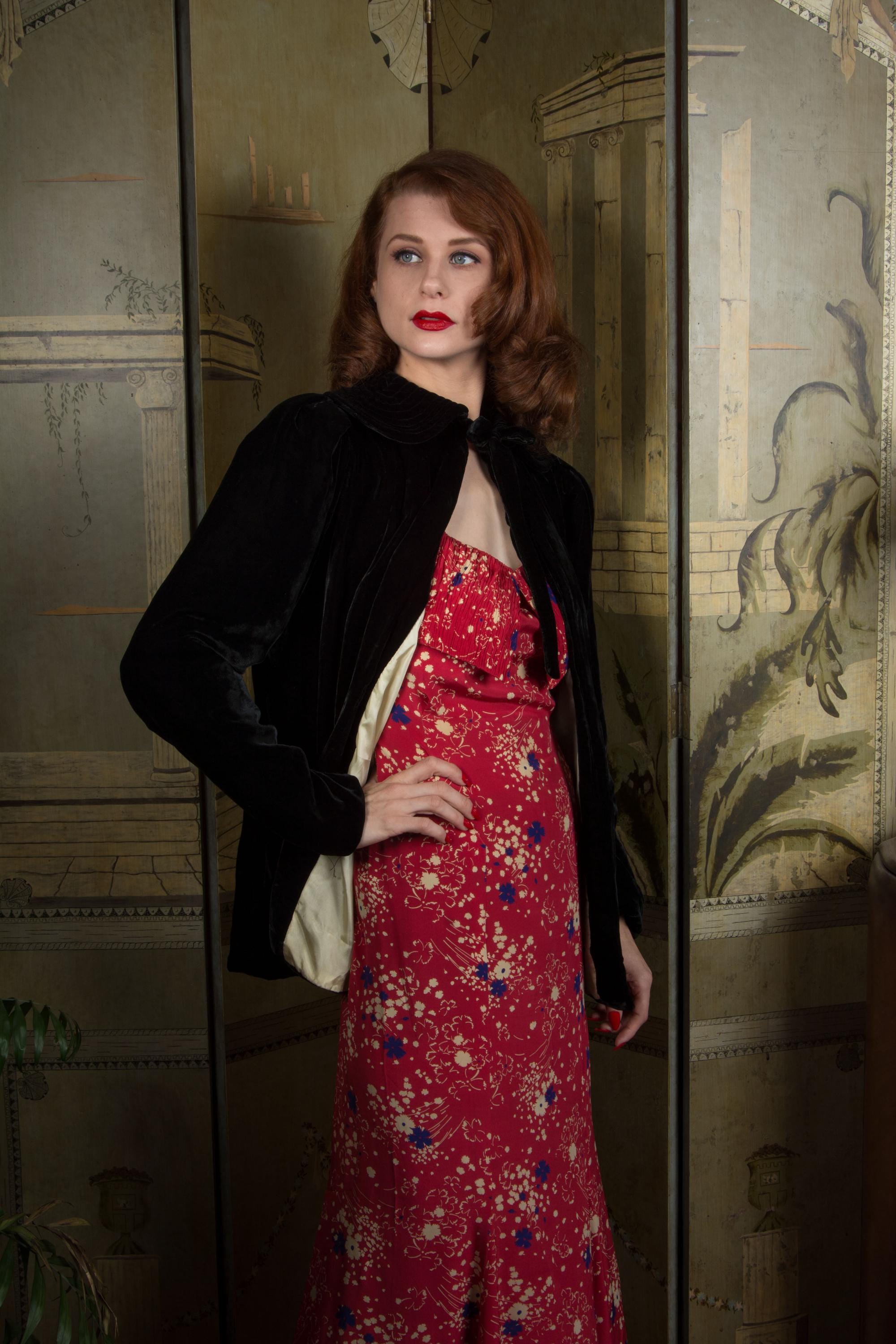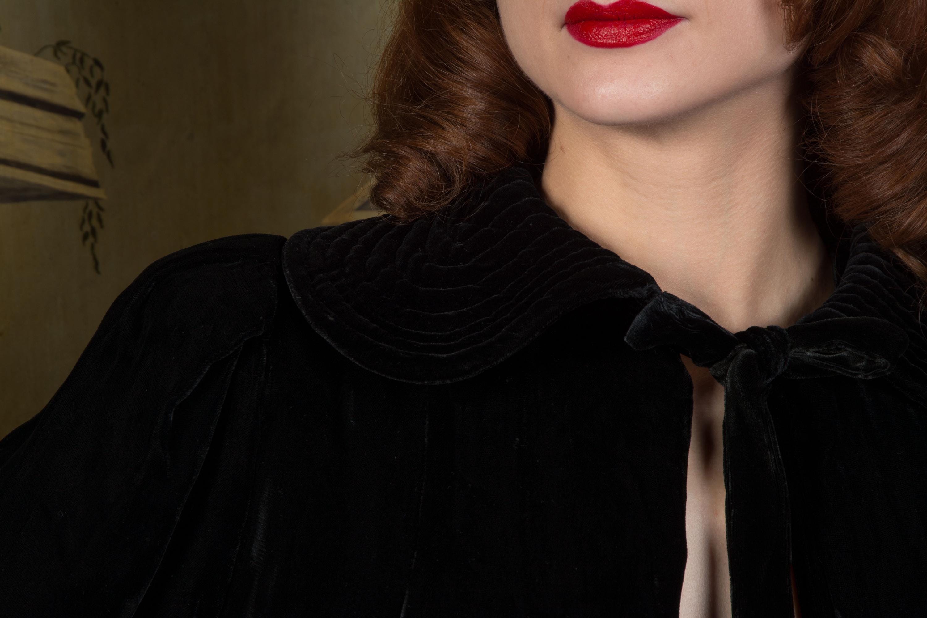 Vintage late 1930s evening jacket in a plush black rayon velvet. This classic piece goes well over absolutely any formal 30s or 40s look - it's simple and versatile. This jacket features a large, rounded collar with piping trapunto. It closes only with the self-fabric velvet ties, and is fully lined with ivory acetate.