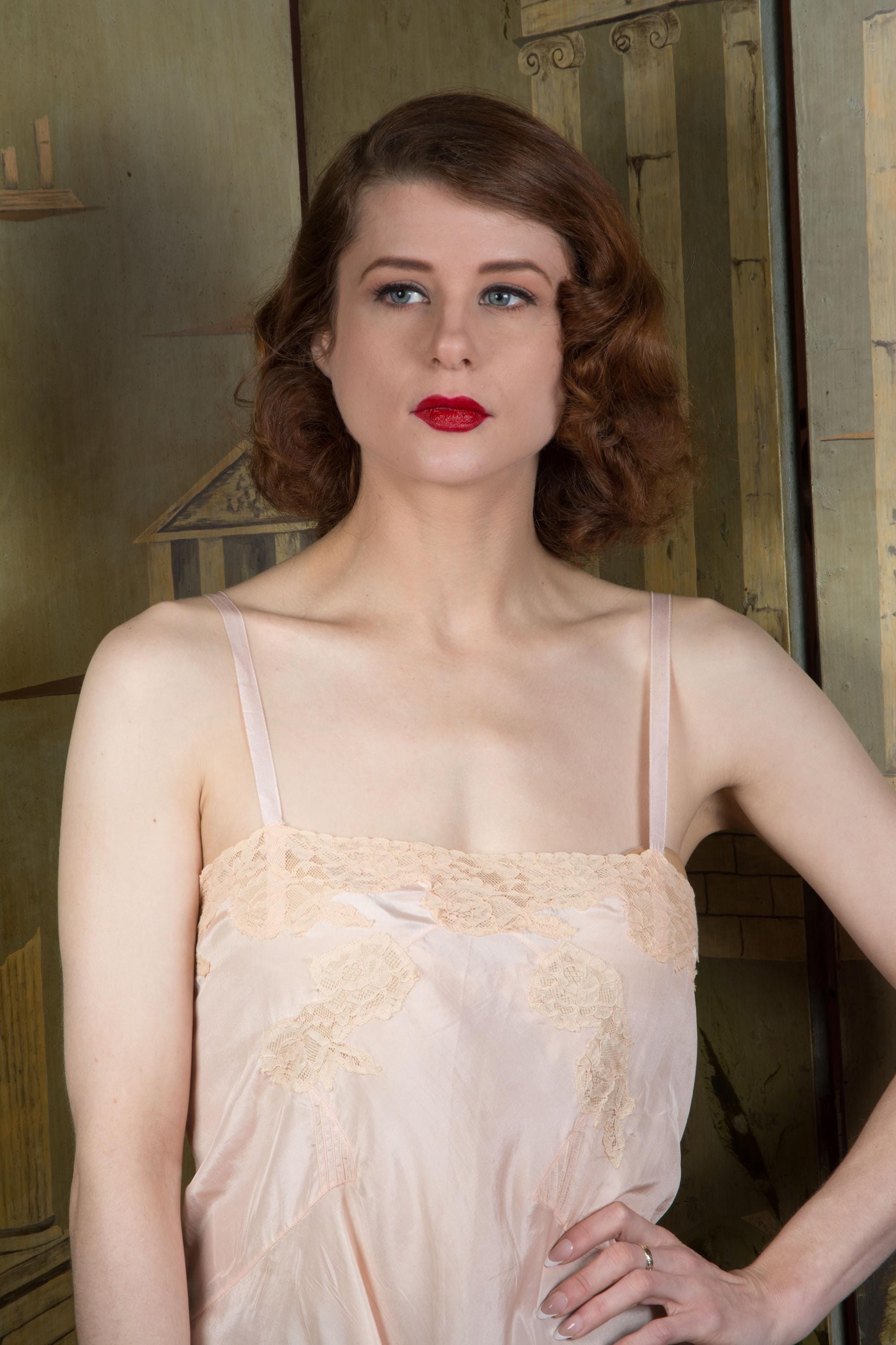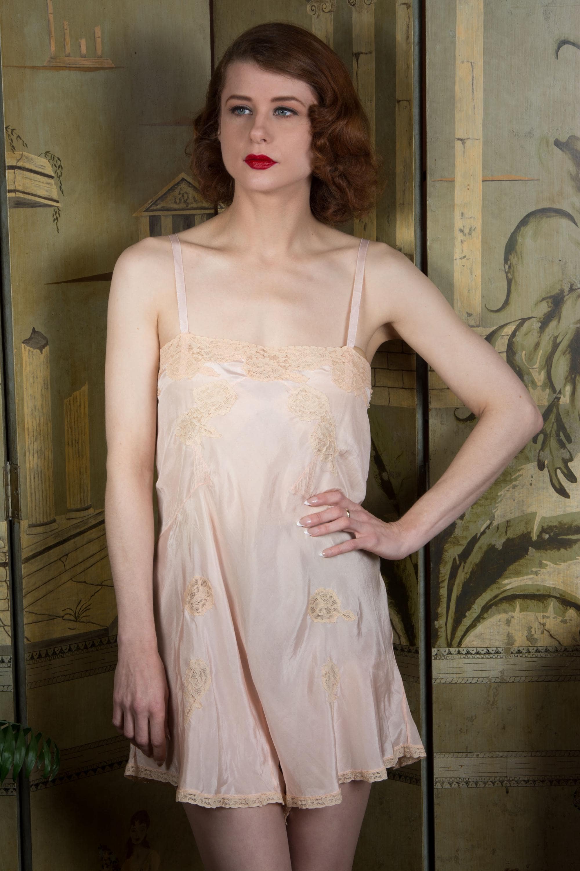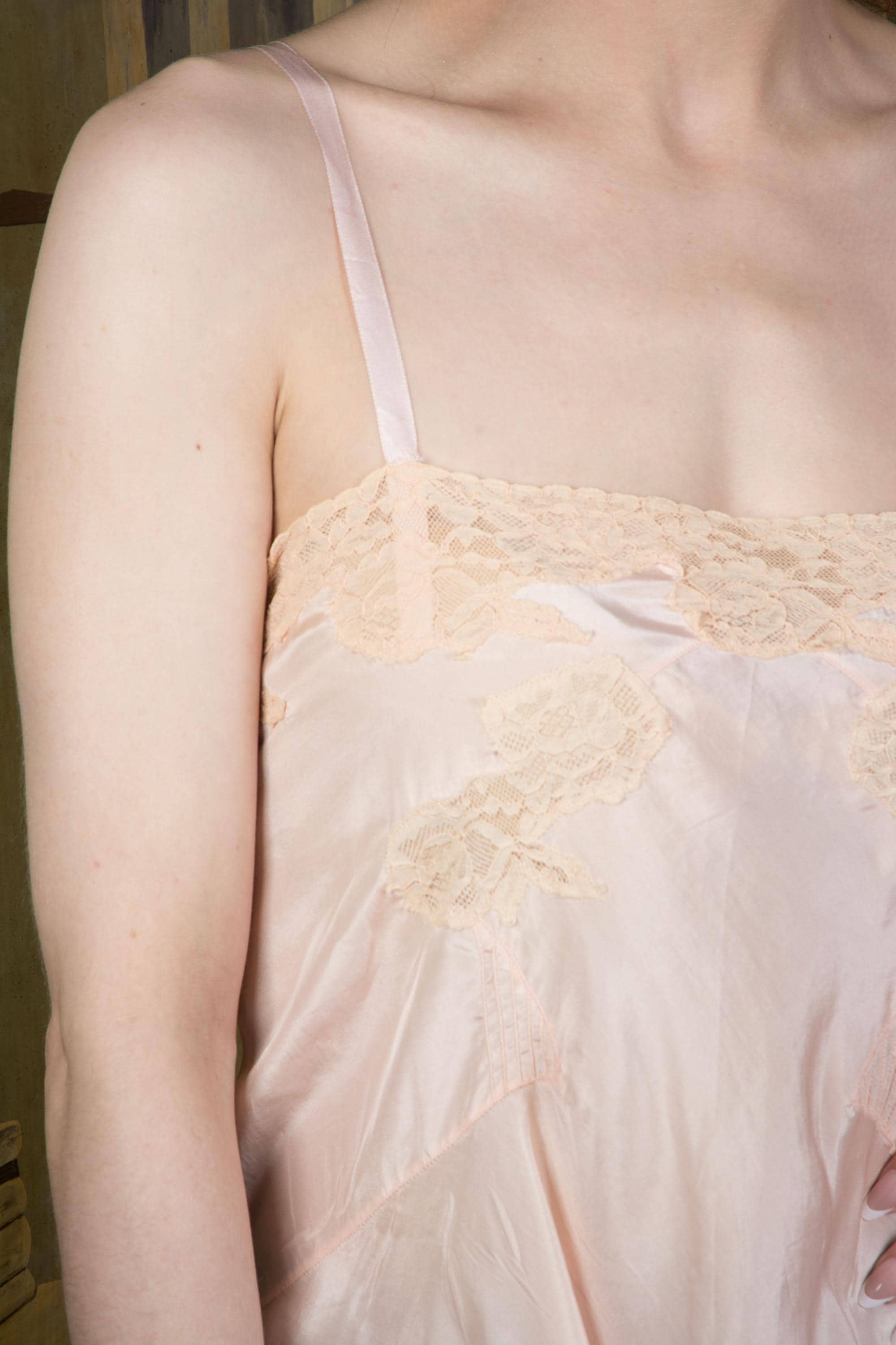 Vintage 1920s chemise, in a soft, very light weight pink peach silk. It is lustrous and flowy. The top of the bodice is trimmed with a band of lace, and more lace is scattered throughout as cutaway appliques. Wedge insets with pintucks give the waist a little shape. Cut on the bias, this drapes and clings. This is a true step in with no closures.