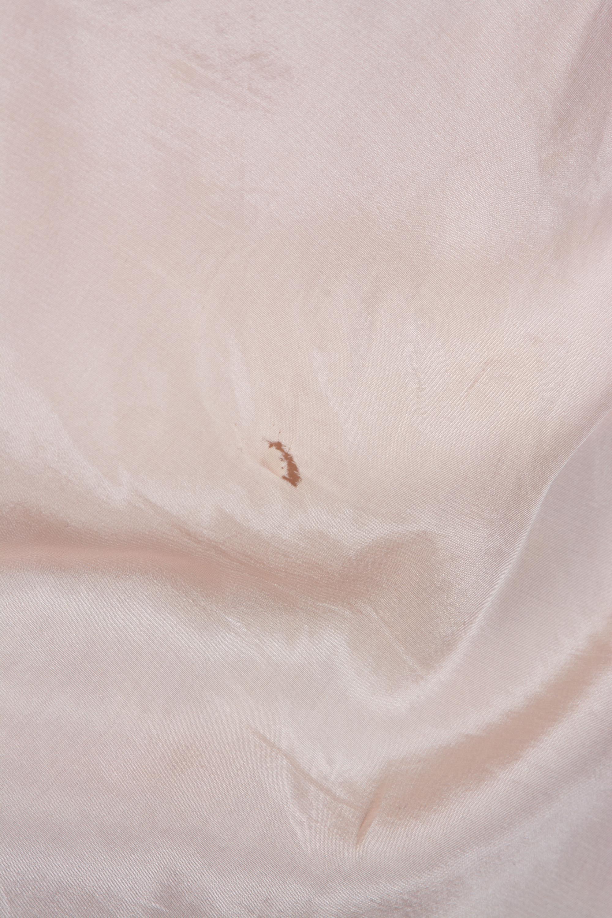 This is clean and ready to wear. There is some very faint discoloration at the center front that I only noticed under our photography lights - I can't see it in my normal room light. There is a 1.5" mark, like a pencil mark? and a small grey dot as well. The original owner sewed a silk ribbon to it at the back as a waistband, and over time it pulled and made a jagged little v tear on the center back - this isn't shattered or weak, just torn by strain. I removed the ribbon to prevent further damage. There is a tiny thin spot above the button crotch piece at front, where it isn't seen when worn. Priced gently. I find no other issues to note!