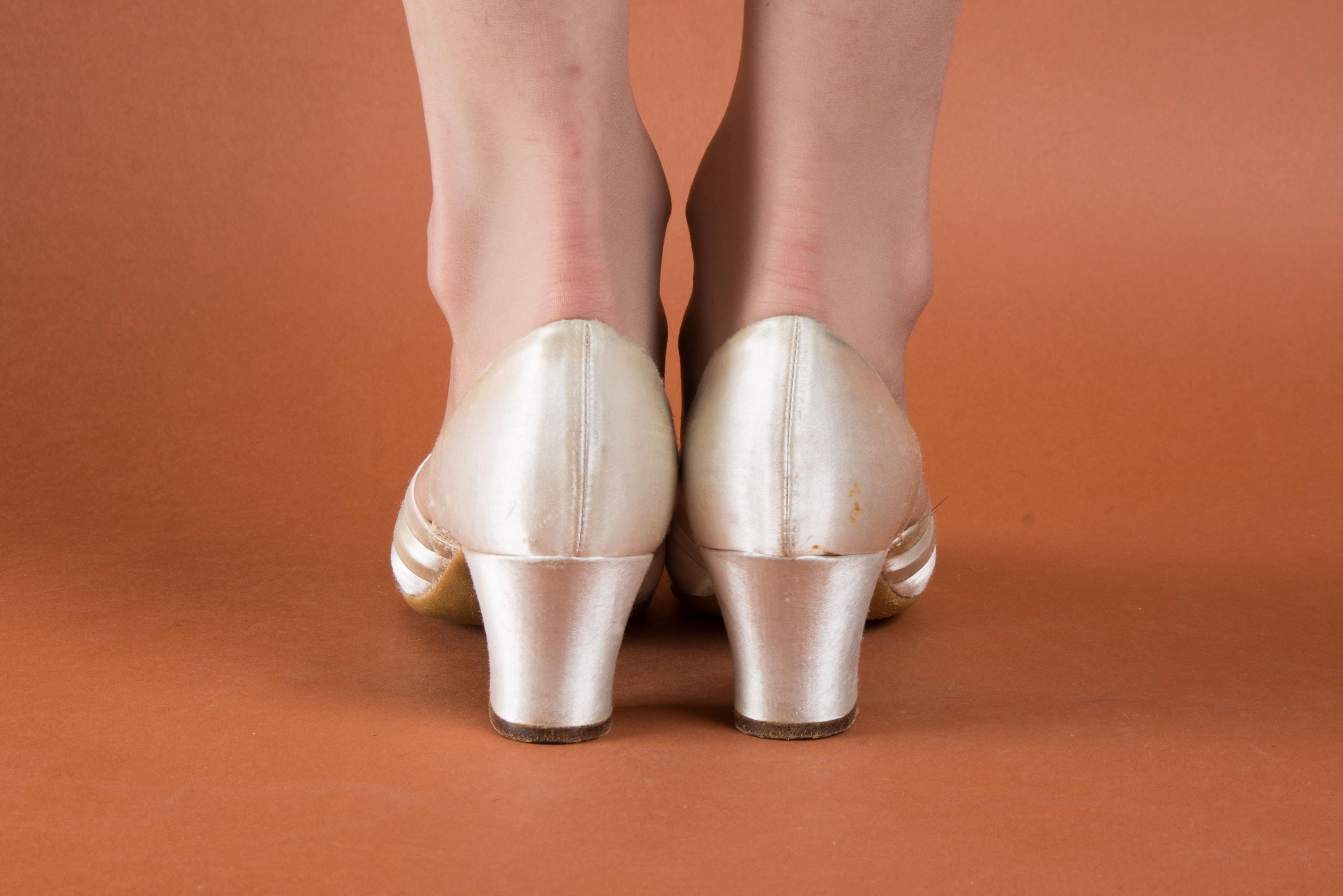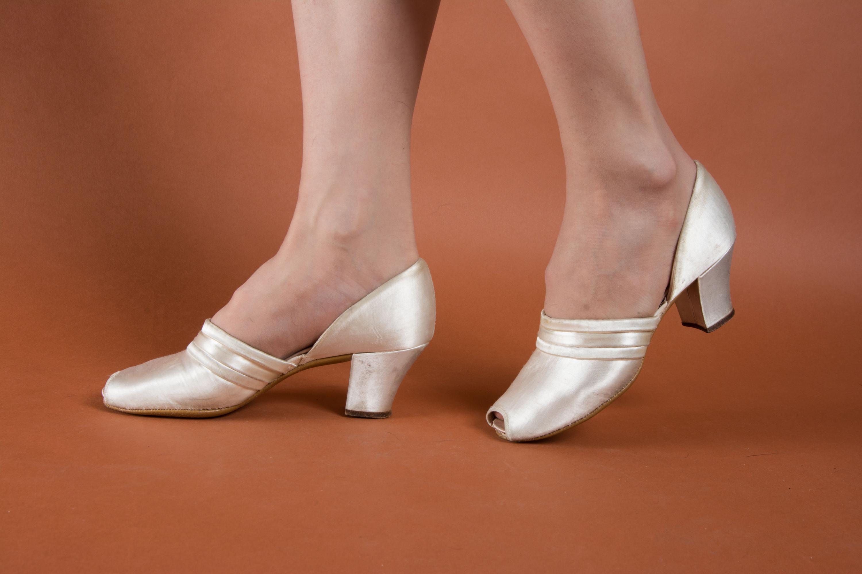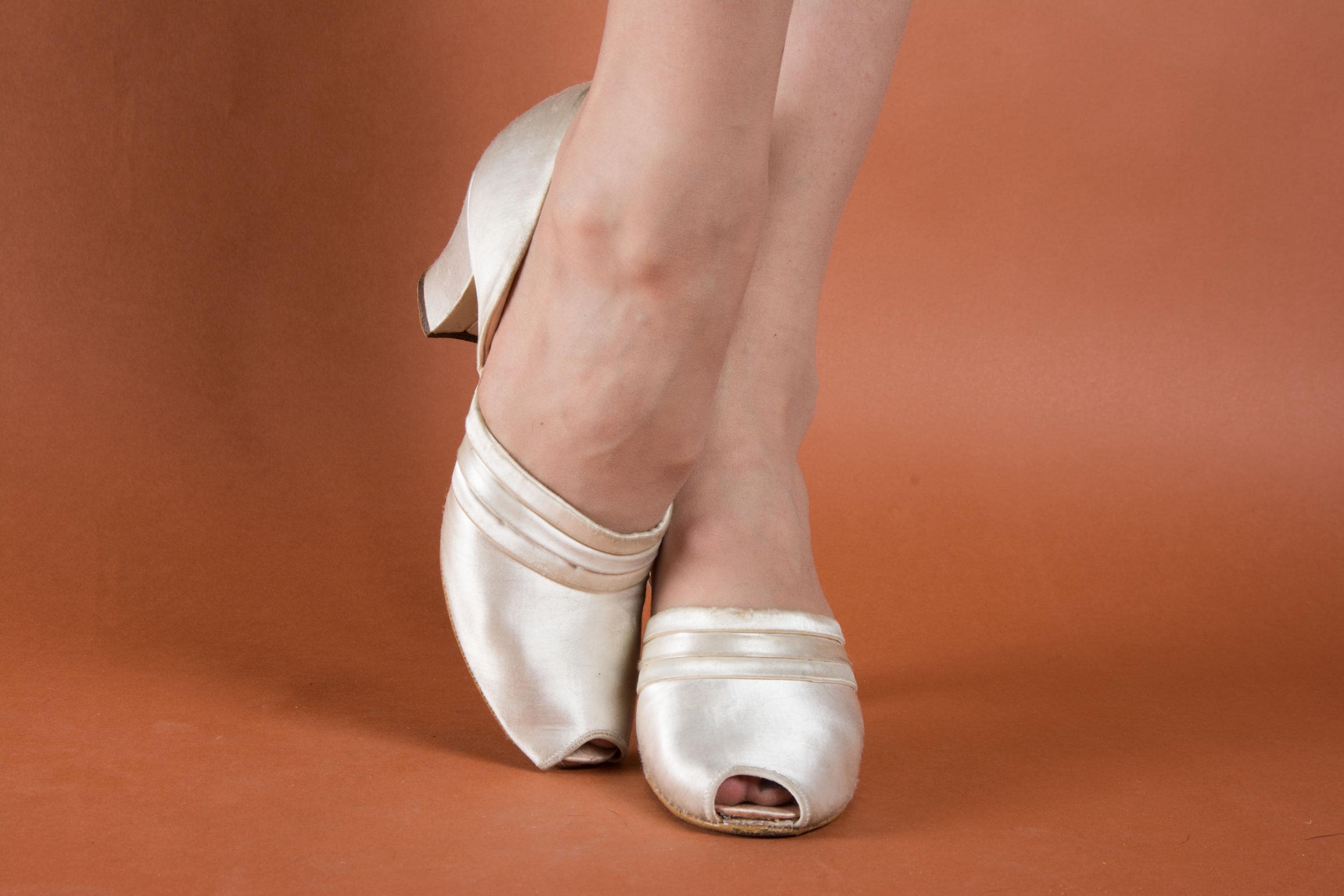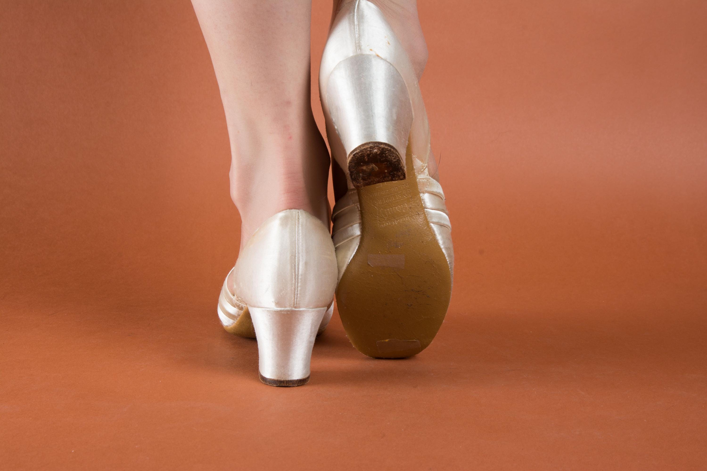 Vintage 1930s slippers by Daniel Green. These are an earlier pair, based on having the patent number on the sole. The are the palest pink hue, with banded trim and a tiny peep toe. Perfect for lounging around the house in style! More satin lines the shoes, and the soles and heel tips are made of leather.