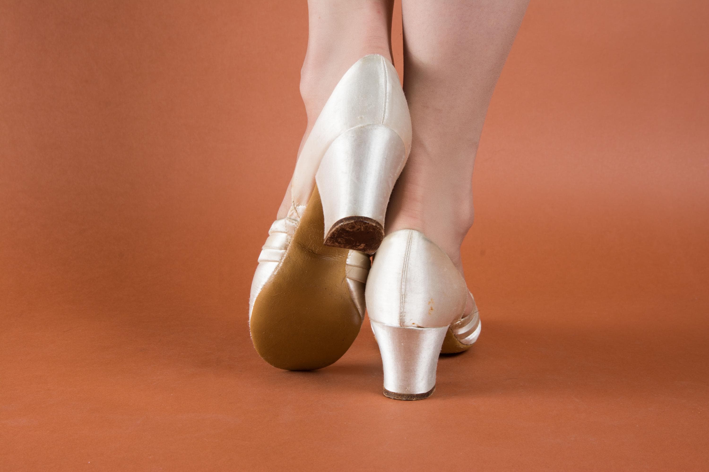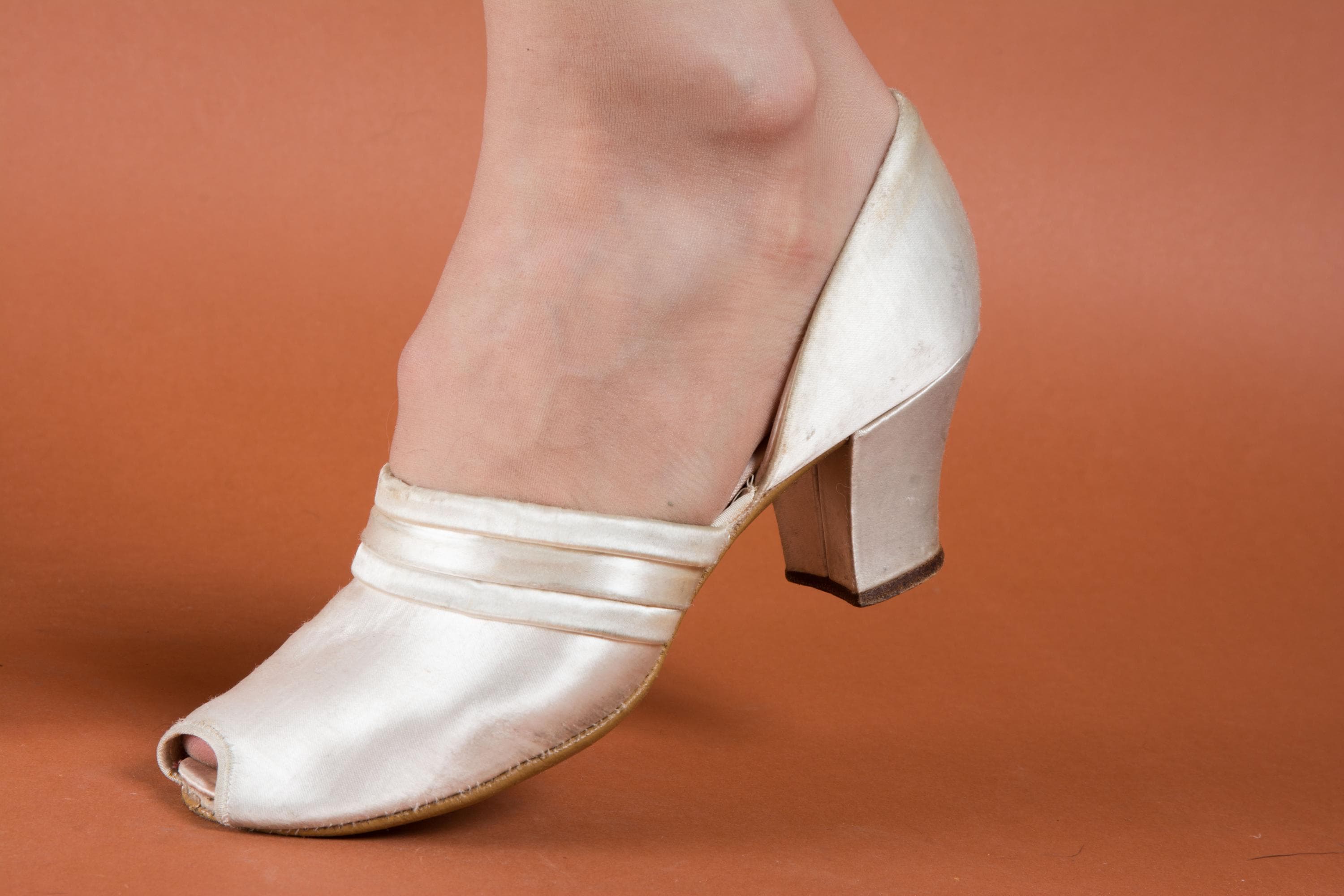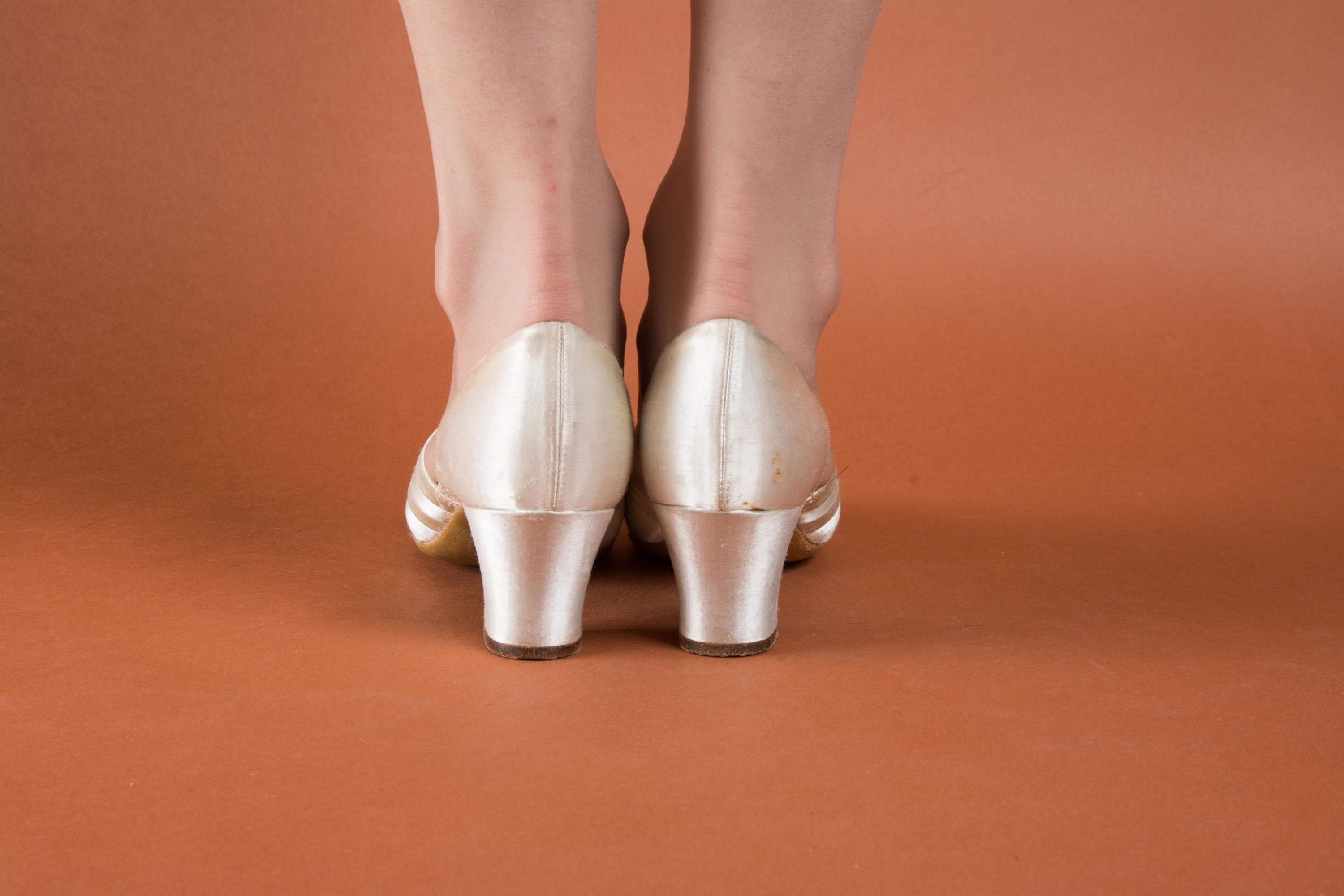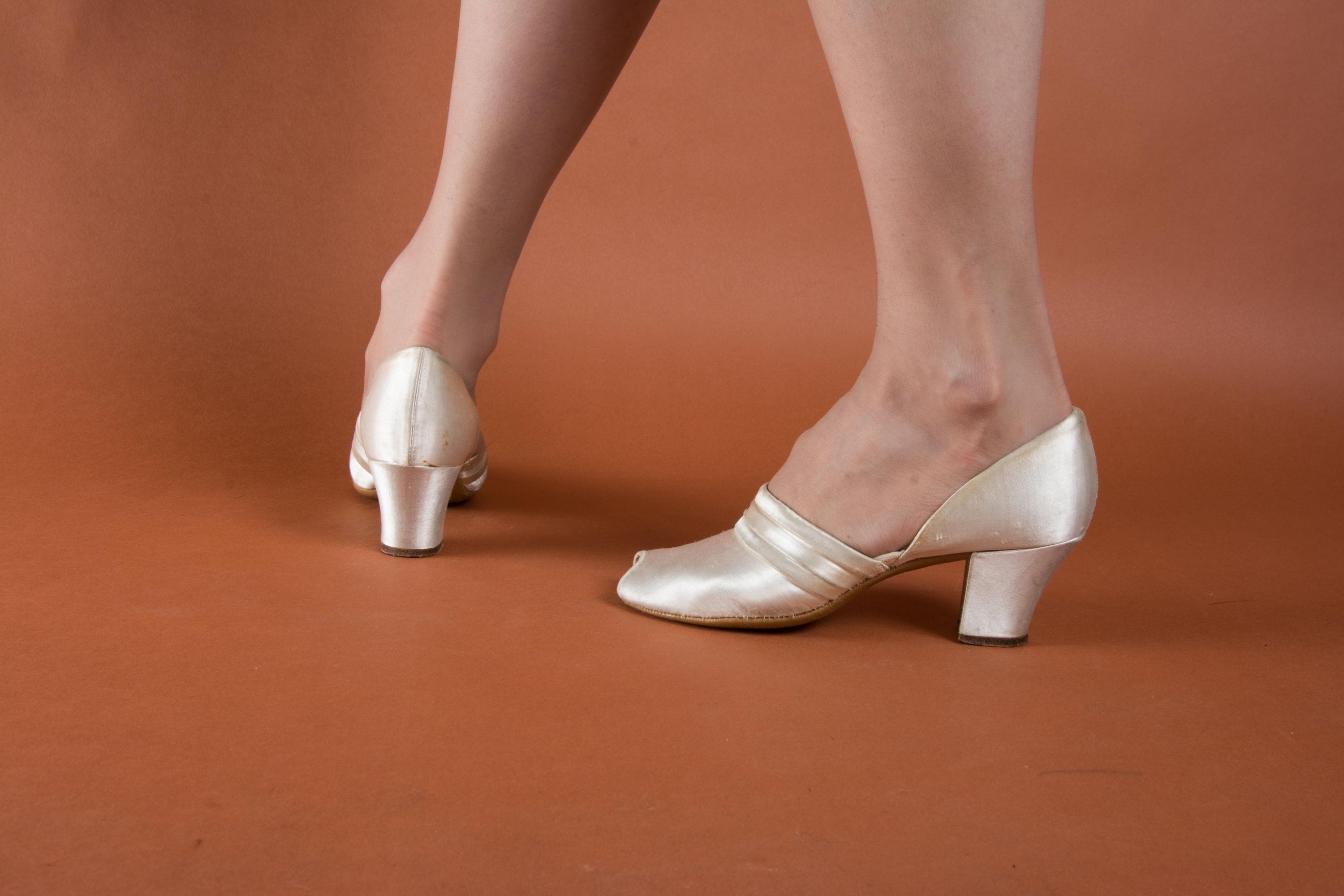 Vintage 1930s slippers by Daniel Green. These are an earlier pair, based on having the patent number on the sole. The are the palest pink hue, with banded trim and a tiny peep toe. Perfect for lounging around the house in style! More satin lines the shoes, and the soles and heel tips are made of leather.