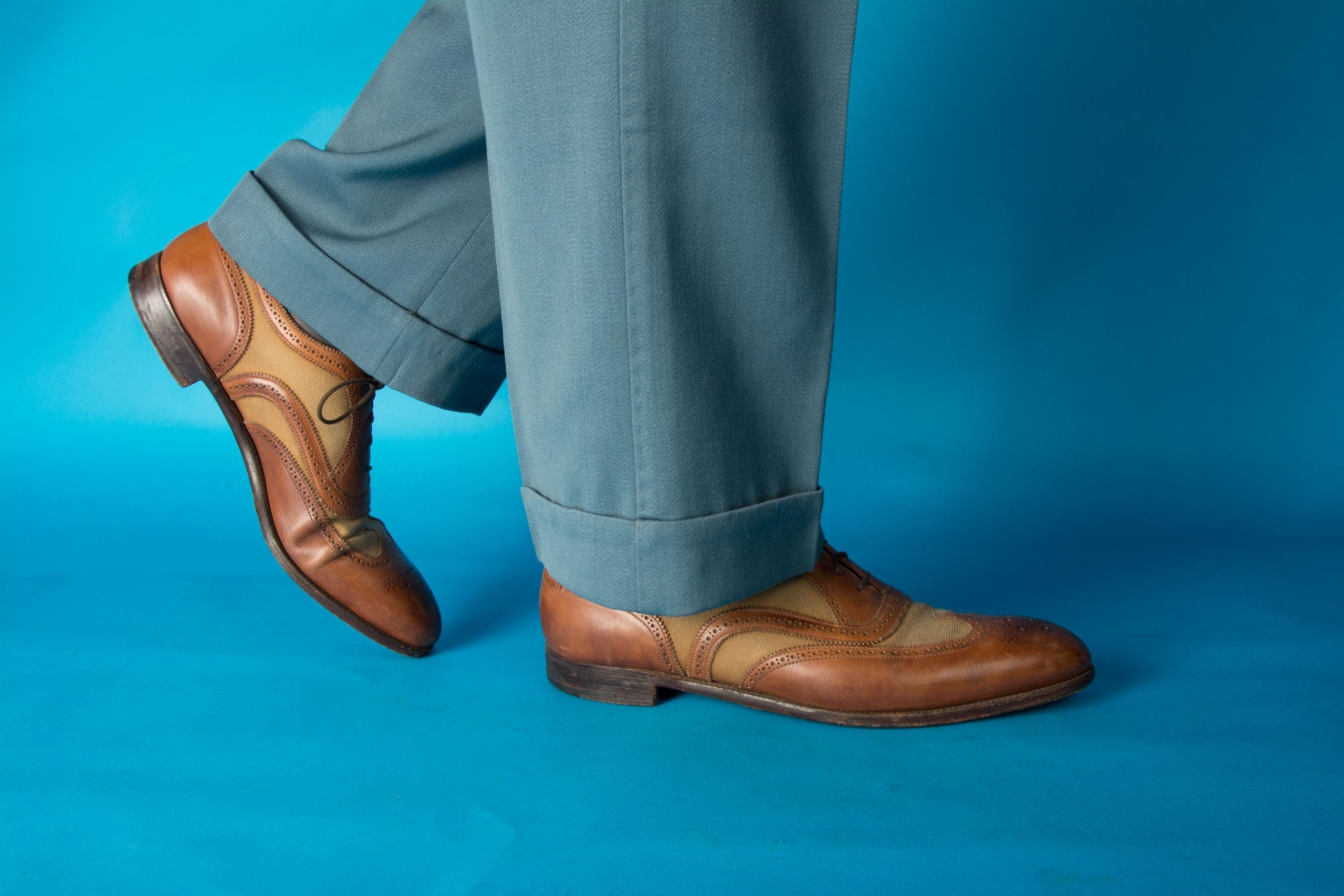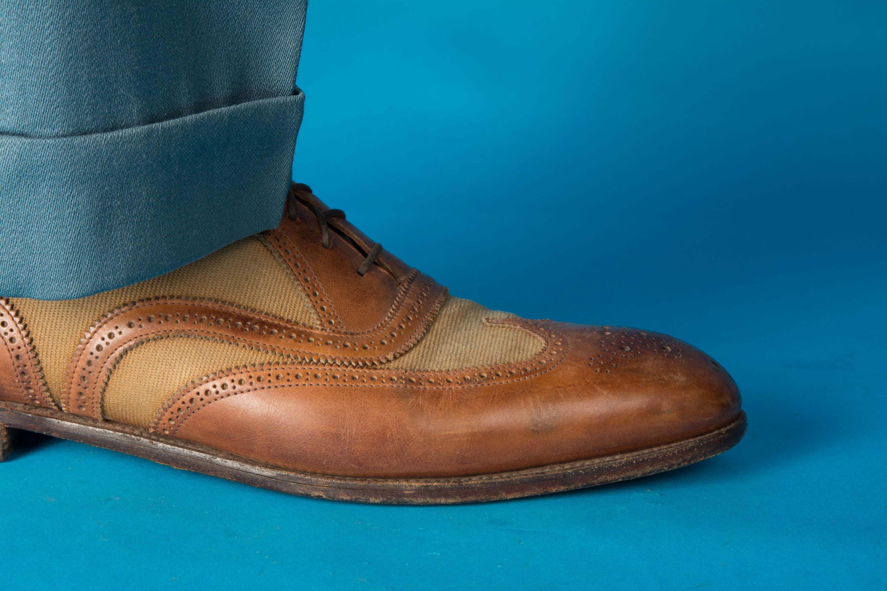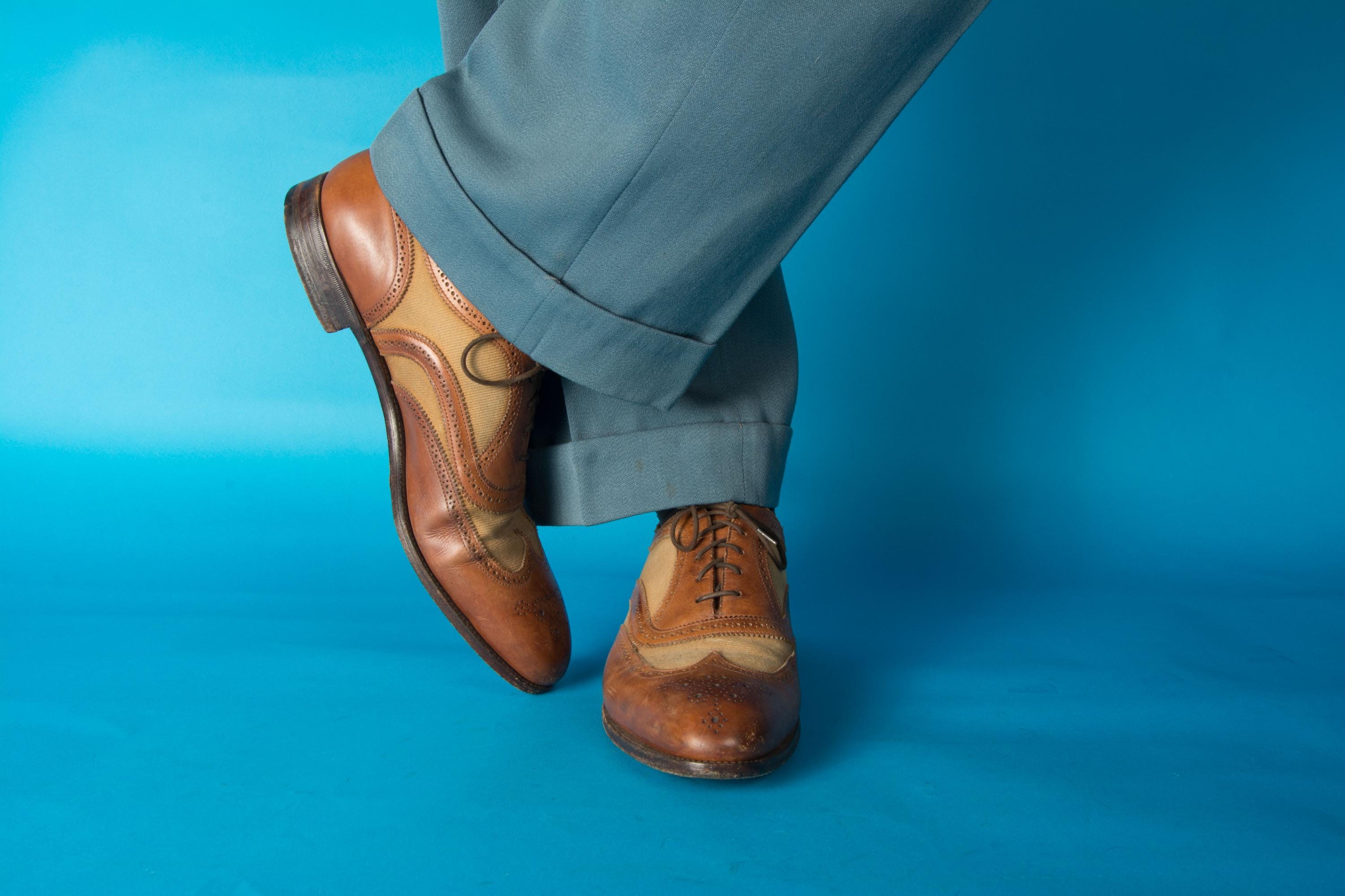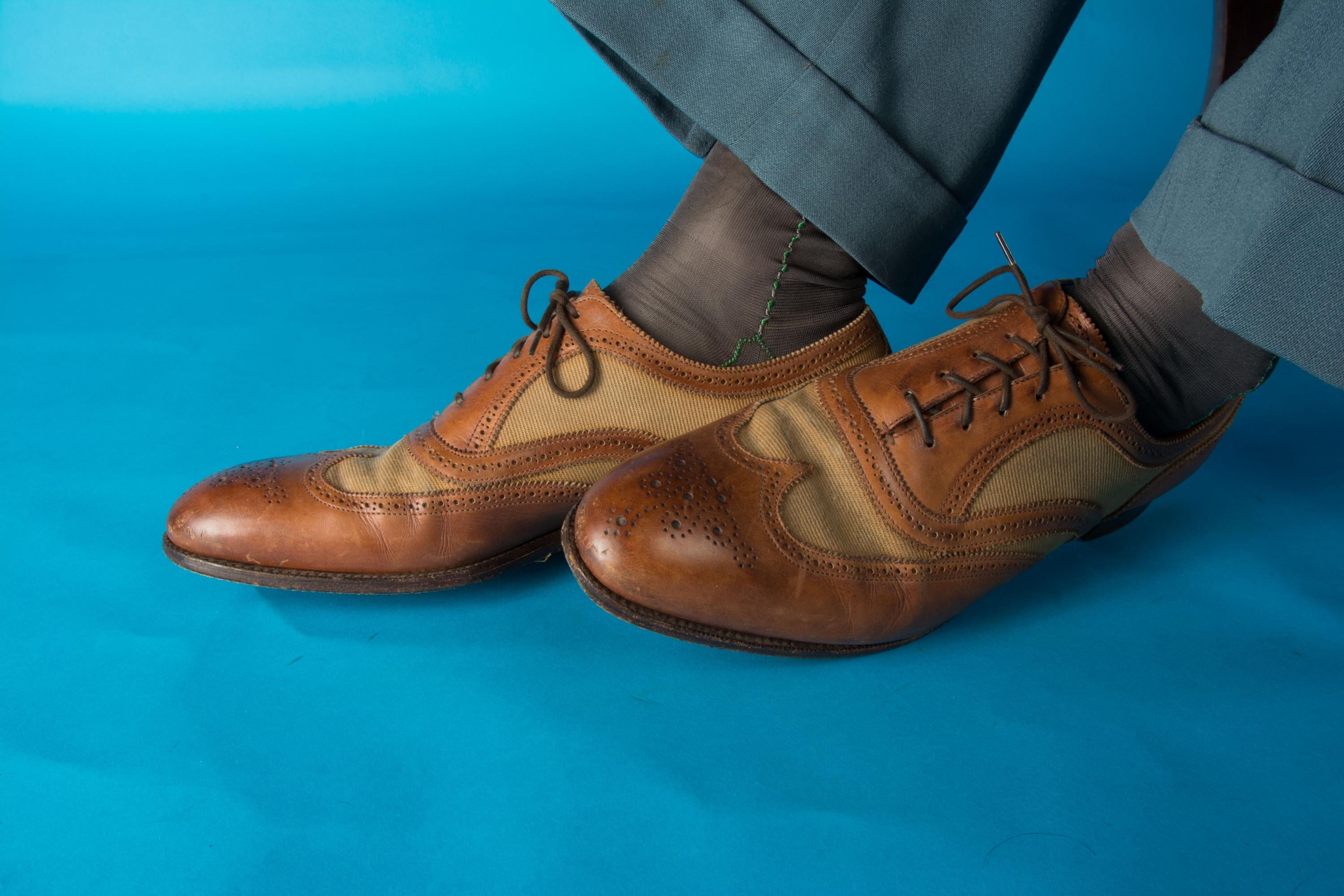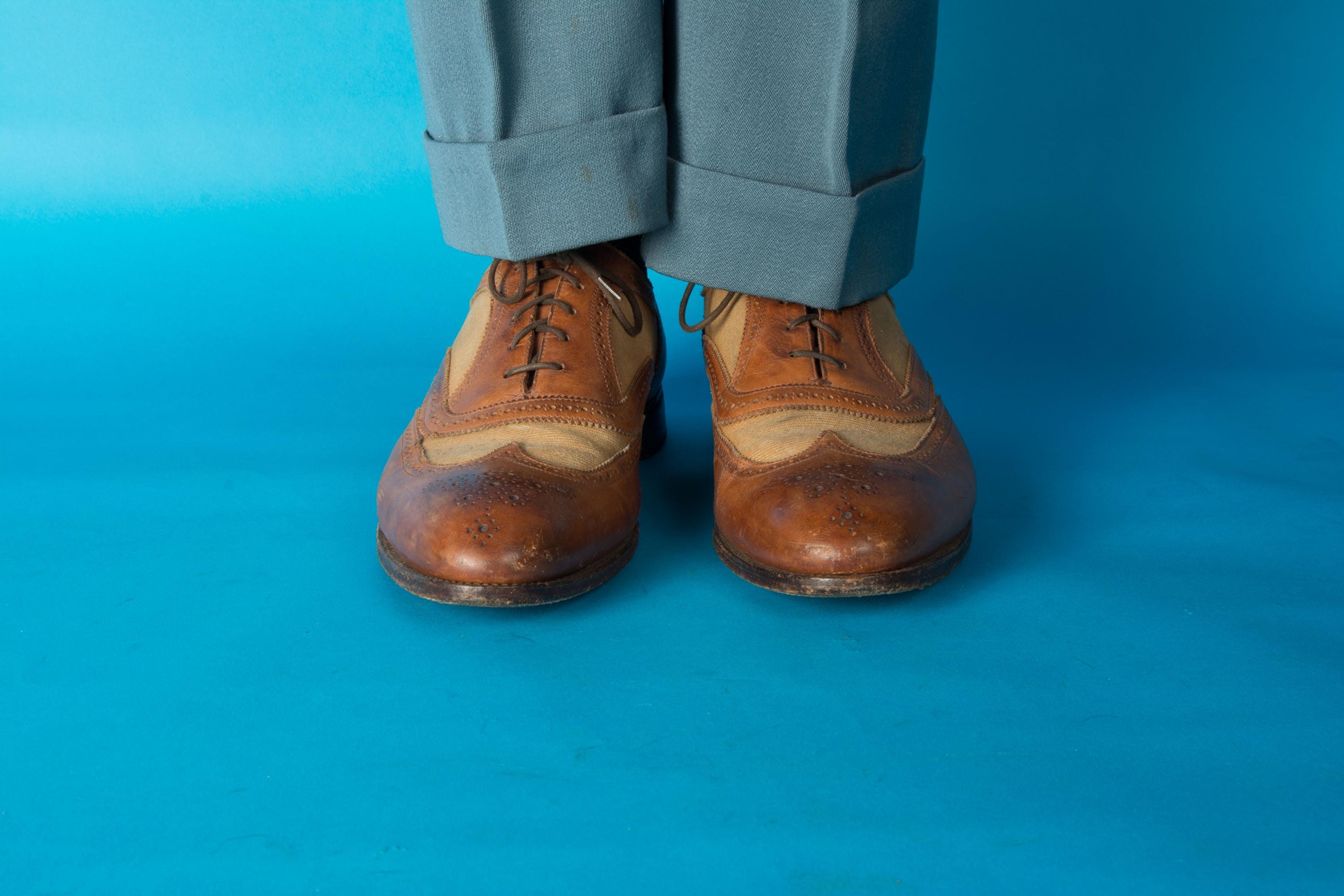 A gorgeous pair of spectators from on of Beverly Hill's esteemed fine menswear shops. Opened in the postwar era, these striking shoes are likely 50s, possibly 60s, and are absolutely classics. Pairing a tan canvas with rich chestnut brown leather, they feature dramatic wingtip and exceptional broguing - so much work went into these shoes! They feature all leather lining and leather soles. Stamped Made in England on the soles.