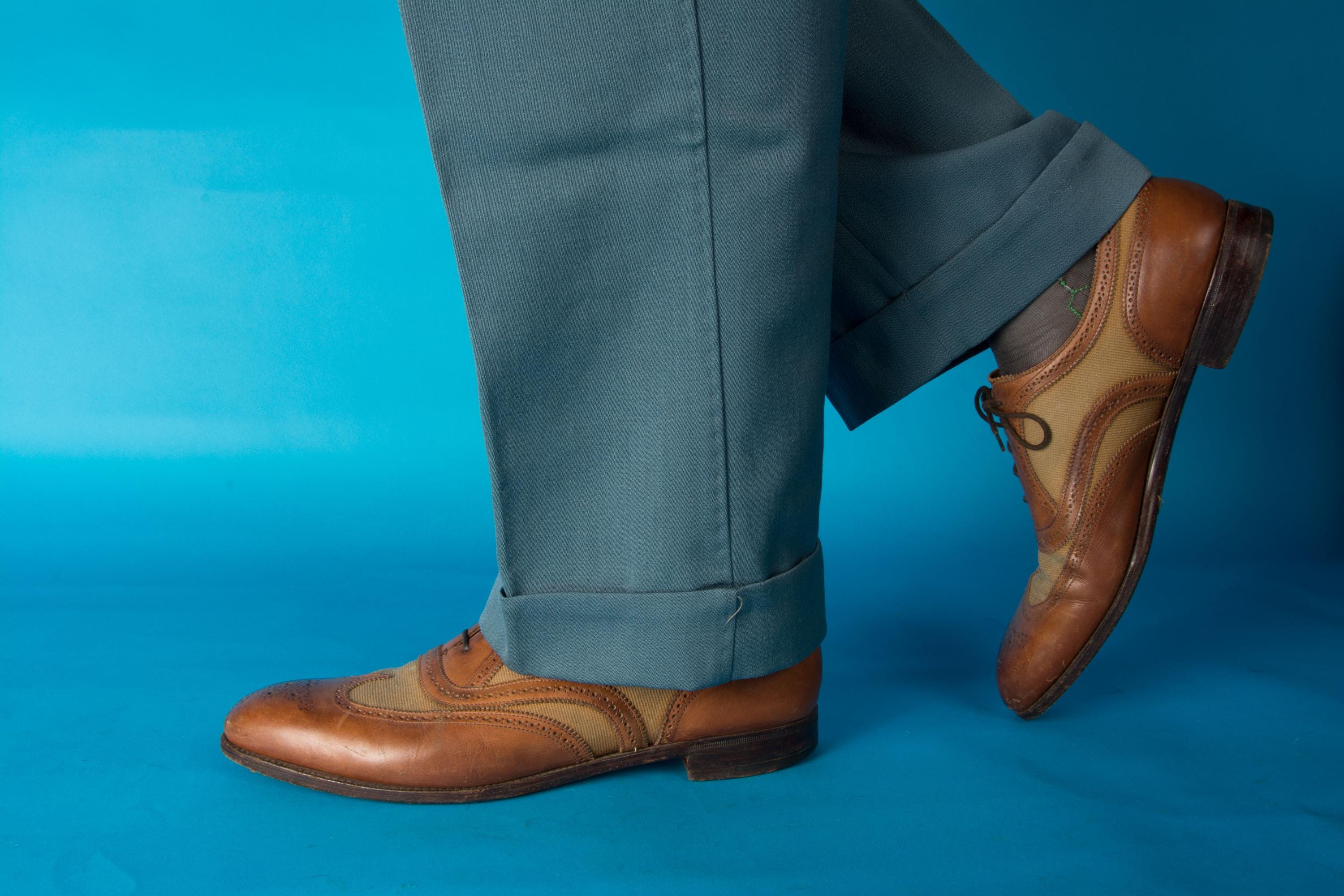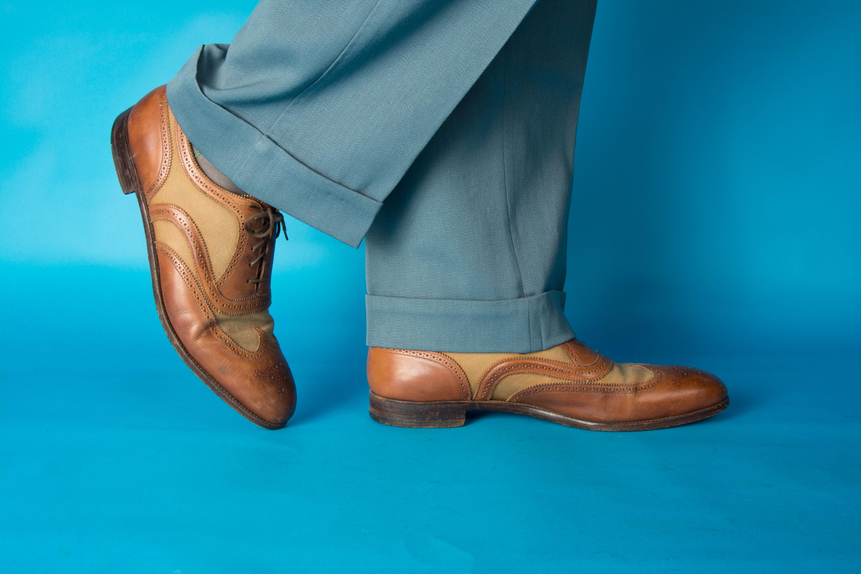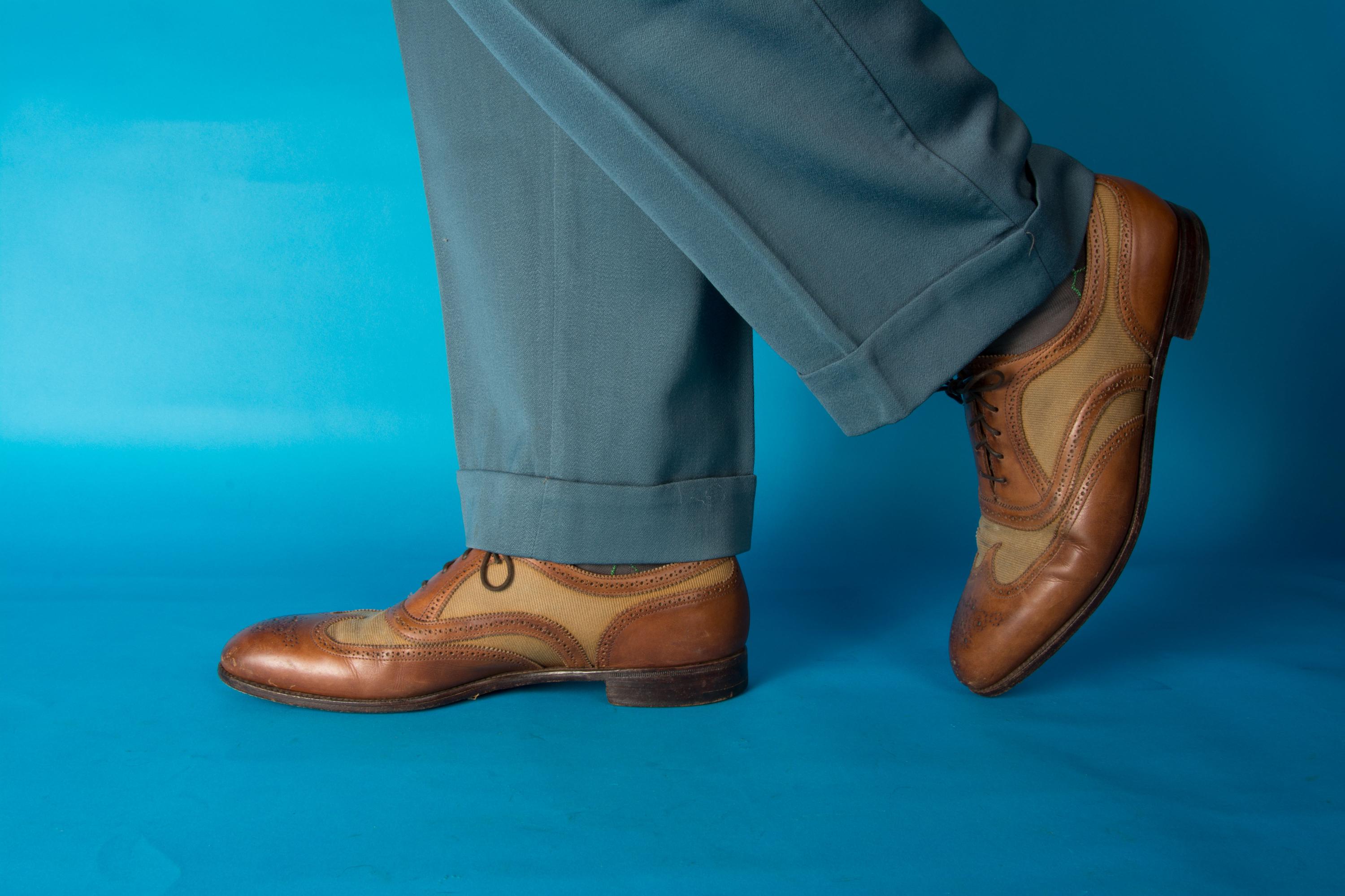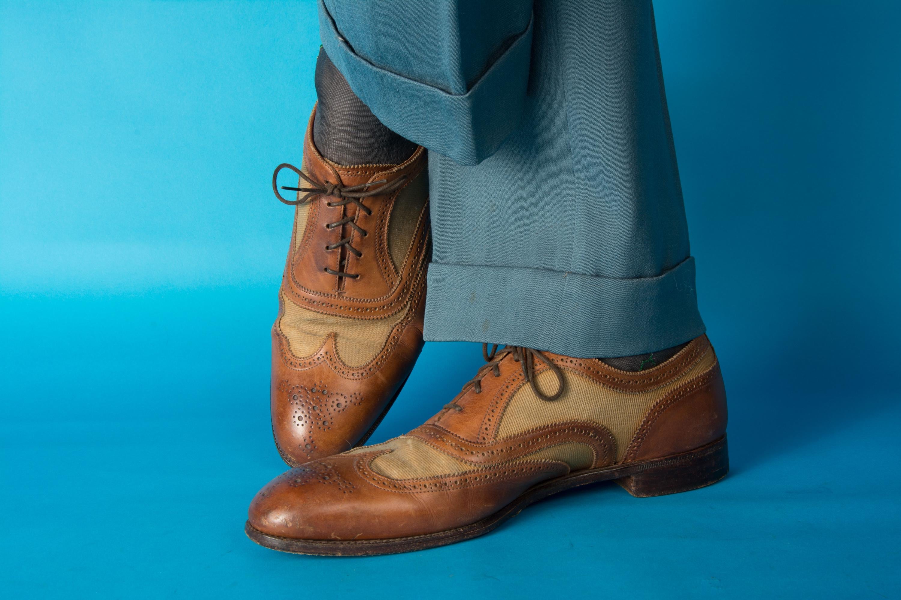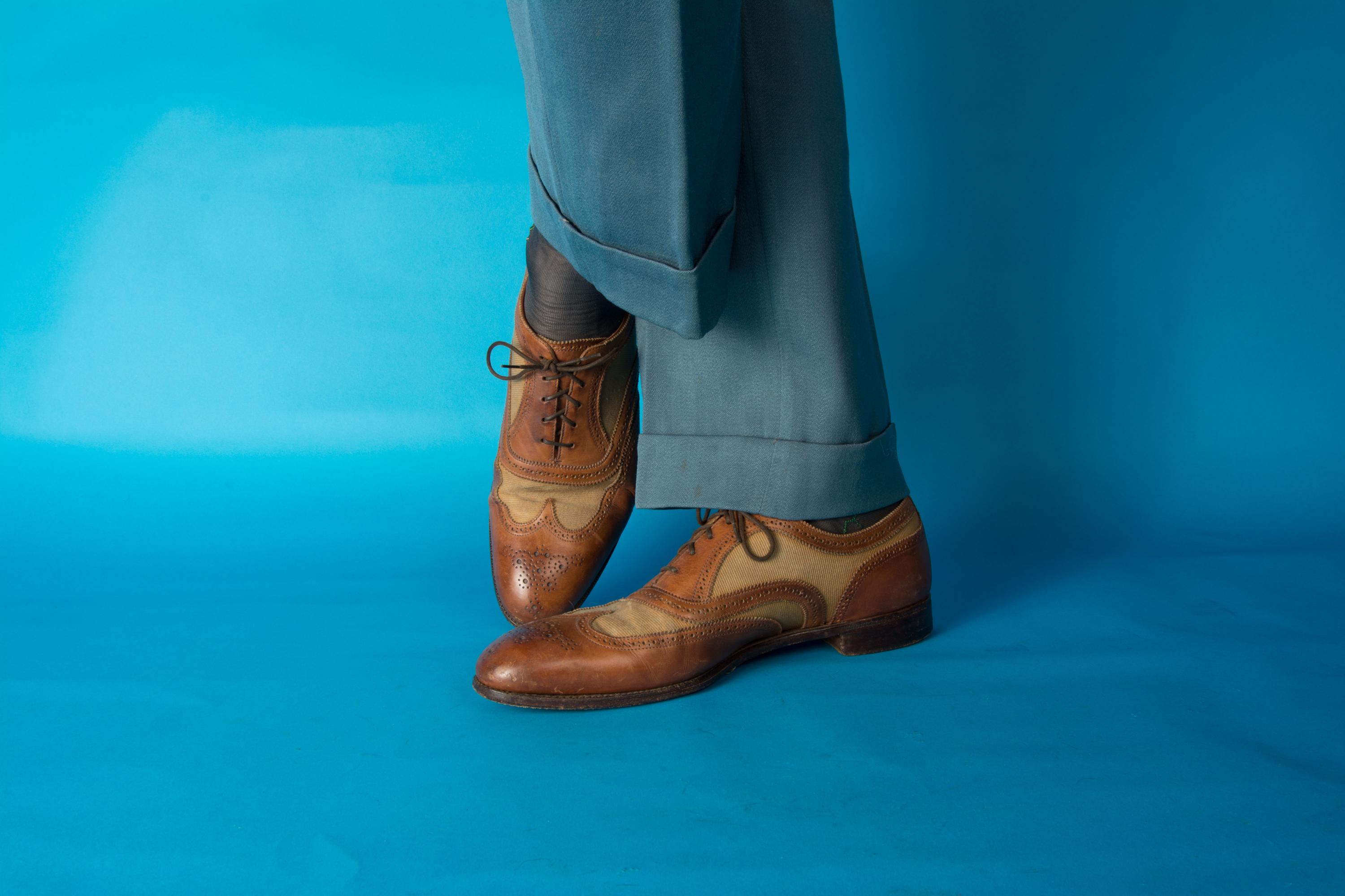 A gorgeous pair of spectators from on of Beverly Hill's esteemed fine menswear shops. Opened in the postwar era, these striking shoes are likely 50s, possibly 60s, and are absolutely classics. Pairing a tan canvas with rich chestnut brown leather, they feature dramatic wingtip and exceptional broguing - so much work went into these shoes! They feature all leather lining and leather soles. Stamped Made in England on the soles.