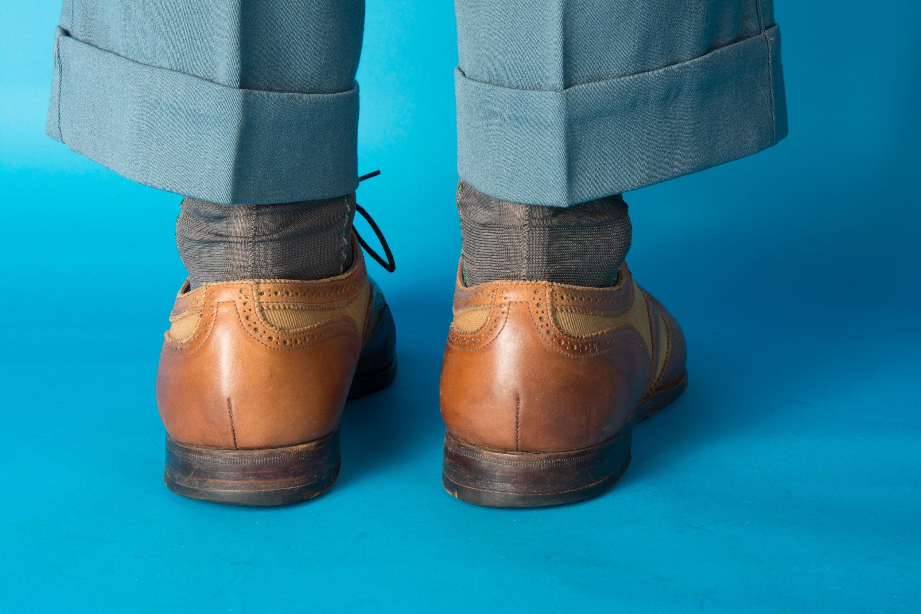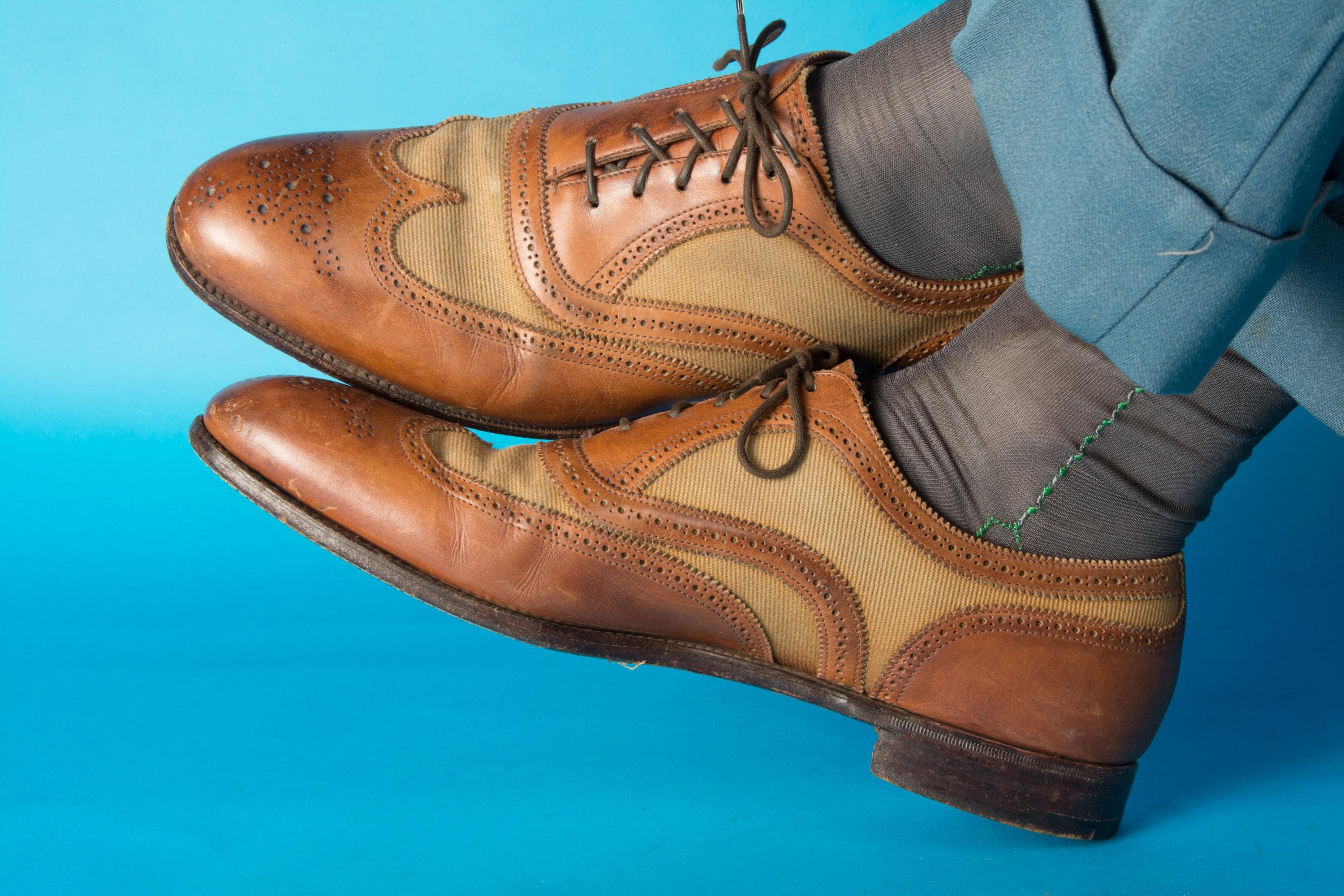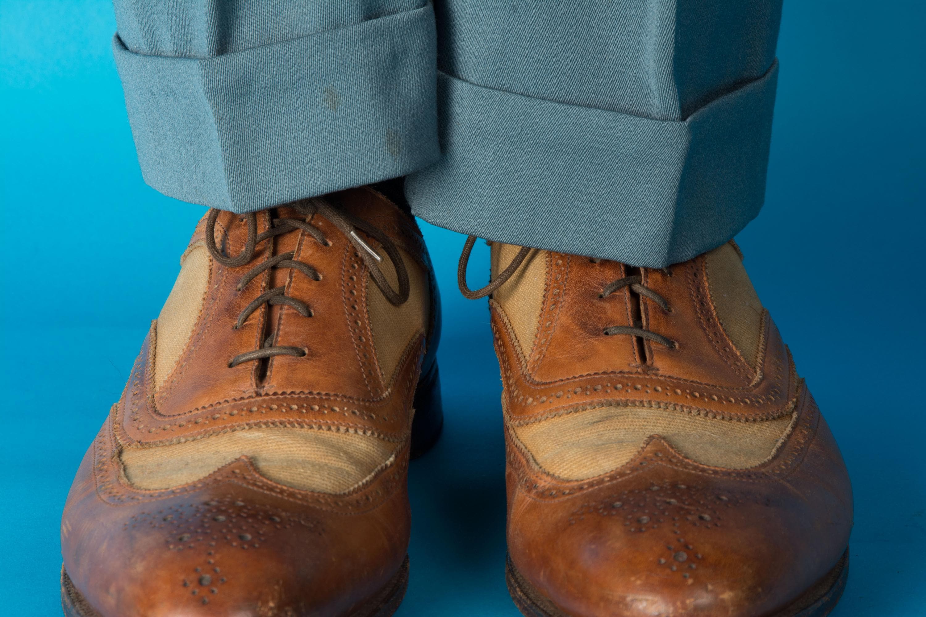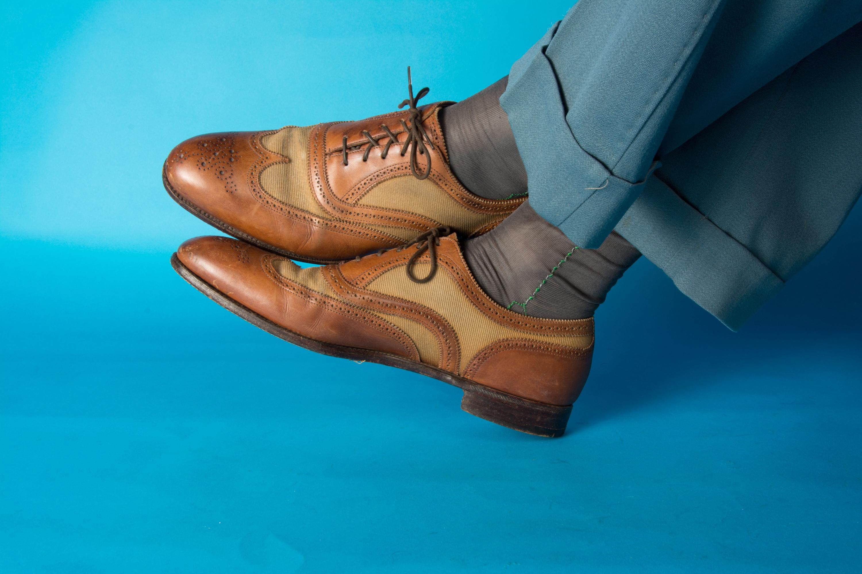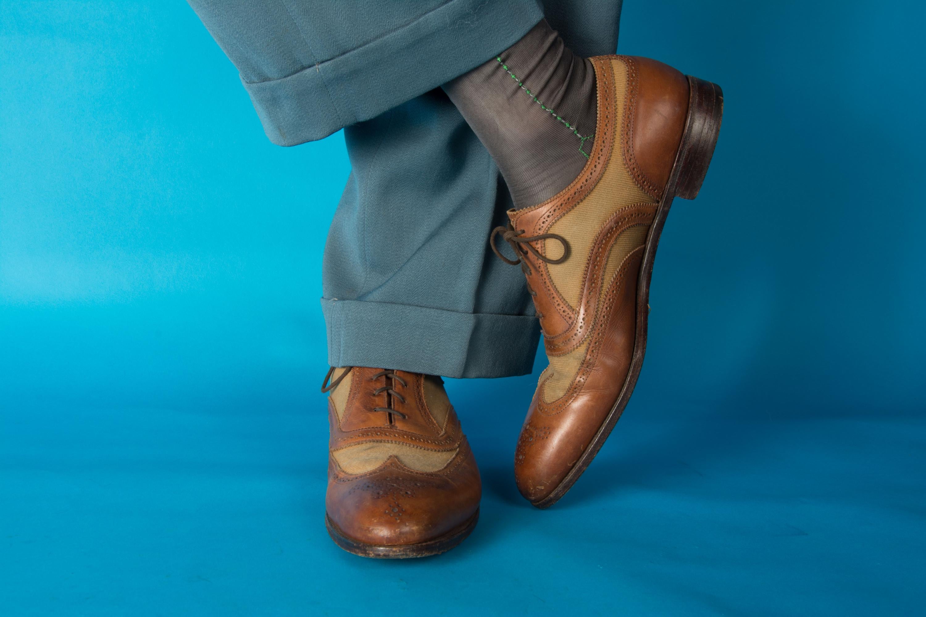 A gorgeous pair of spectators from on of Beverly Hill's esteemed fine menswear shops. Opened in the postwar era, these striking shoes are likely 50s, possibly 60s, and are absolutely classics. Pairing a tan canvas with rich chestnut brown leather, they feature dramatic wingtip and exceptional broguing - so much work went into these shoes! They feature all leather lining and leather soles. Stamped Made in England on the soles.