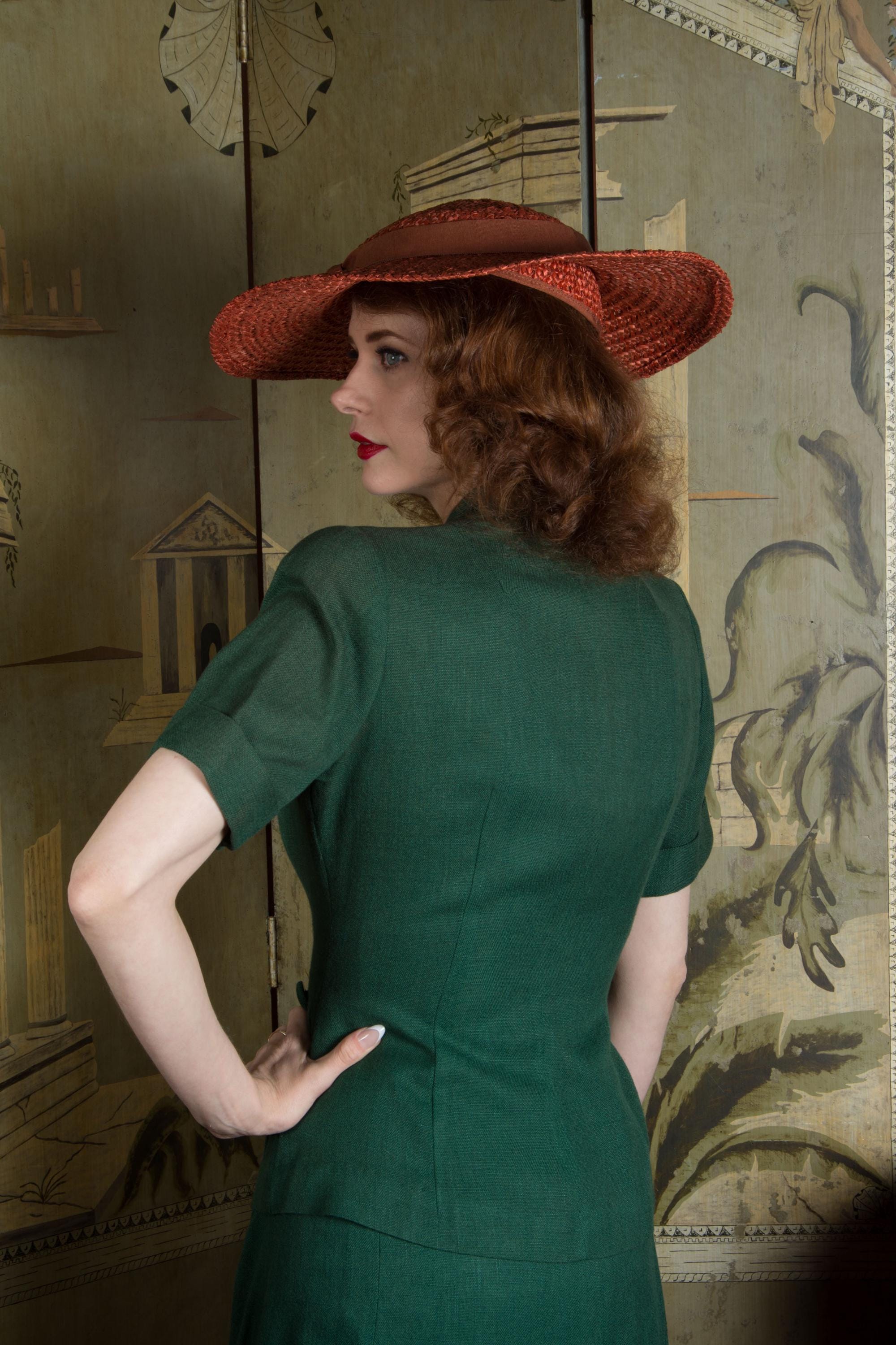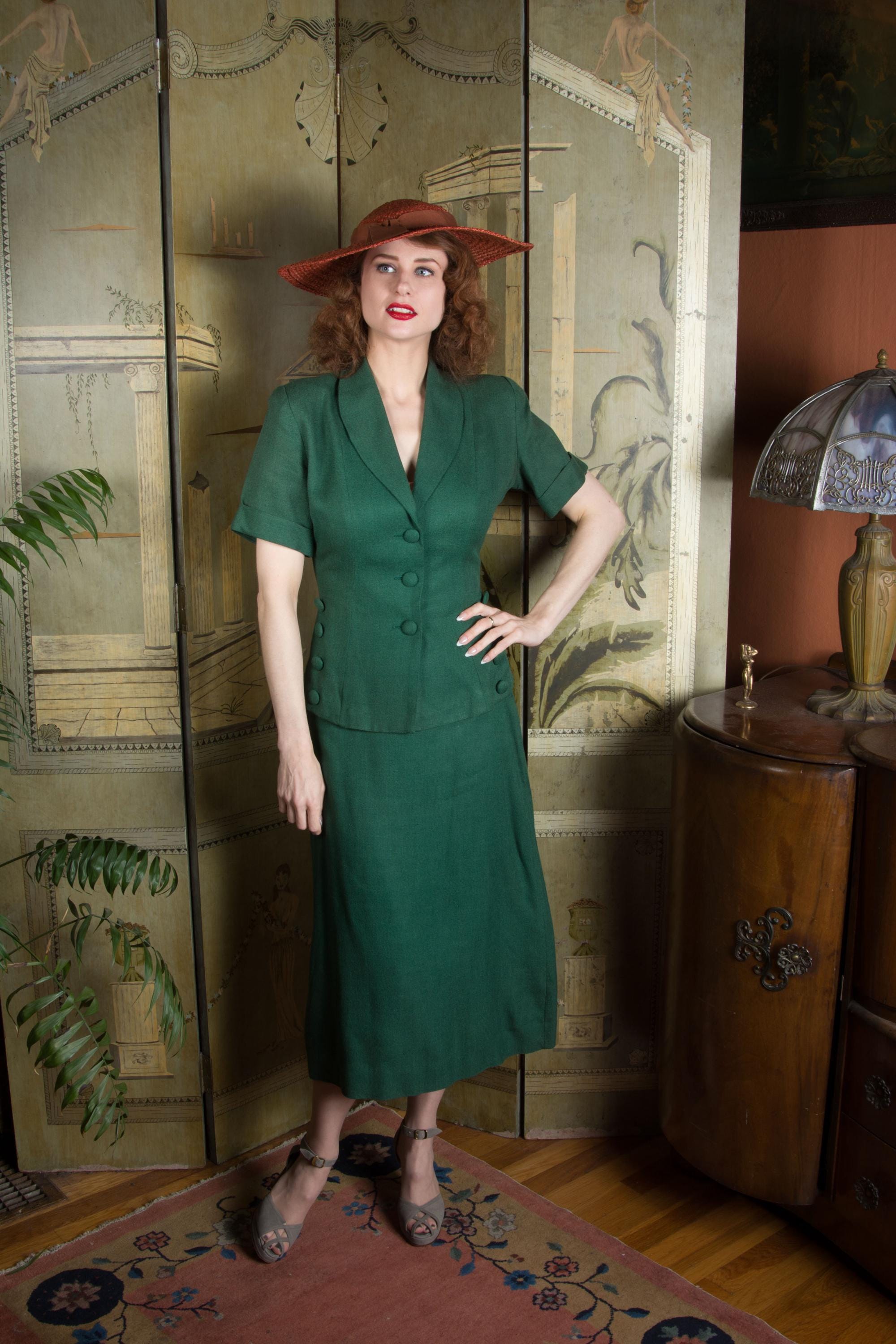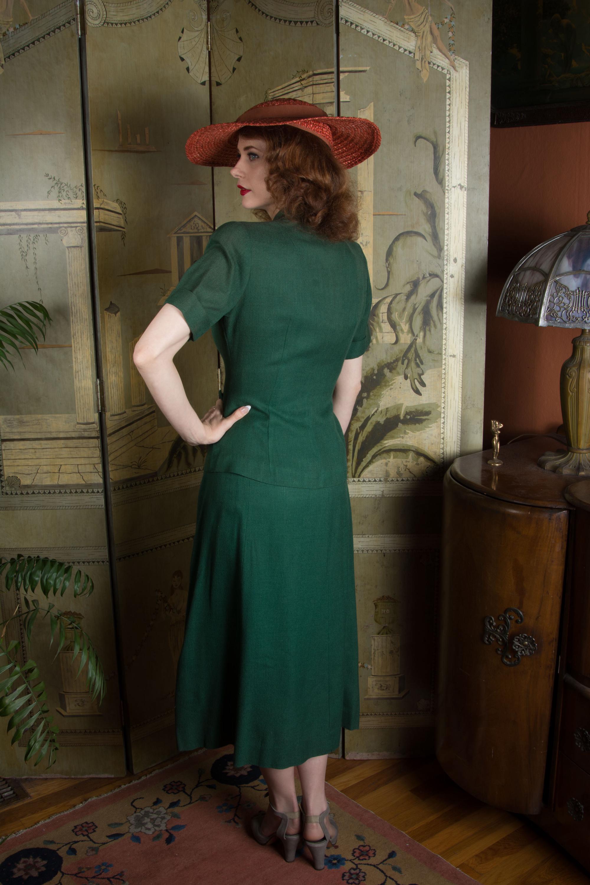Vintage late 1940s to early suit is such a win for spring and summer style! Likely made 1948-1951, this is a rich, soft linen blend - it tests most like linen/wool. The top is a sporty short sleeve style, with three self-fabric closure buttons down the front, and four at each side of the hip. The collar is a soft shawl style. The shoulders are padded and the short sleeves are cuffed. Like most summer suits, it is unlined. The skirt is the longer shape of the late 40s, a single panel at the front, and three gores at the back. It closes with metal side zipper and button.