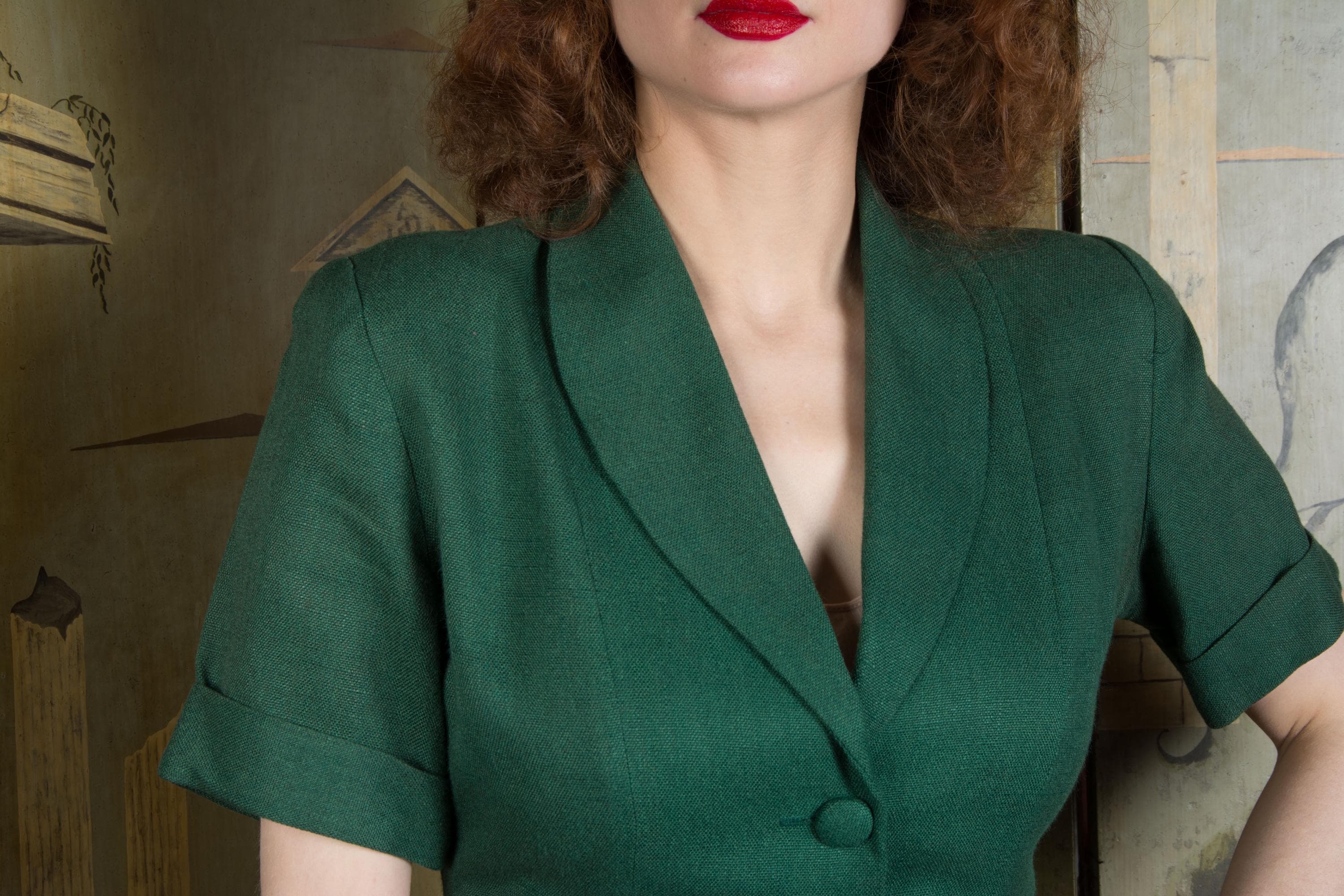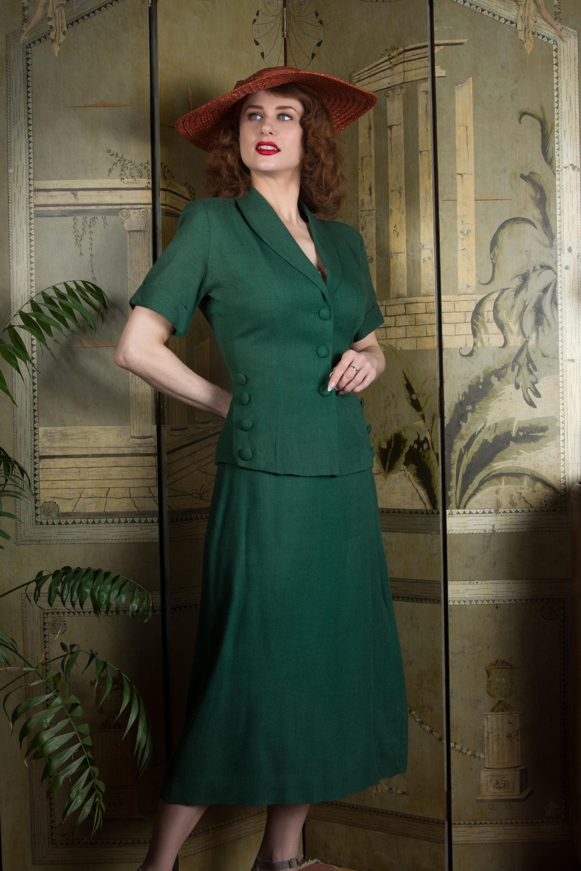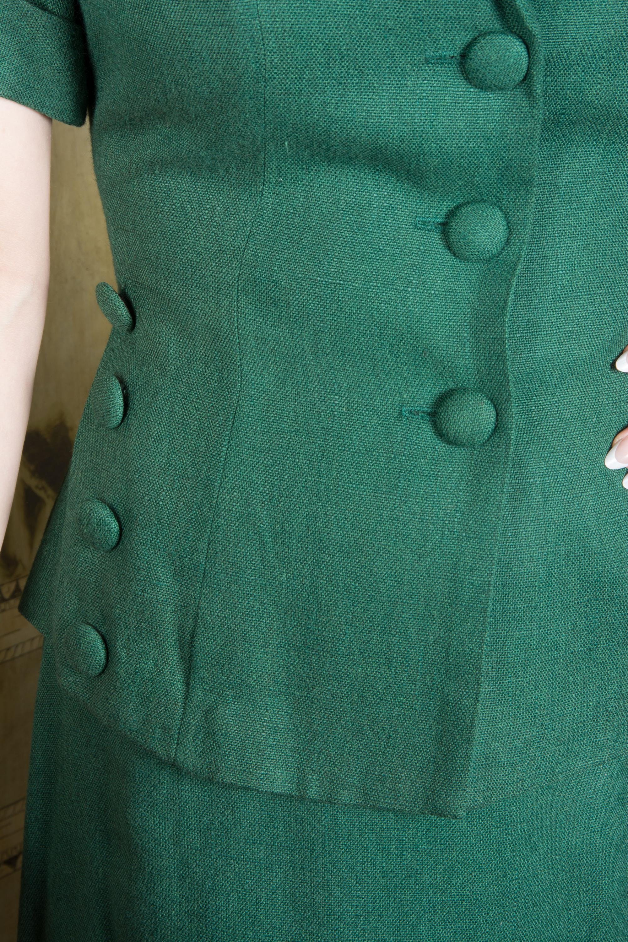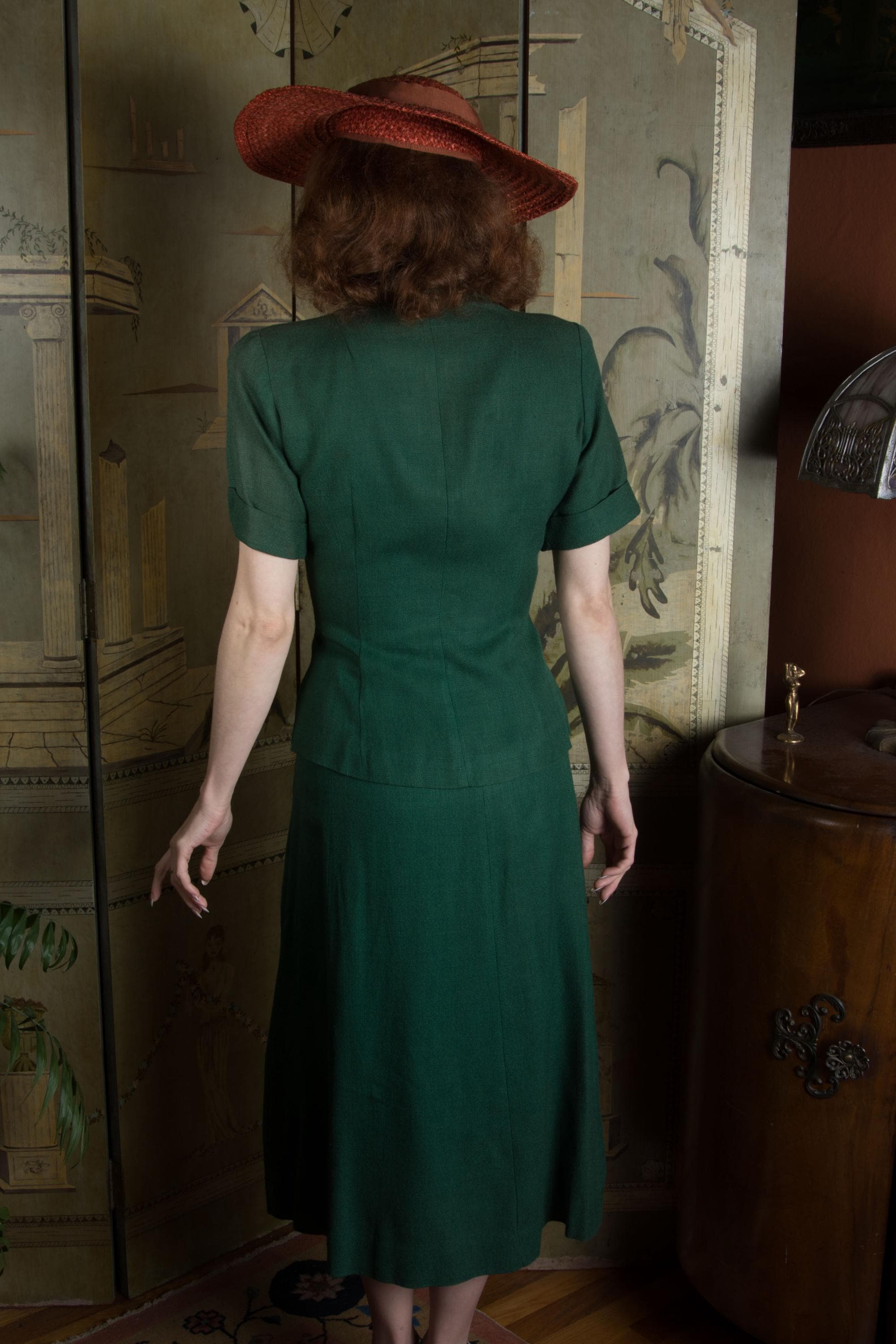 Vintage late 1940s to early suit is such a win for spring and summer style! Likely made 1948-1951, this is a rich, soft linen blend - it tests most like linen/wool. The top is a sporty short sleeve style, with three self-fabric closure buttons down the front, and four at each side of the hip. The collar is a soft shawl style. The shoulders are padded and the short sleeves are cuffed. Like most summer suits, it is unlined. The skirt is the longer shape of the late 40s, a single panel at the front, and three gores at the back. It closes with metal side zipper and button.