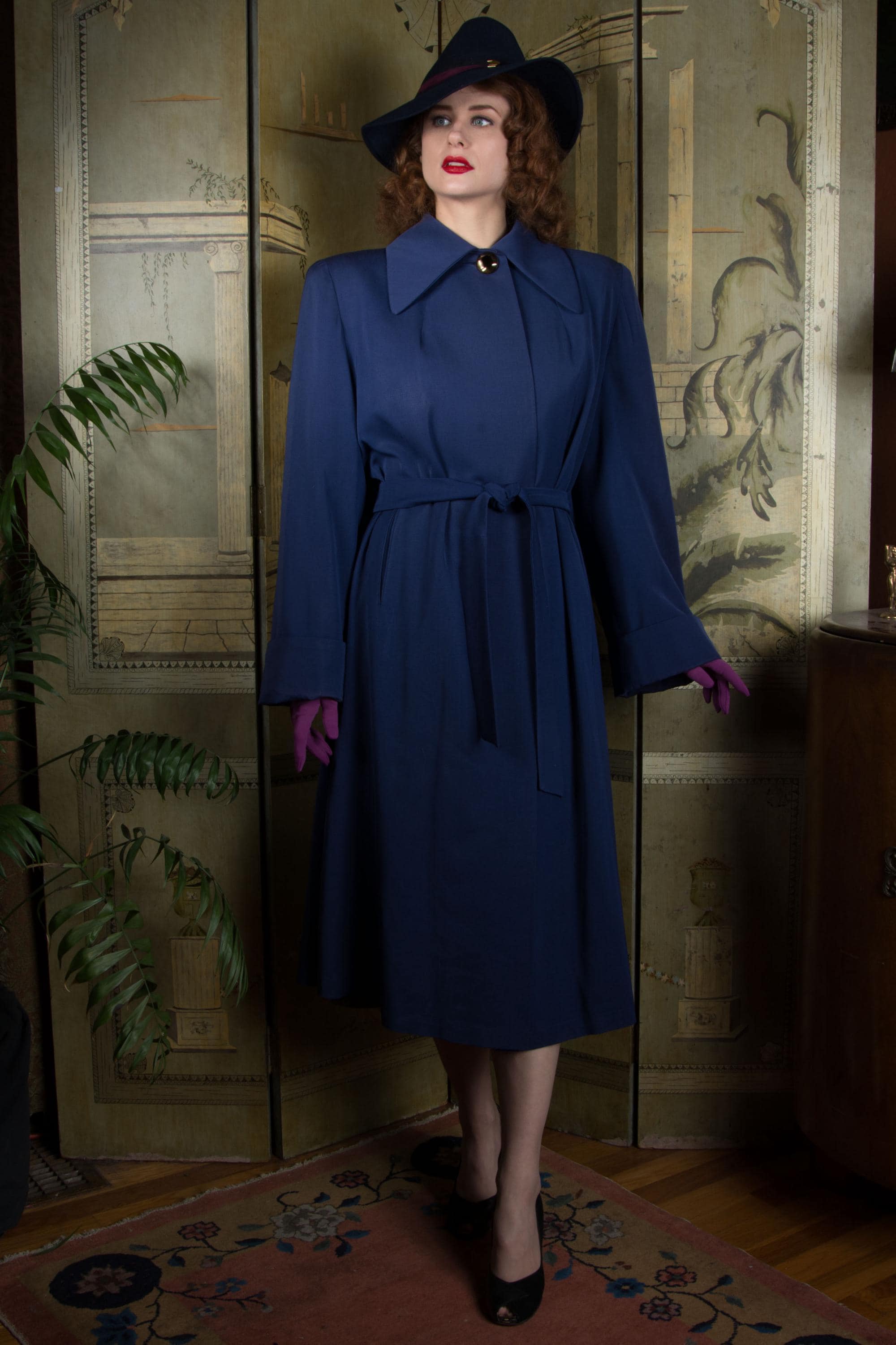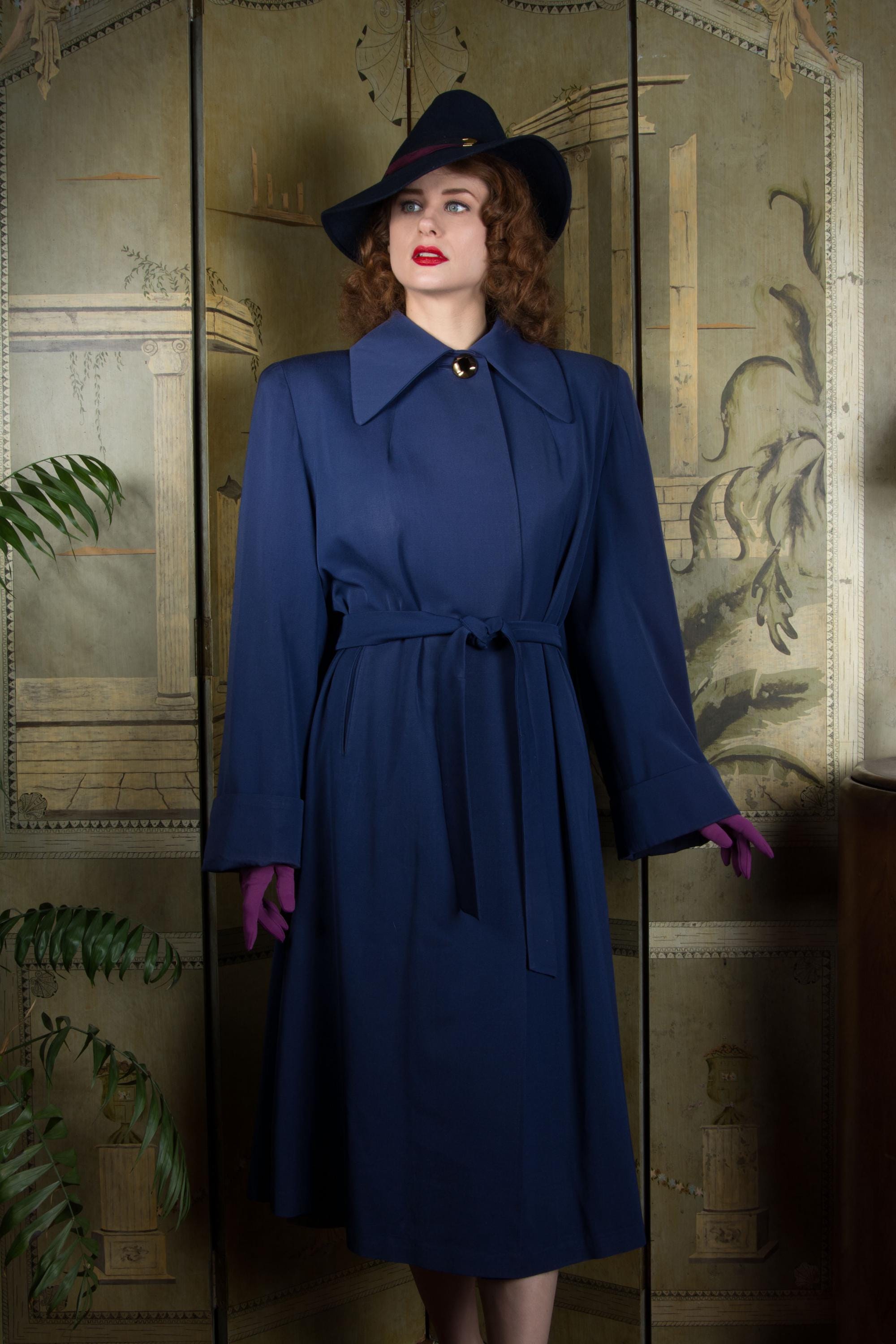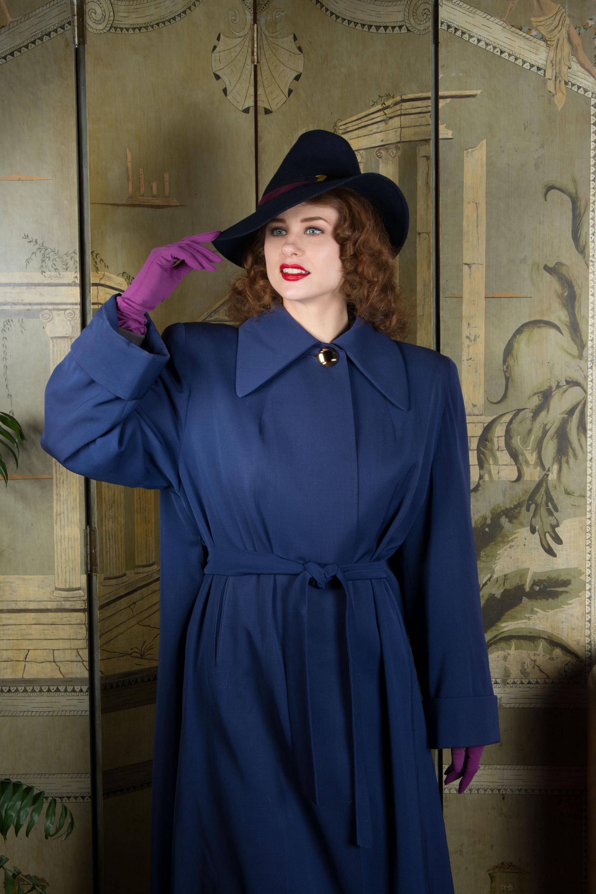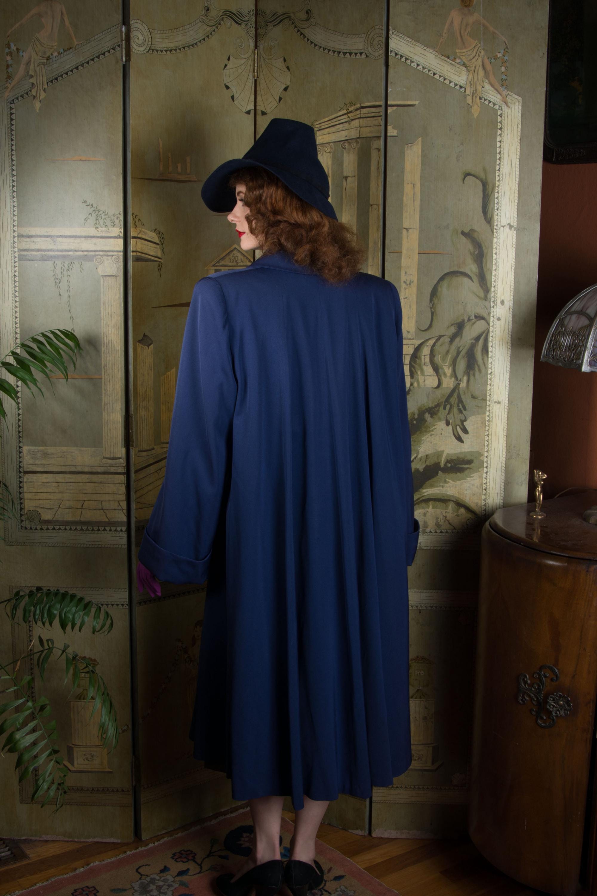 Vintage 1940s coat is absolutely stunning in beautiful, heavily draped rayon and wool blend gabardine. Its a richly saturated color, a royal navy blue. The collar is wide and the shoulders are heavily padded. The cut is overall a swing-cut shape, but this is a combination style. A matching self-fabric sash is internal at the back, and external at front, so you can cinch it in more of a trench coat look at front, leaving the back like a swinging cape. It is fully lined in blue rayon crepe