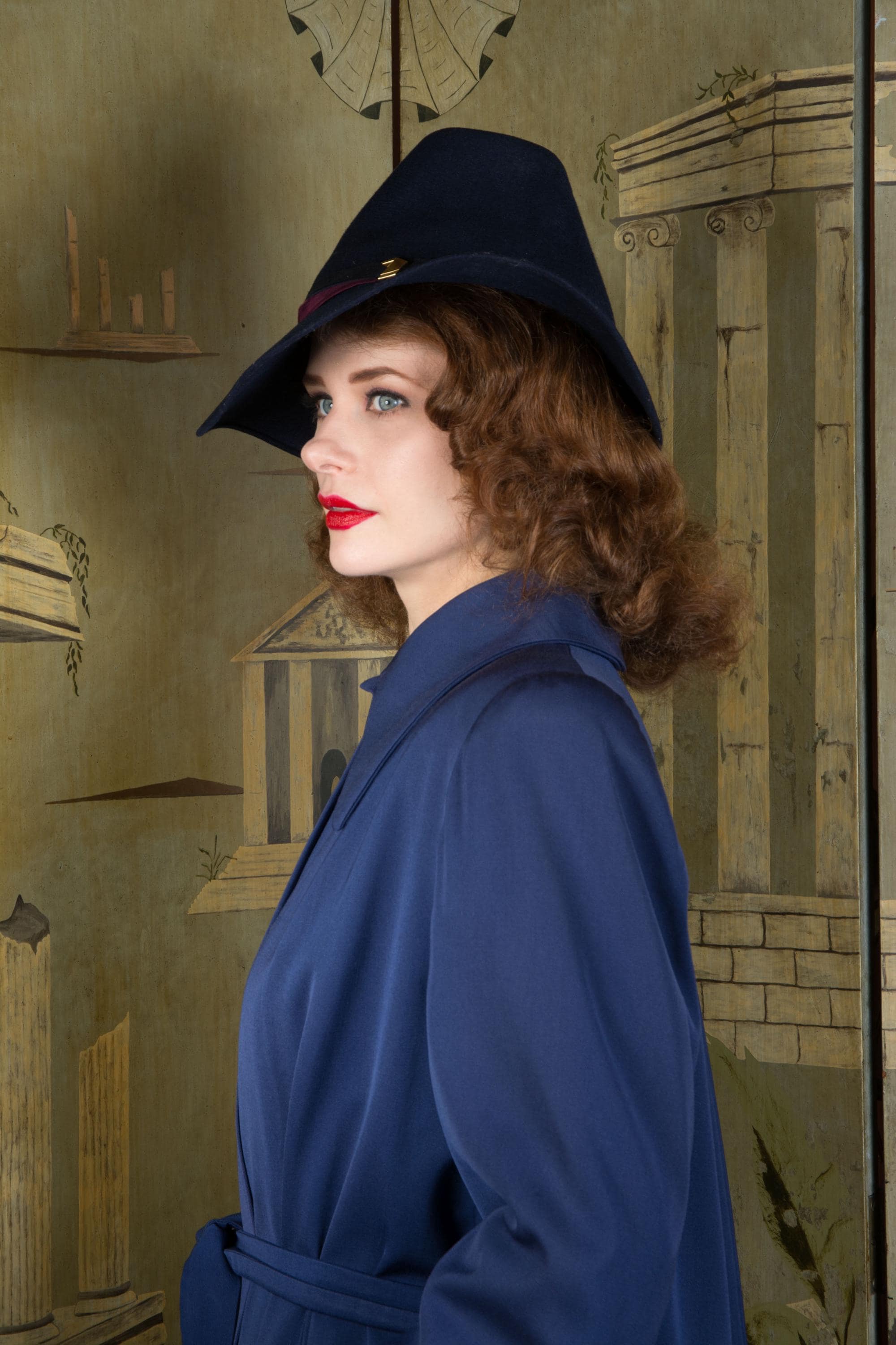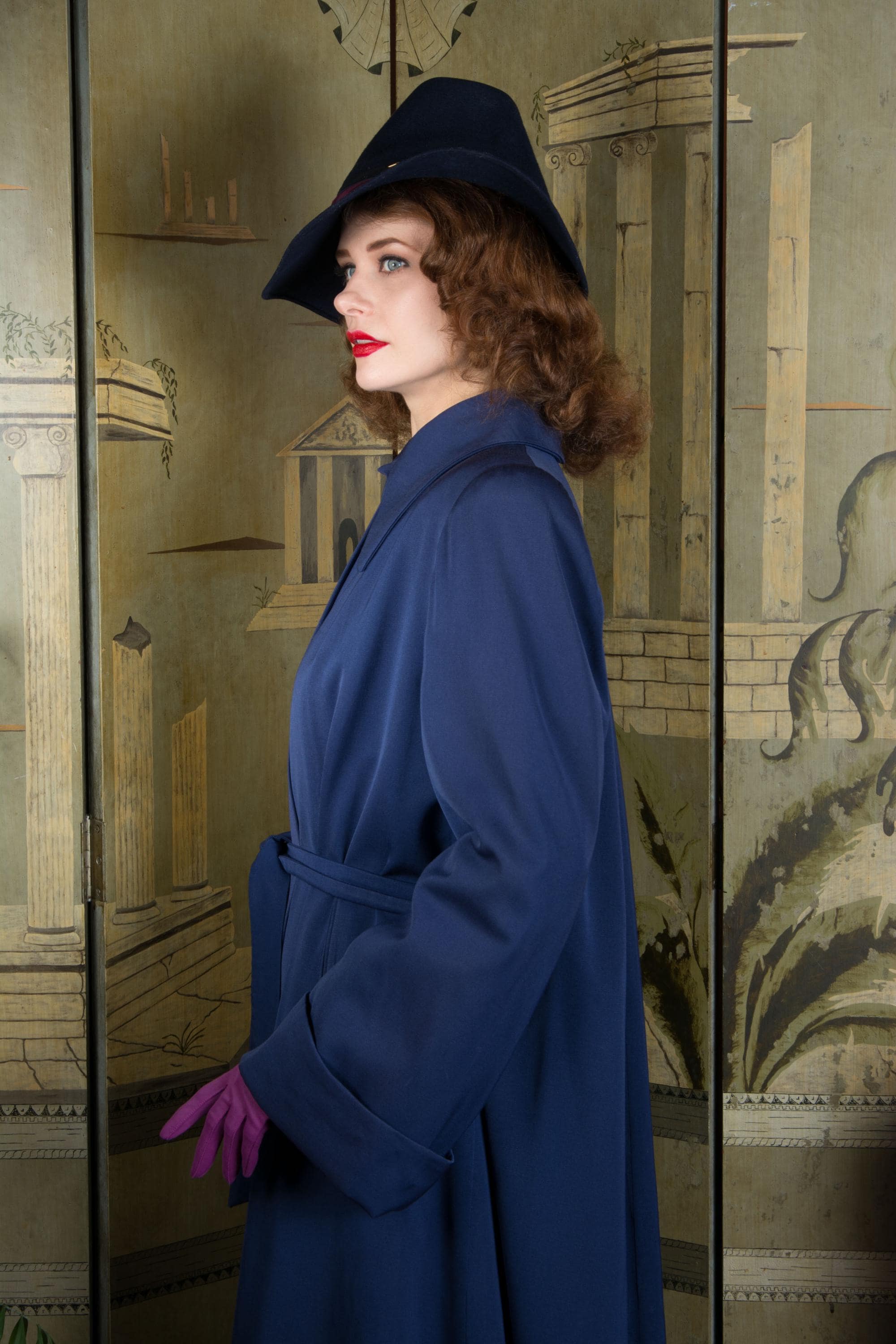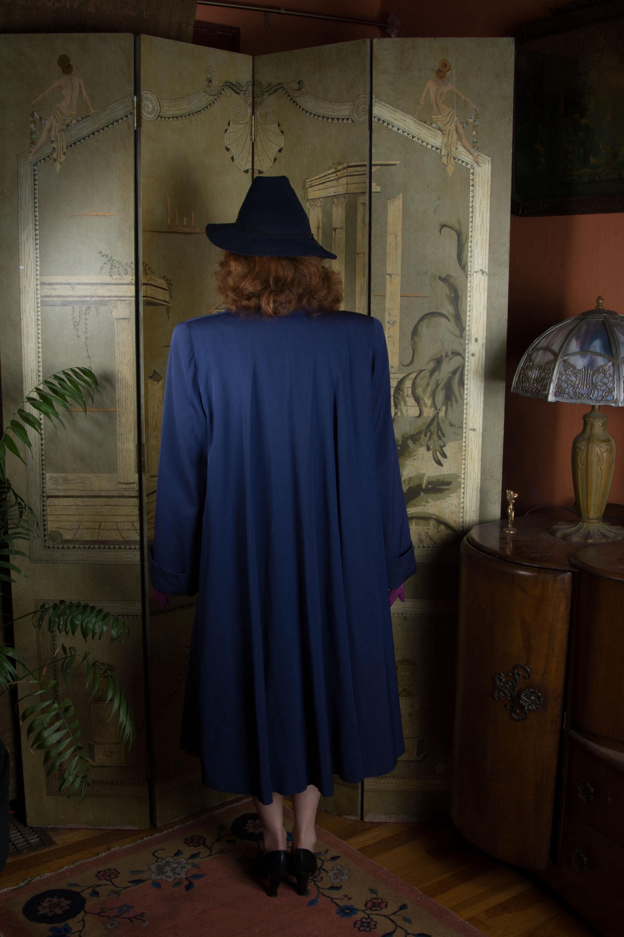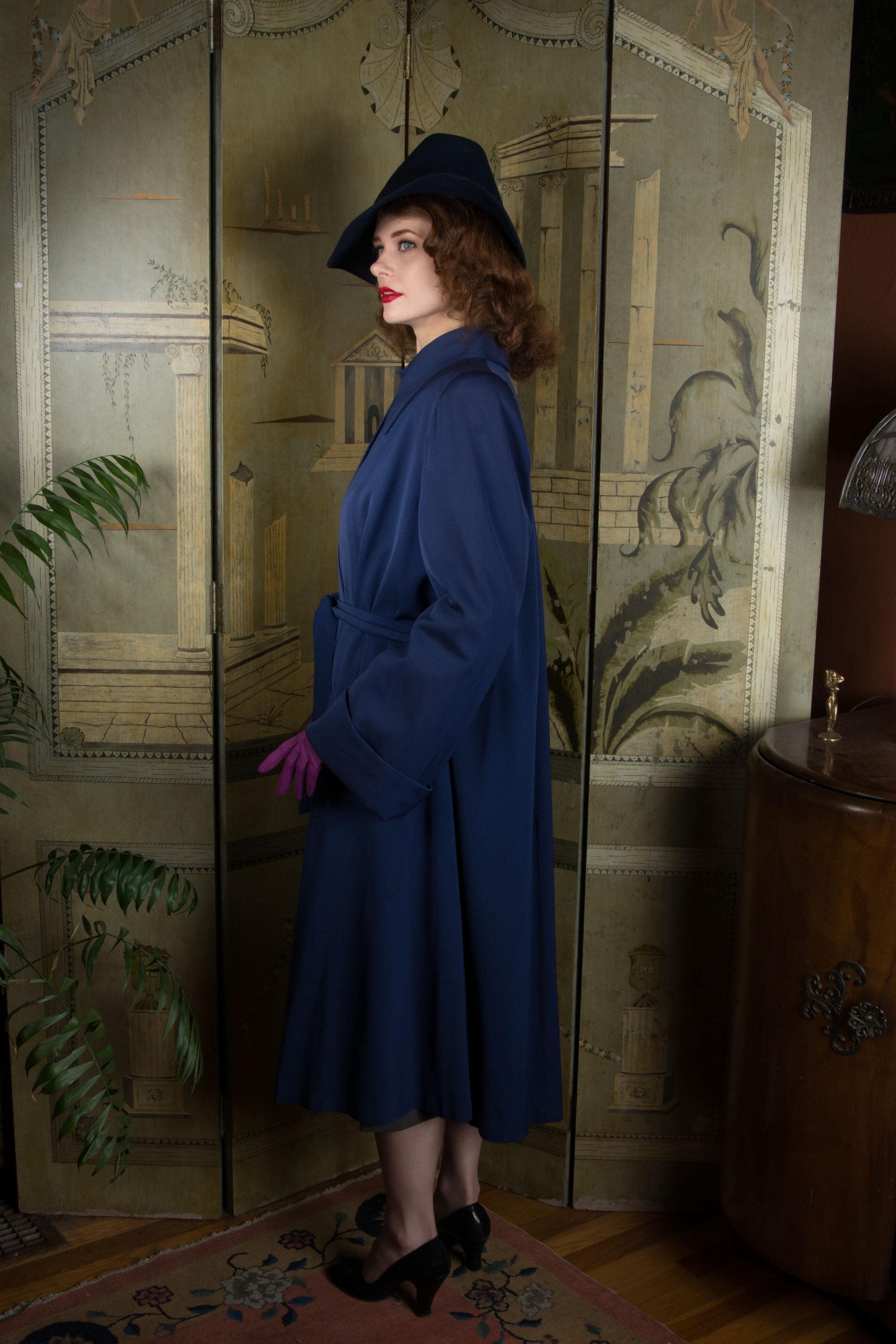 Vintage 1940s coat is absolutely stunning in beautiful, heavily draped rayon and wool blend gabardine. Its a richly saturated color, a royal navy blue. The collar is wide and the shoulders are heavily padded. The cut is overall a swing-cut shape, but this is a combination style. A matching self-fabric sash is internal at the back, and external at front, so you can cinch it in more of a trench coat look at front, leaving the back like a swinging cape. It is fully lined in blue rayon crepe