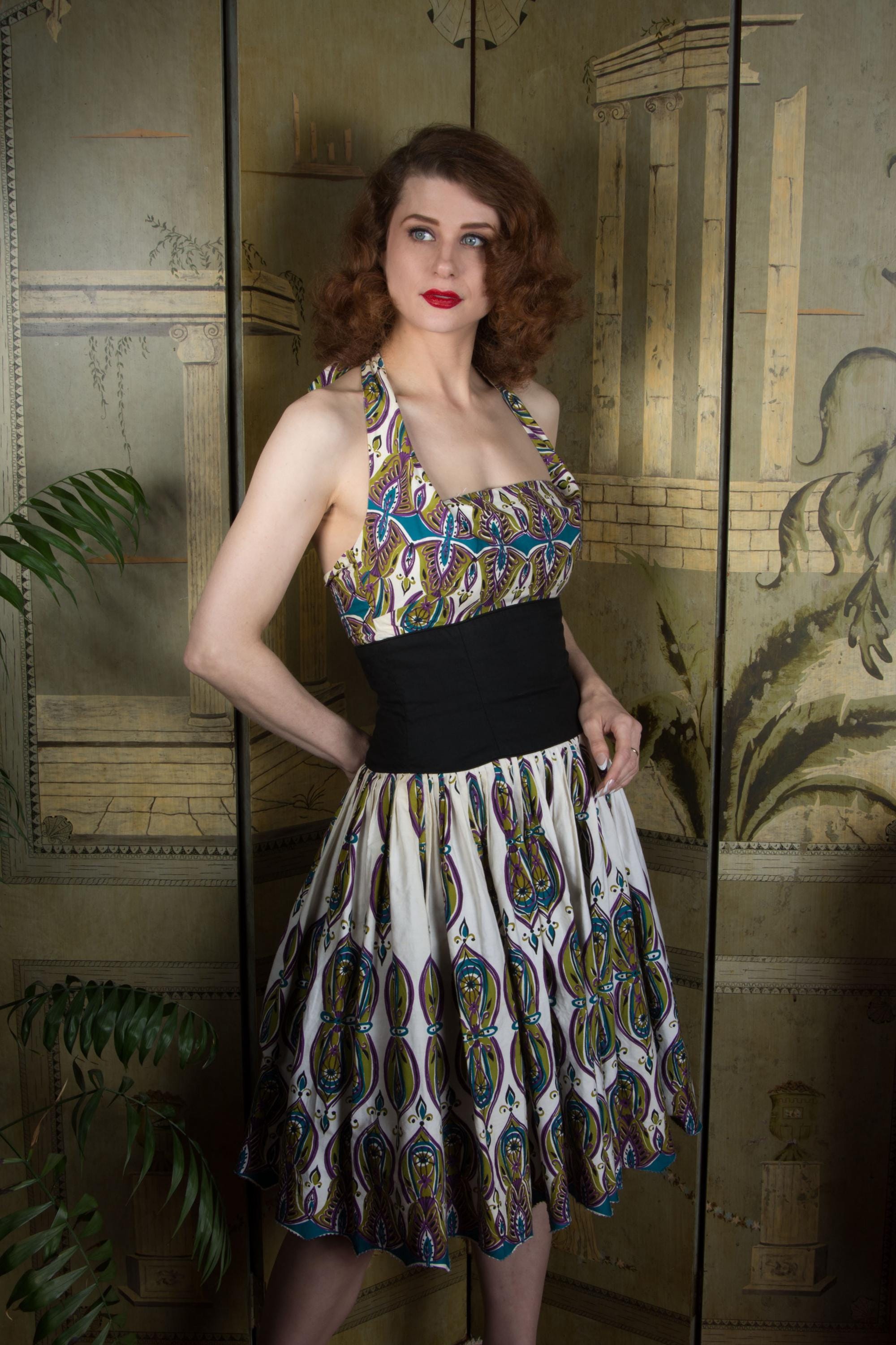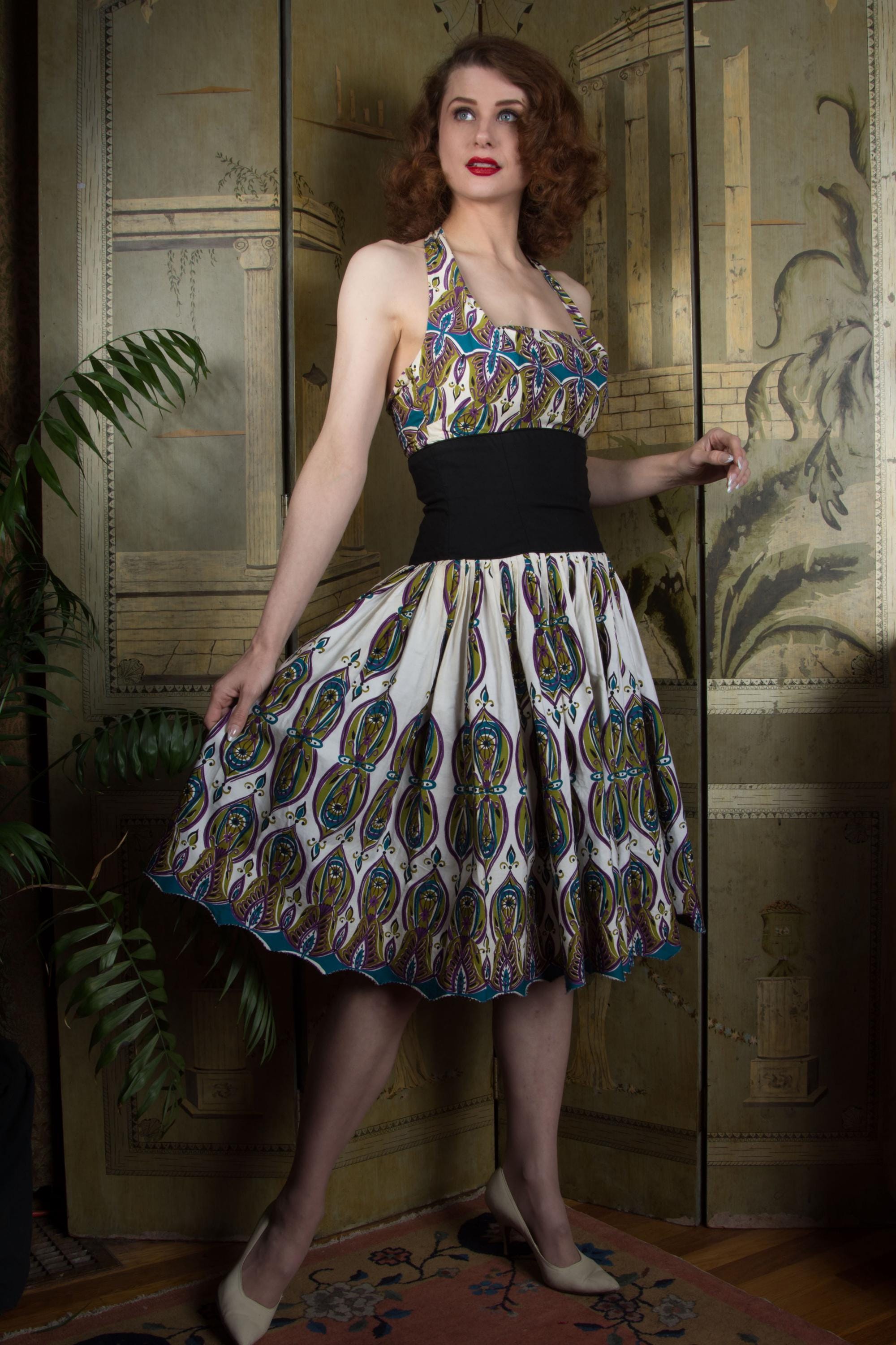 This dress is clean, sturdy and fresh. The most notable issue is the hem - someone in the past took a pair of pinking shears and cut the hem in a scallop that follows the line of the print. I think this would look great finished against a black layer to match the midwaist, but it's not a project I'll ever get around to. I washed this very gently, out of concern that the black could bleed. There's a little dinge at the top of the pleating - it is subtly, but if you fold white from near the hem to compare, it's about one shade off. The interior of the bodice and top back exterior edge are dingy, as well as the underside of the straps. These had been sewn down as traditional straps by the previous owner, but have their full length and finished ends to tie in a halter. I replaced the original elastic with fresh. It was hard to gauge the exact right length, and they could probably be shortened a little if you want an even lower fold. It is *very* sturdy and wears beautifully. Priced more gently due to hem, sigh.