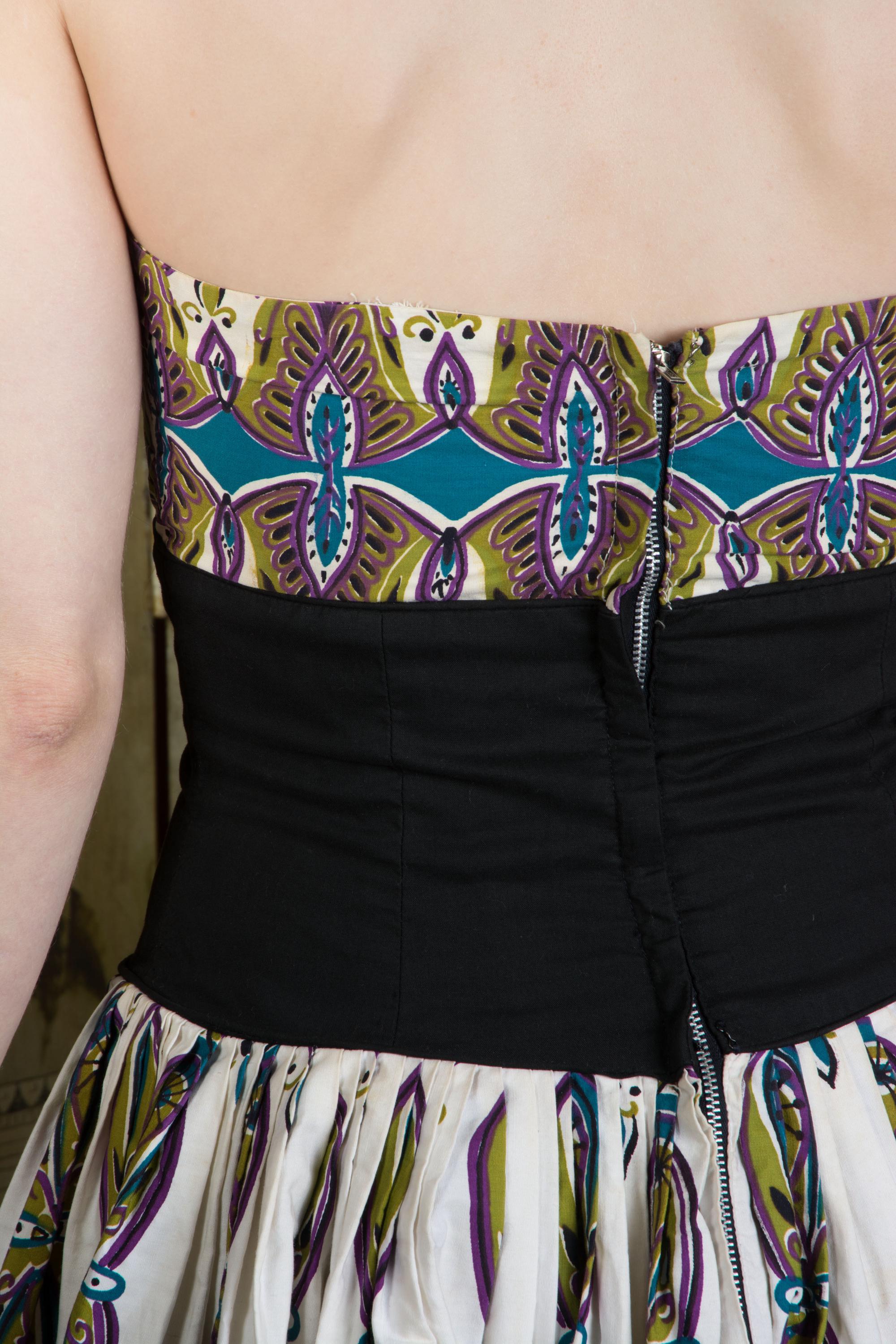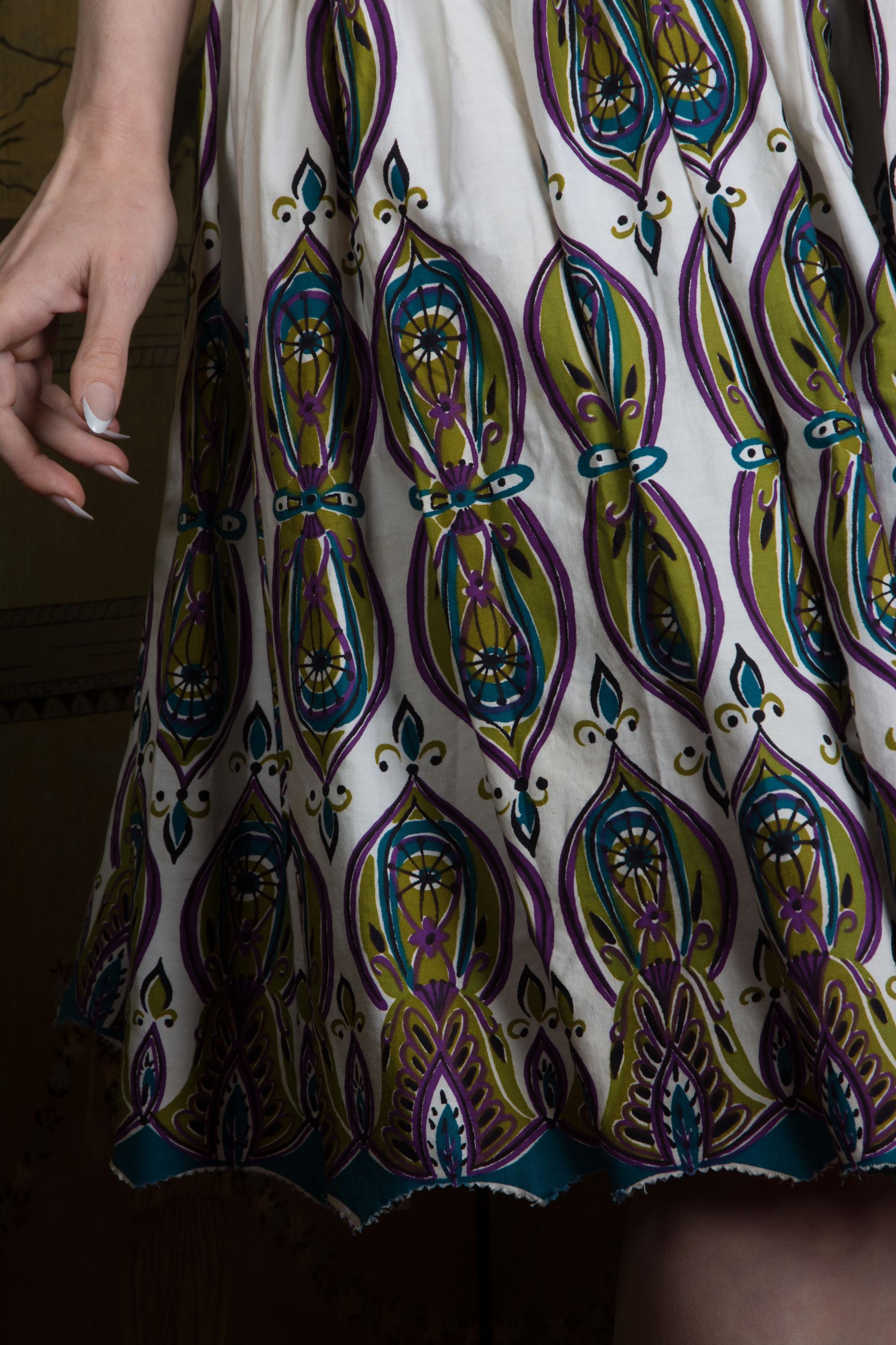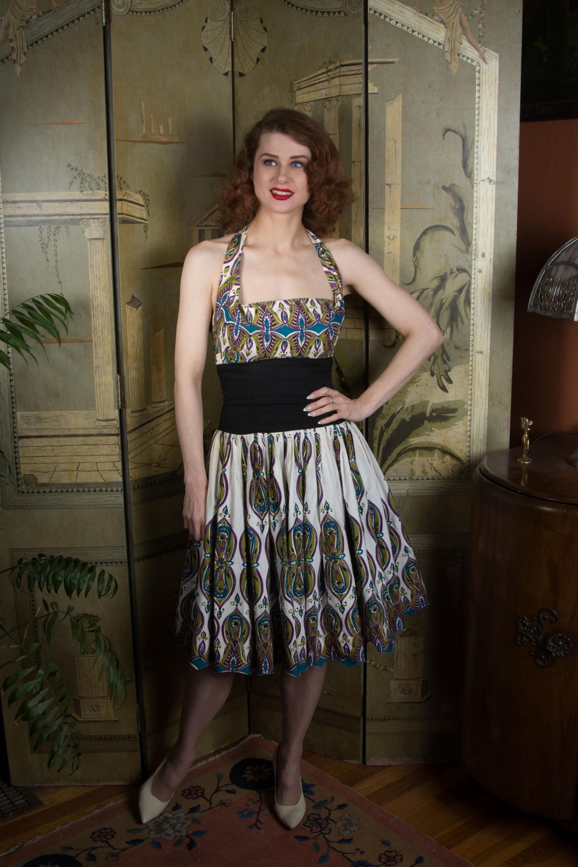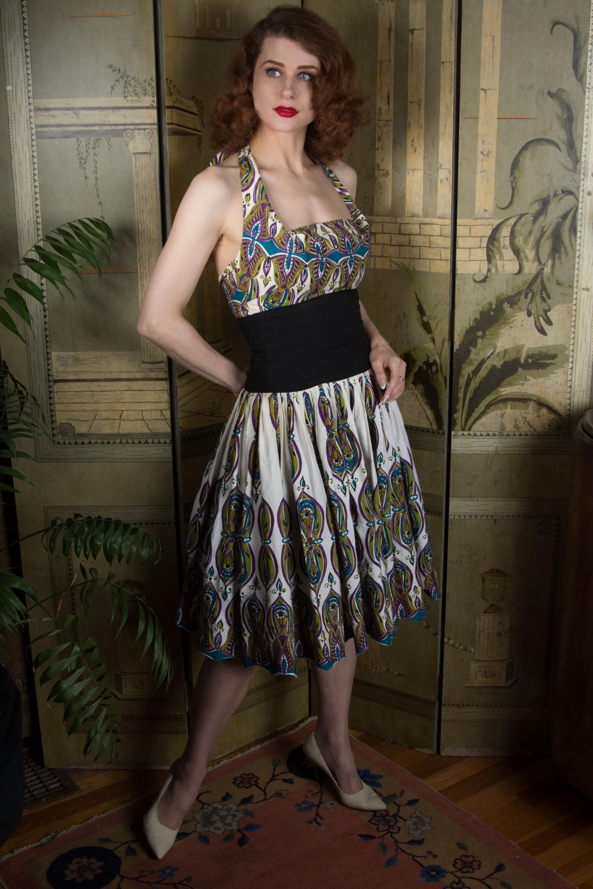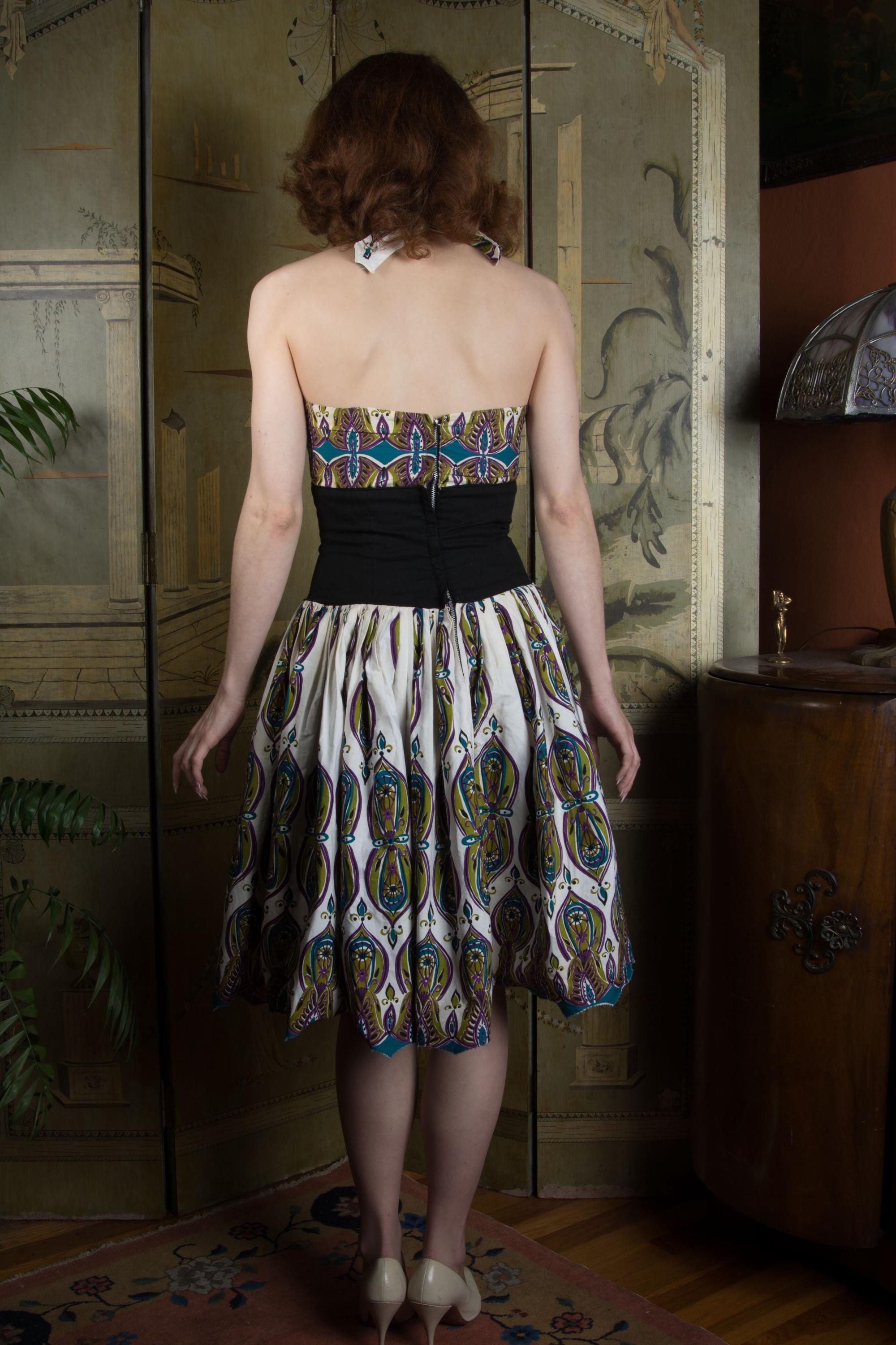 A really killer Alfred Shaheen in a print I haven't seen before! Sadly, there's no print name on the selvage. This features my favorite Shaheen bust treatment - the internal elastic bust, creating little tucked folds at the corner of the halter. The print is a later 50s MCM motif in sort of peacock hues - purple, teal, olive and black on a white ground. The midwaist is a crisp black finished with piping - this is self-lined so its firm and supportive, and totally opaque to ensure it looks REALLY black. This closes up the back with a metal zipper.