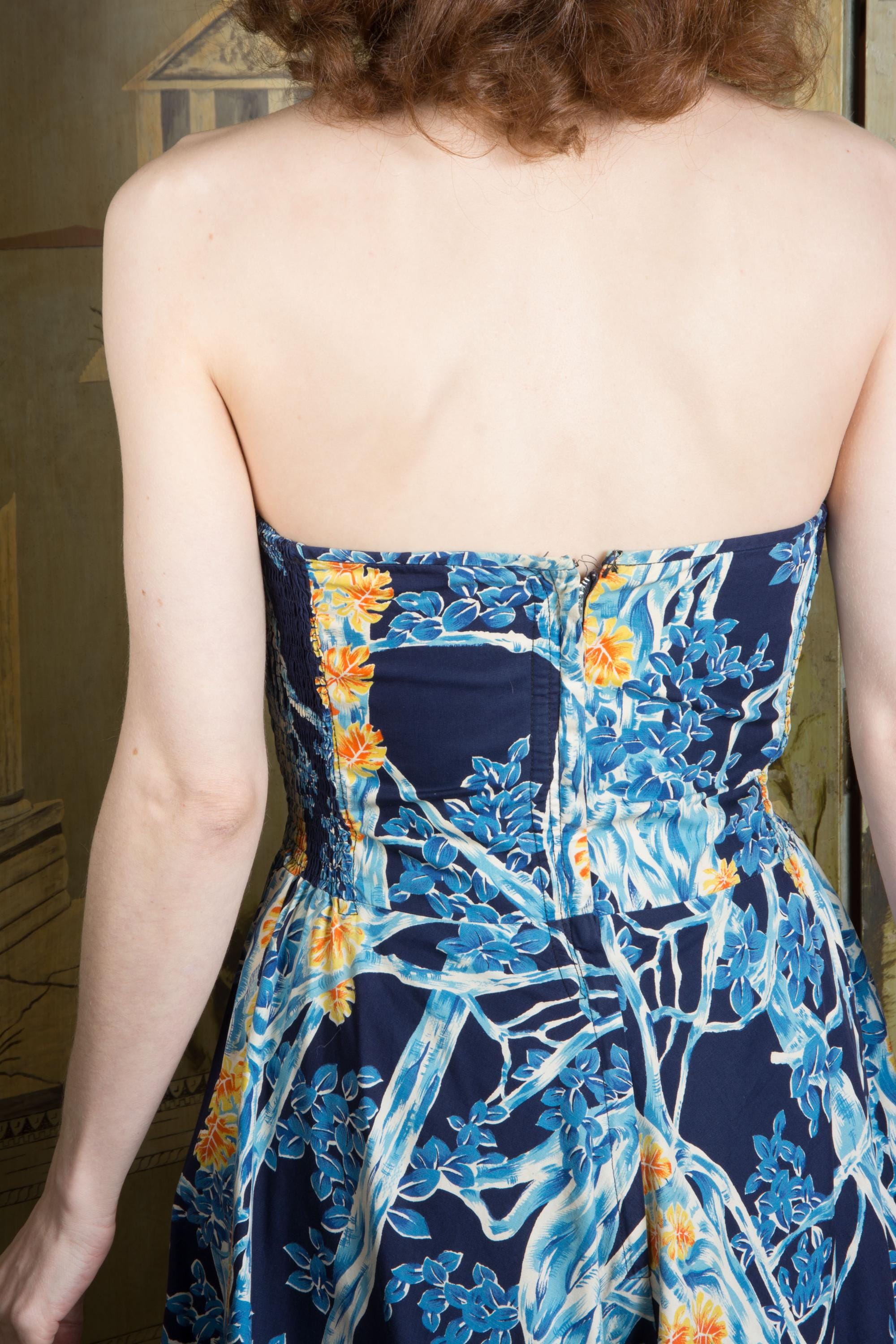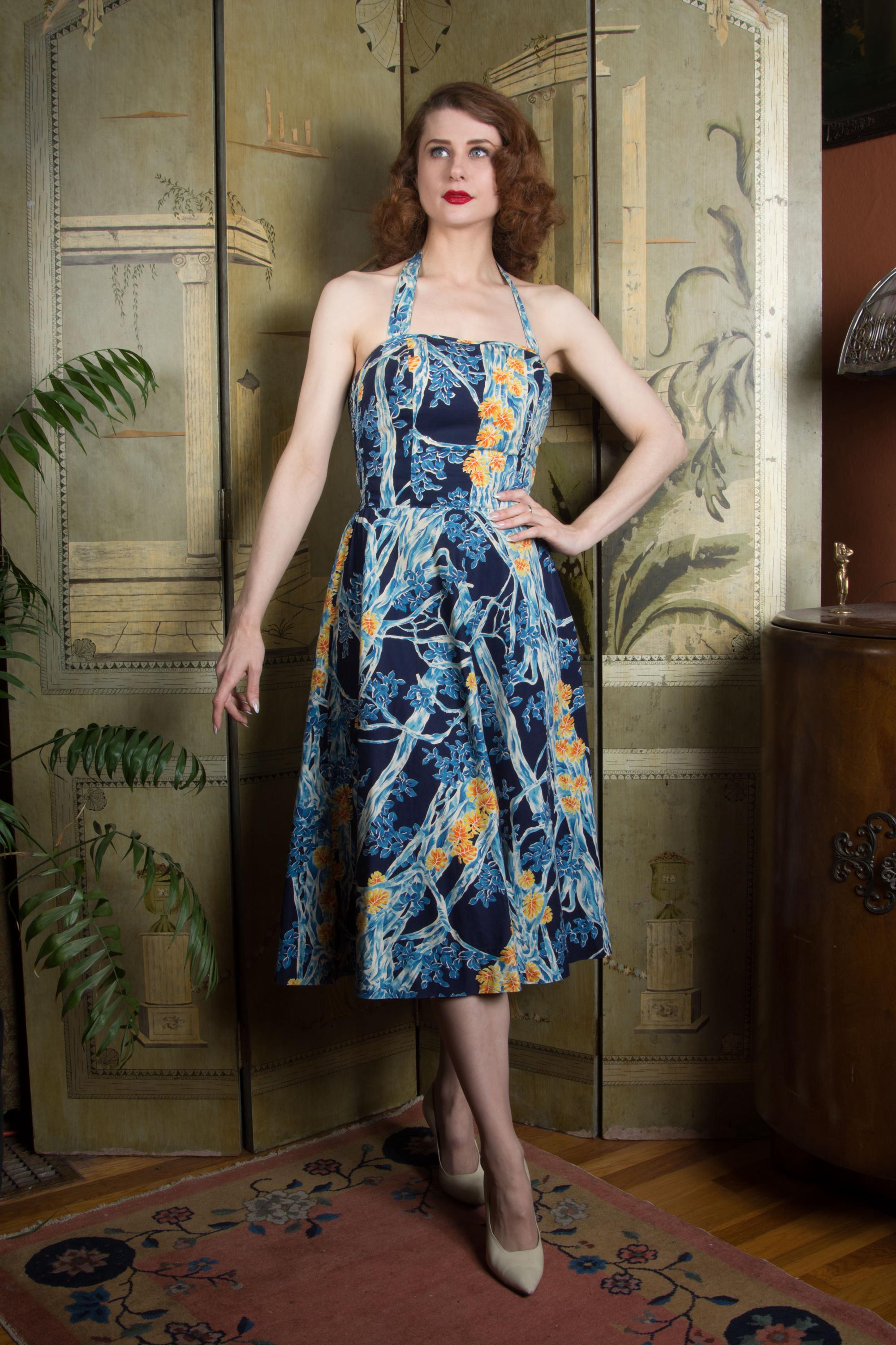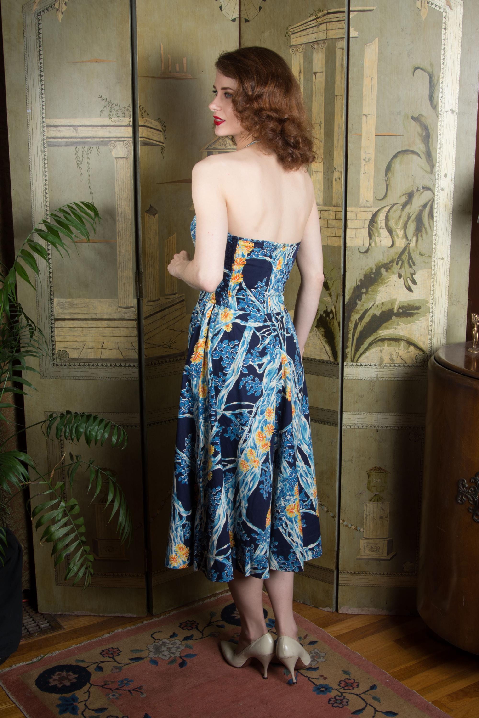 This print of this fabulous 1950s Hawaiian dress feels like the transition from autumn to winter, in the seasonal fairies scene of Fantasia. The ground is dark midnight blue. There are branches and flowers in royal and ocean blues, turquoise and white. And falling throughout are tropical fronts of orange and yellow. The bodice is lined and cotton and has four stays at the back and sides for support. The halter strap is optional buttoning inside the bust. The skirt is has some fullness but is smaller than many Hawaiians (and safer for when the wind picks up!) This dress closes up the back with a sturdy metal zipper. Tight bands of shirring at either side help adjust the fit.