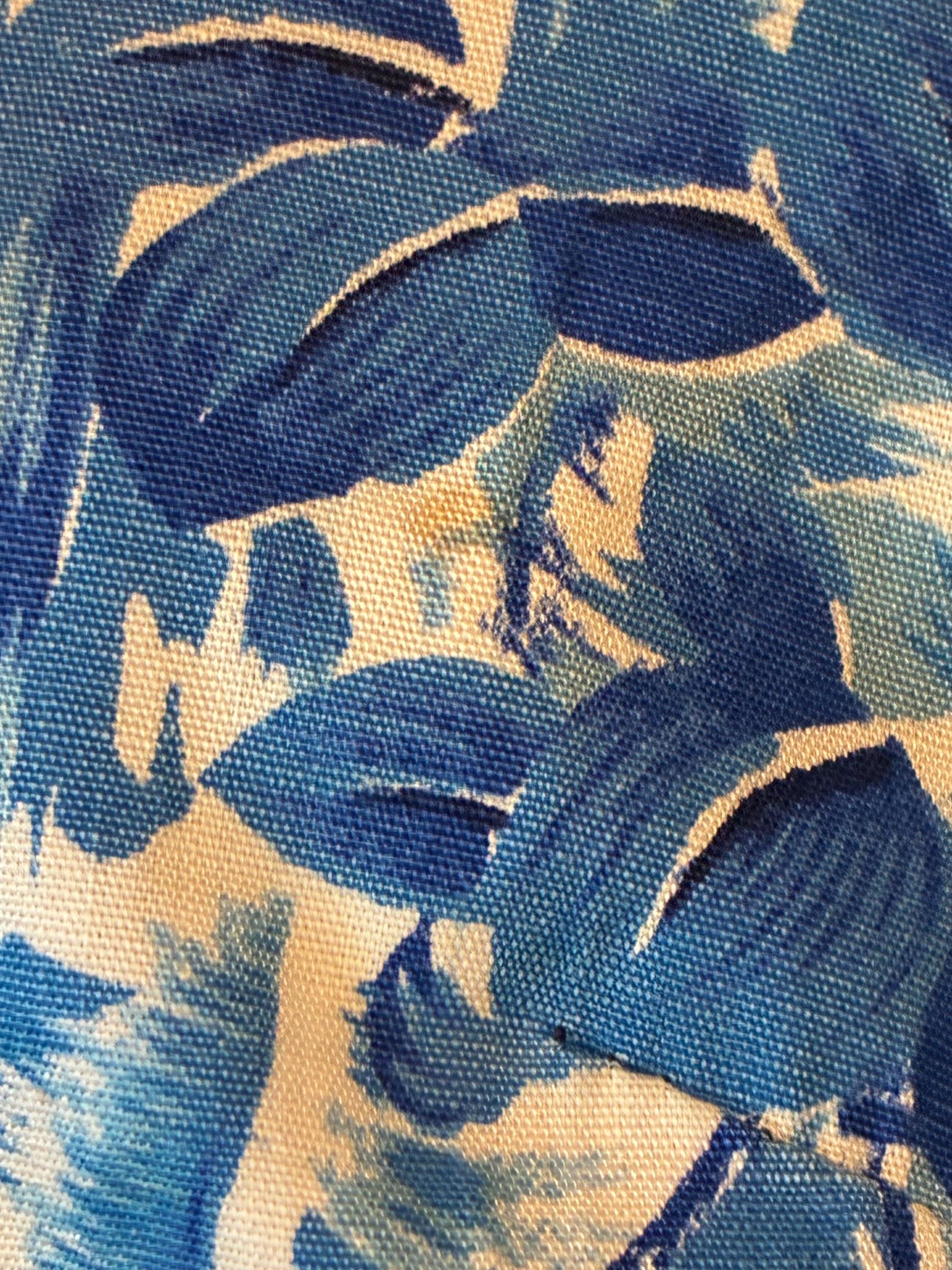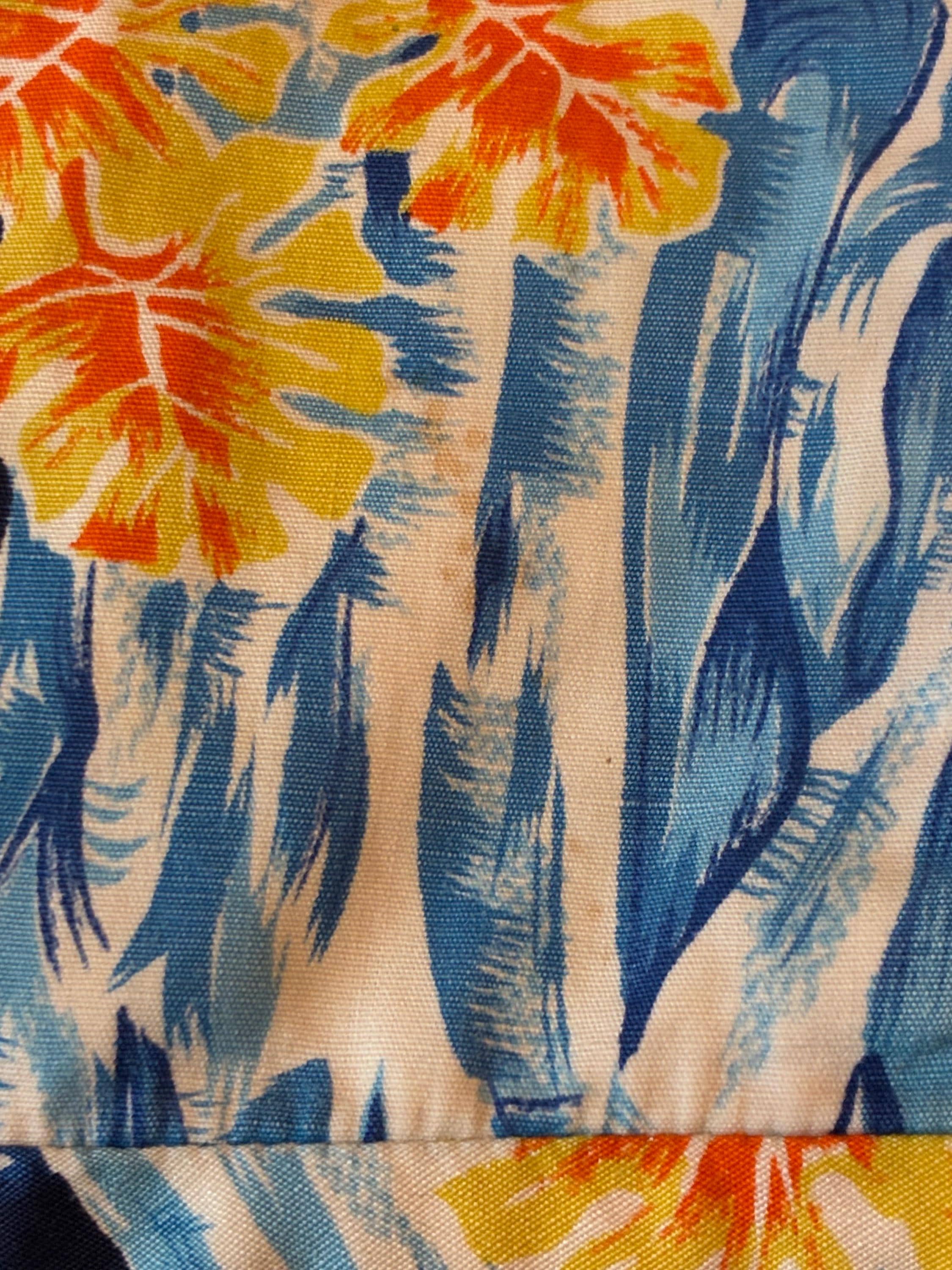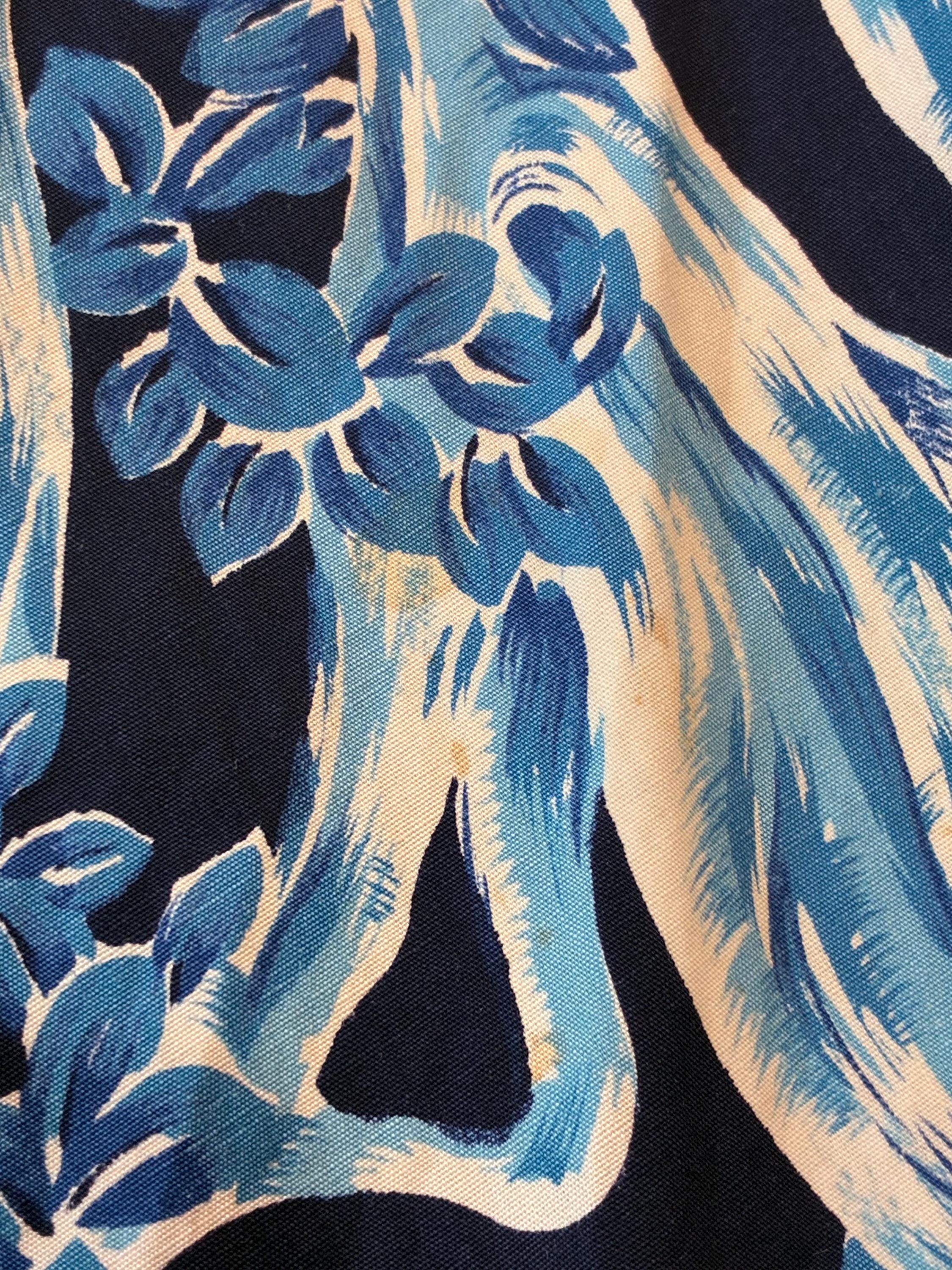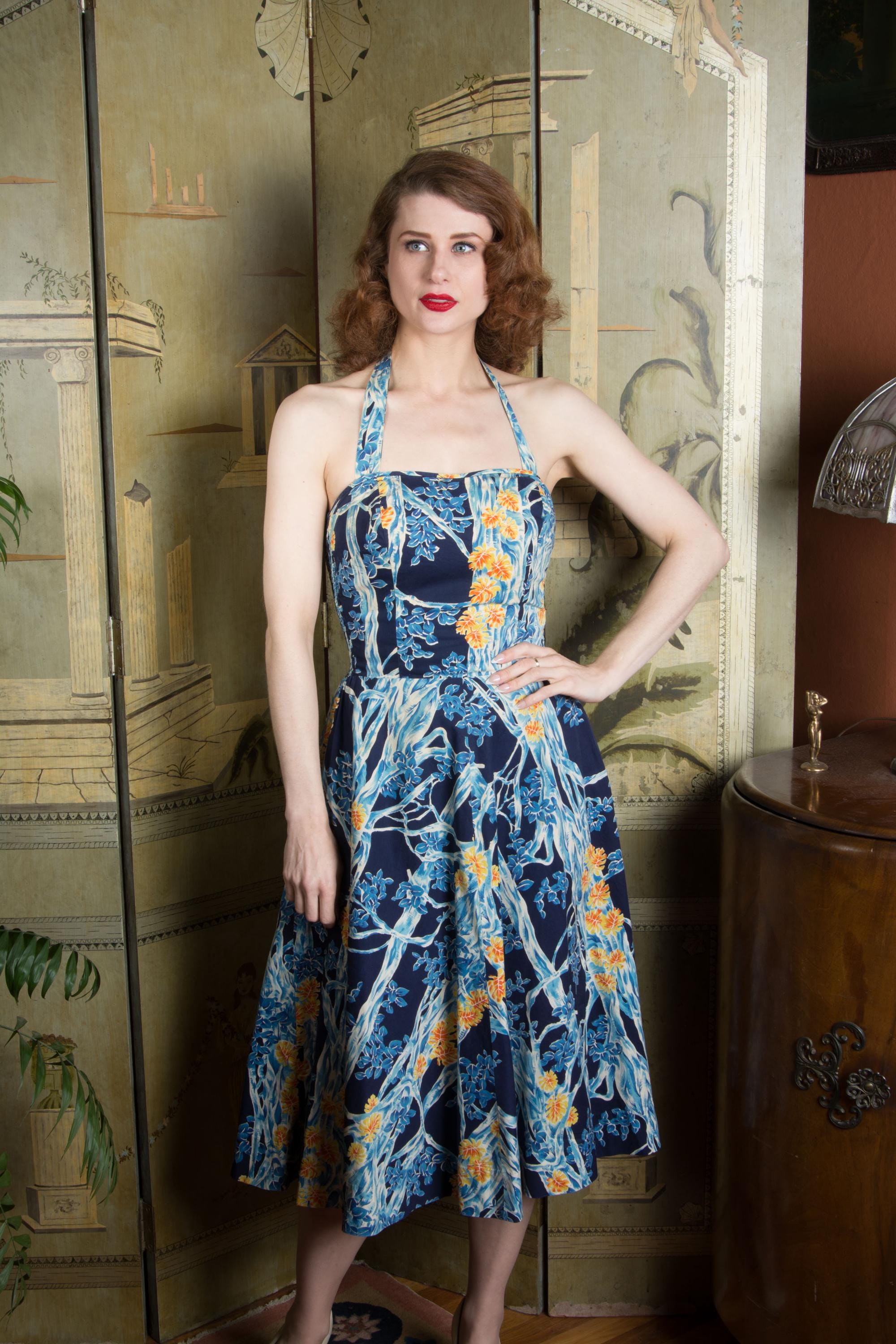 This print of this fabulous 1950s Hawaiian dress feels like the transition from autumn to winter, in the seasonal fairies scene of Fantasia. The ground is dark midnight blue. There are branches and flowers in royal and ocean blues, turquoise and white. And falling throughout are tropical fronts of orange and yellow. The bodice is lined and cotton and has four stays at the back and sides for support. The halter strap is optional buttoning inside the bust. The skirt is has some fullness but is smaller than many Hawaiians (and safer for when the wind picks up!) This dress closes up the back with a sturdy metal zipper. Tight bands of shirring at either side help adjust the fit.