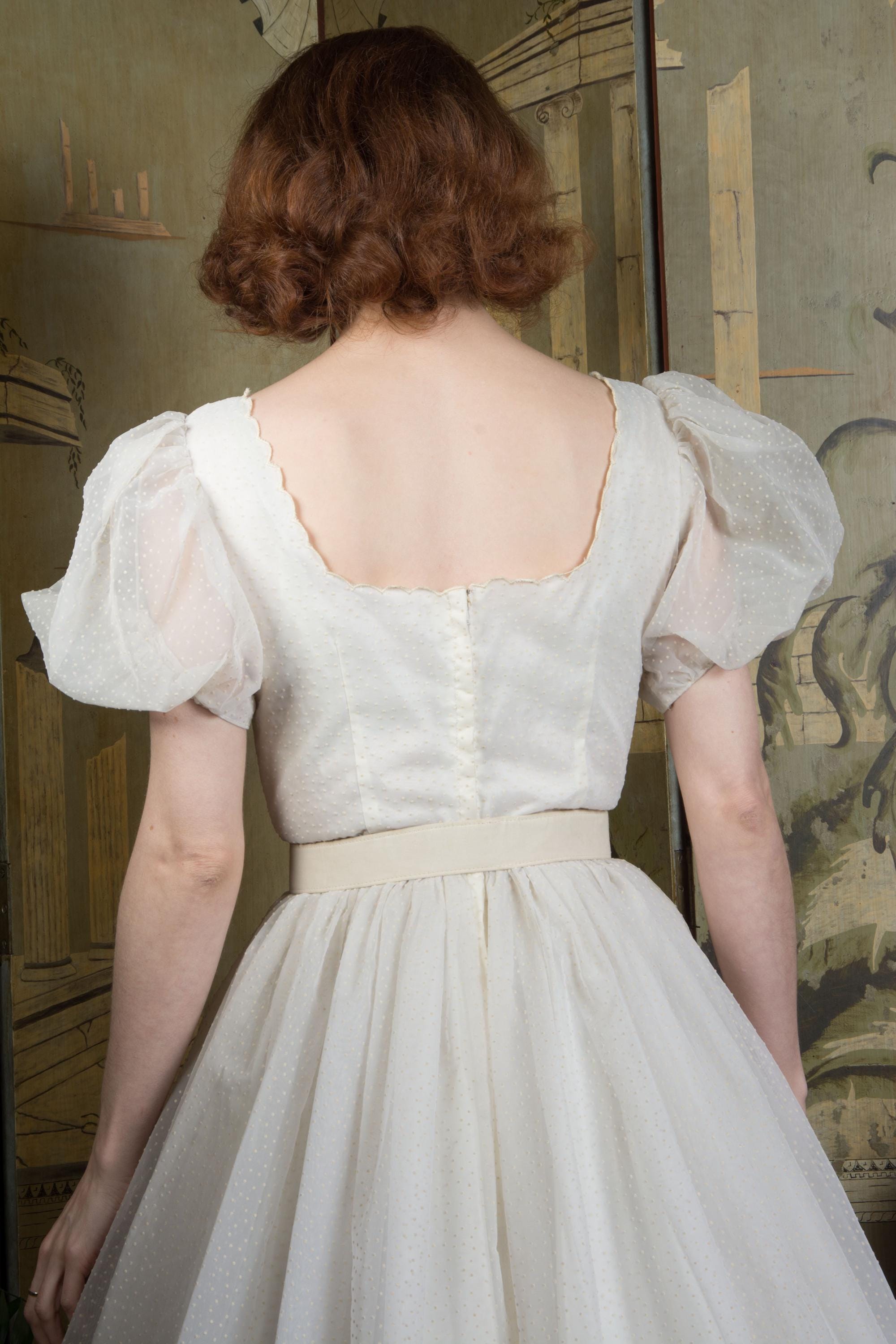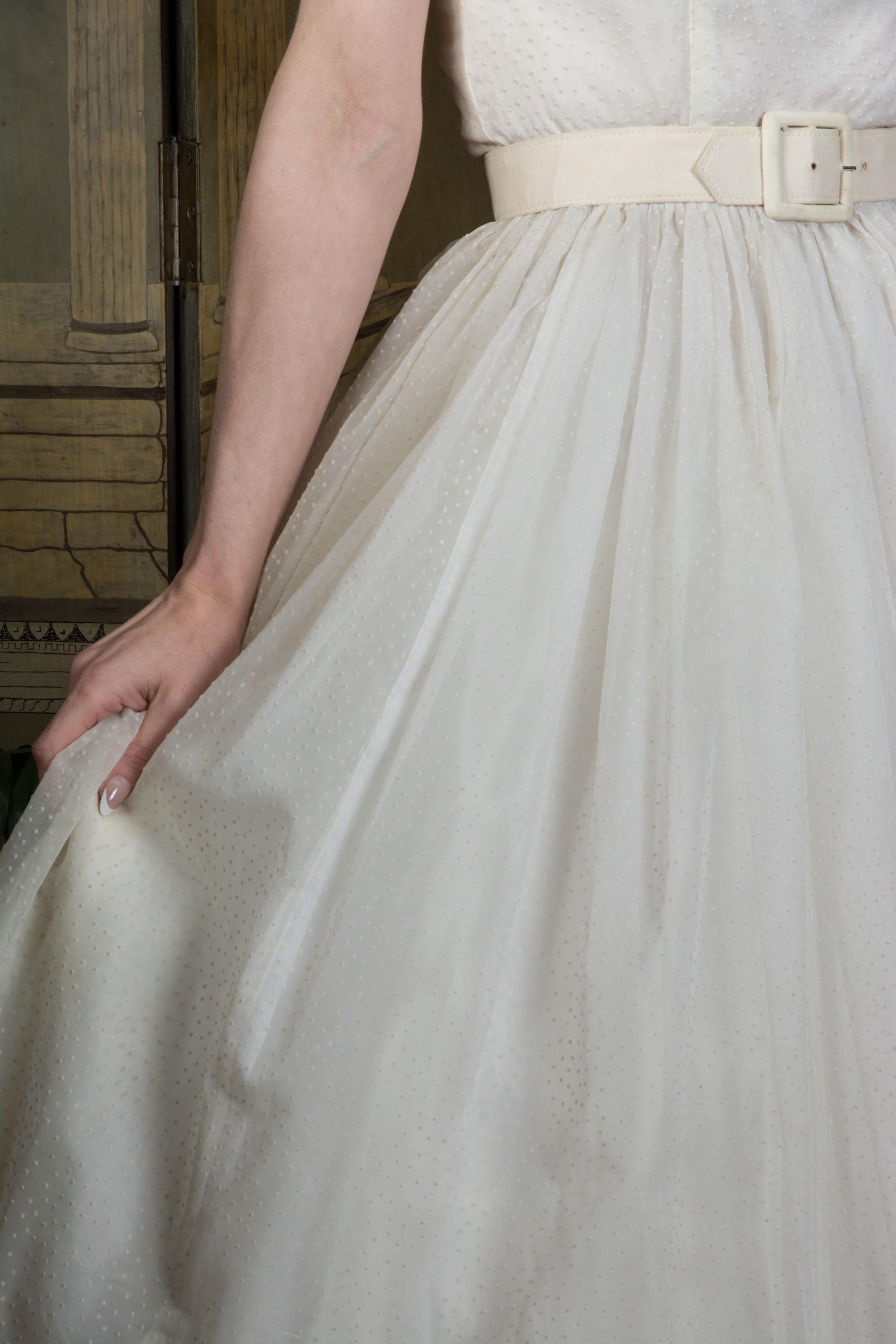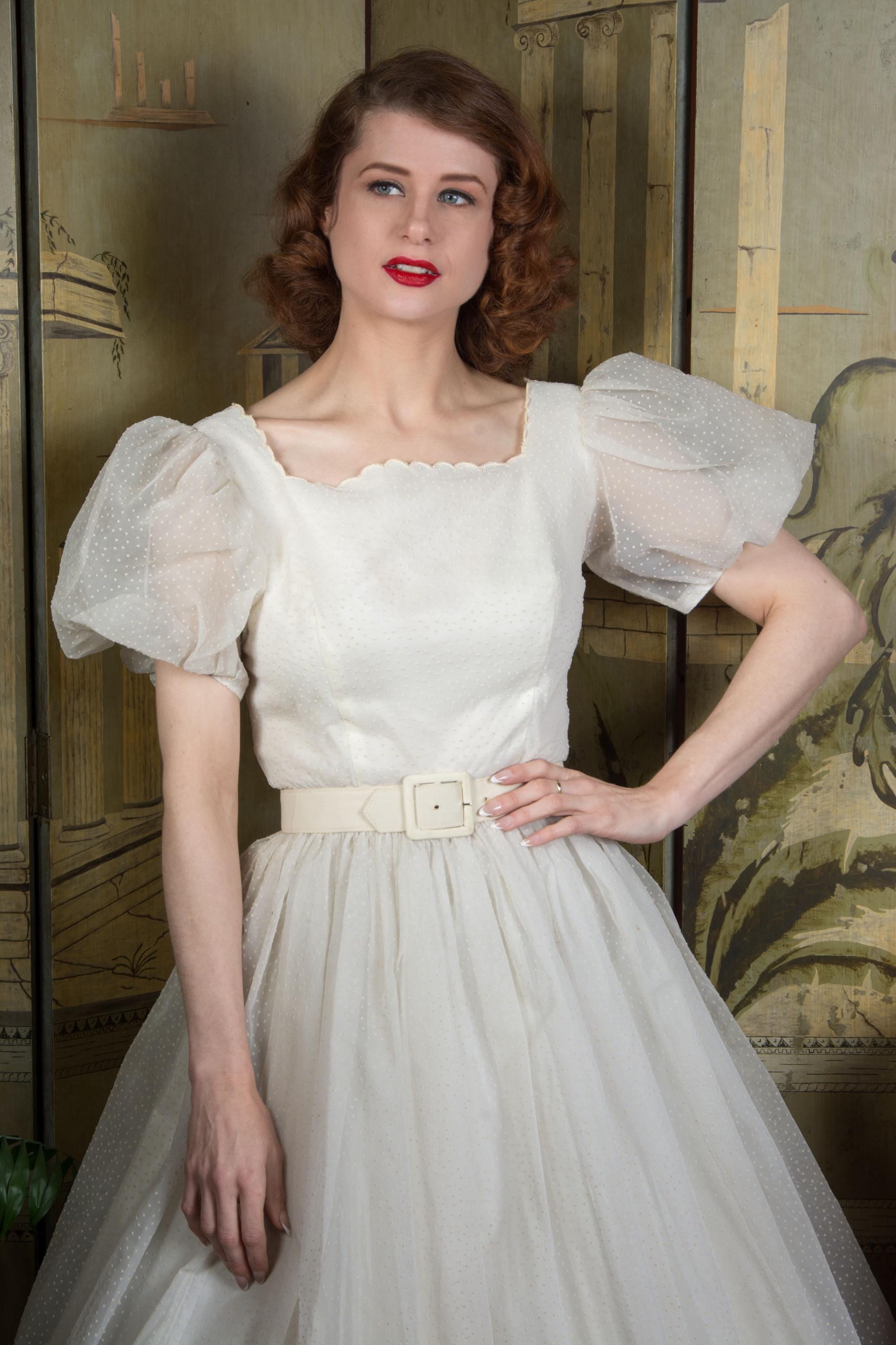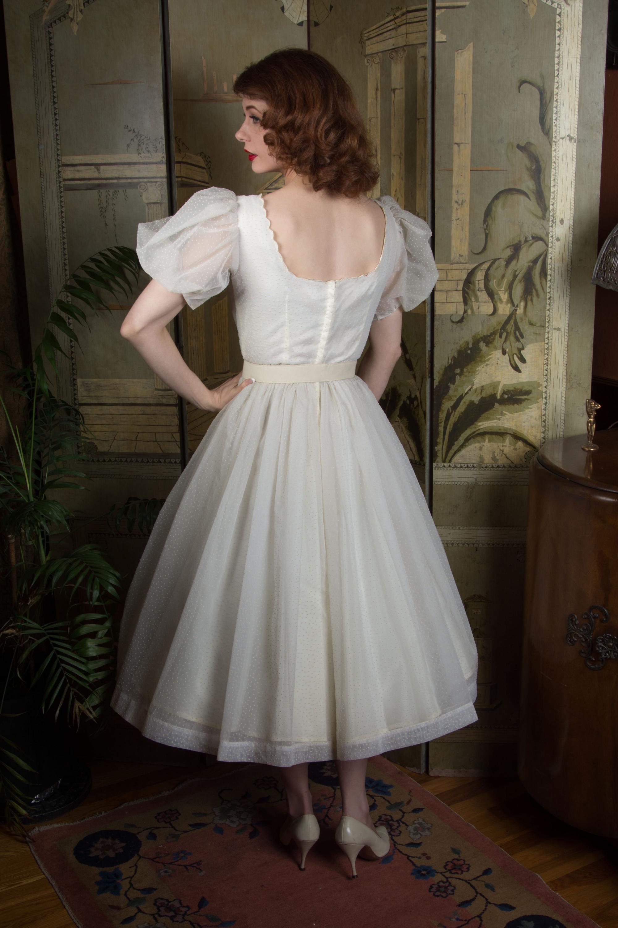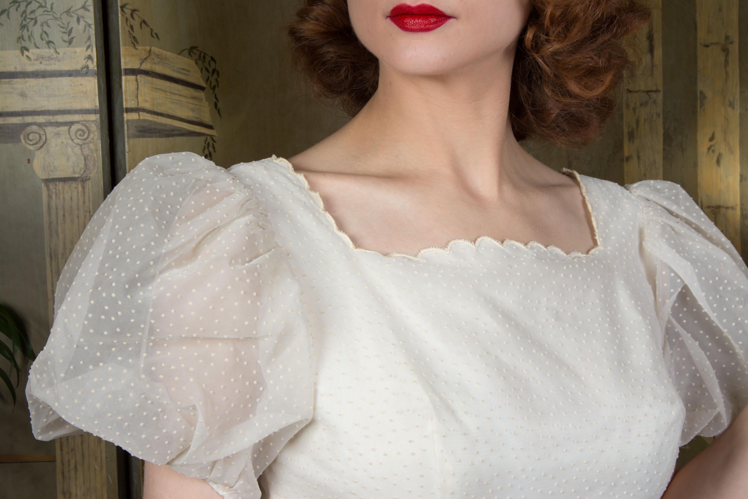 A fluffy and sweet vintage 1950s cupcake of a dress, in a less common textile than tulle. This features a curving, scalloped trimmed neckline. The exterior layer is a semi sheer nylon chiffon, crisp and floating, all flocked with little swiss dots. This makes delightfully puffed, sheer short sleeves. The dress is fitted to the waist with a fully skirt. It is lined with an ivory acetate. This closes at the back with a sturdy metal zipper.