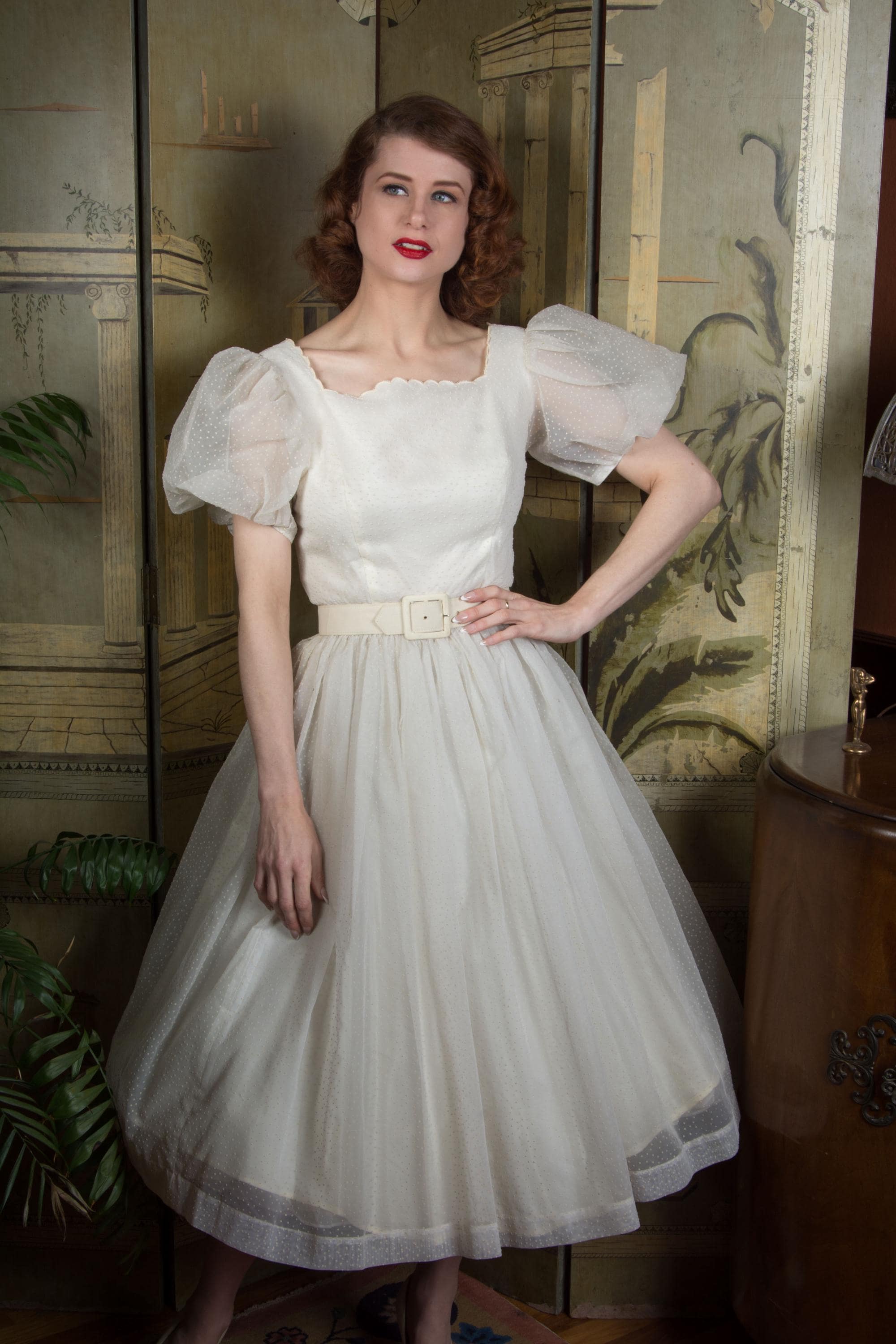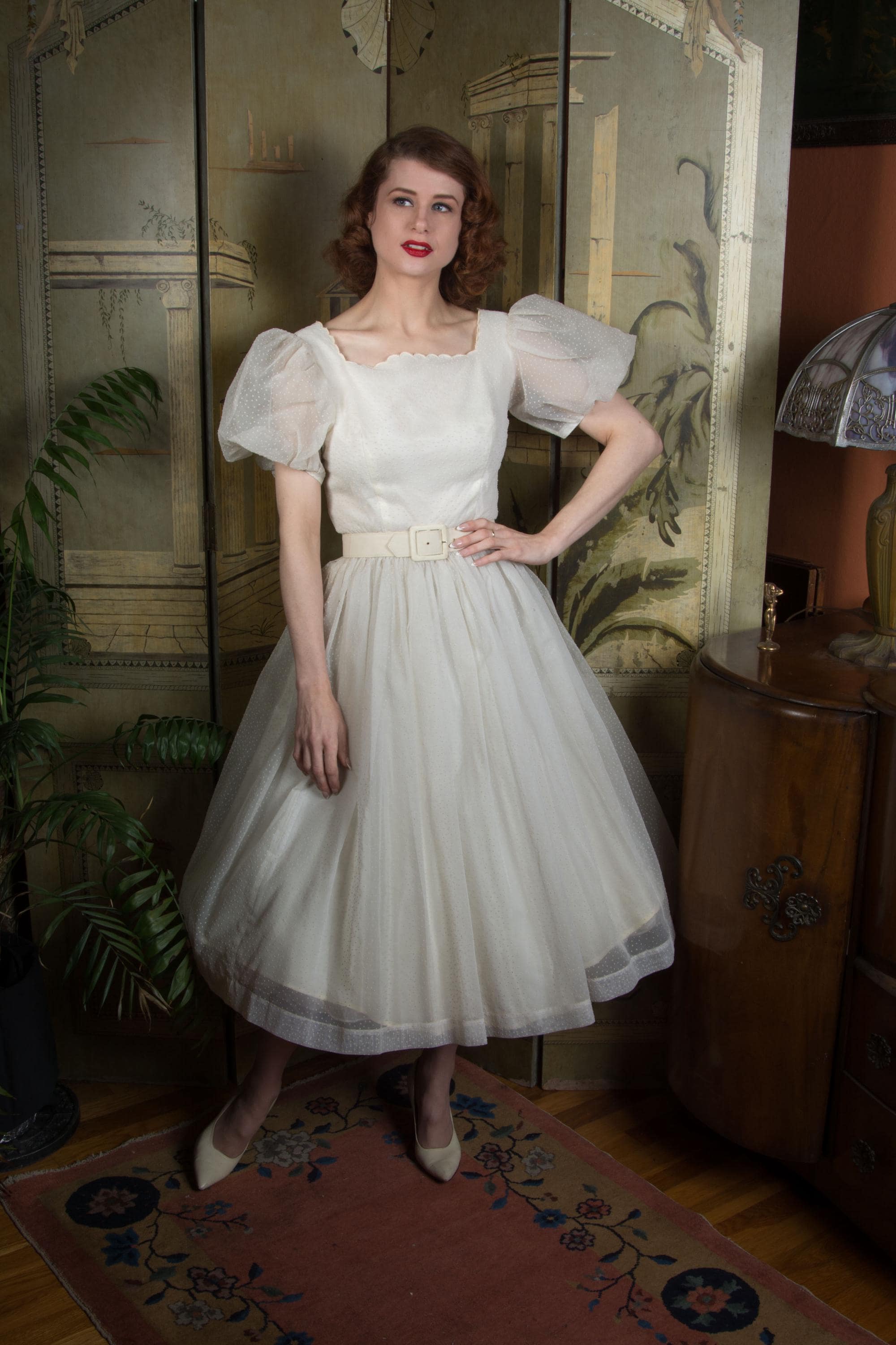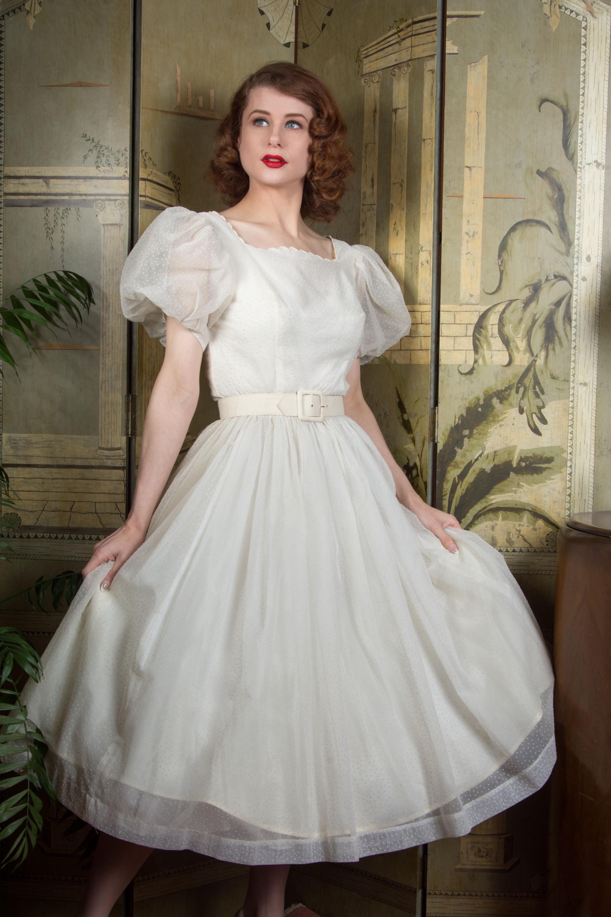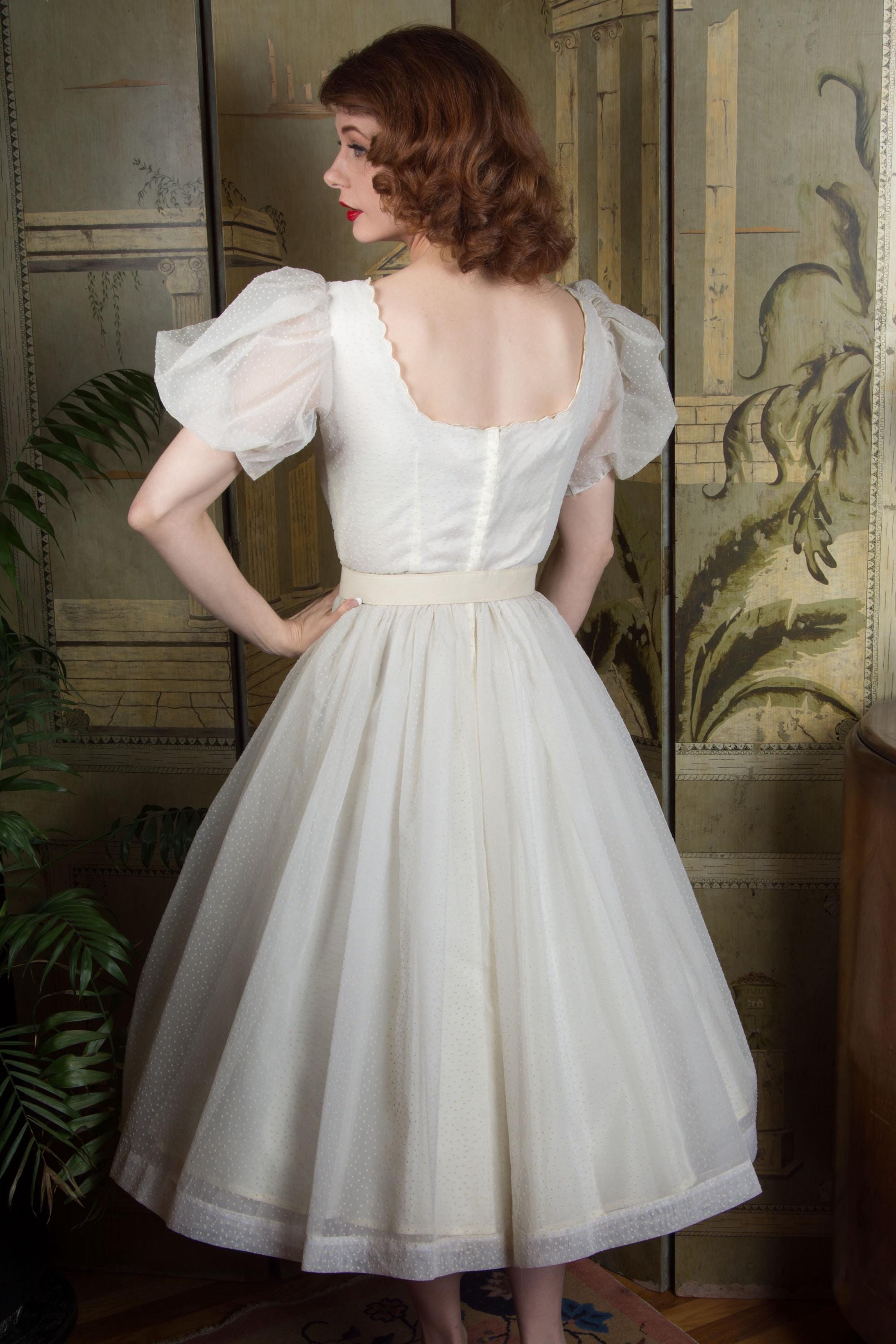 A fluffy and sweet vintage 1950s cupcake of a dress, in a less common textile than tulle. This features a curving, scalloped trimmed neckline. The exterior layer is a semi sheer nylon chiffon, crisp and floating, all flocked with little swiss dots. This makes delightfully puffed, sheer short sleeves. The dress is fitted to the waist with a fully skirt. It is lined with an ivory acetate. This closes at the back with a sturdy metal zipper.