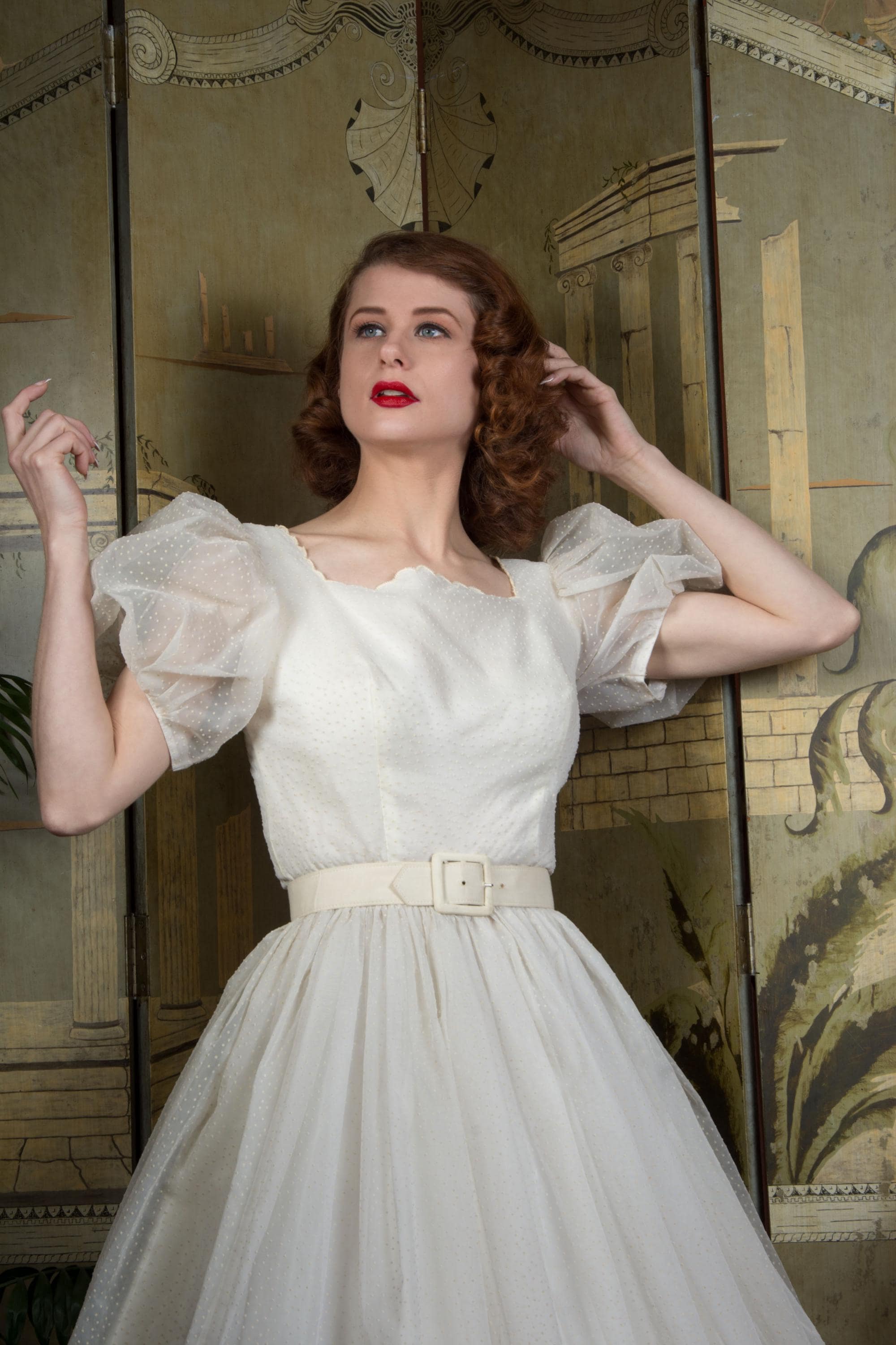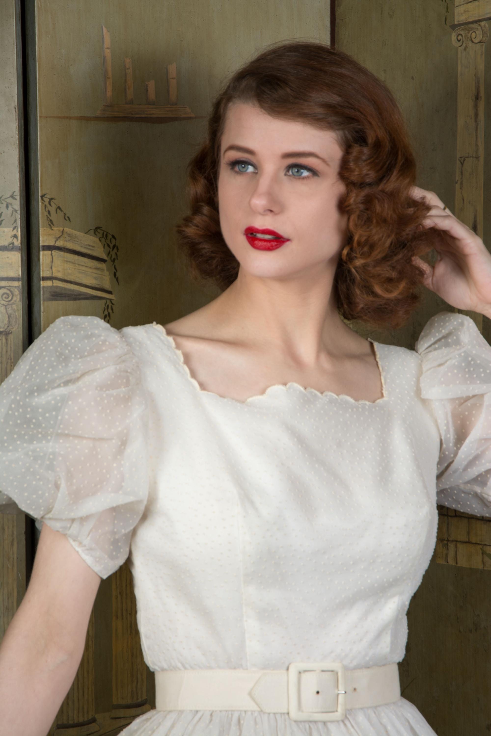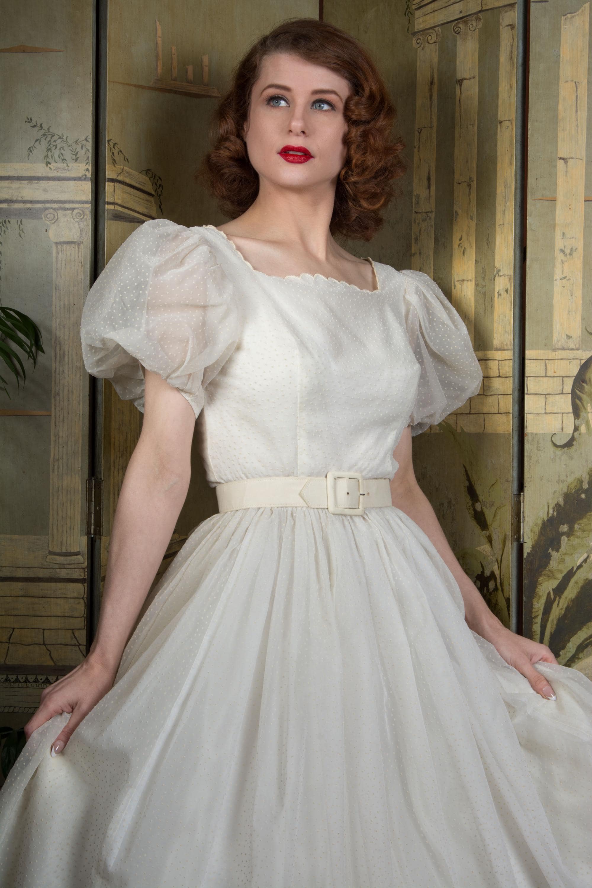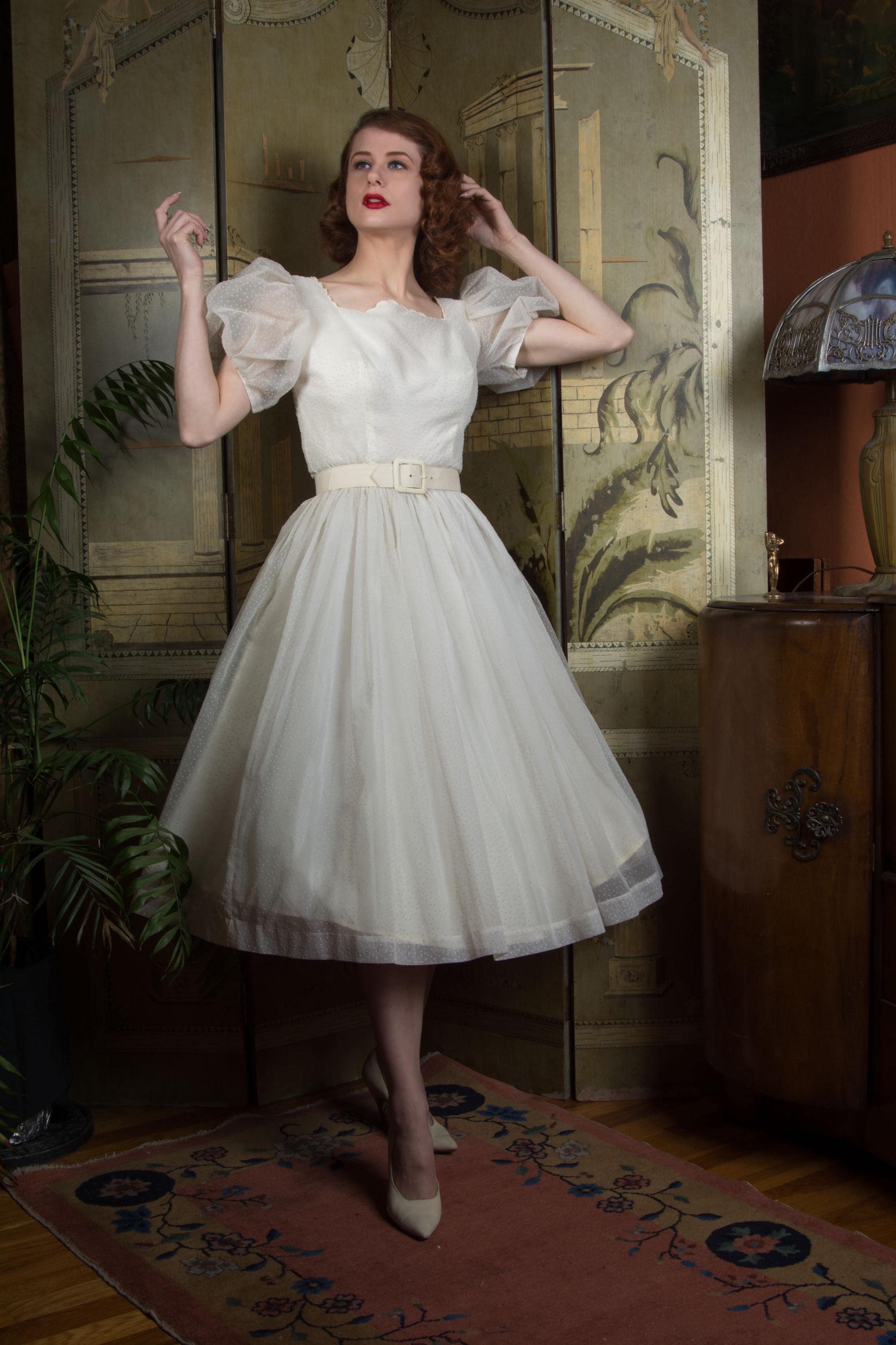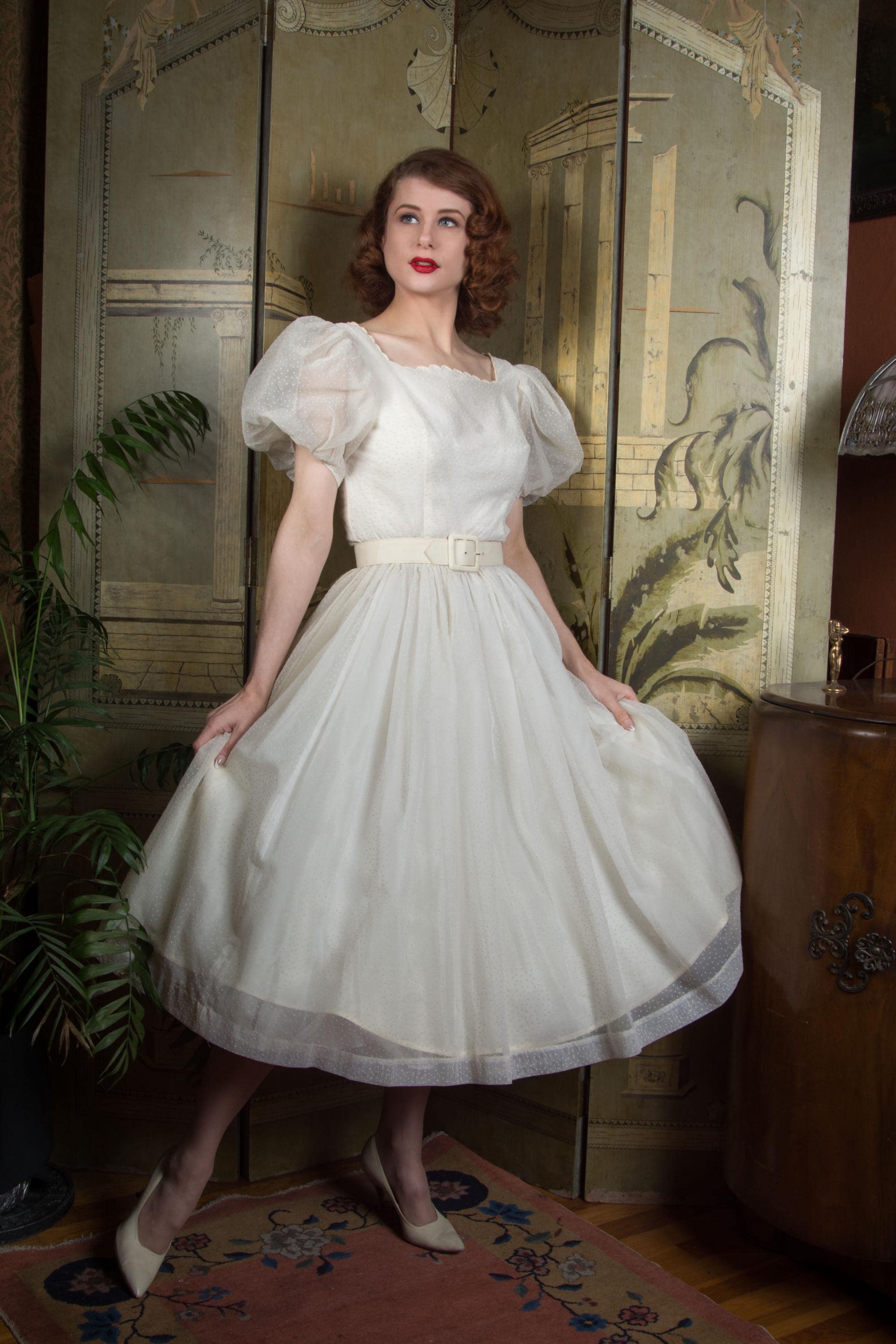 A fluffy and sweet vintage 1950s cupcake of a dress, in a less common textile than tulle. This features a curving, scalloped trimmed neckline. The exterior layer is a semi sheer nylon chiffon, crisp and floating, all flocked with little swiss dots. This makes delightfully puffed, sheer short sleeves. The dress is fitted to the waist with a fully skirt. It is lined with an ivory acetate. This closes at the back with a sturdy metal zipper.