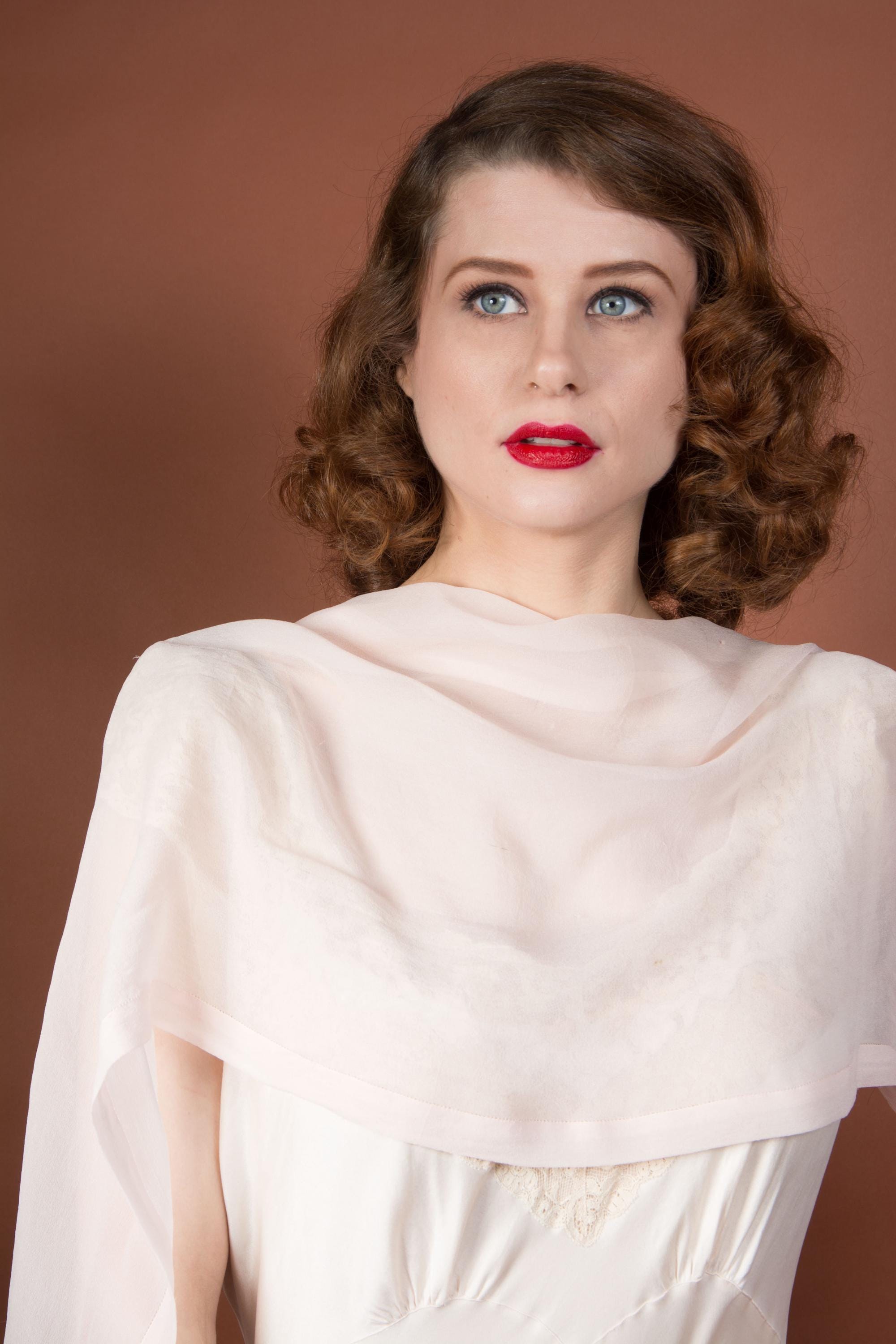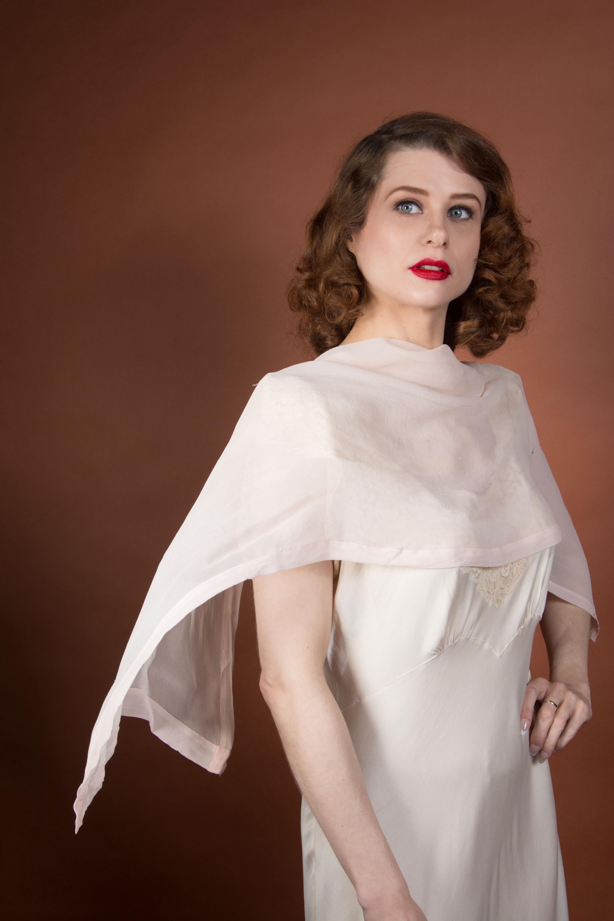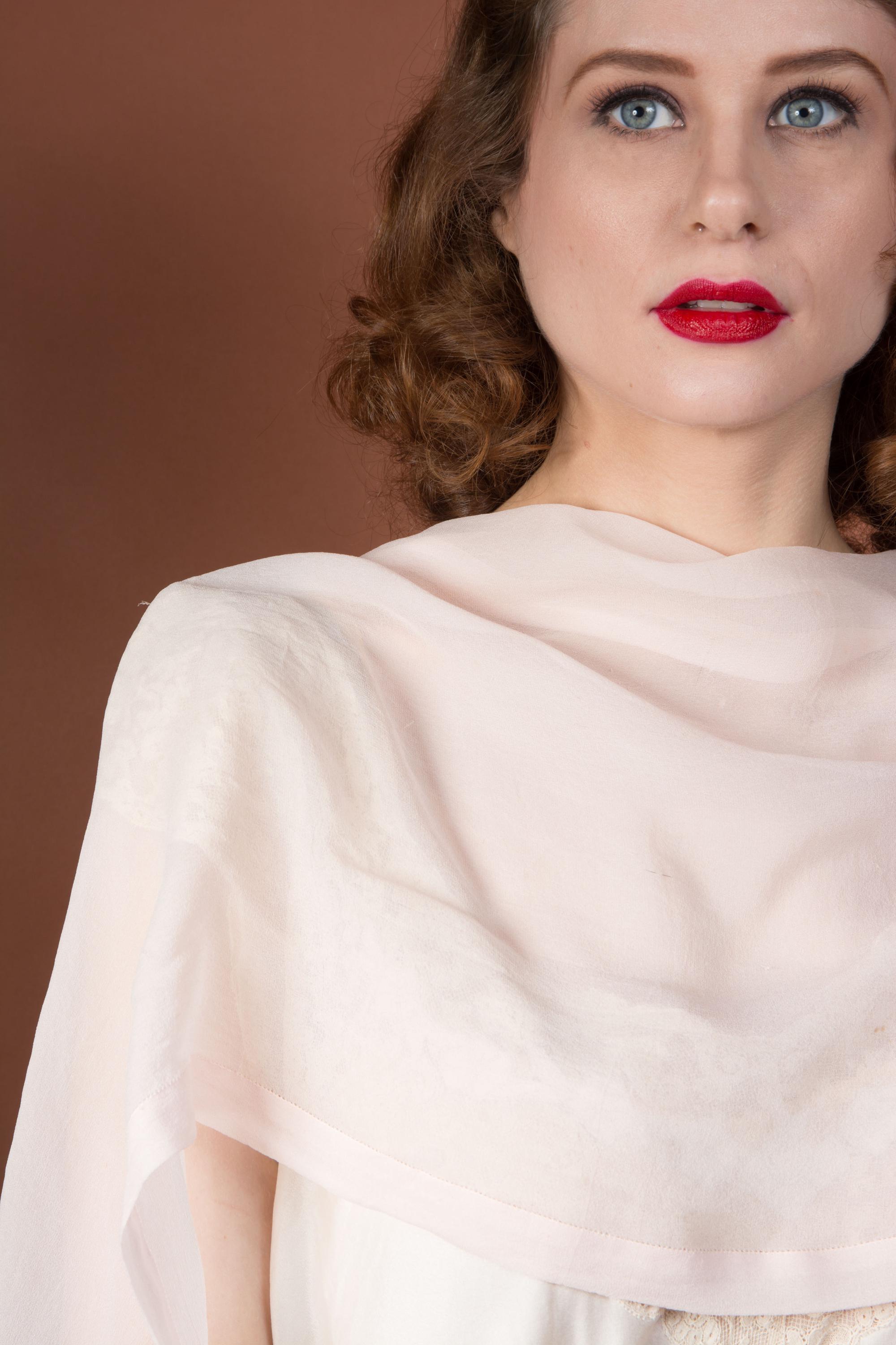 A lovely, lightweight long oblong scarf in a soft, pale true pink silk with a folded, border style stitched edge. This can be tied as a hairscarf, used at the neck, or pinned as a soft shoulder drape.