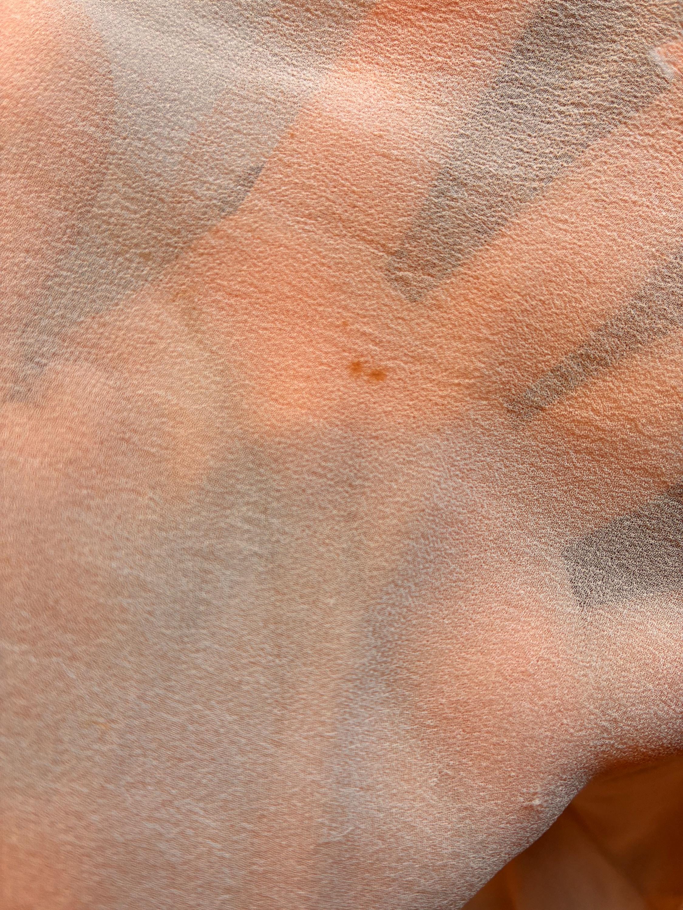 This scarf has not been washed. There are three little snags in the silk that have pulled, and one small spot. I find no other issues to note.