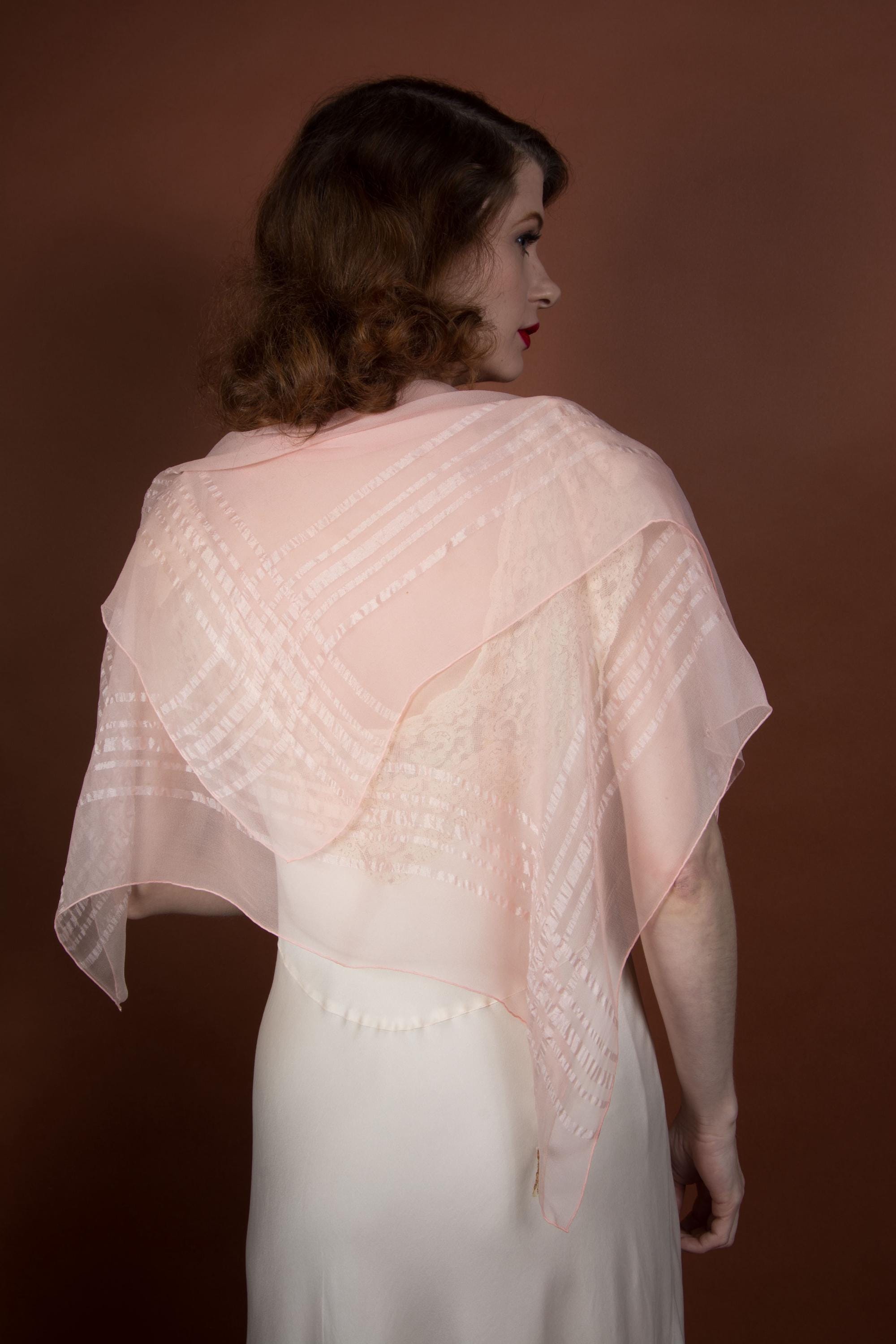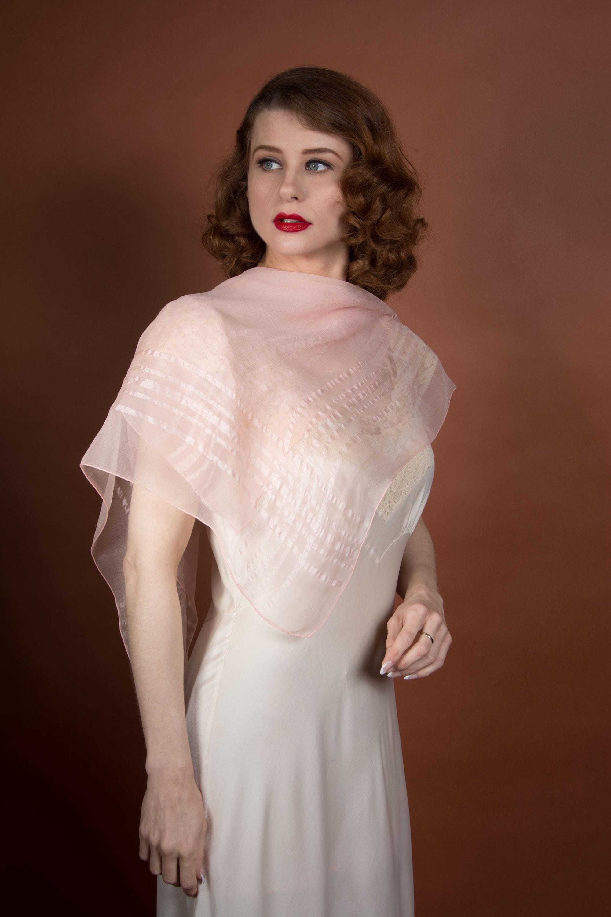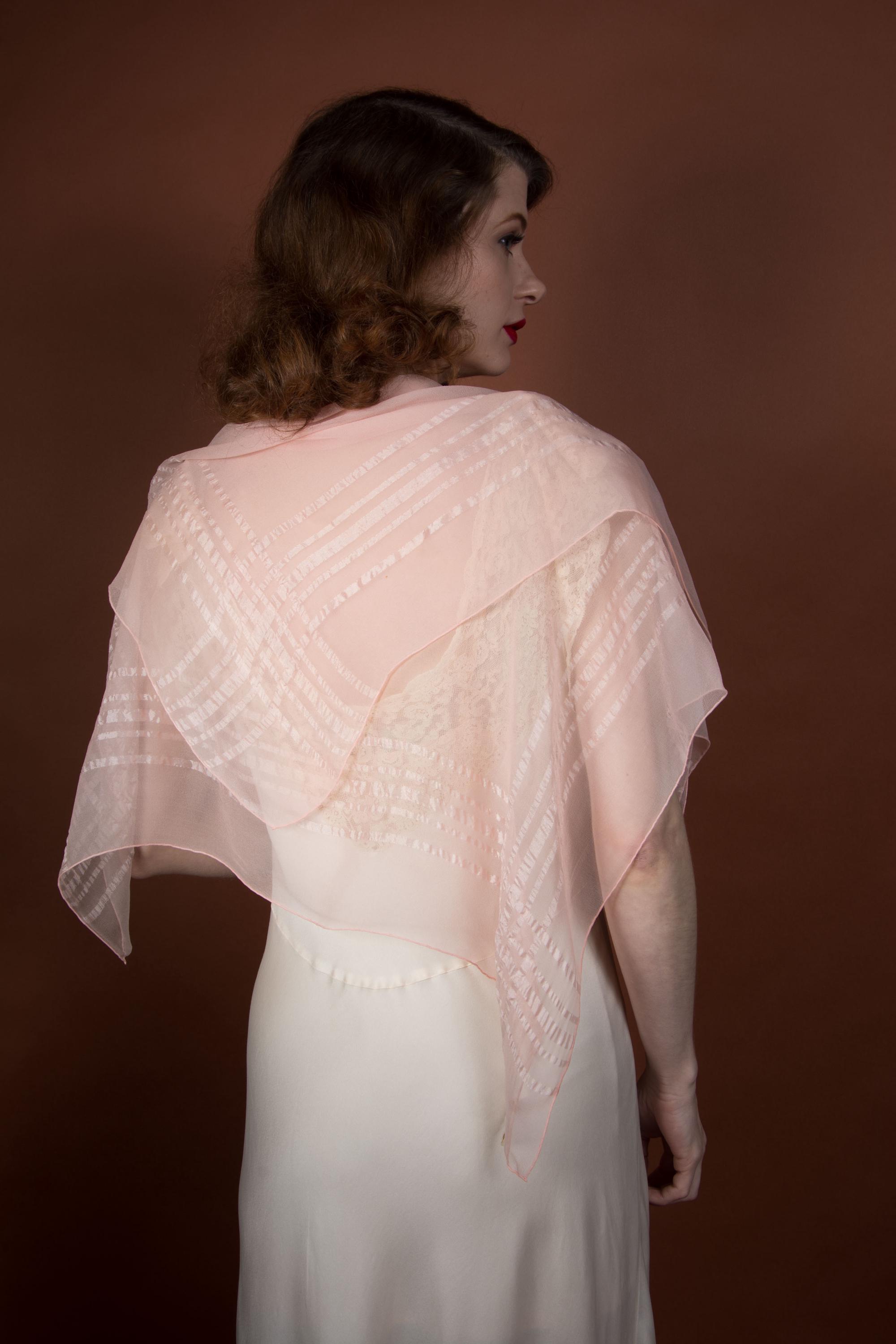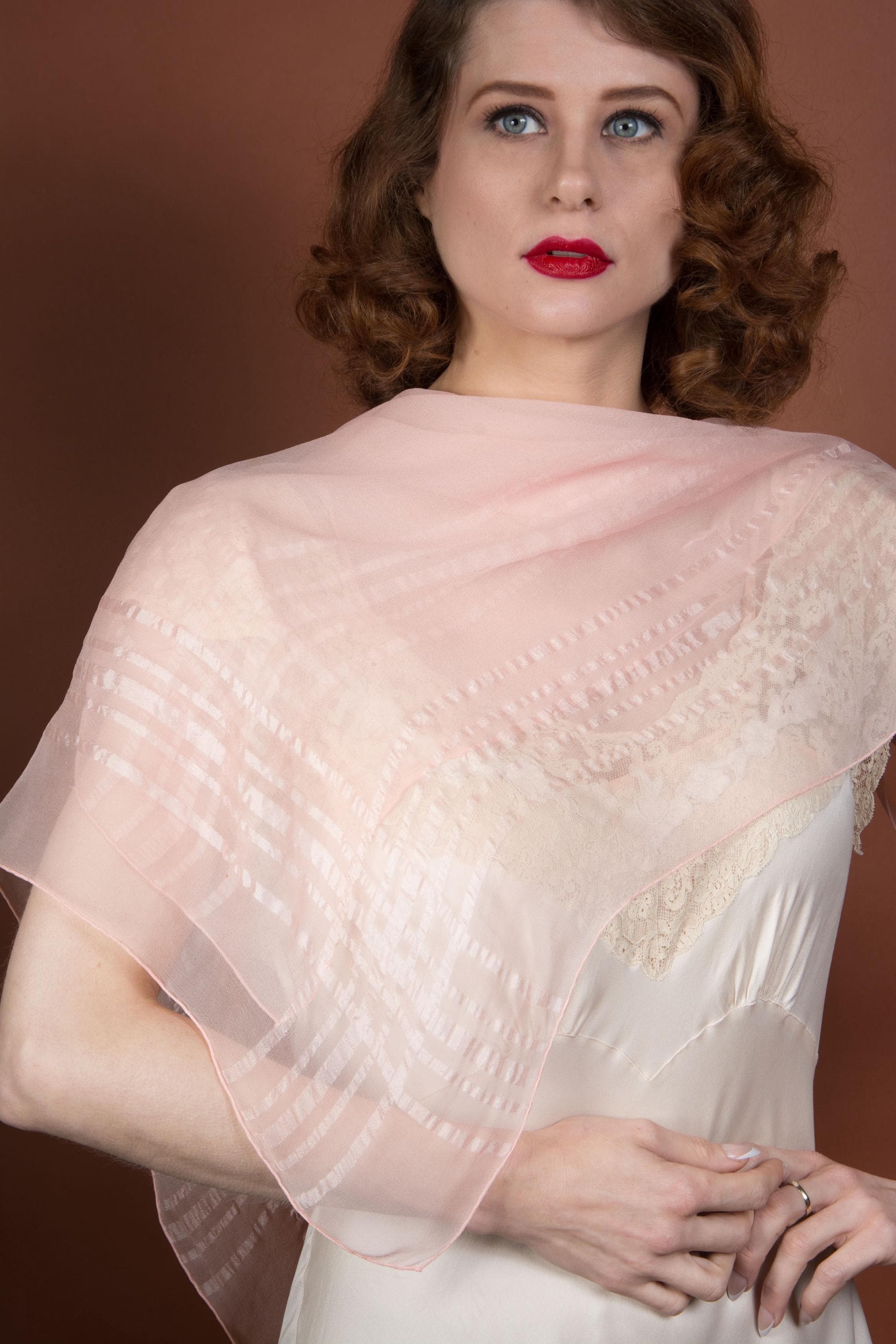 A lovely, lightweight square scarf in a true sheer pink with a hand rolled edge. Each side has five lustrous stripes woven in. This can be tied as a hairscarf, used at the neck, tied in a turban, and more.
