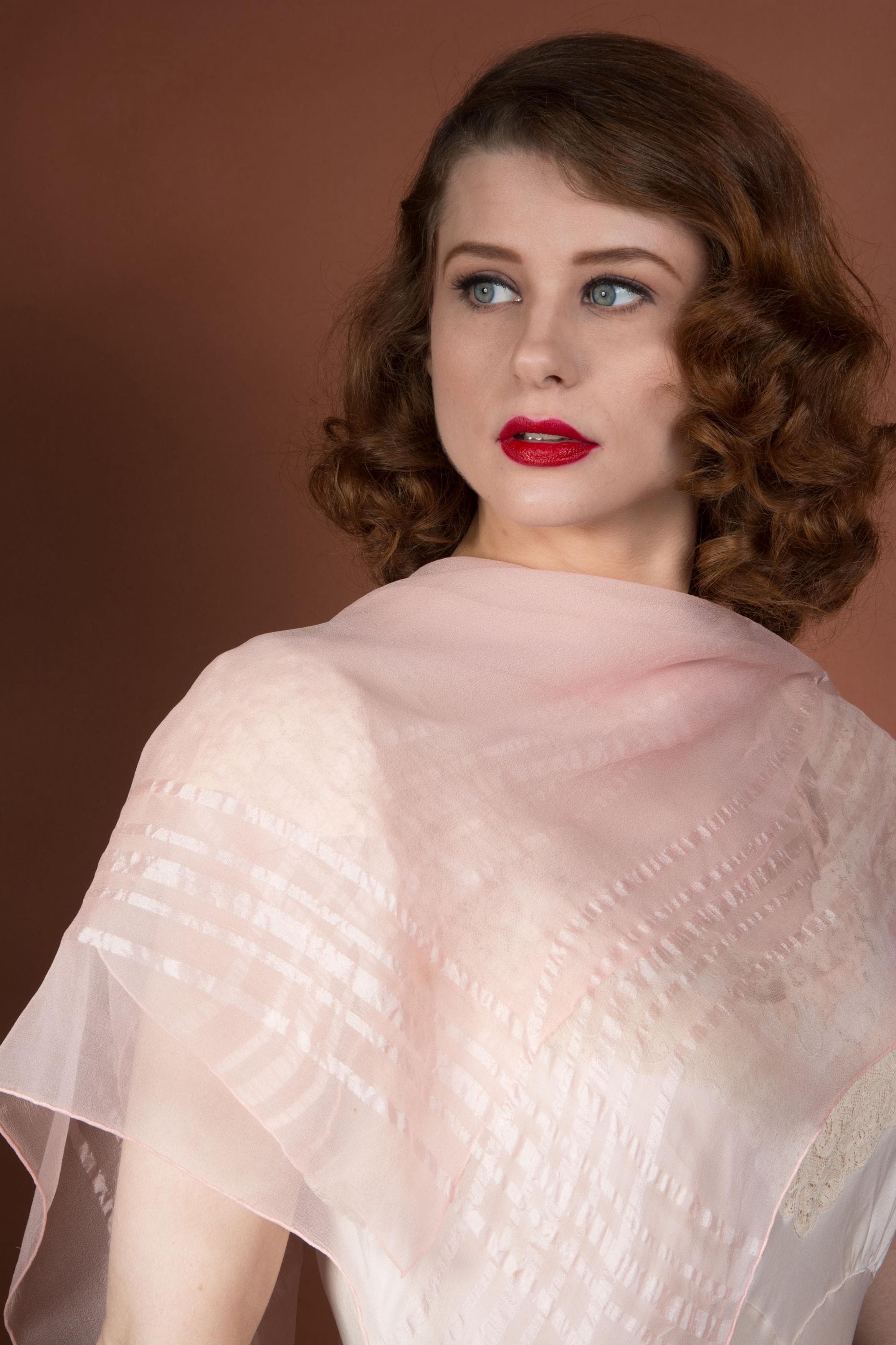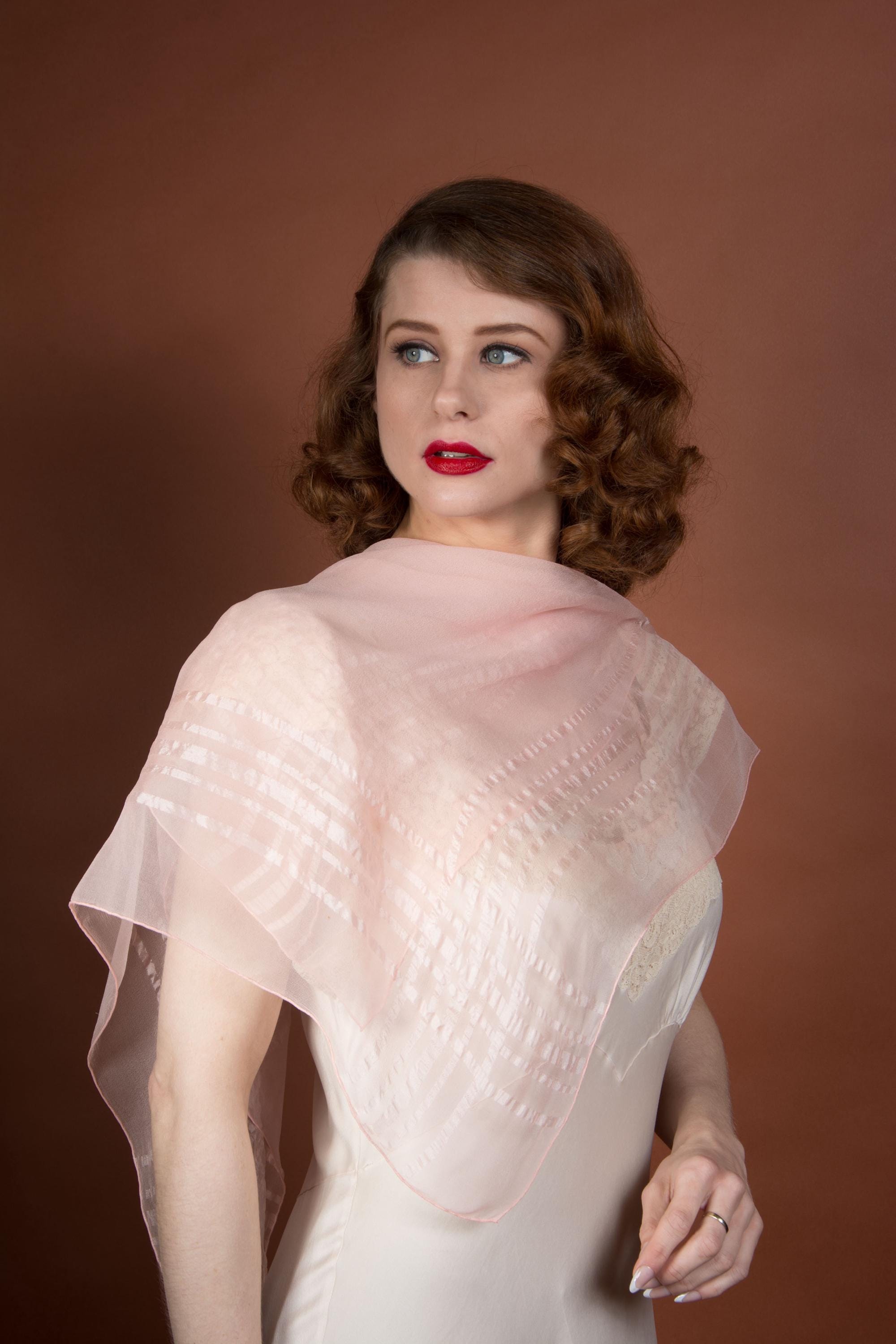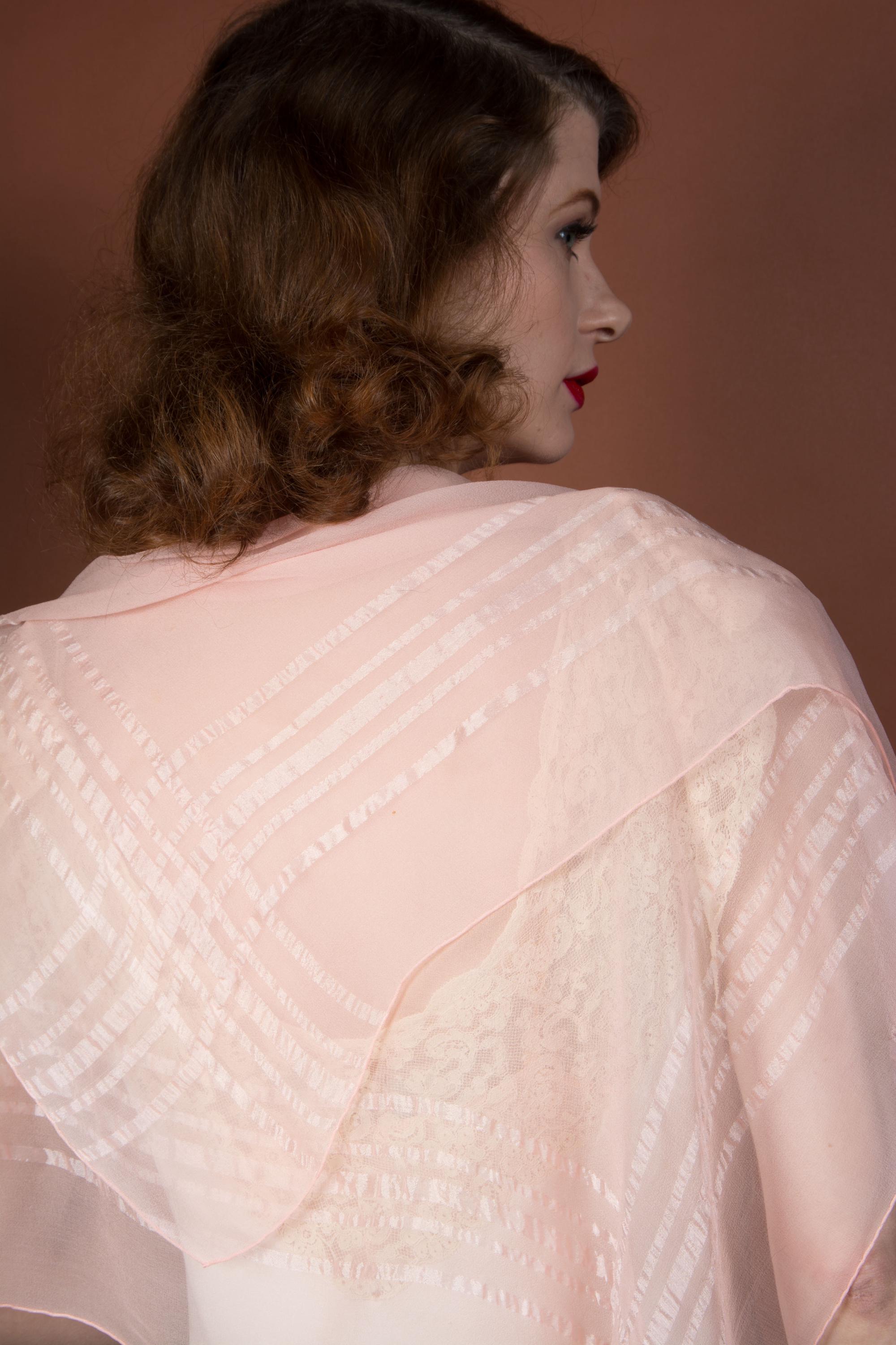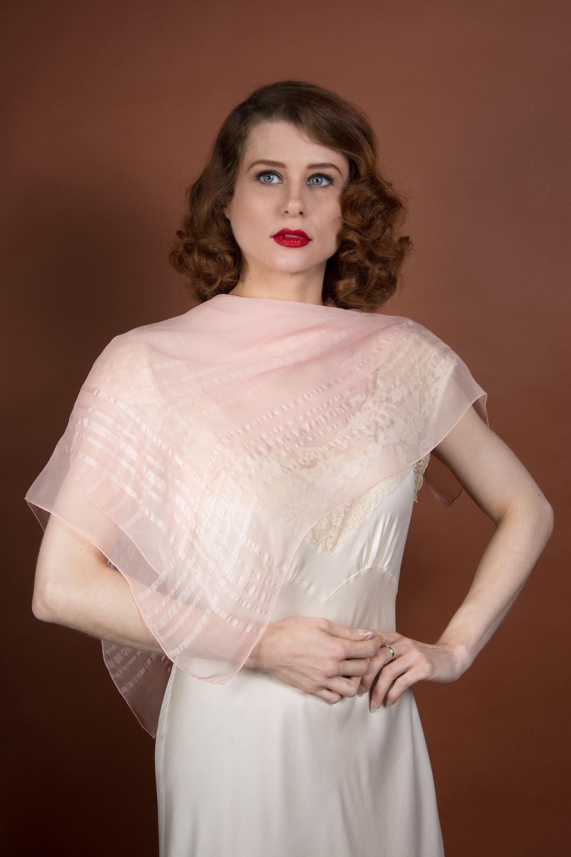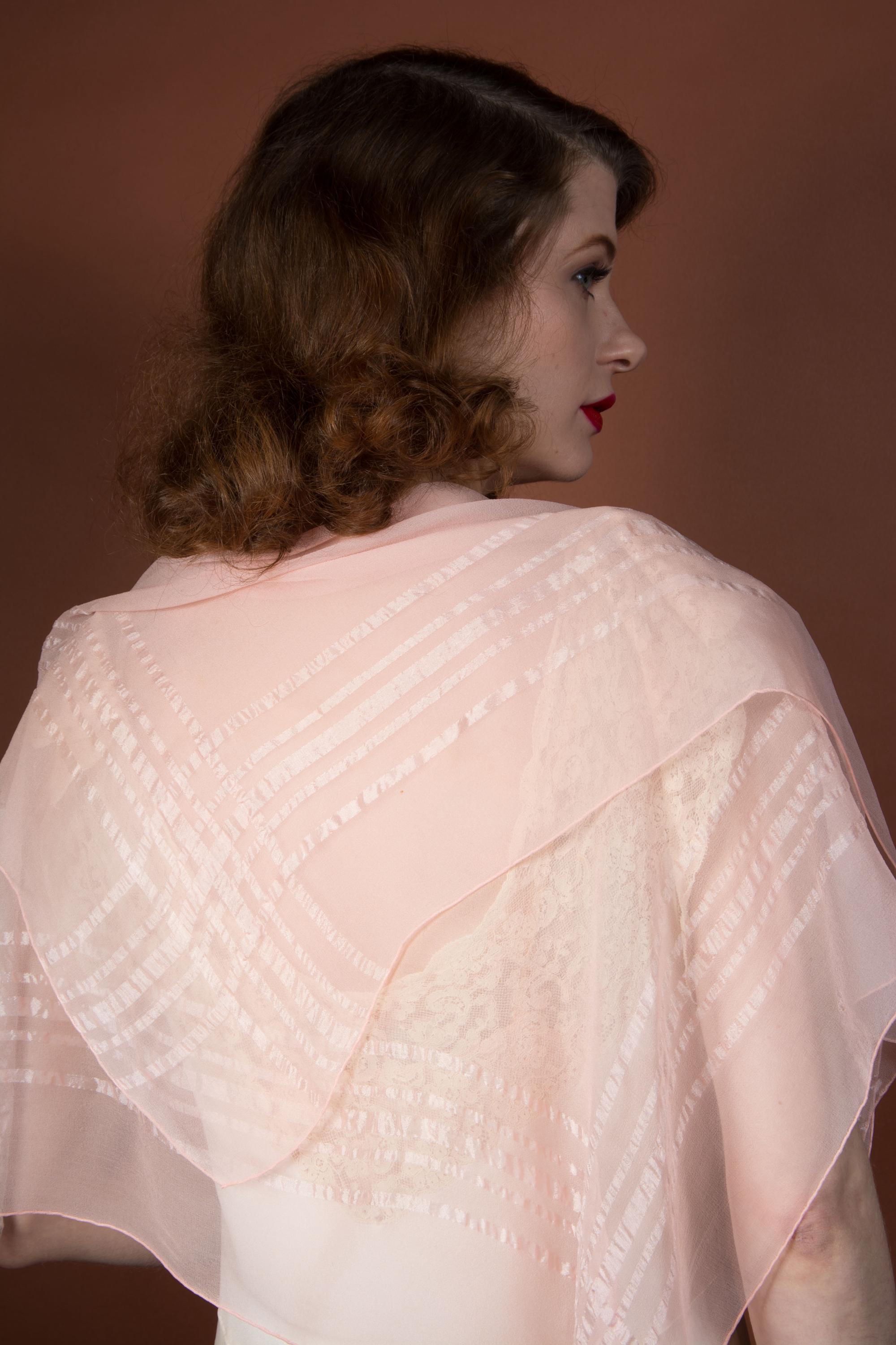 A lovely, lightweight square scarf in a true sheer pink with a hand rolled edge. Each side has five lustrous stripes woven in. This can be tied as a hairscarf, used at the neck, tied in a turban, and more.