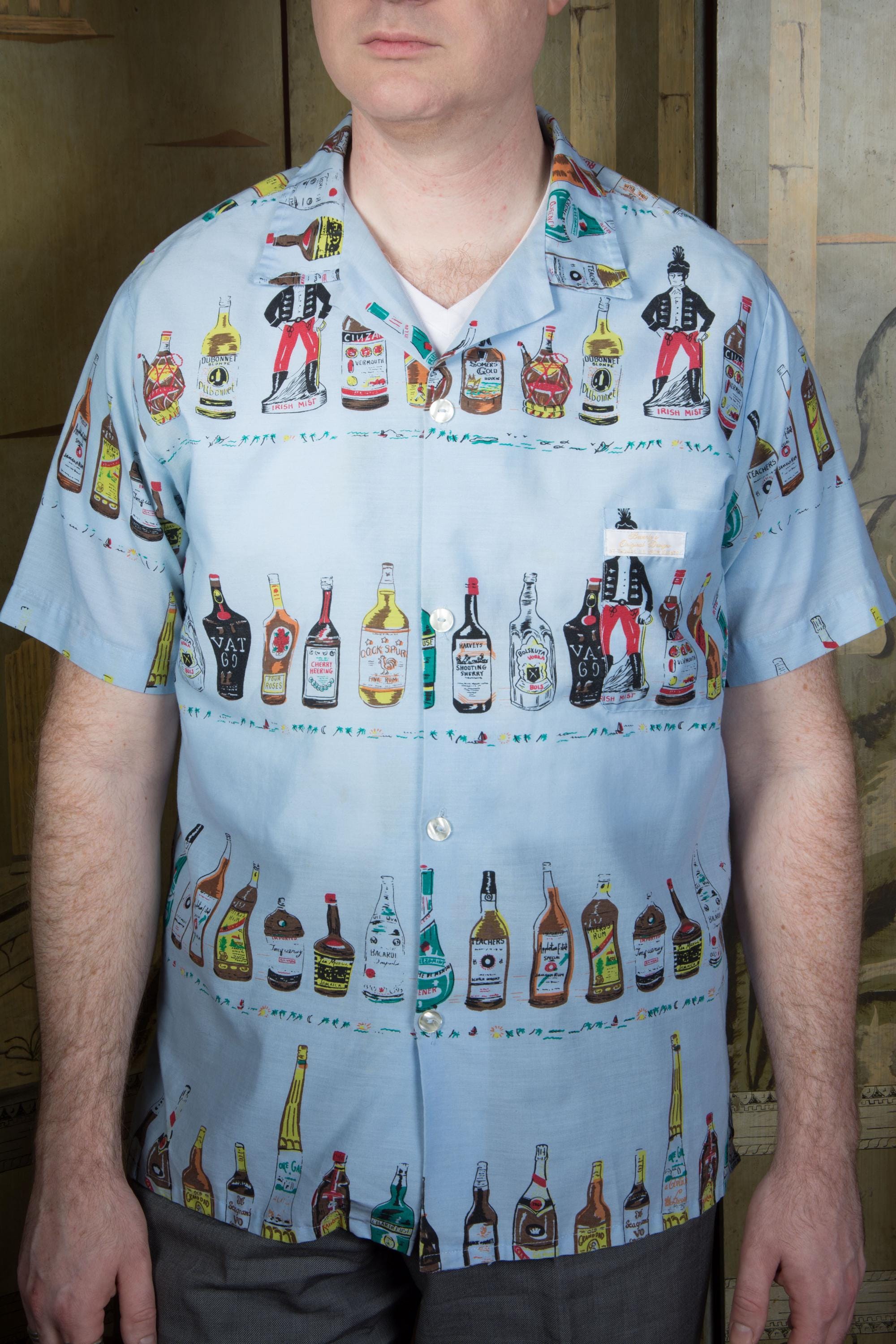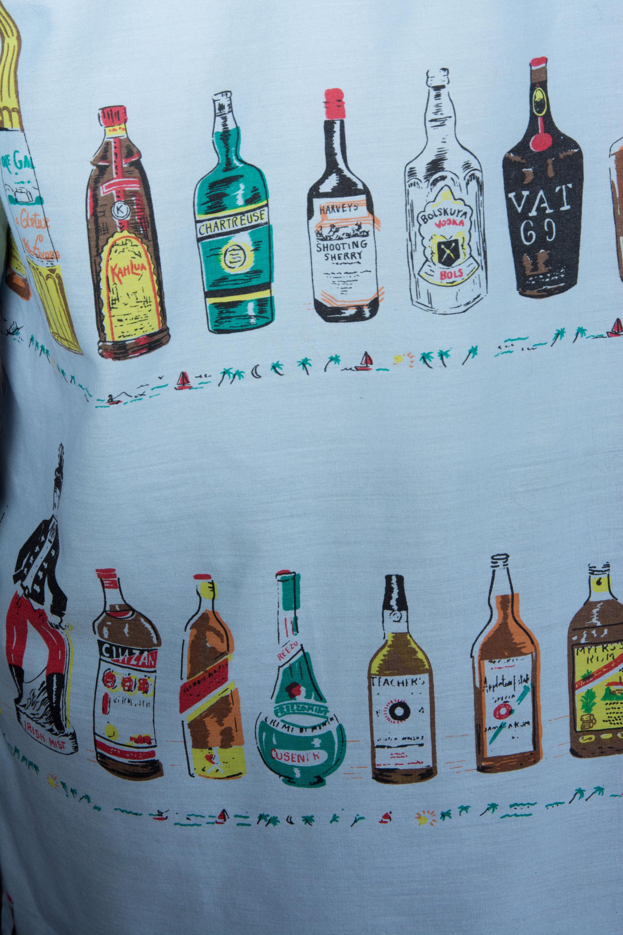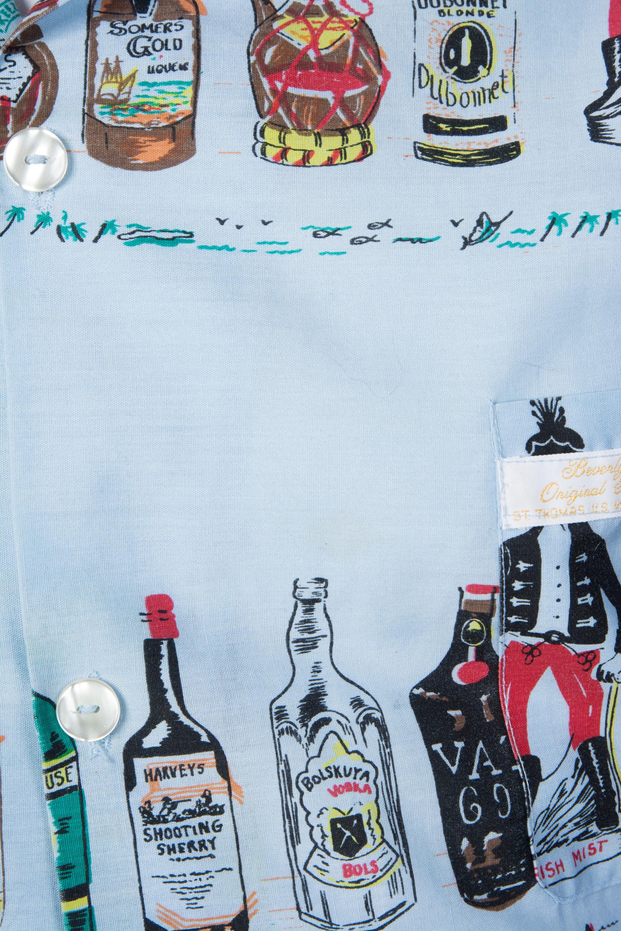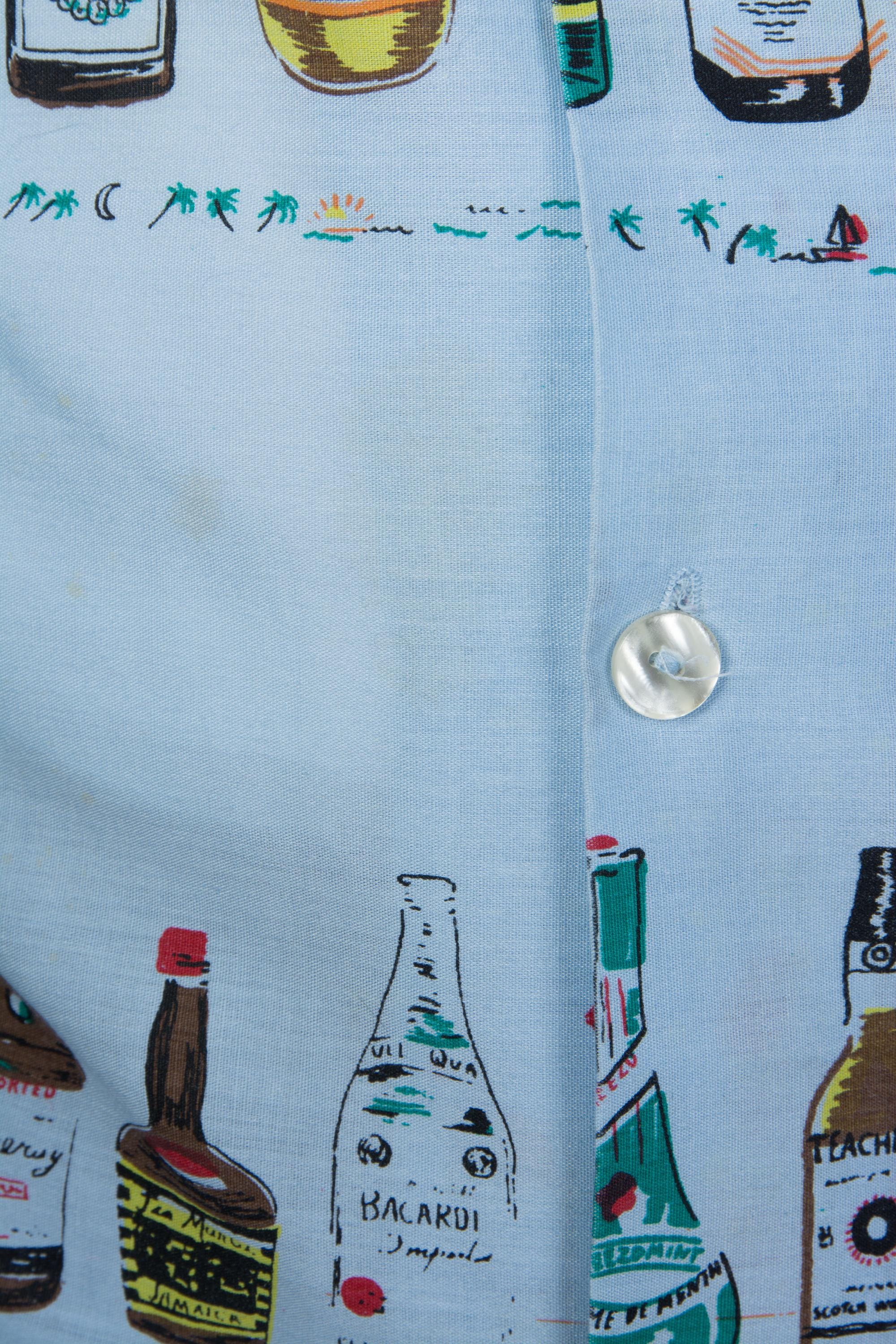 Vintage 1960s novelty shirt is perfect for summer! Originally a tourist item from the US Virgin Island, this classic is rock and roll fun - I think I count 26 unique liquor bottles in the print. These almost always have a white ground - but this is on a cornflower blue. It's a very lightweight, soft cotton blend that dries very quickly! The collar is small, and has a loop closure. It has a single chest pocket.