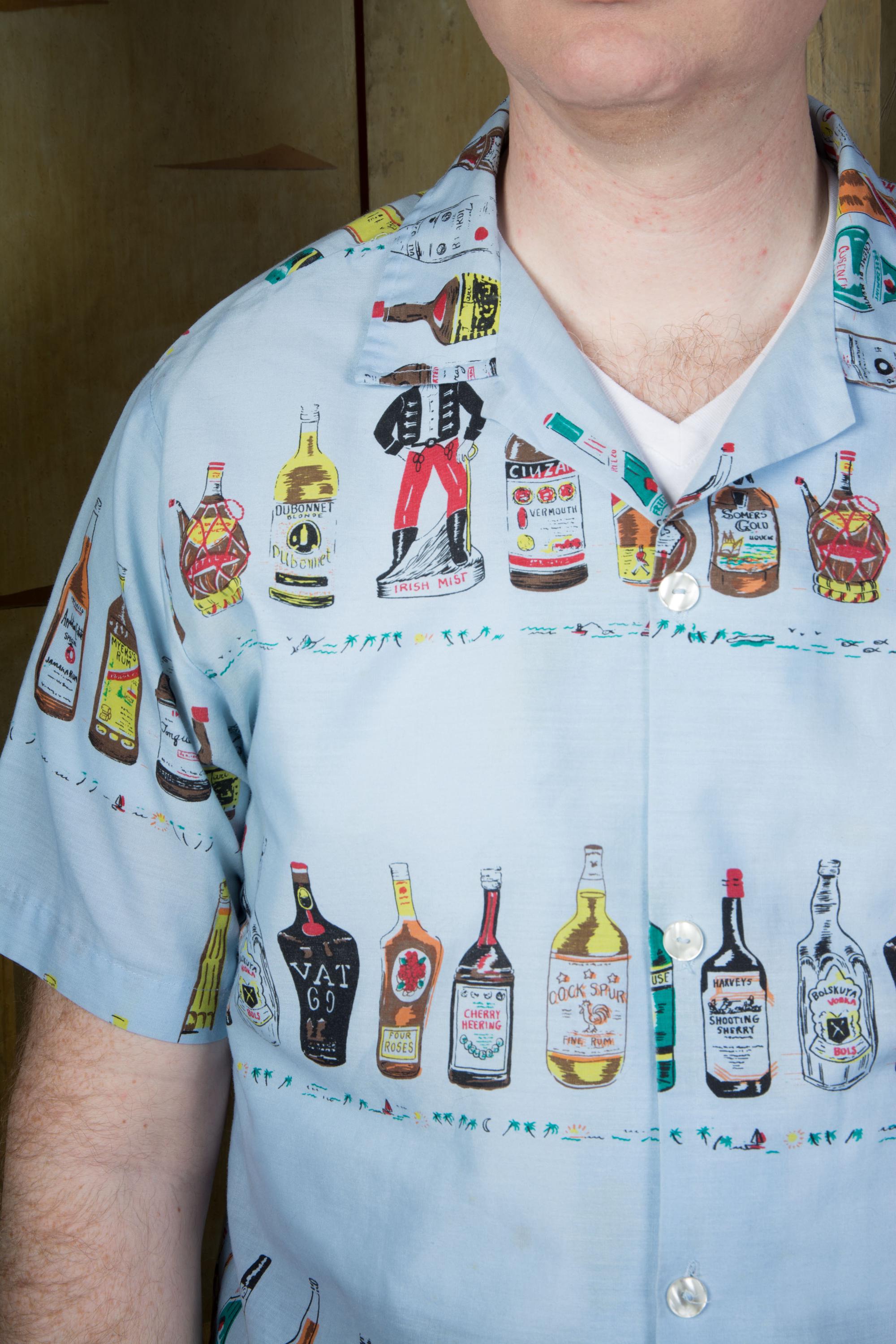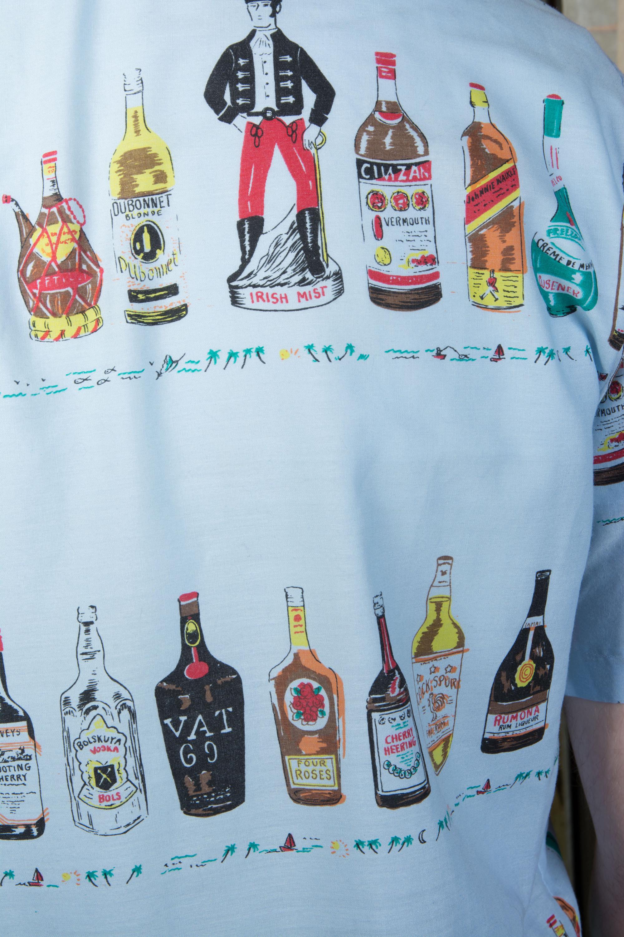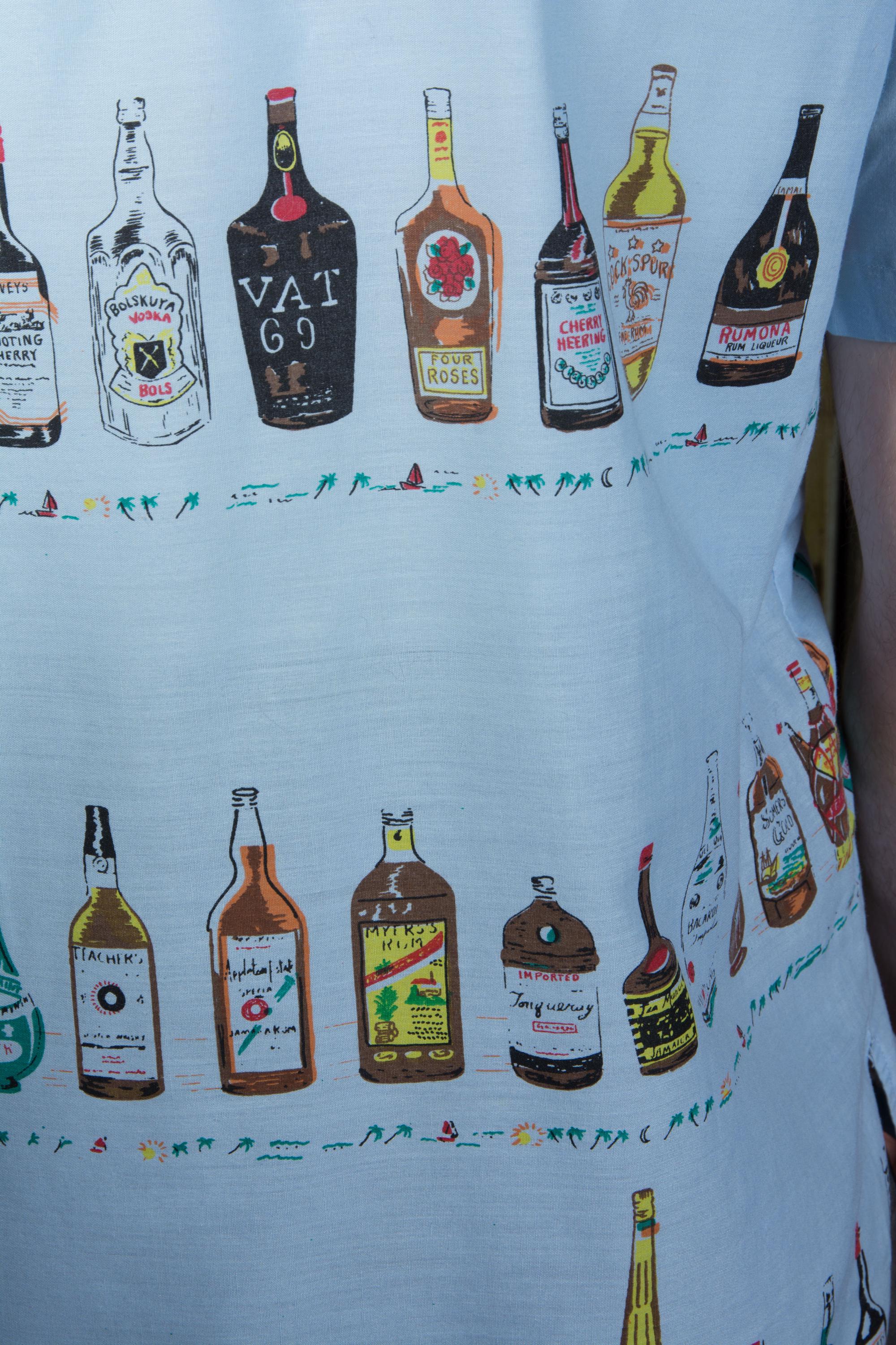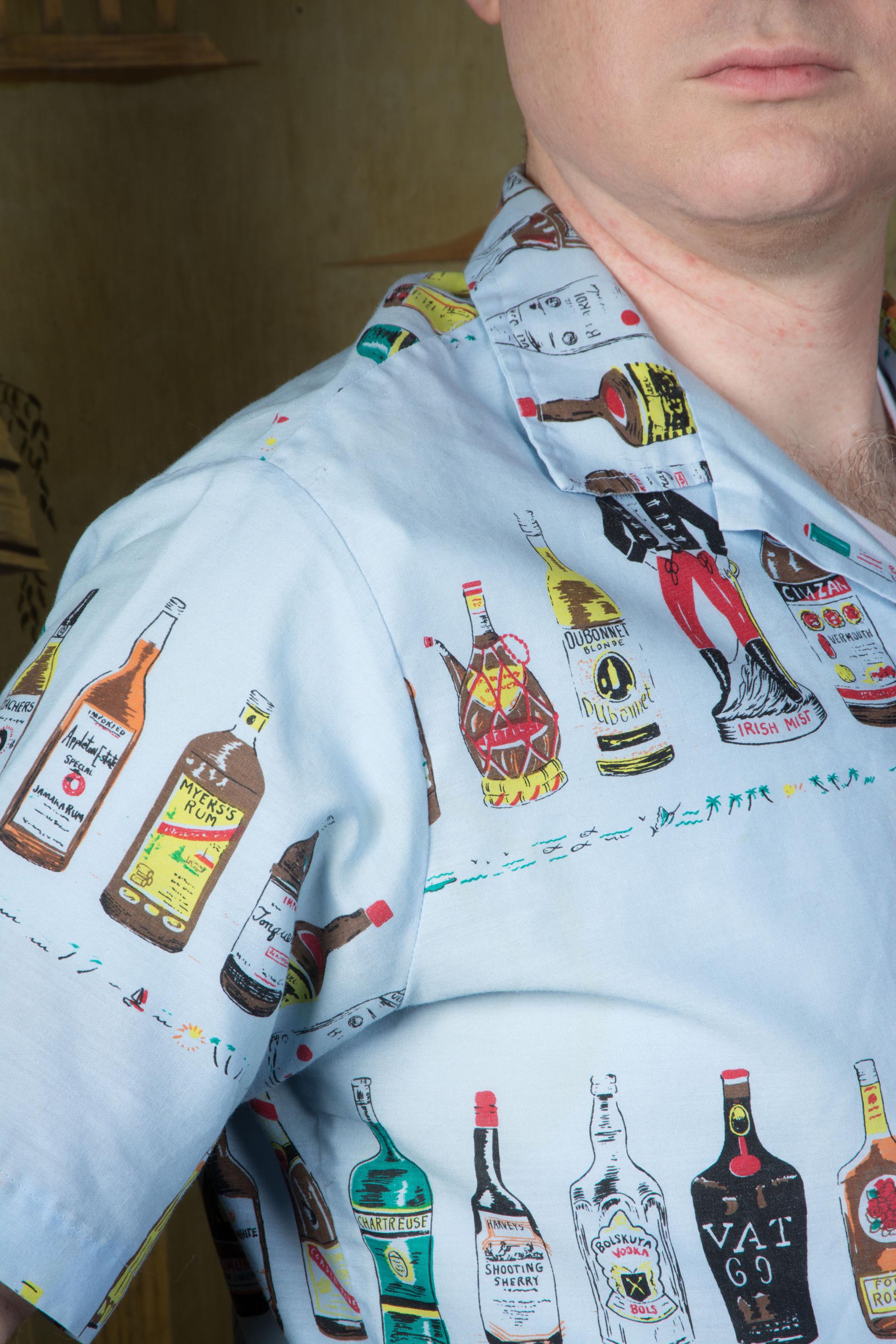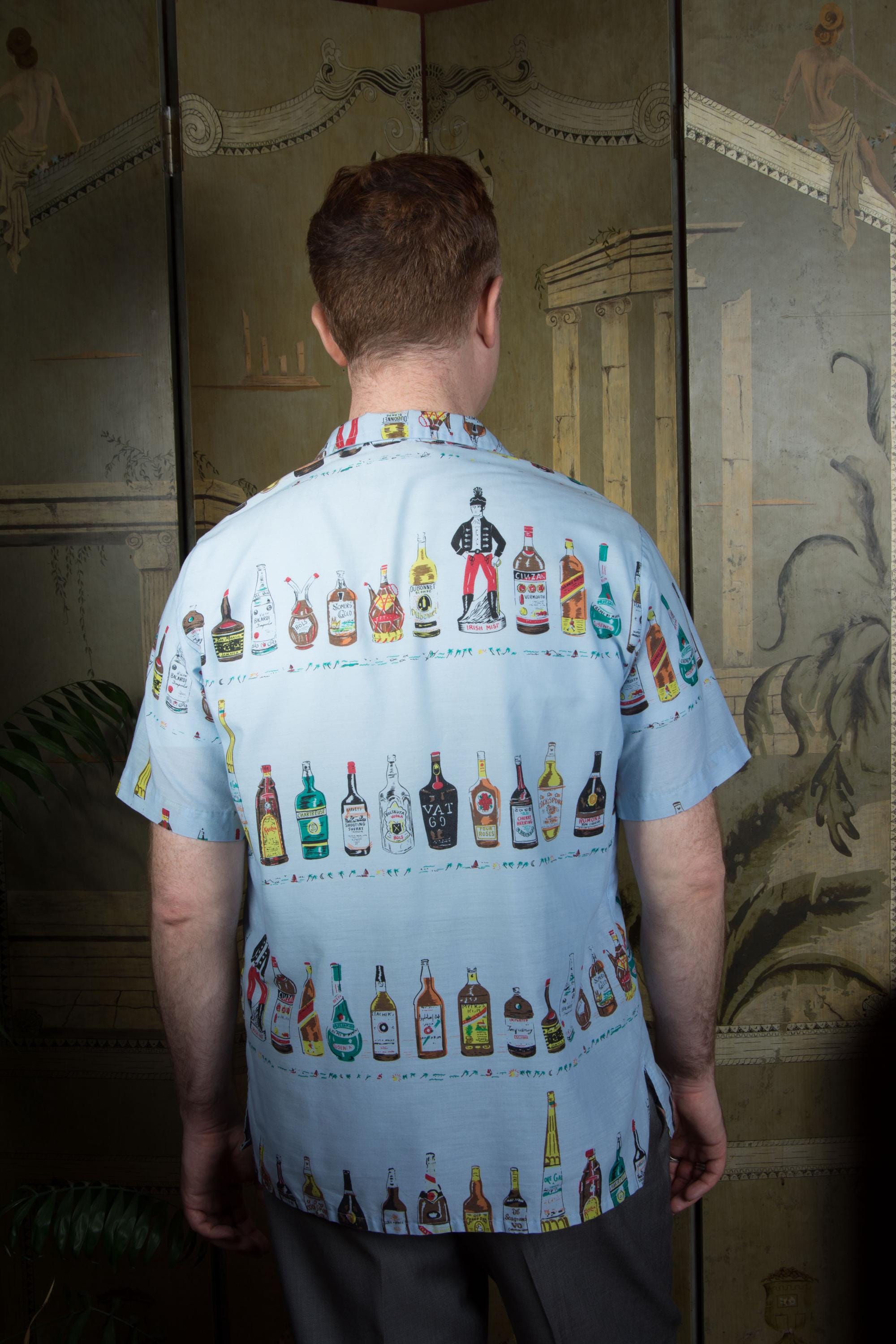 Vintage 1960s novelty shirt is perfect for summer! Originally a tourist item from the US Virgin Island, this classic is rock and roll fun - I think I count 26 unique liquor bottles in the print. These almost always have a white ground - but this is on a cornflower blue. It's a very lightweight, soft cotton blend that dries very quickly! The collar is small, and has a loop closure. It has a single chest pocket.