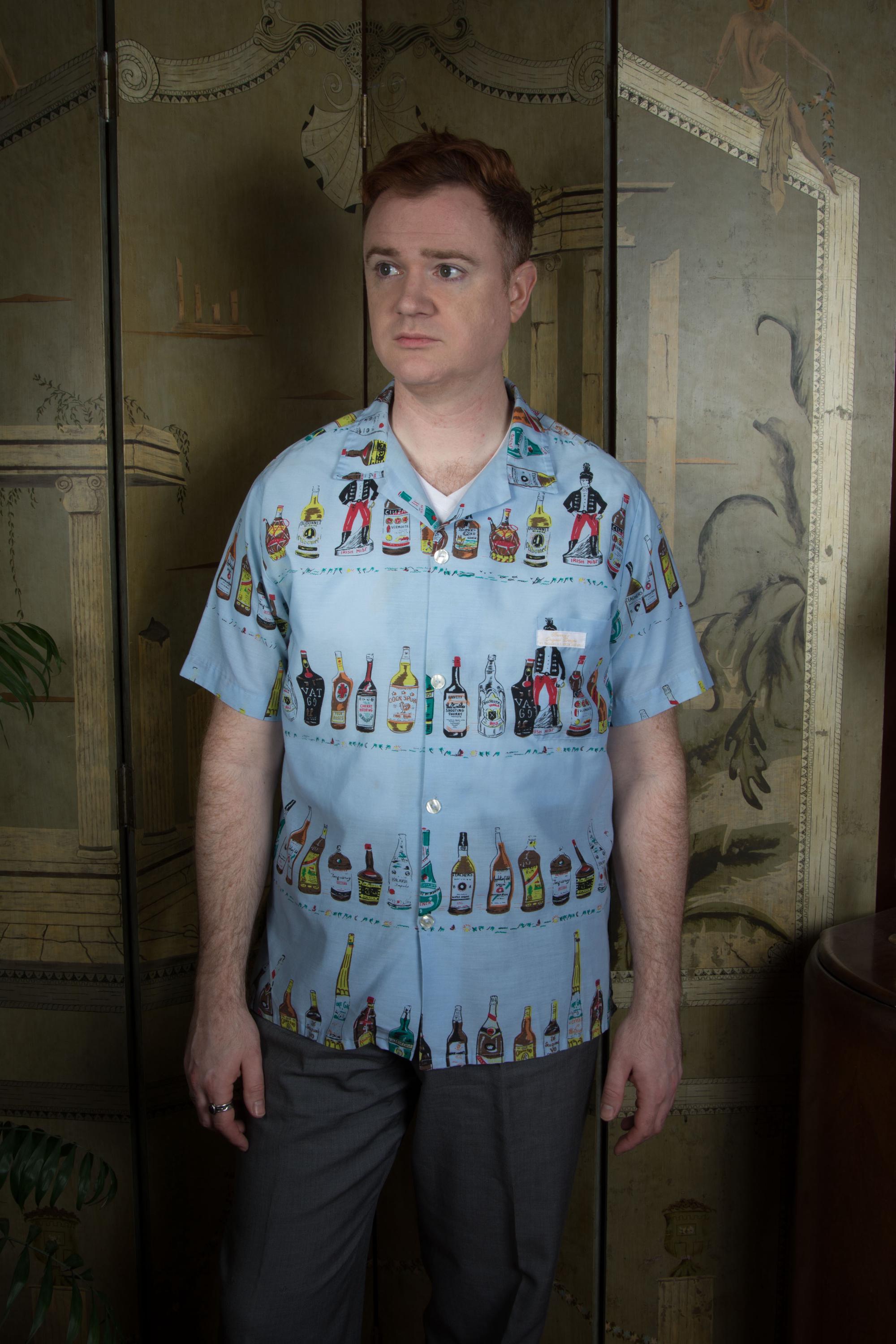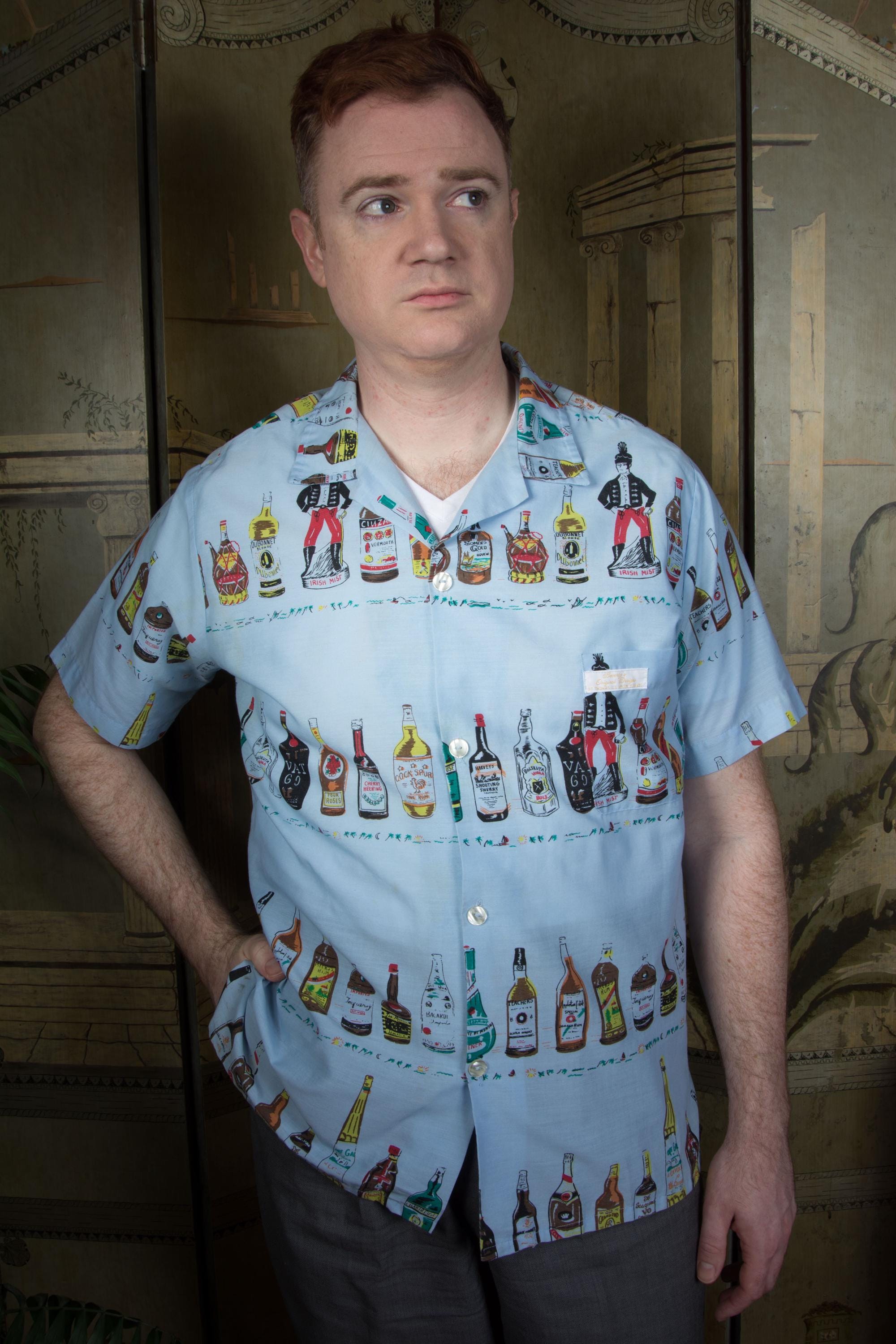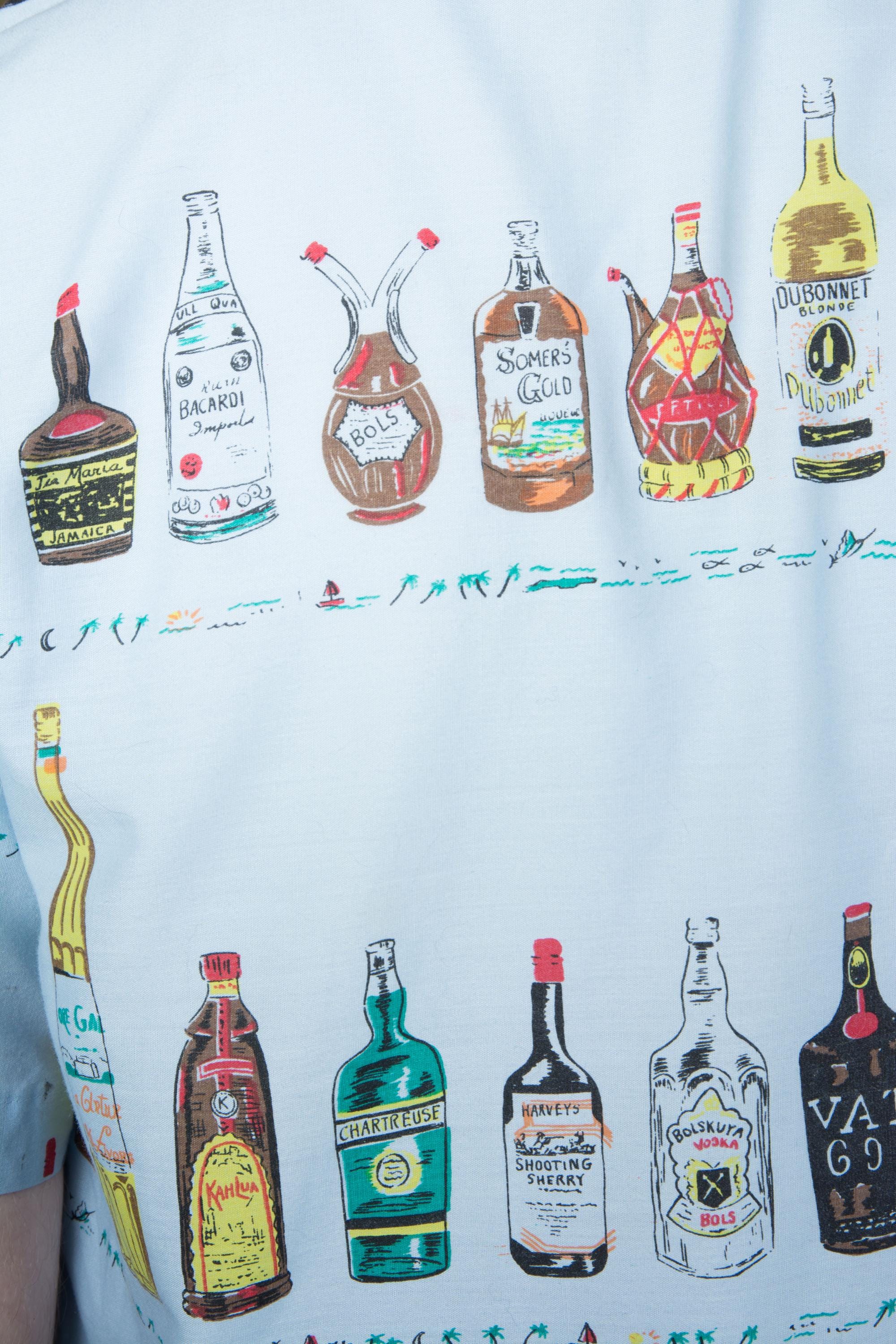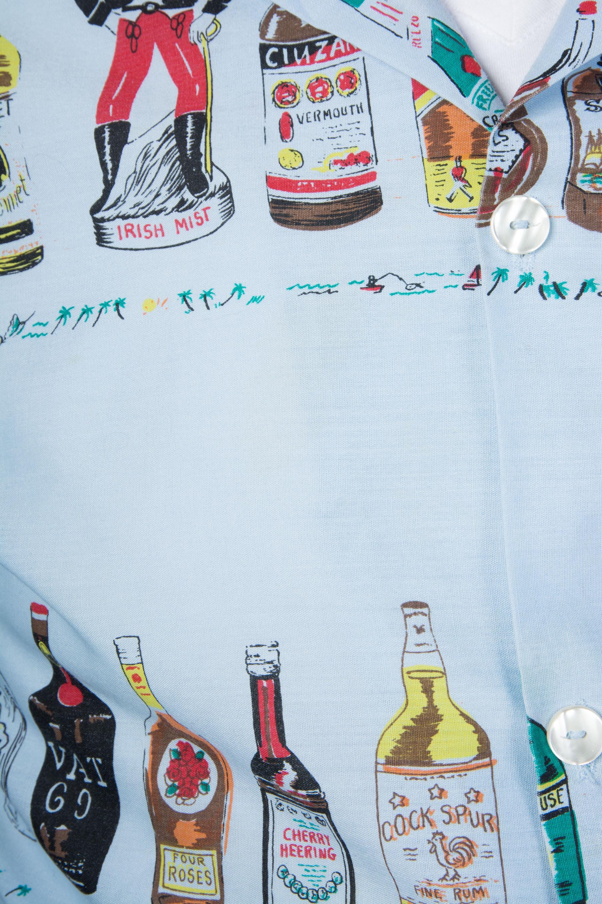 Vintage 1960s novelty shirt is perfect for summer! Originally a tourist item from the US Virgin Island, this classic is rock and roll fun - I think I count 26 unique liquor bottles in the print. These almost always have a white ground - but this is on a cornflower blue. It's a very lightweight, soft cotton blend that dries very quickly! The collar is small, and has a loop closure. It has a single chest pocket.