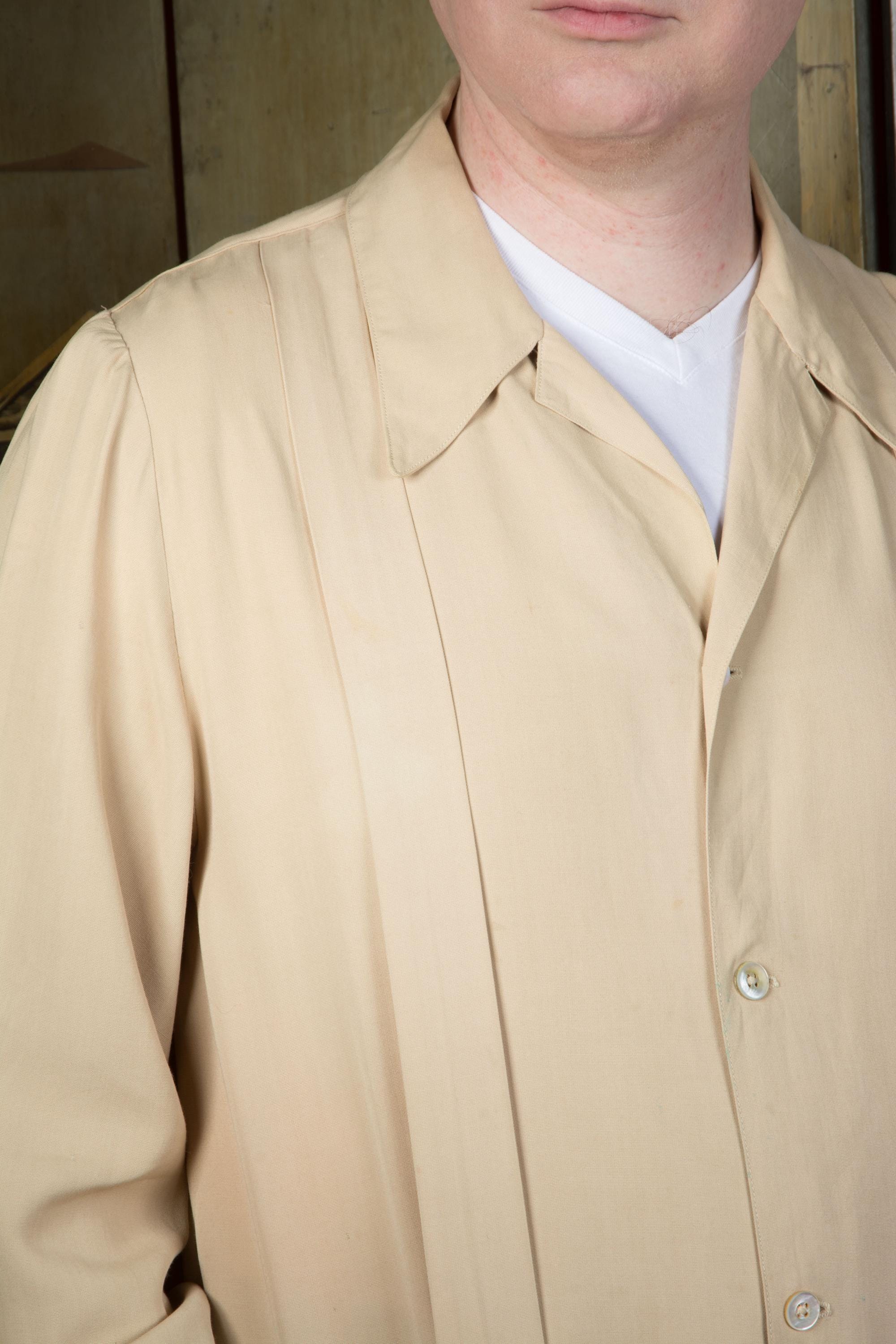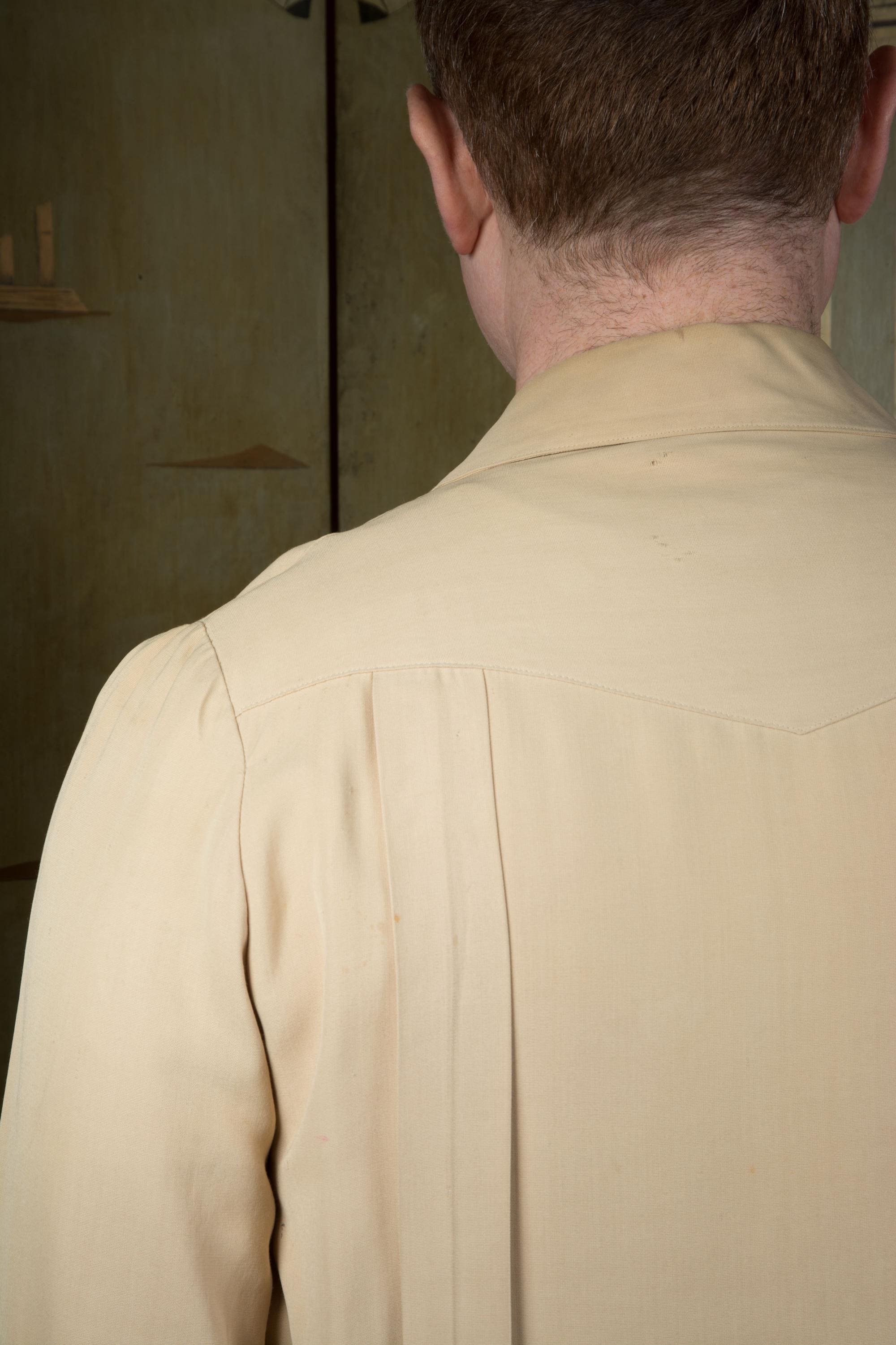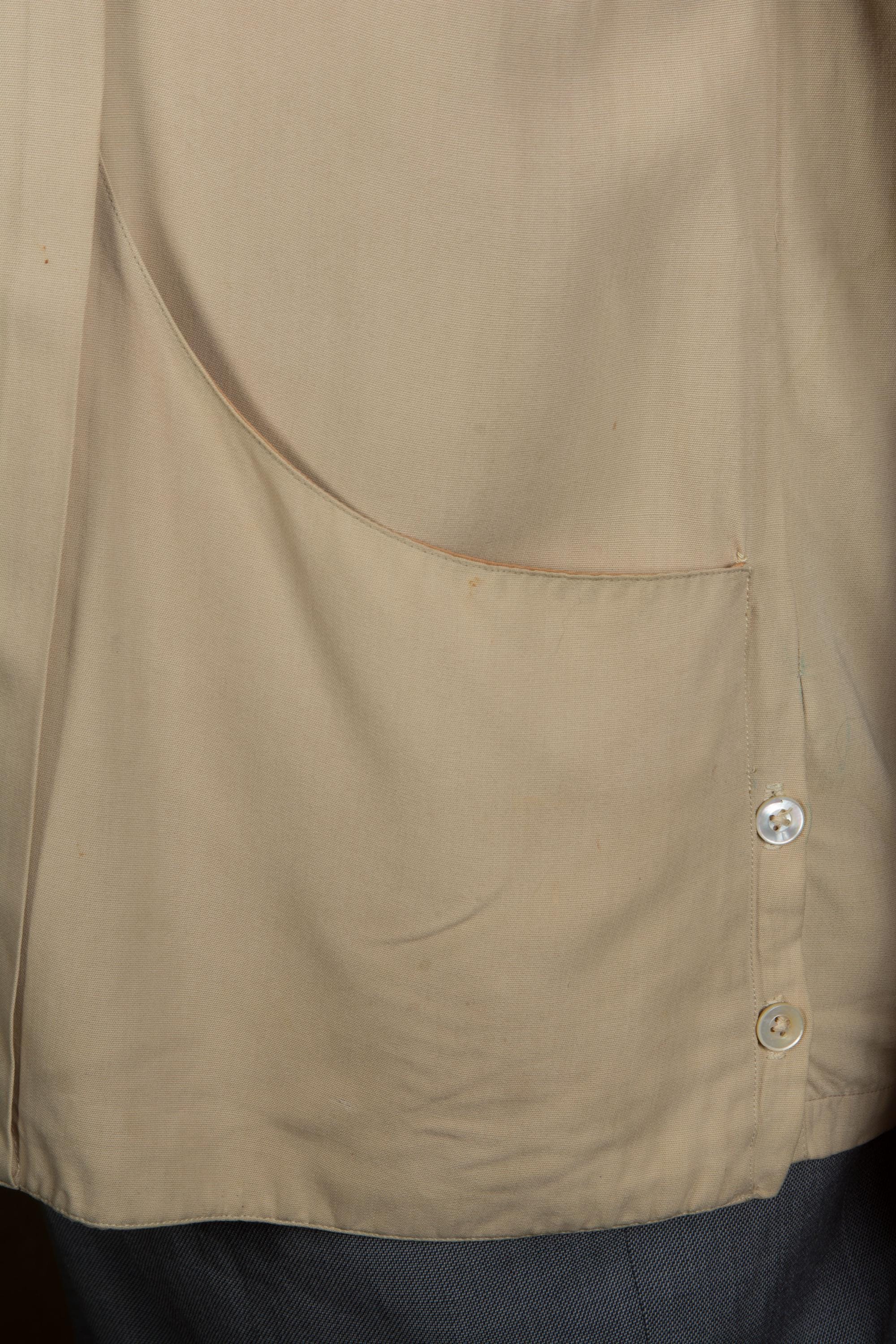 A unique early 1950s leisure jacket in a "tropical weave" according the 1952 advertisement - I found ads for this style from 1951 to 1953. This was made for lounging - and looking like it! It has a western back yoke. Four long pleats run vertical - one at each side of the front and back. It features two softly curving pockets, with working buttons on the sides which can be opened as vents. It is unlined, excellent for sunny weather.